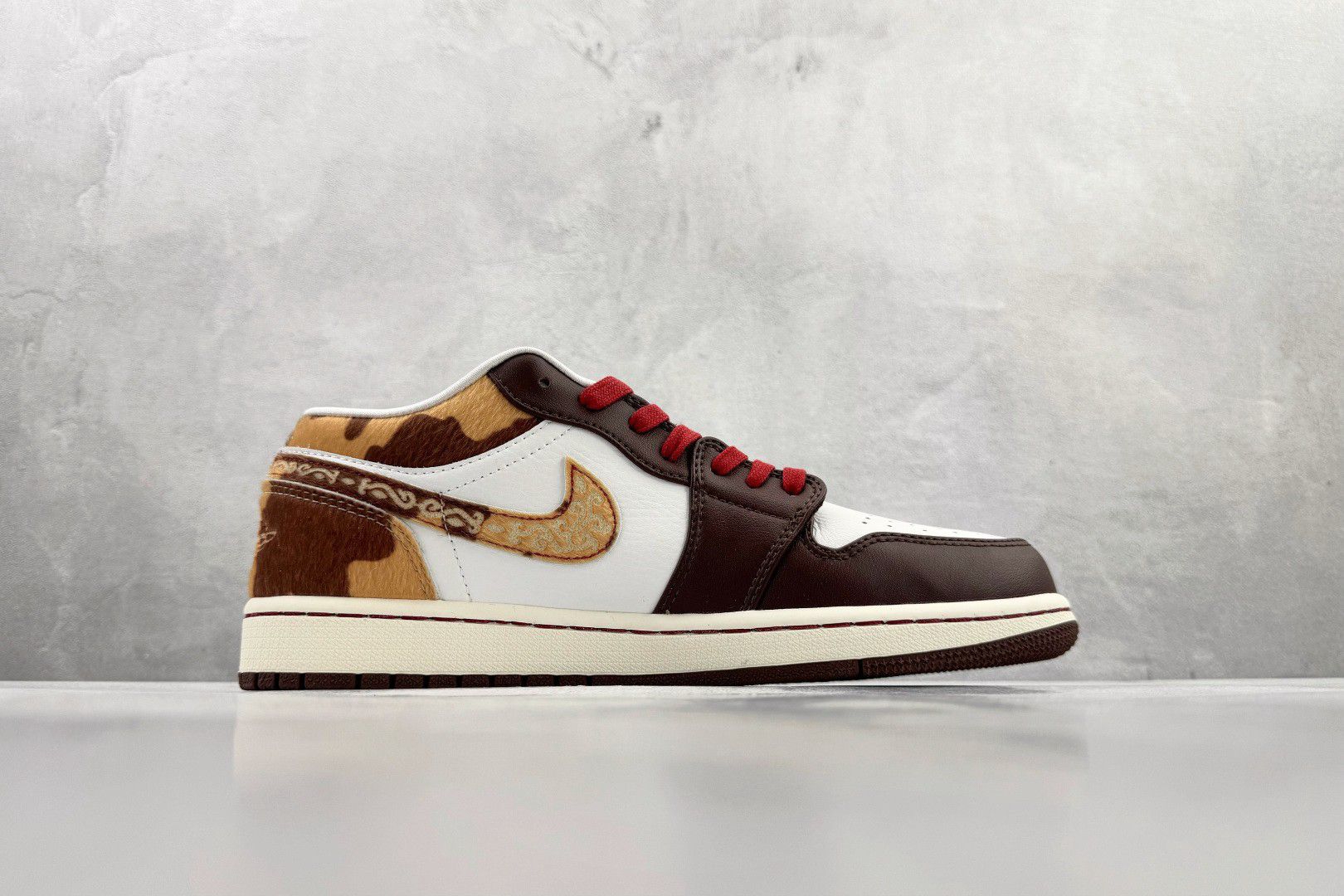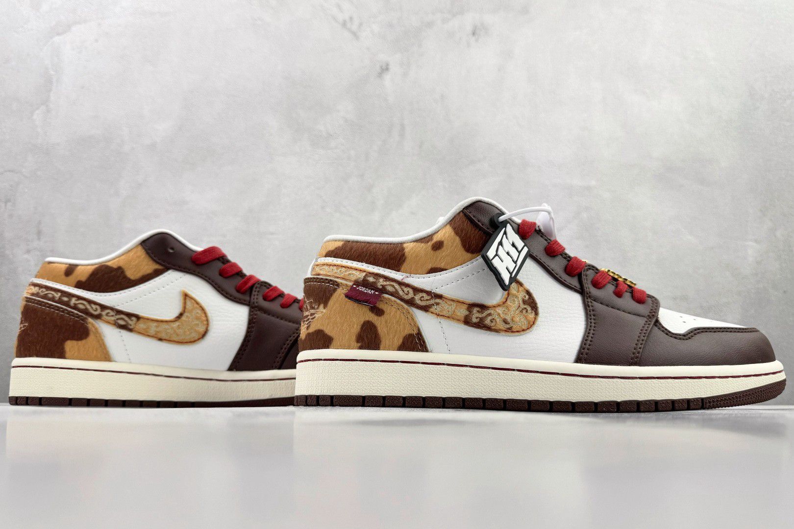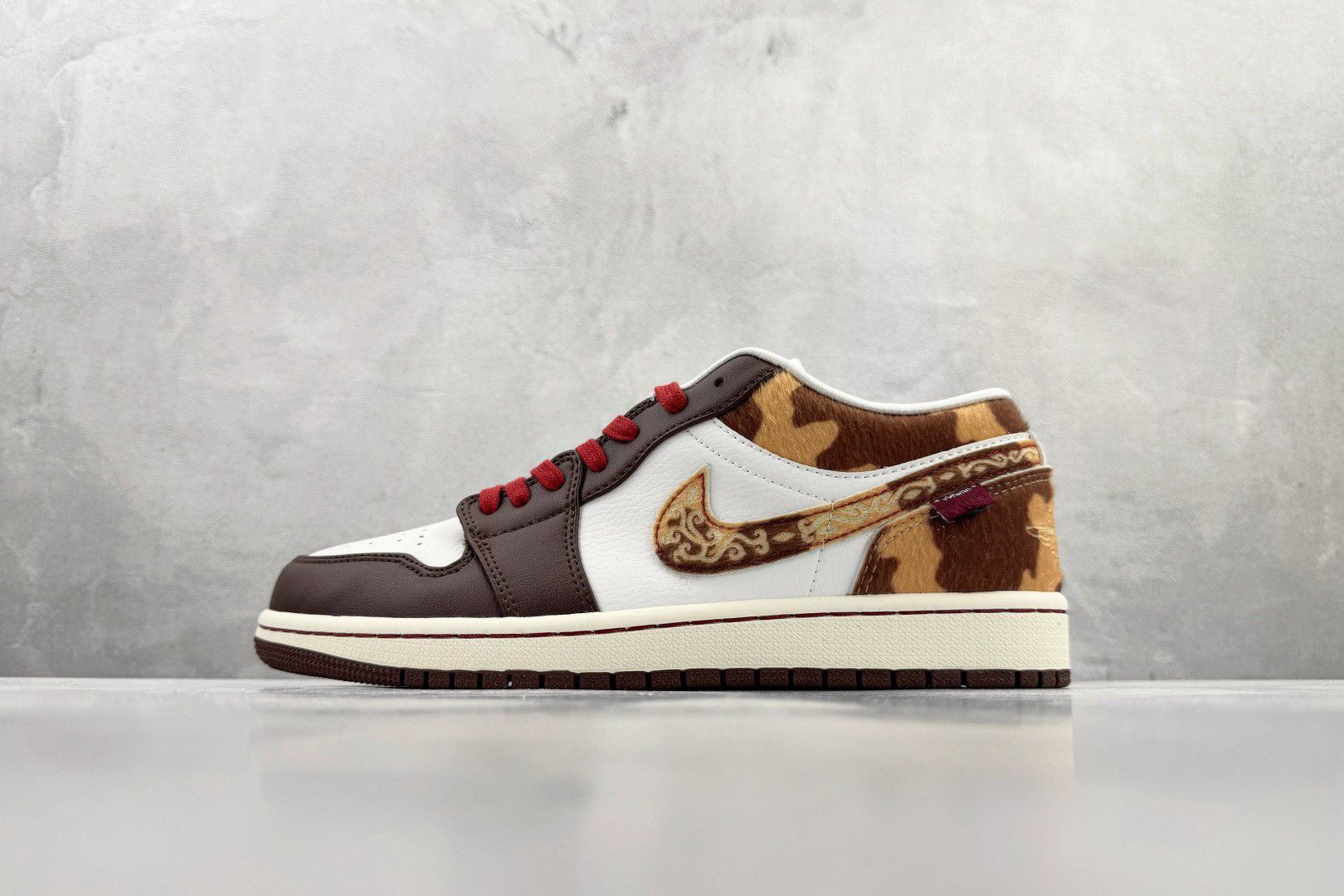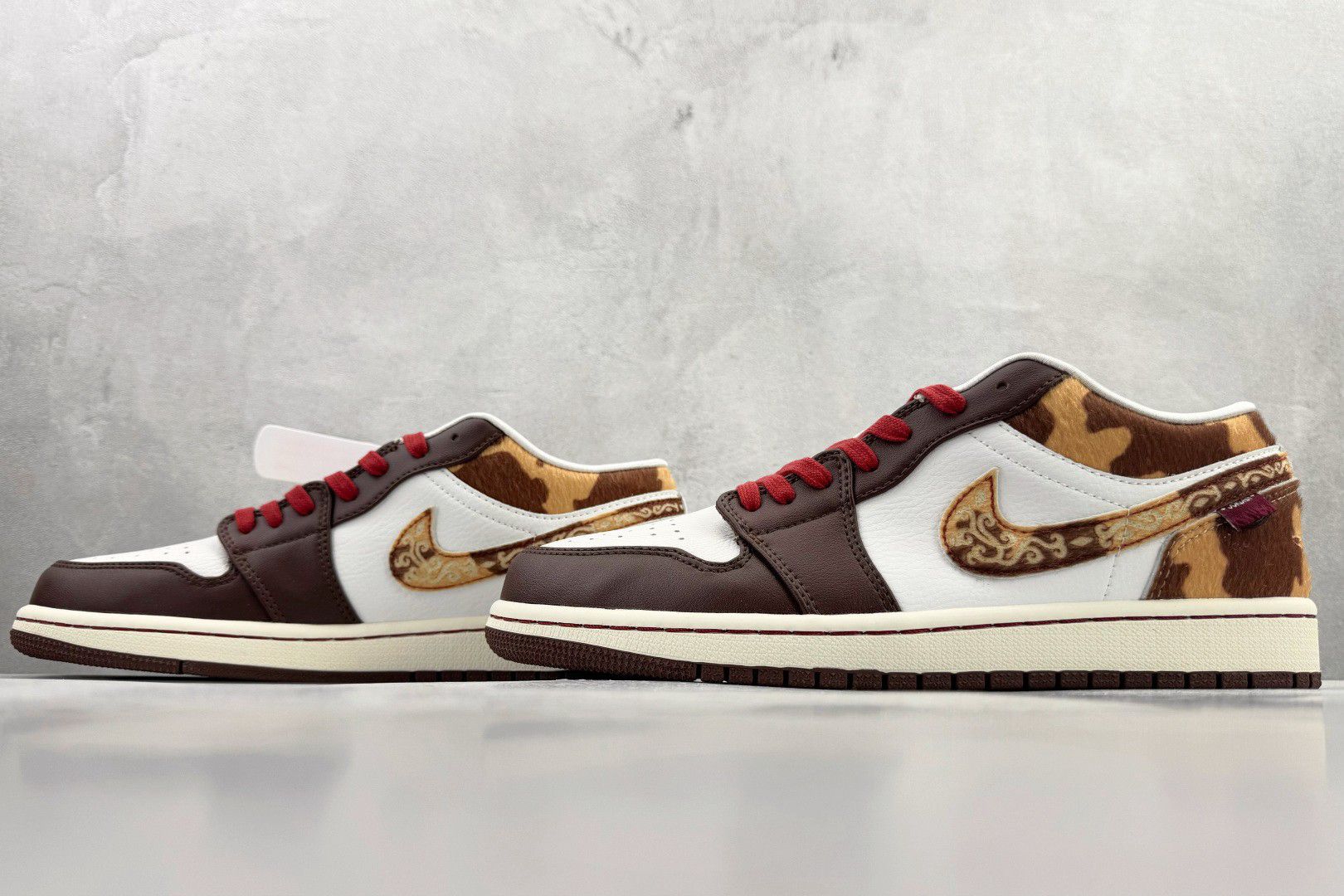 救命!这双Nike Air Jordan 1 Low简直把豹纹玩出高级感新高度!🔥 浅灰墙面+光感地面像给鞋子铺了天然T台,刺绣细节在阳光下闪闪发光,红色鞋带像血管里流淌的叛逆DNA! 低帮设计显脚踝绝了,搭配豹纹却意外不野——麂皮质感遇上几何切割线条,连鞋舌品牌标都像暗藏玄机!通勤穿它被同事追着问链接,周末蹦迪直接slay全场闪光灯✨ 重点:看似张扬的豹纹实则超百搭!牛仔裤卷边露脚踝...