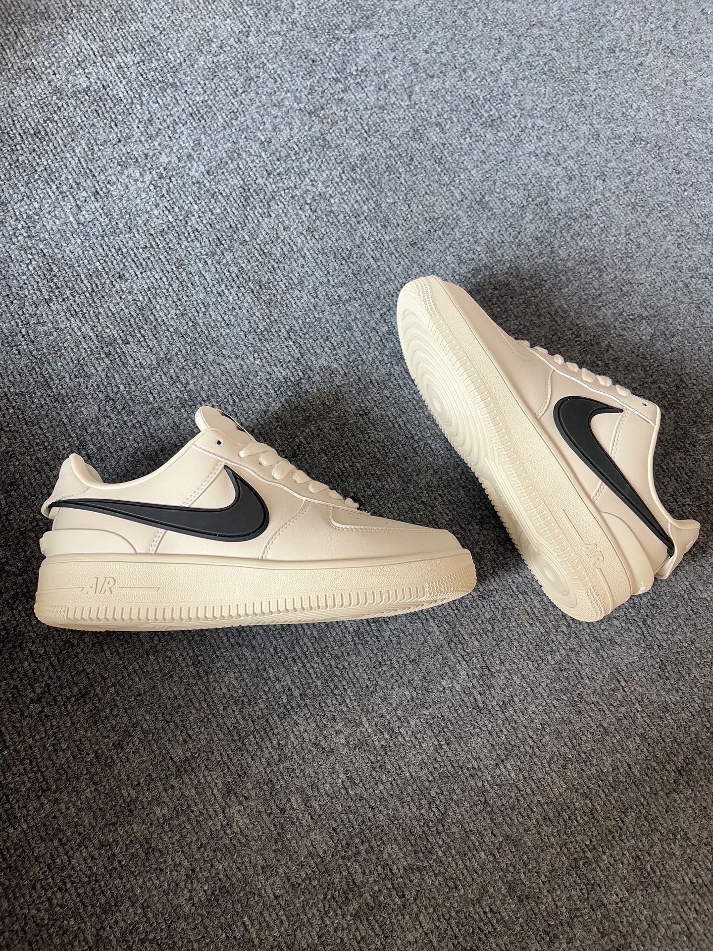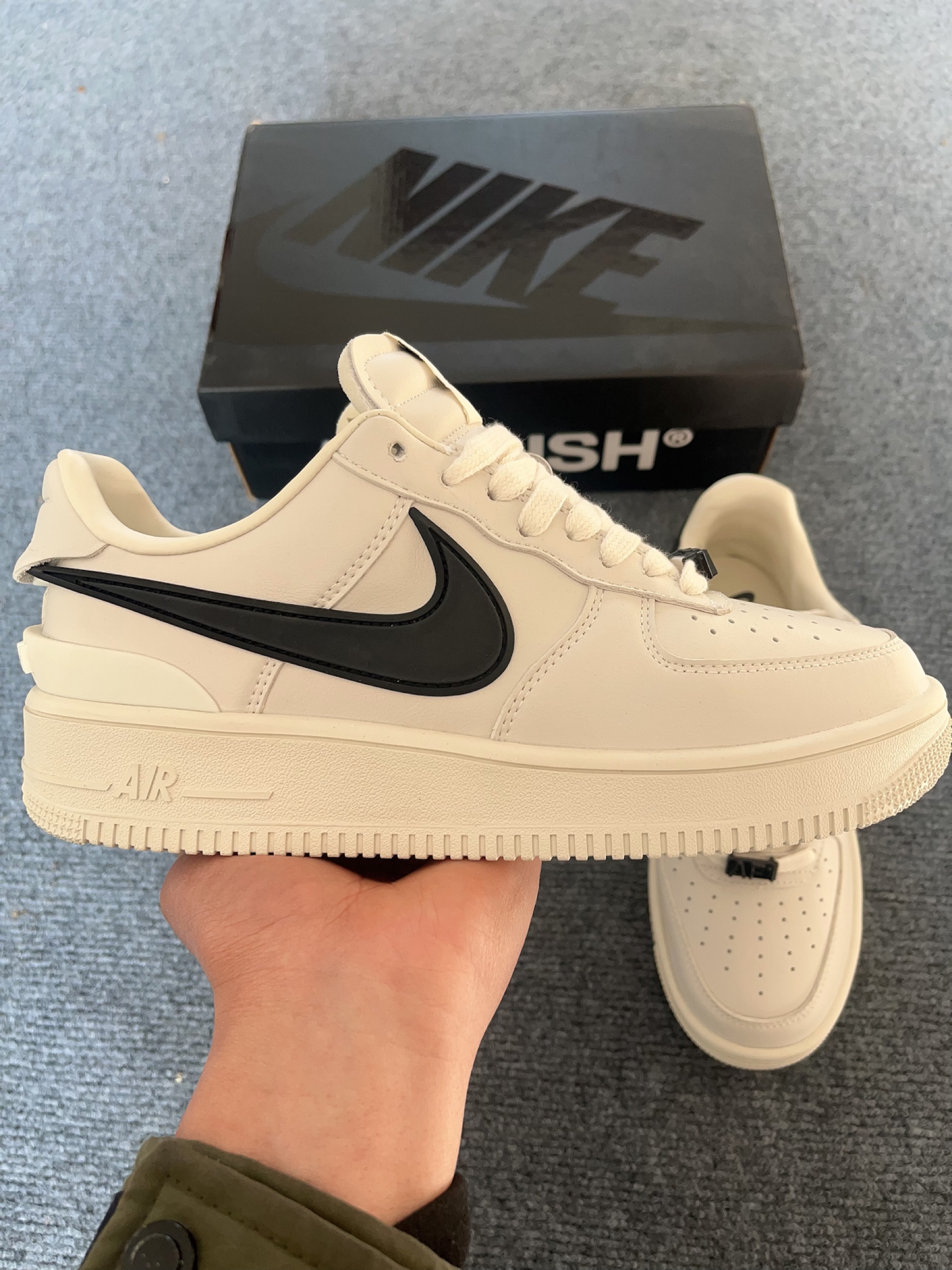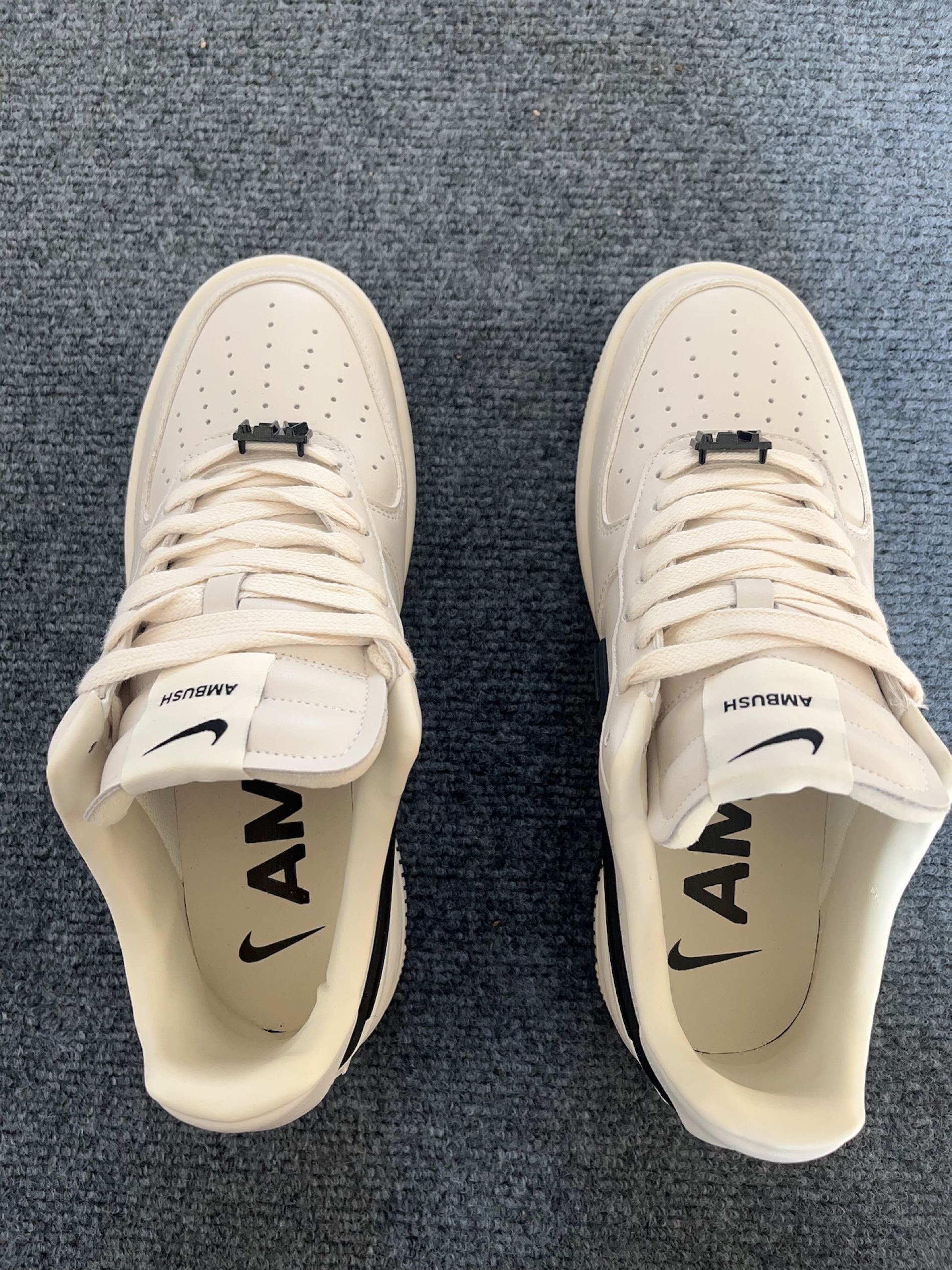 前几天过生日朋友送的这双Ambush和Nike的空军一号联名款,上脚说点真实感受吧。 先夸夸它的优点:白黑撞色真的还蛮百搭的,米白色的配色比纯白空军要耐脏一点,日常出门搭配牛仔裤、运动裤随便穿都不会出错。鞋身是皮质的,摸着手感很扎实,不是那种薄面皮革的材质,鞋底踩下去气垫的缓震感也比较明显,橡胶外底纹路清晰,耐磨效果应该不会出错。鞋身两侧的nike标是橡胶材质的我真的蛮喜欢的很年轻,看上去酷酷的...