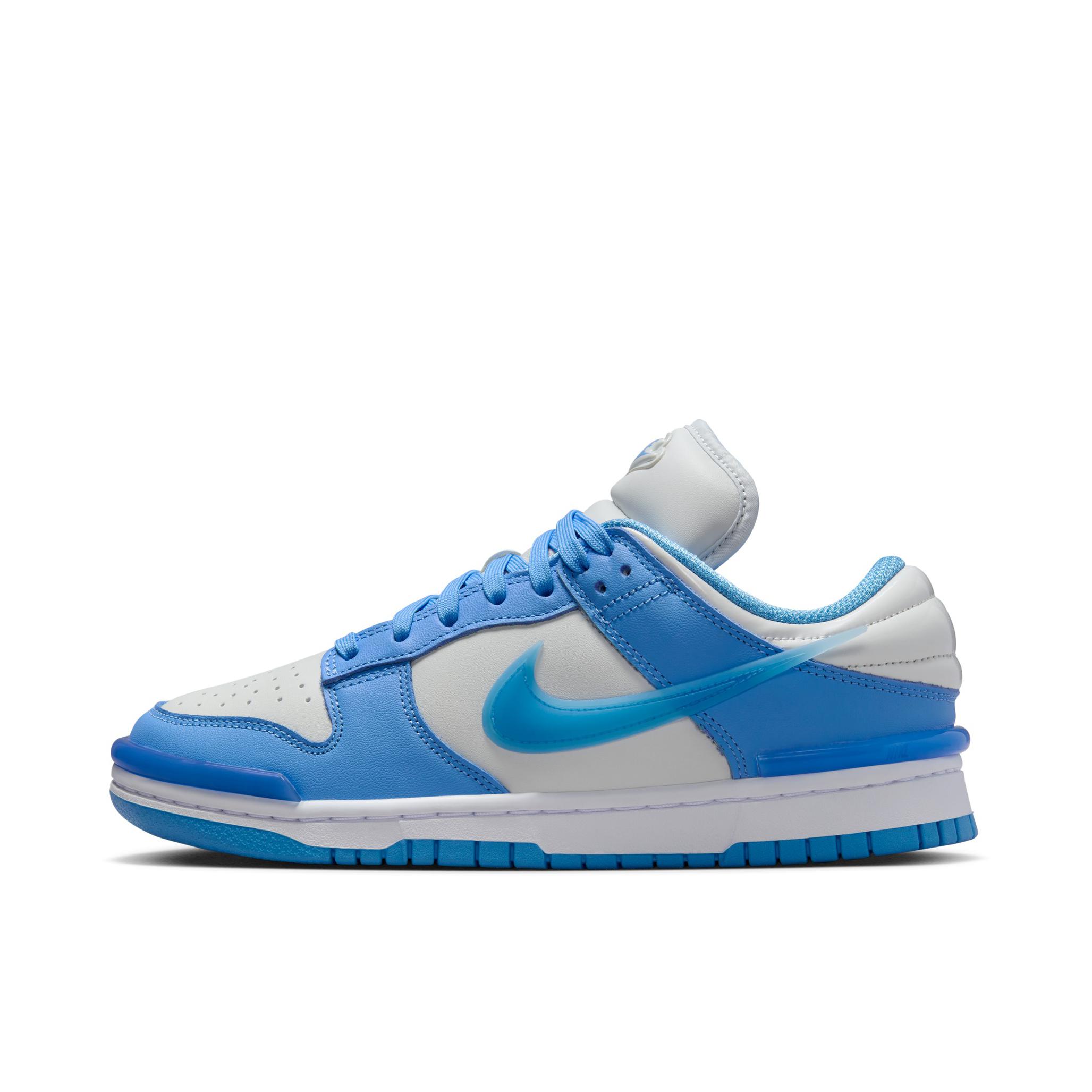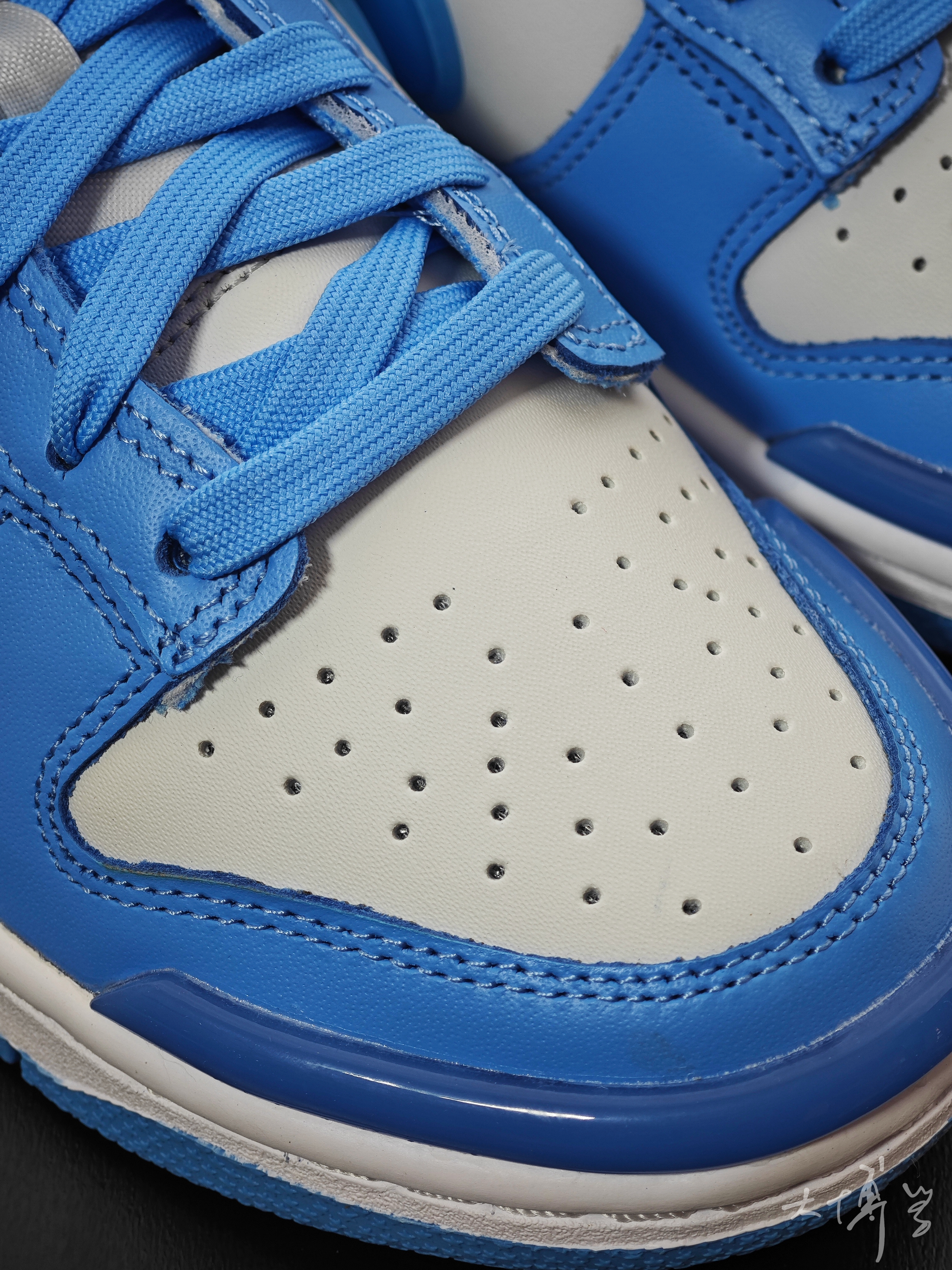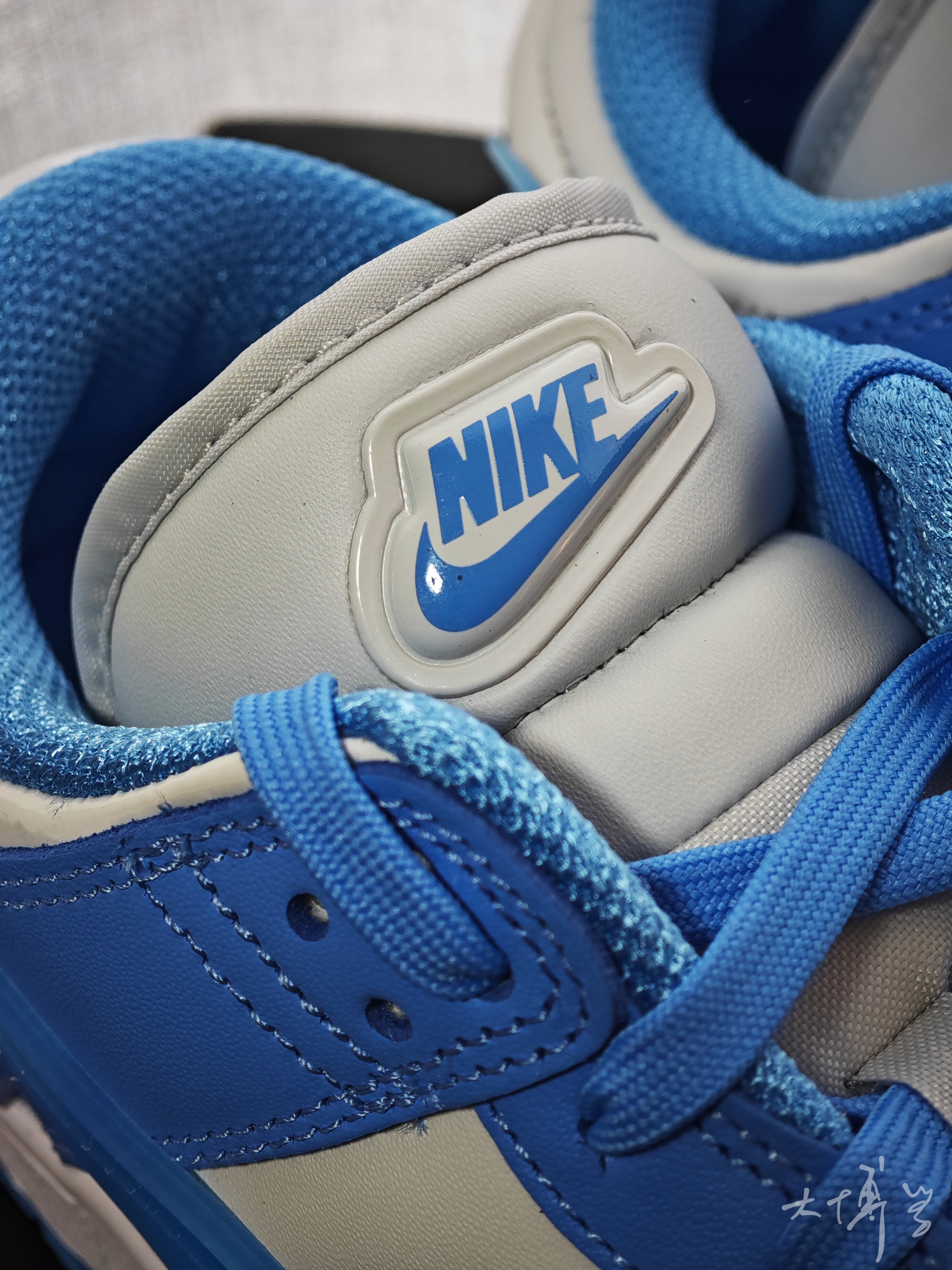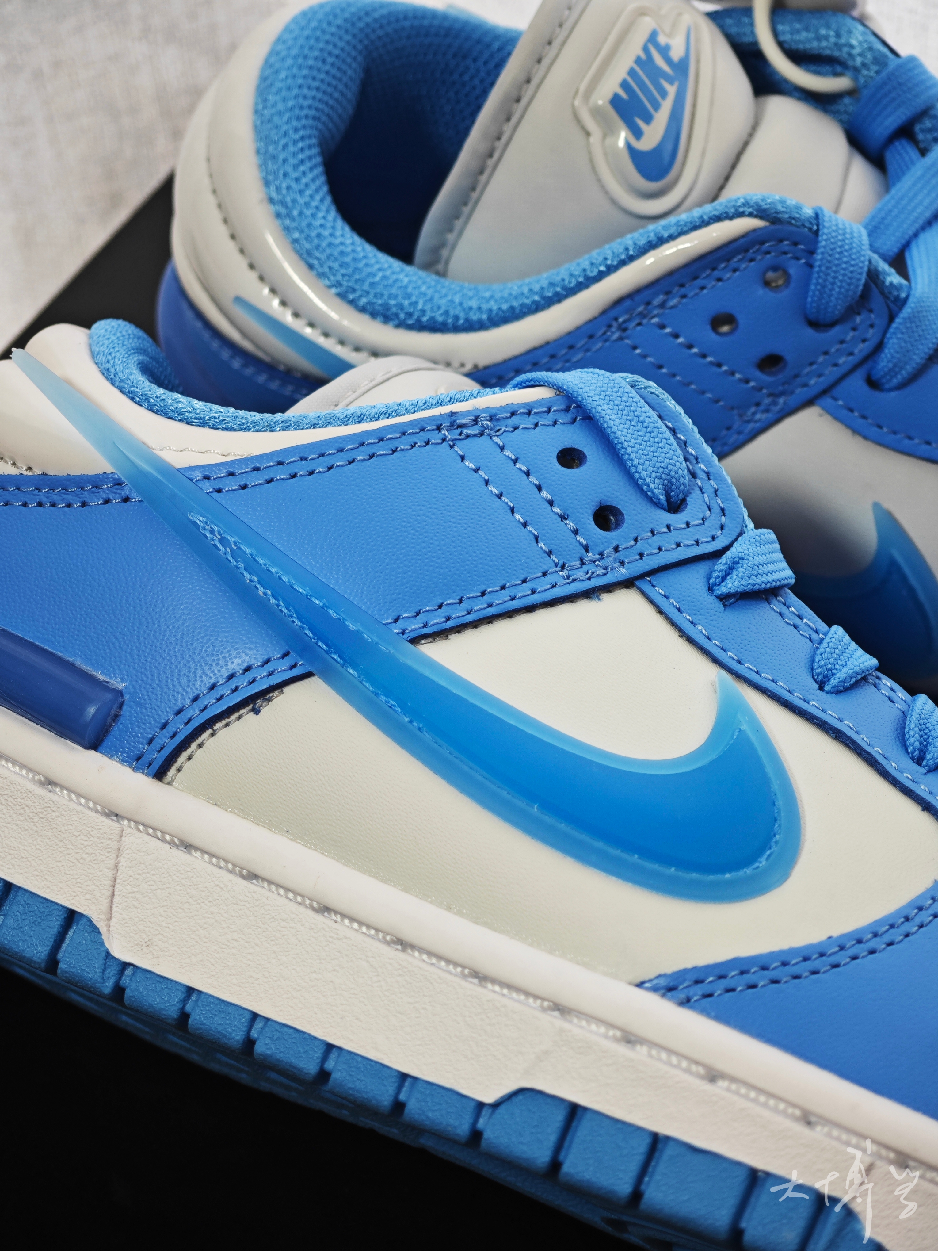 这是dunk low的twist鞋型 在dunk基础上增加很多胶皮塑料小饰物 比如鞋头,鞋跟还有swoosh 后跟设计的很膨胀 有点“香肠嘴”的感觉 配色是白配浅蓝 其实当做北卡蓝也没问题