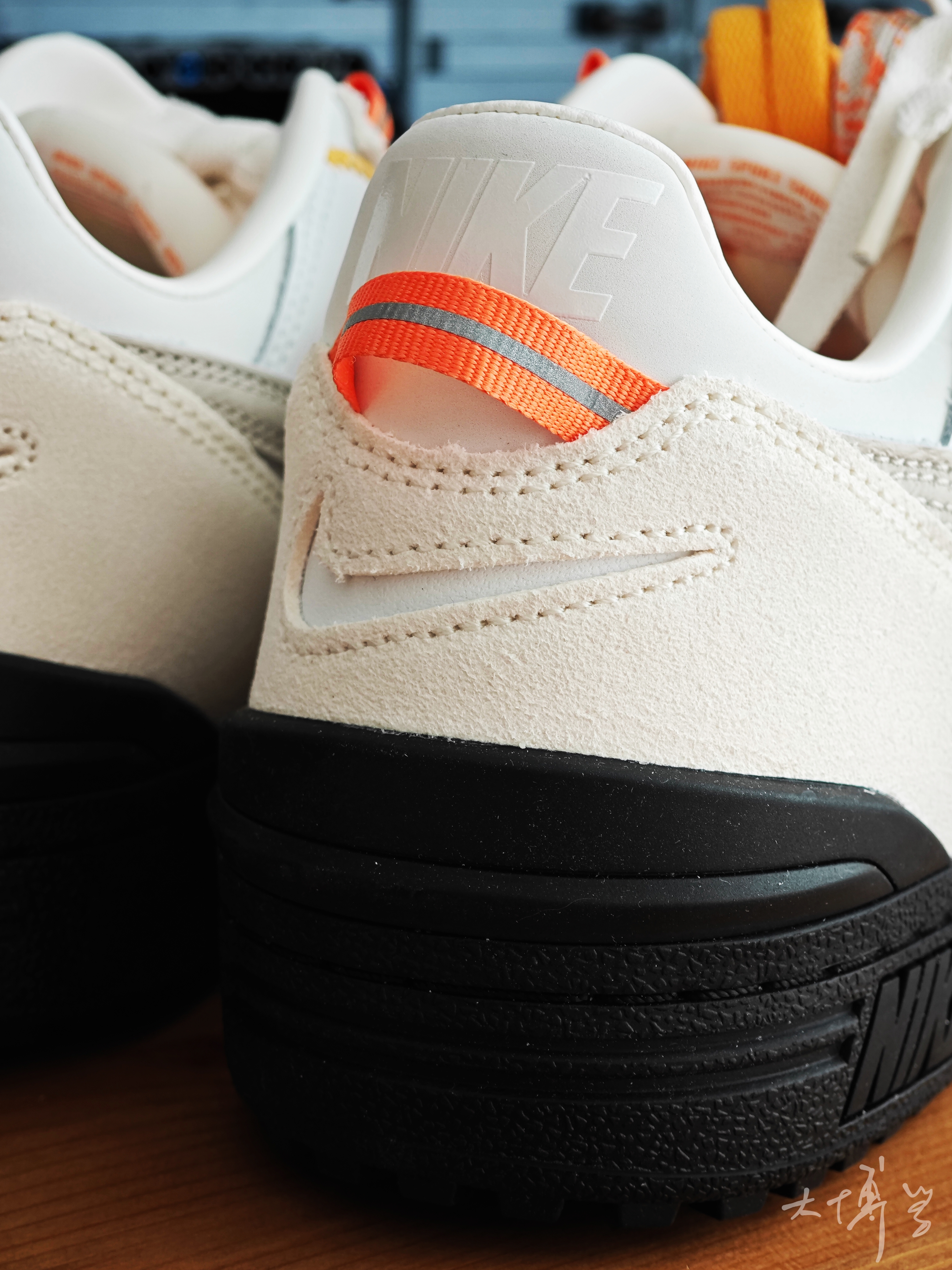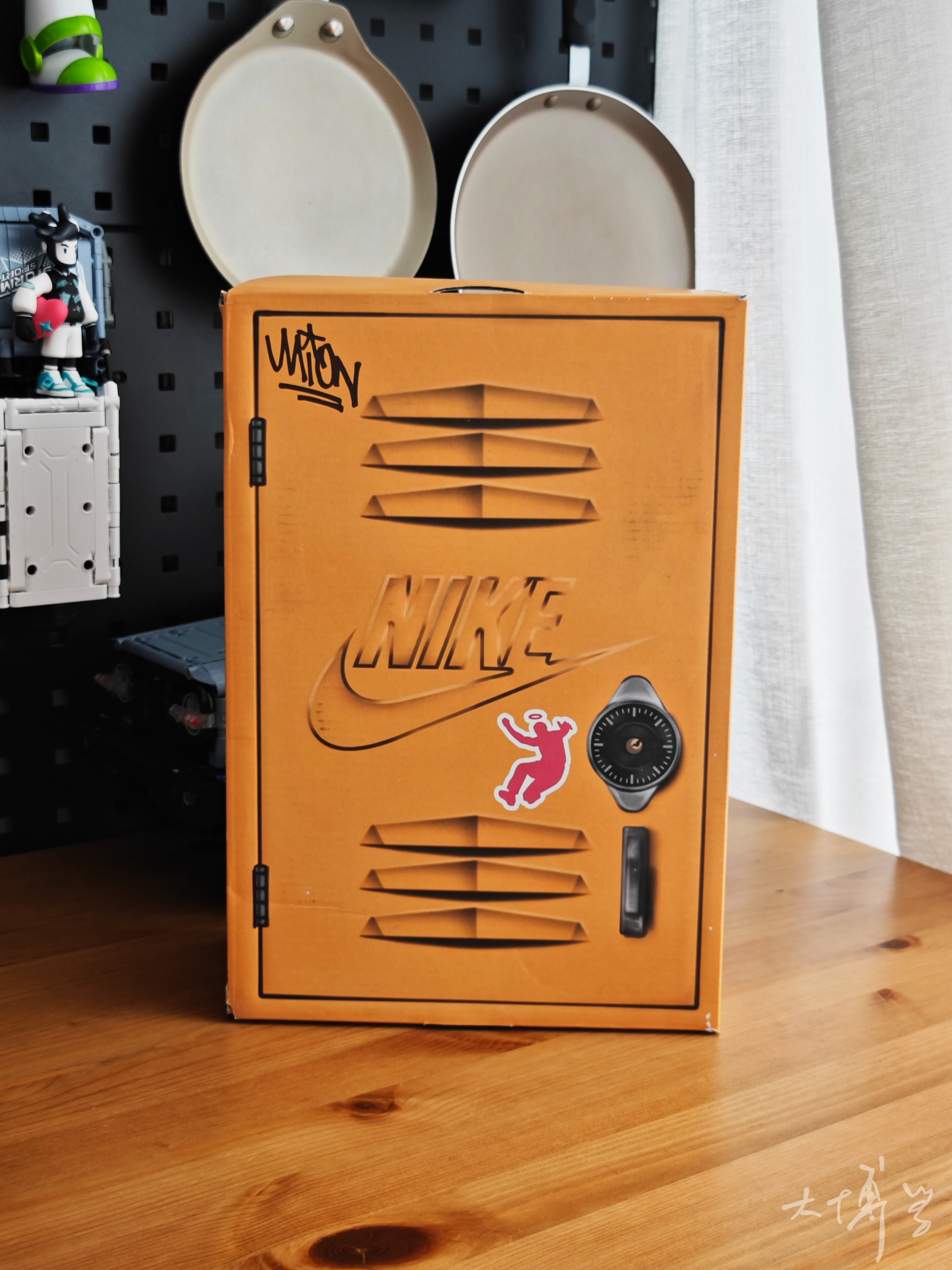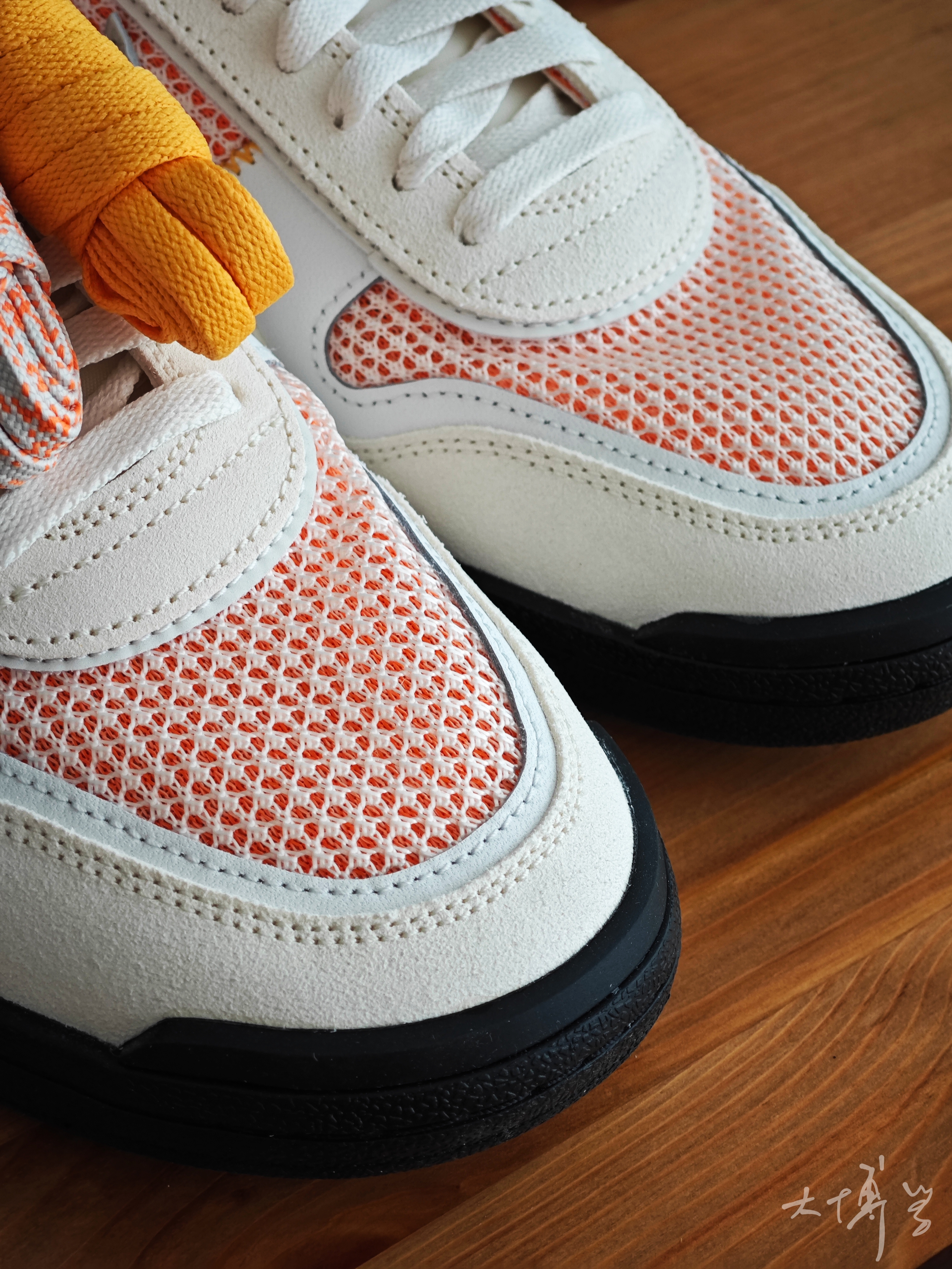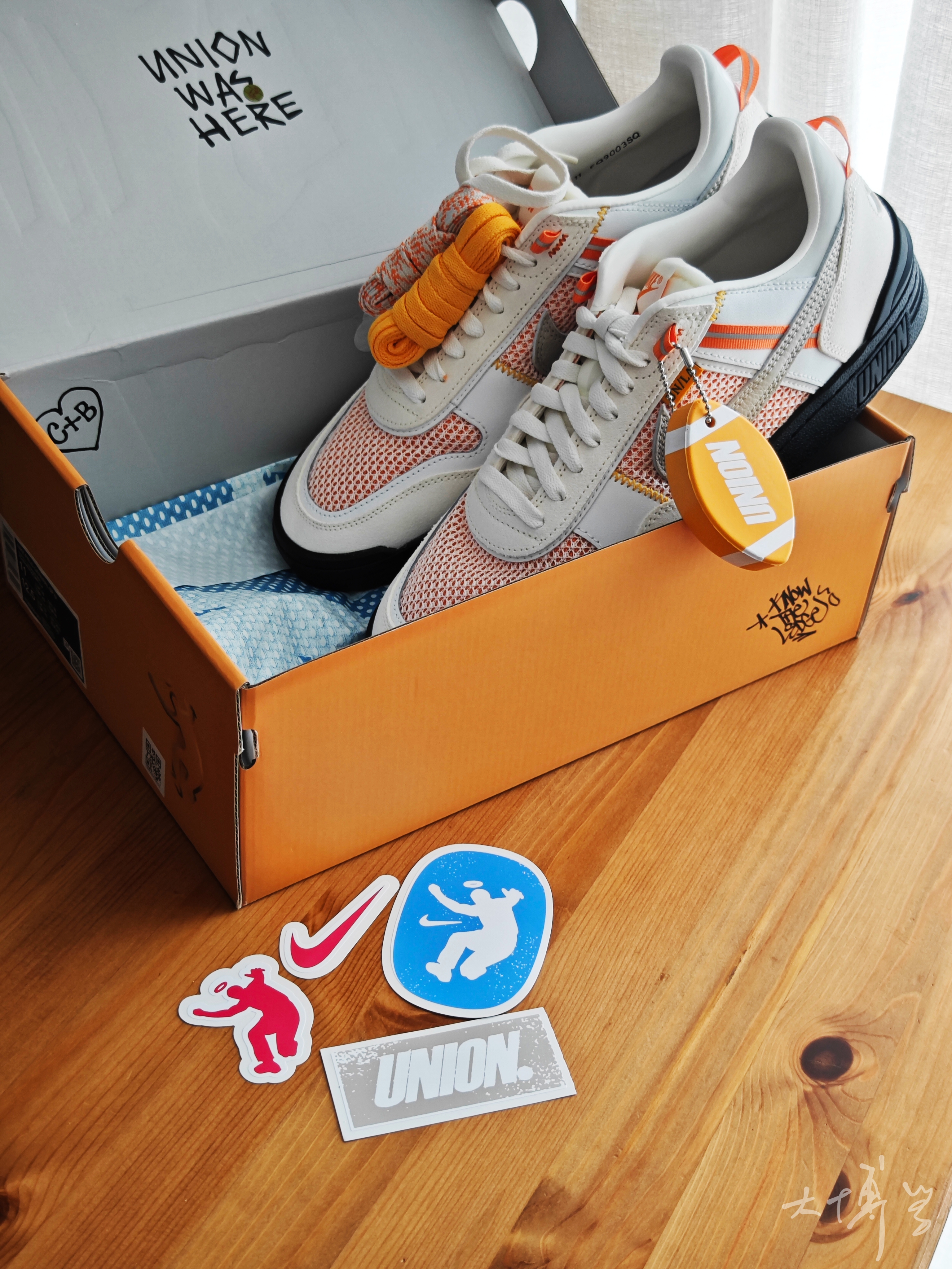一双union联名款 没想到这竟然是一双橄榄球鞋 白橙色鞋面很适合夏天 网面透气性也很好 附赠了几条鞋带和一堆小贴纸 鞋盒的设计我也很喜欢