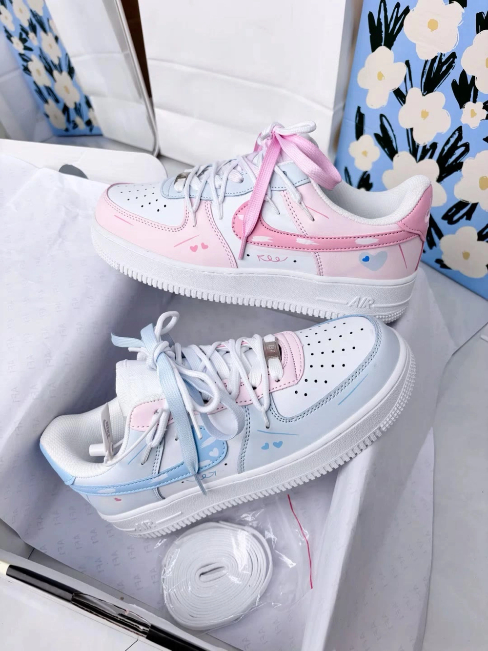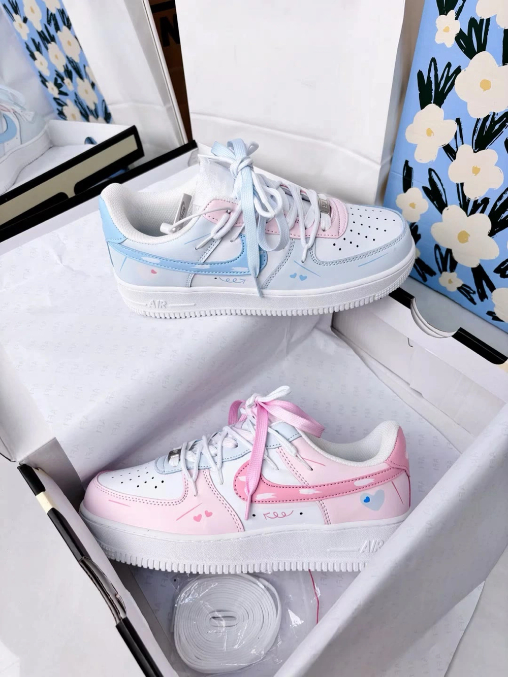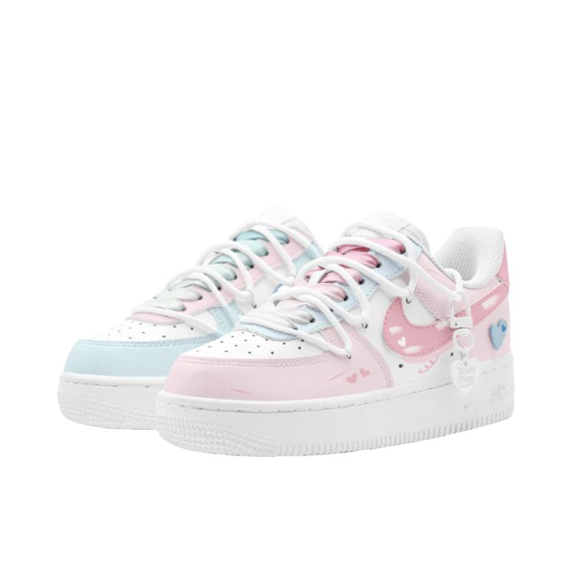 Nike AF1定制款直接戳中少女心💘 左边是奶fufu的浅蓝,右边是嗲嗲樱花粉 鞋身藏满小爱心刺绣+心形挂饰,解构设计甜而不腻~ 连鞋盒都是粉粉的浪漫礼盒🎁 印着“I’M SO IN LOVE WITH YOU” 拆箱仪式感直接拉满💌