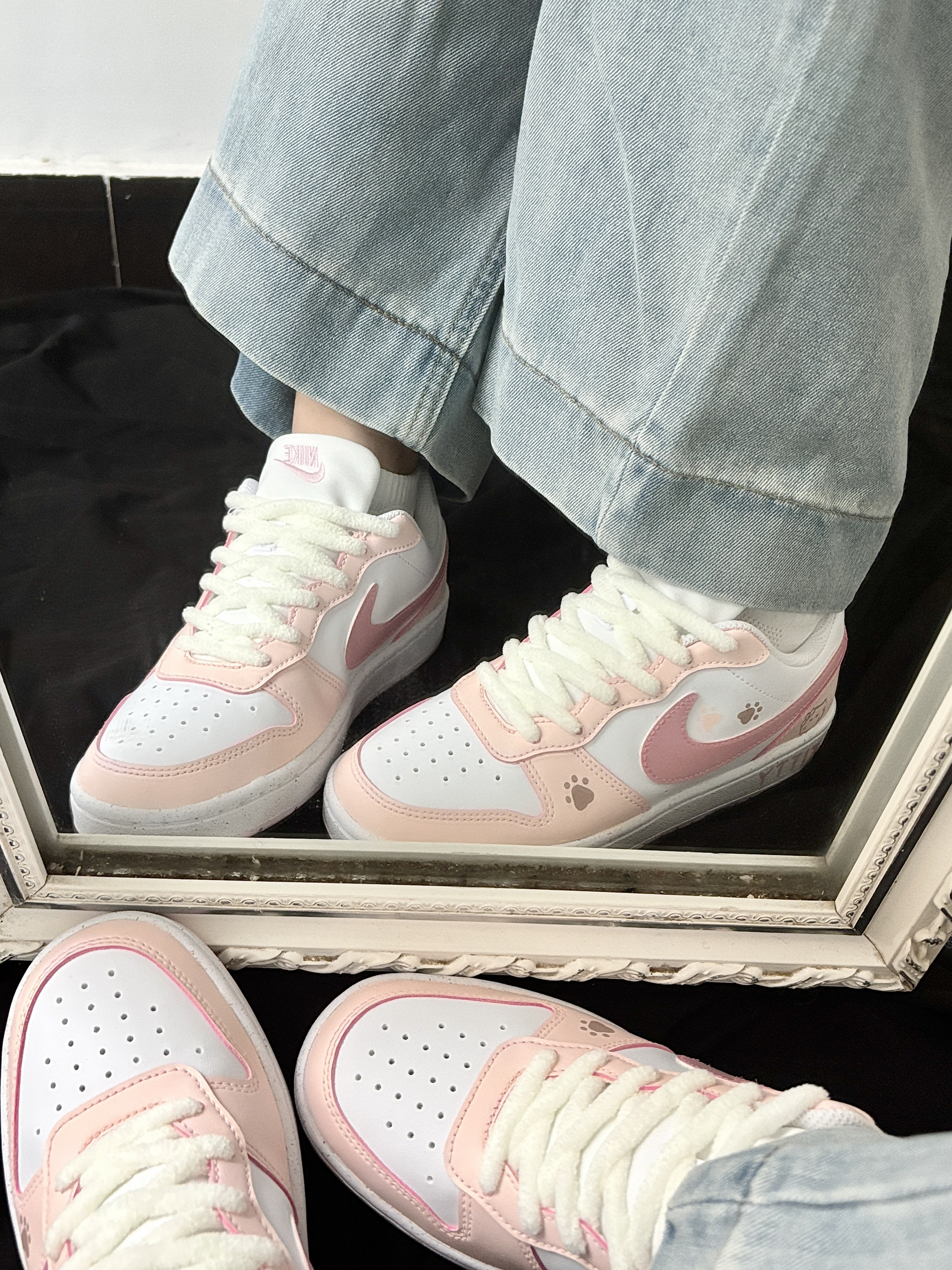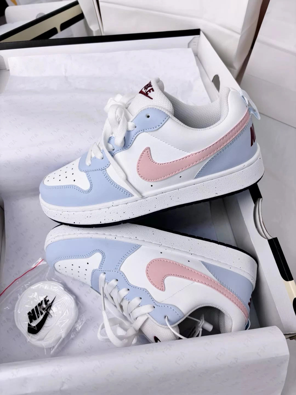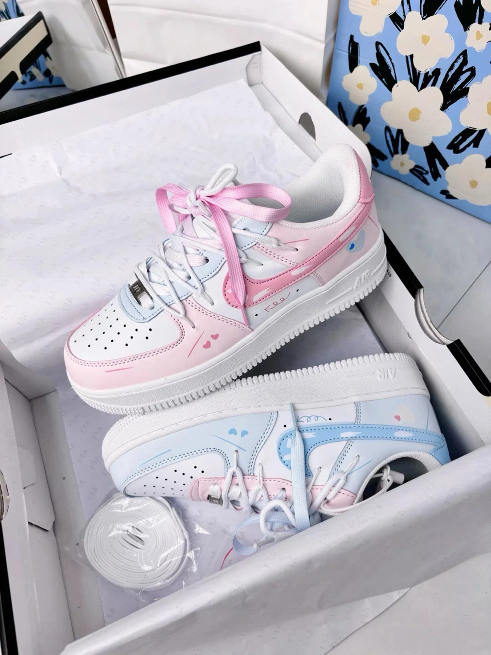 Nike AF1定制款直接戳中少女心💘 左边是奶fufu的浅蓝,右边是嗲嗲樱花粉 鞋身藏满小爱心刺绣+心形挂饰,解构设计甜而不腻~ 连鞋盒都是粉粉的浪漫礼盒🎁 印着“I’M SO IN LOVE WITH YOU” 拆箱仪式感直接拉满💌