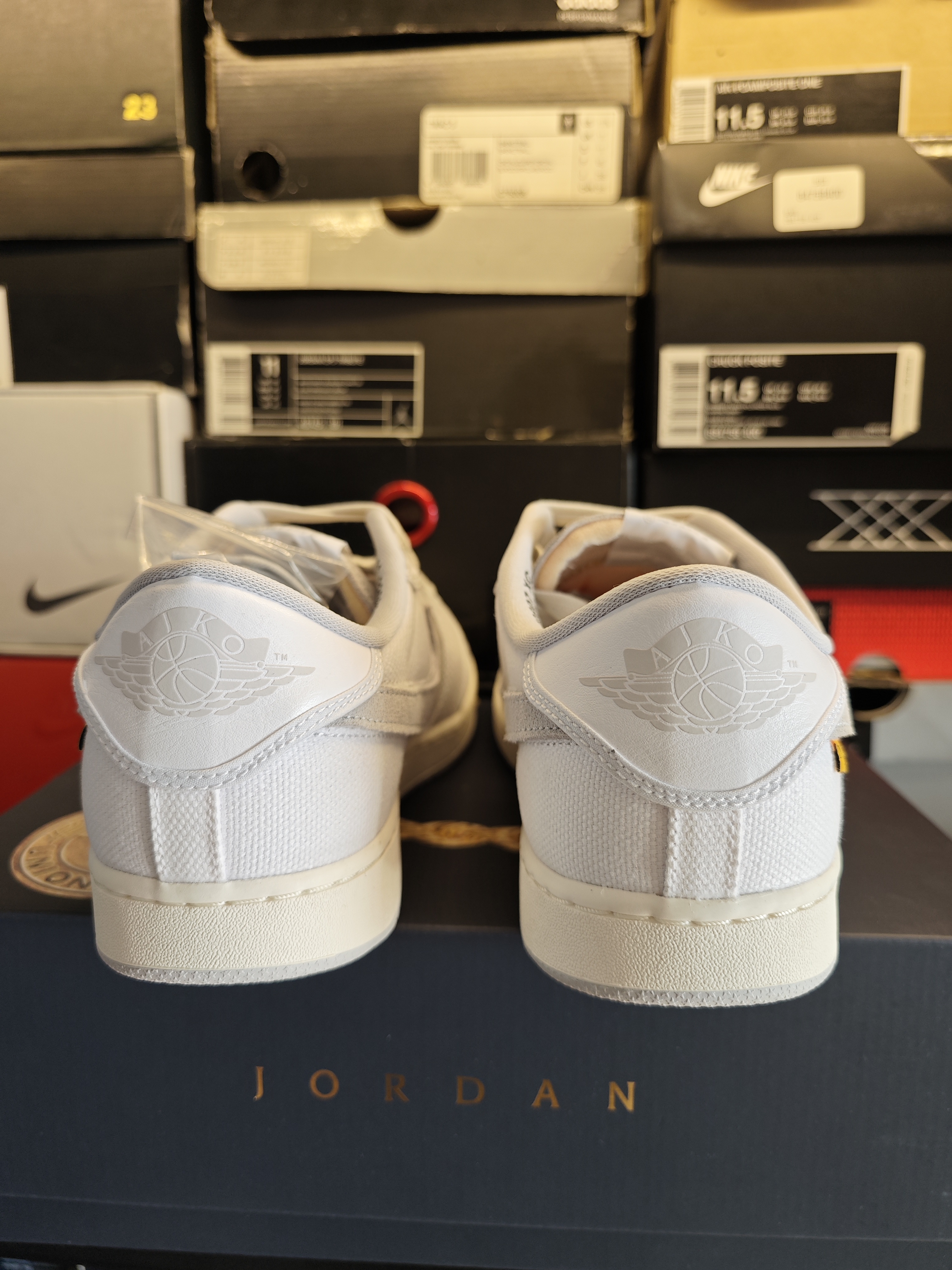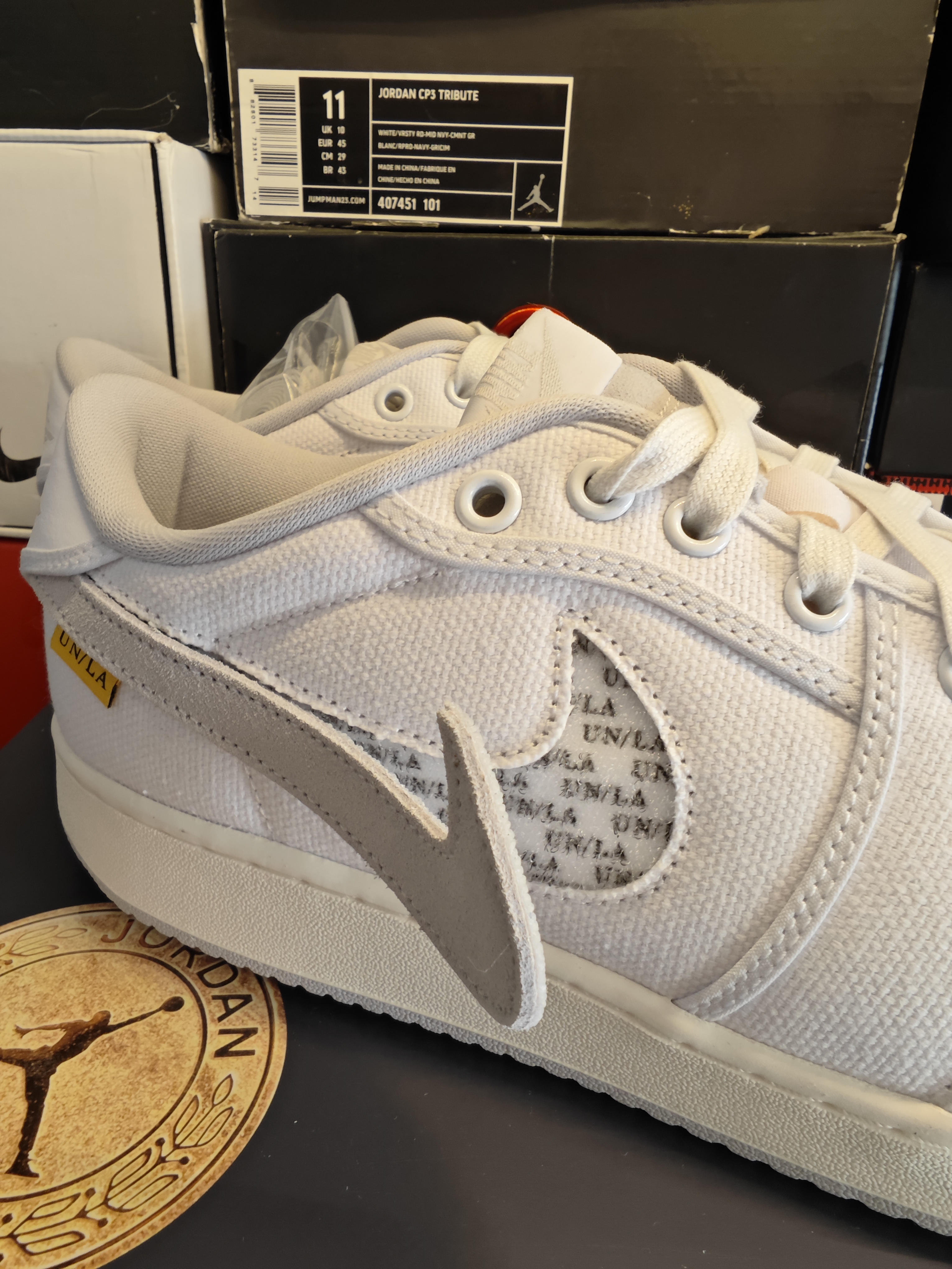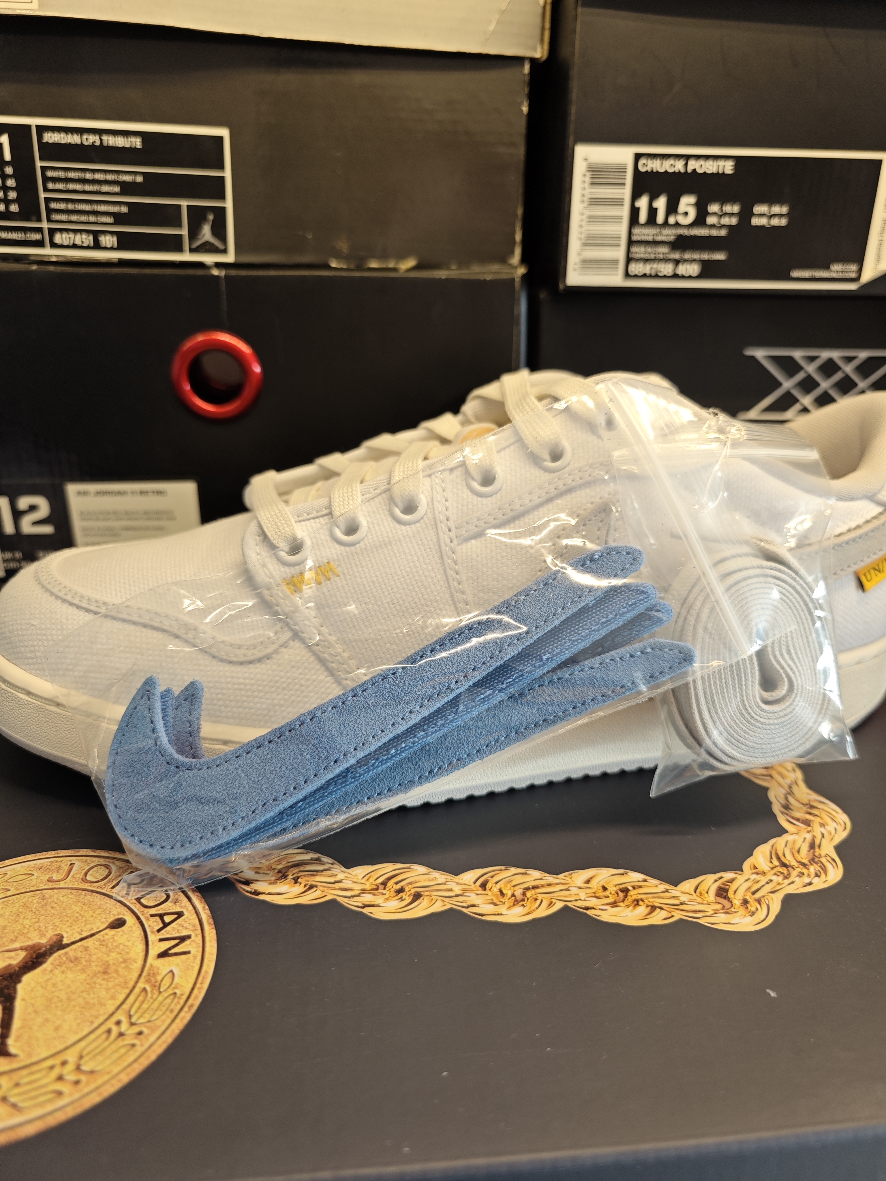 一款union la联名的低帮AJ 1 这是特殊的ko版本 所以鞋面是帆布材质的 相比鞋盒上的大金链子,鞋子略显低调 swoosh使用魔术贴设计 可以更换,也可以直接卸掉 随意调整,找到自己的风格