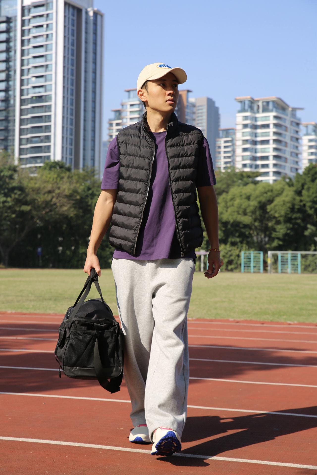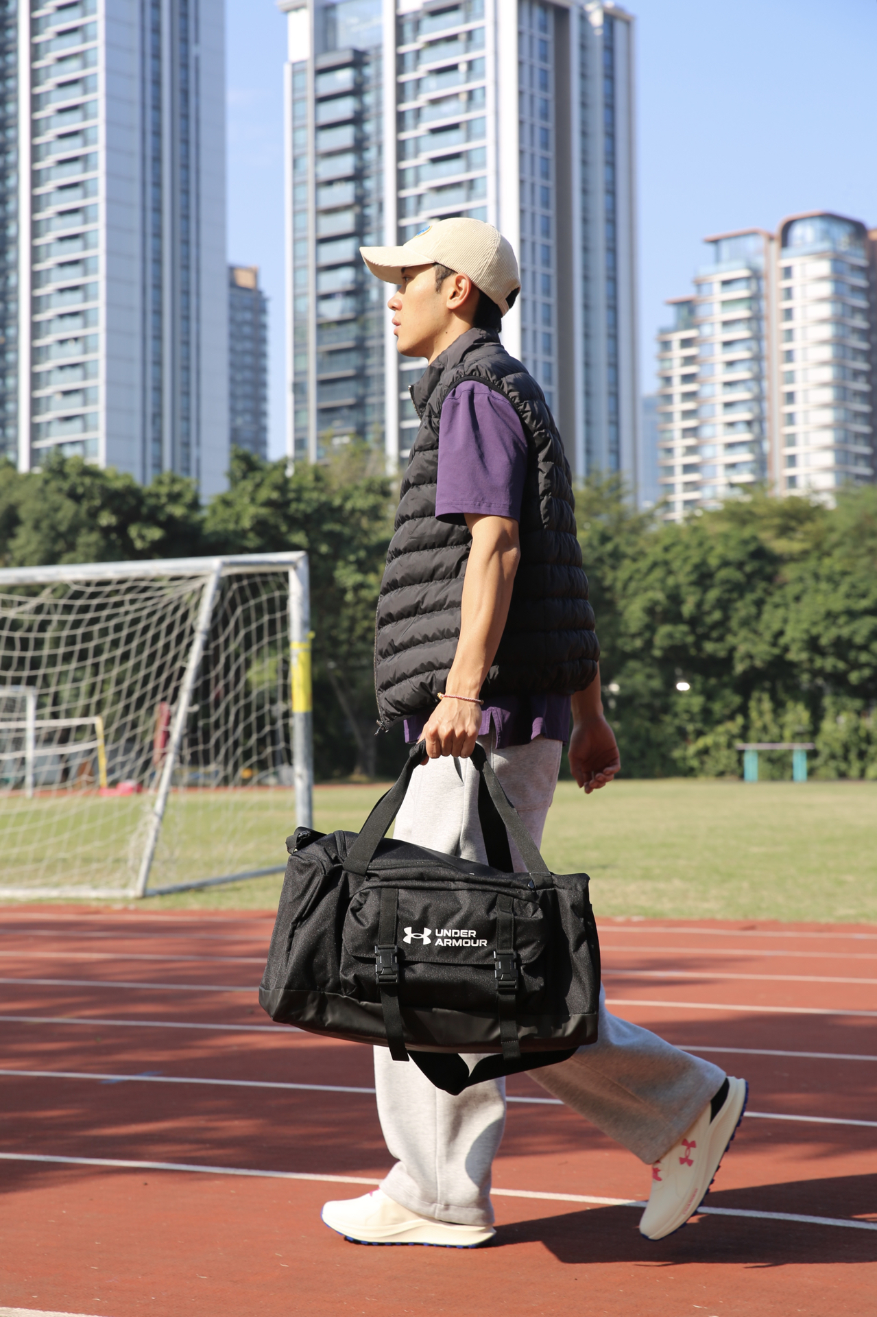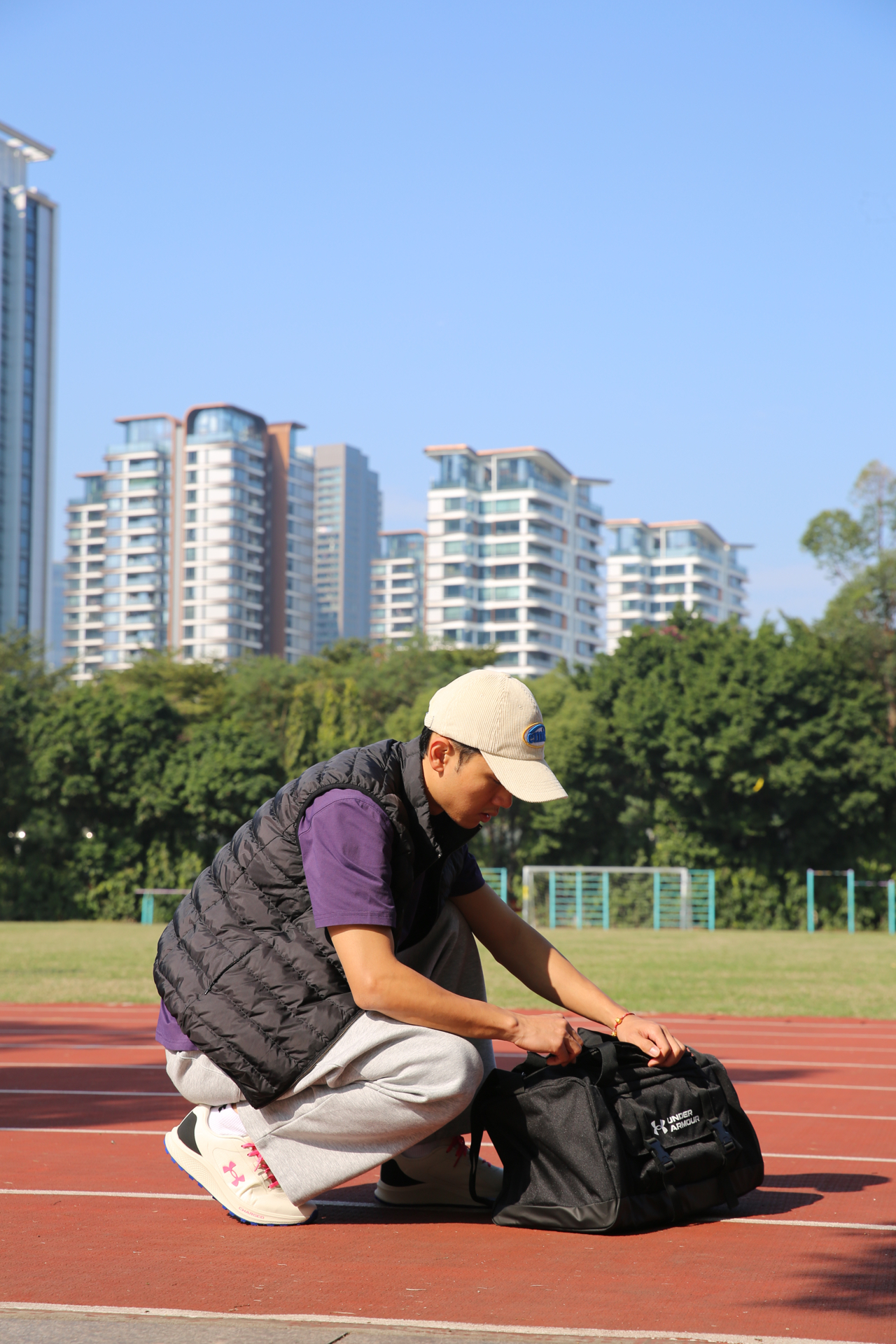 哈喽兄弟们,今天的训练搭配: 灰色运动裤+紫色速干 T 恤+羽绒背心,保暖又不影响活动。 鞋子是Under Armour的跑步鞋。鞋子很轻跑起来很清爽,训练时间久了脚也不会觉得累。网眼鞋面透气性在线,户外跑或者日常训练都不闷脚,系紧鞋带后包裹感很强,脚和鞋贴合得很好。米色+粉色的配色也很加分,冬天穿看着很干净。 背的包是 UA Gametime 健身包,颜值和实用性都很在线。UA Storm ...