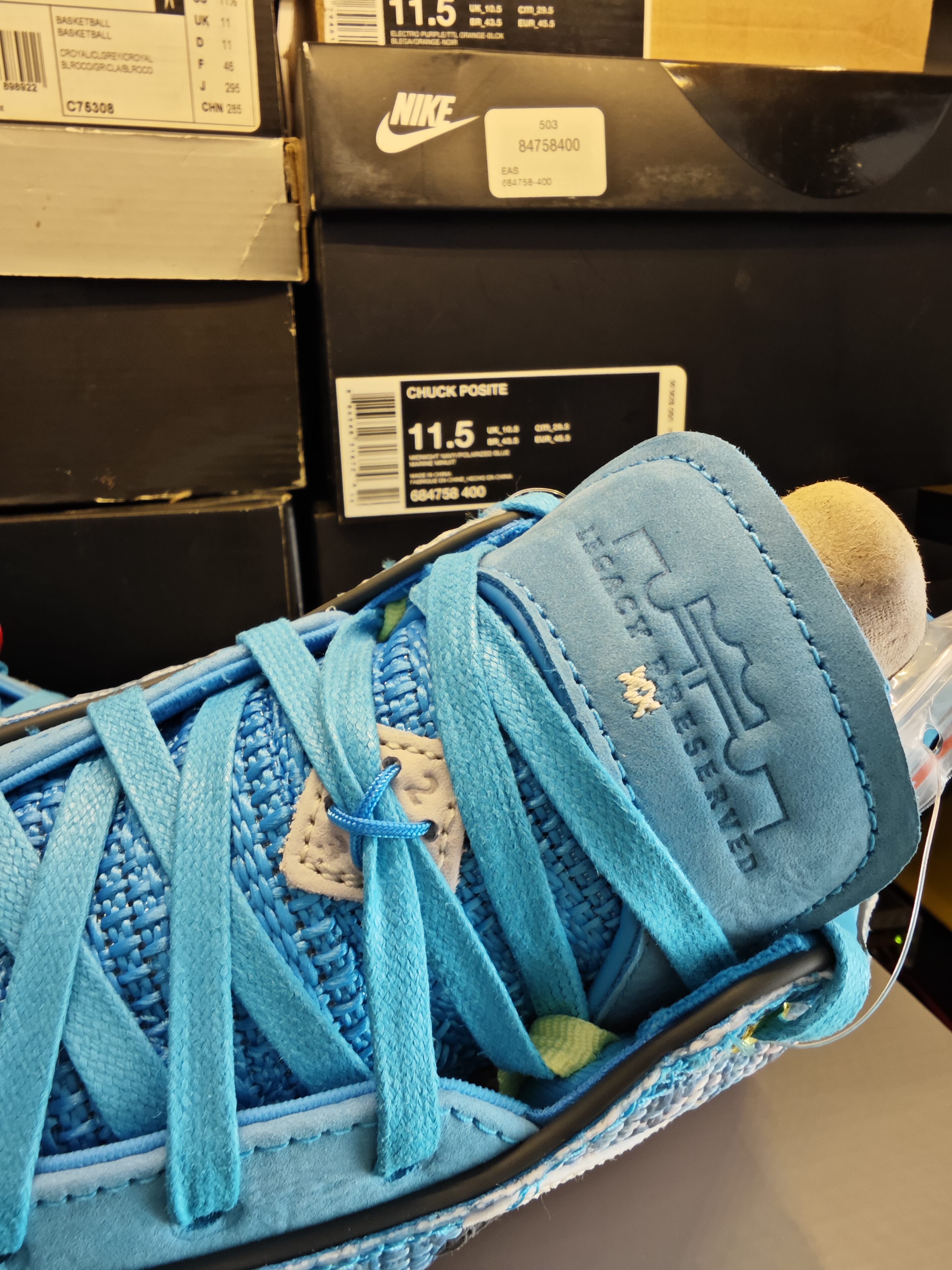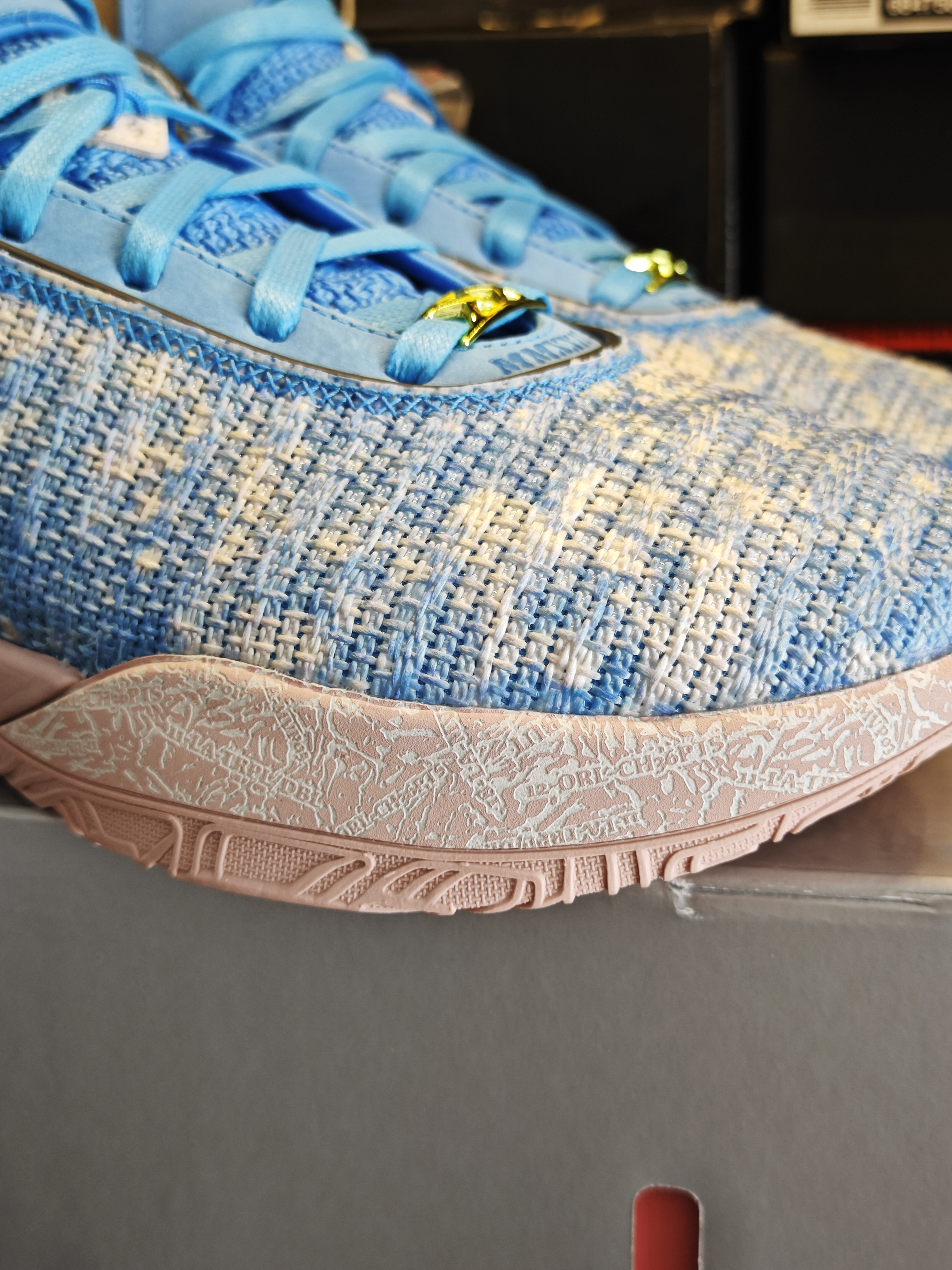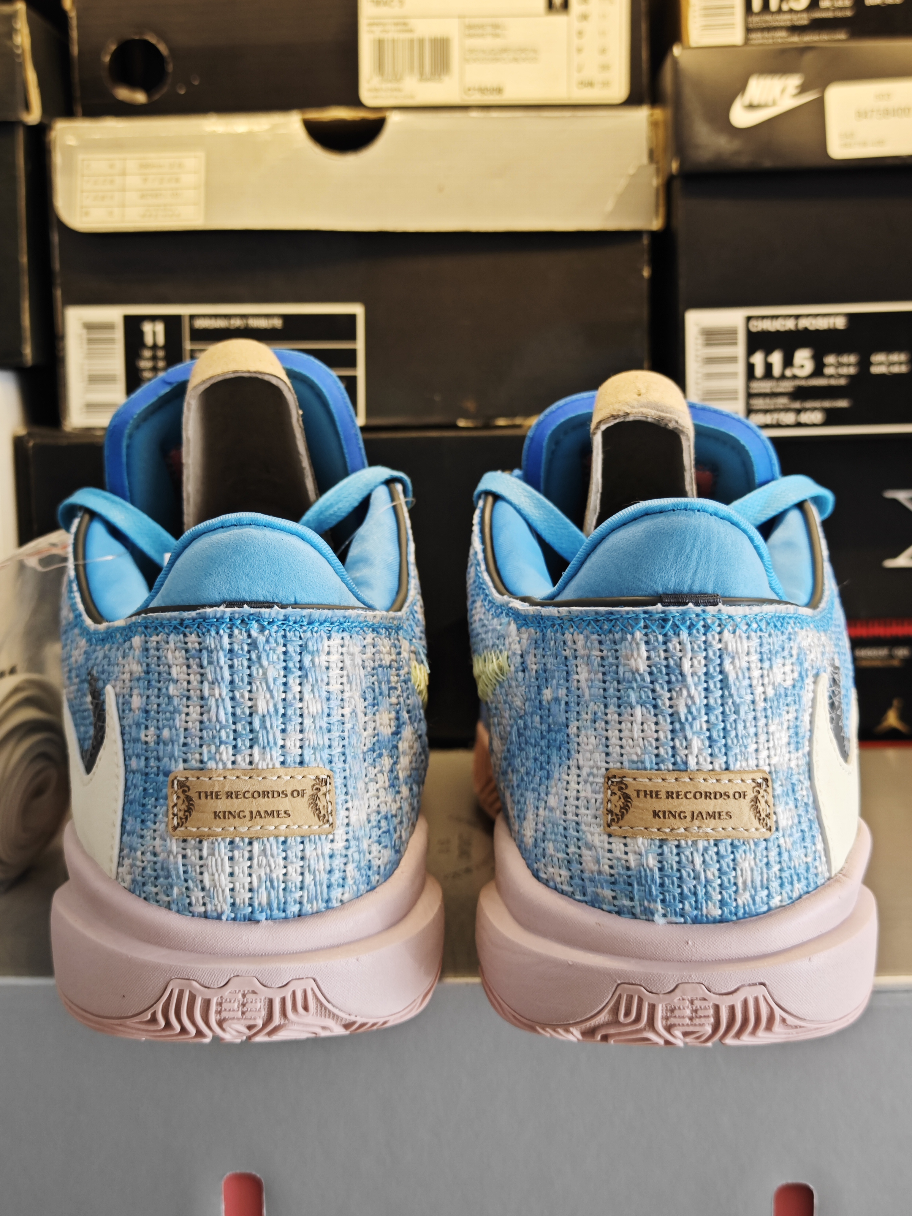 这是勒布朗20全明星配色 首先这个蓝天白云的鞋面我真的特别喜欢 这种蓝白交织在一起的感觉 看着很舒心 然后就是两个叠加在一起的swoosh 做了倒钩设计 这是在致敬倒钩吗 还是很帅的啊