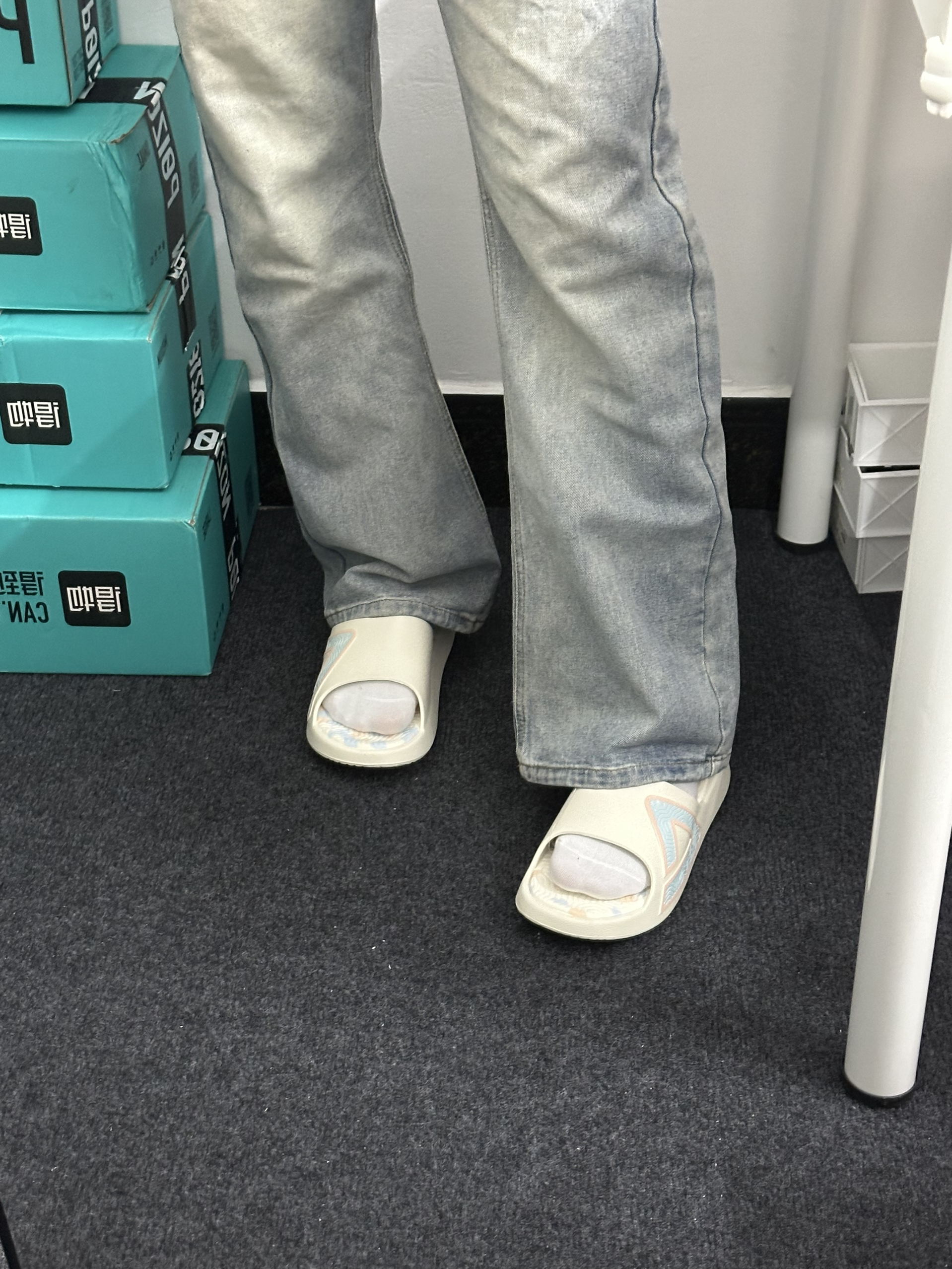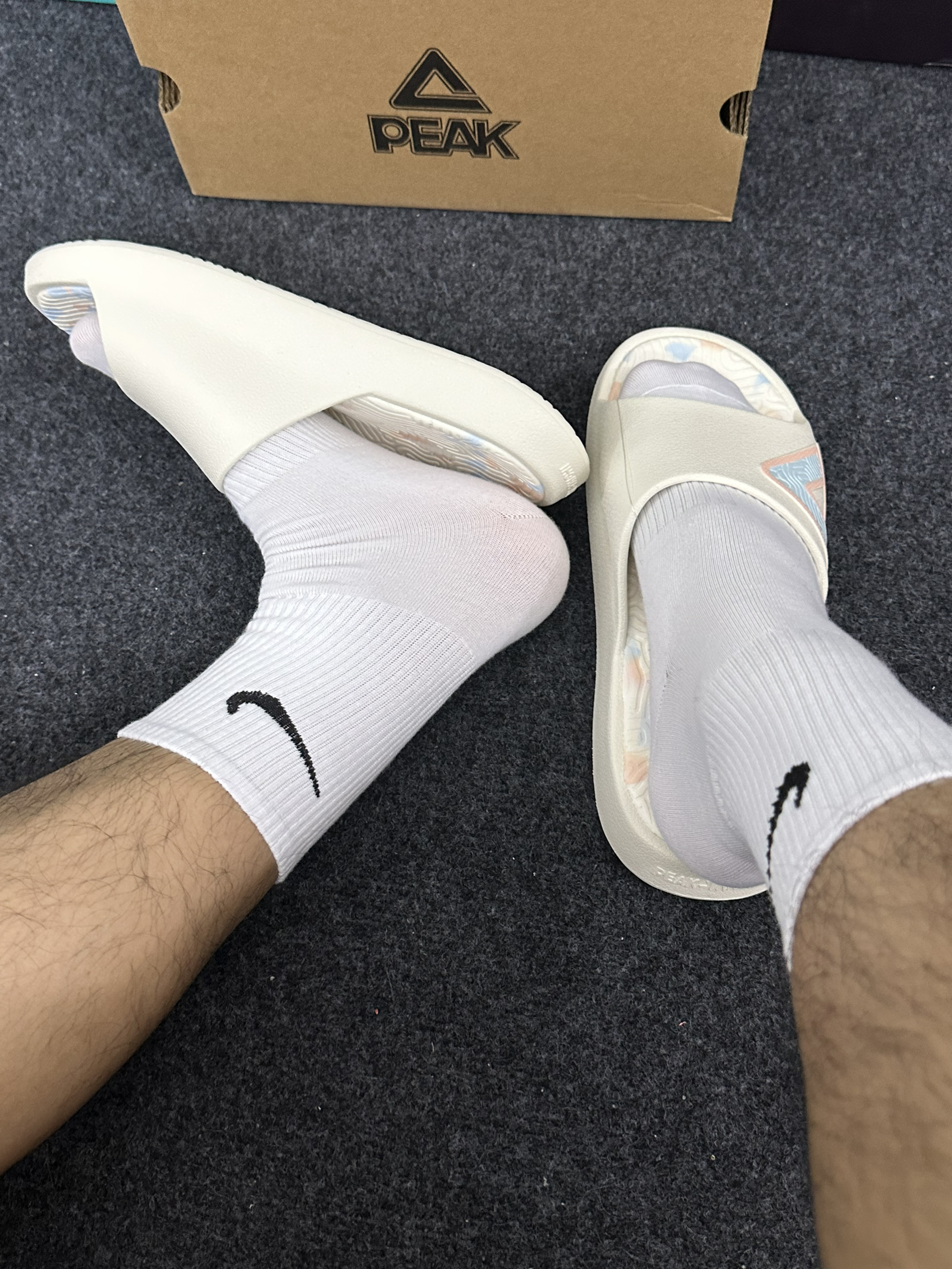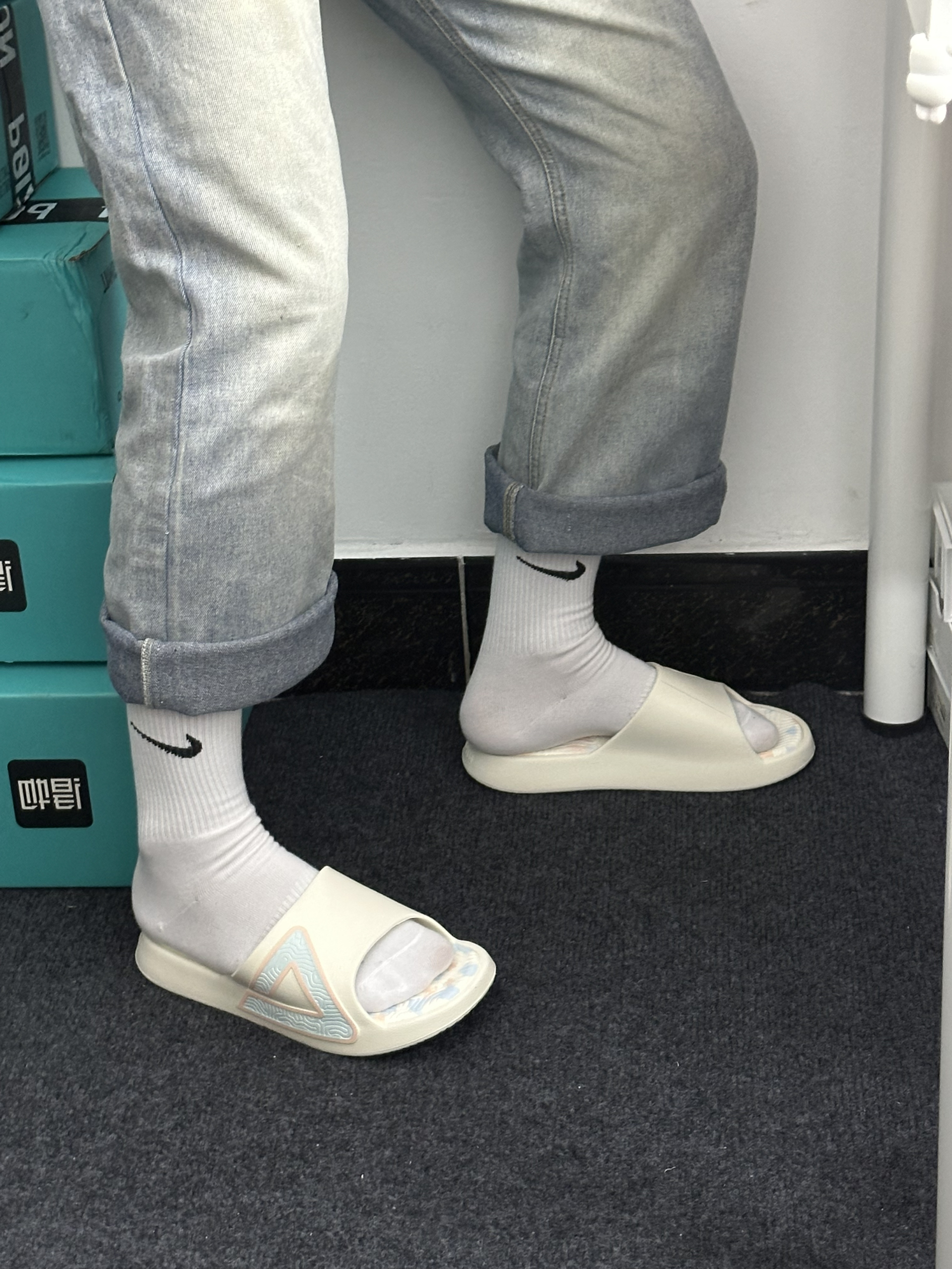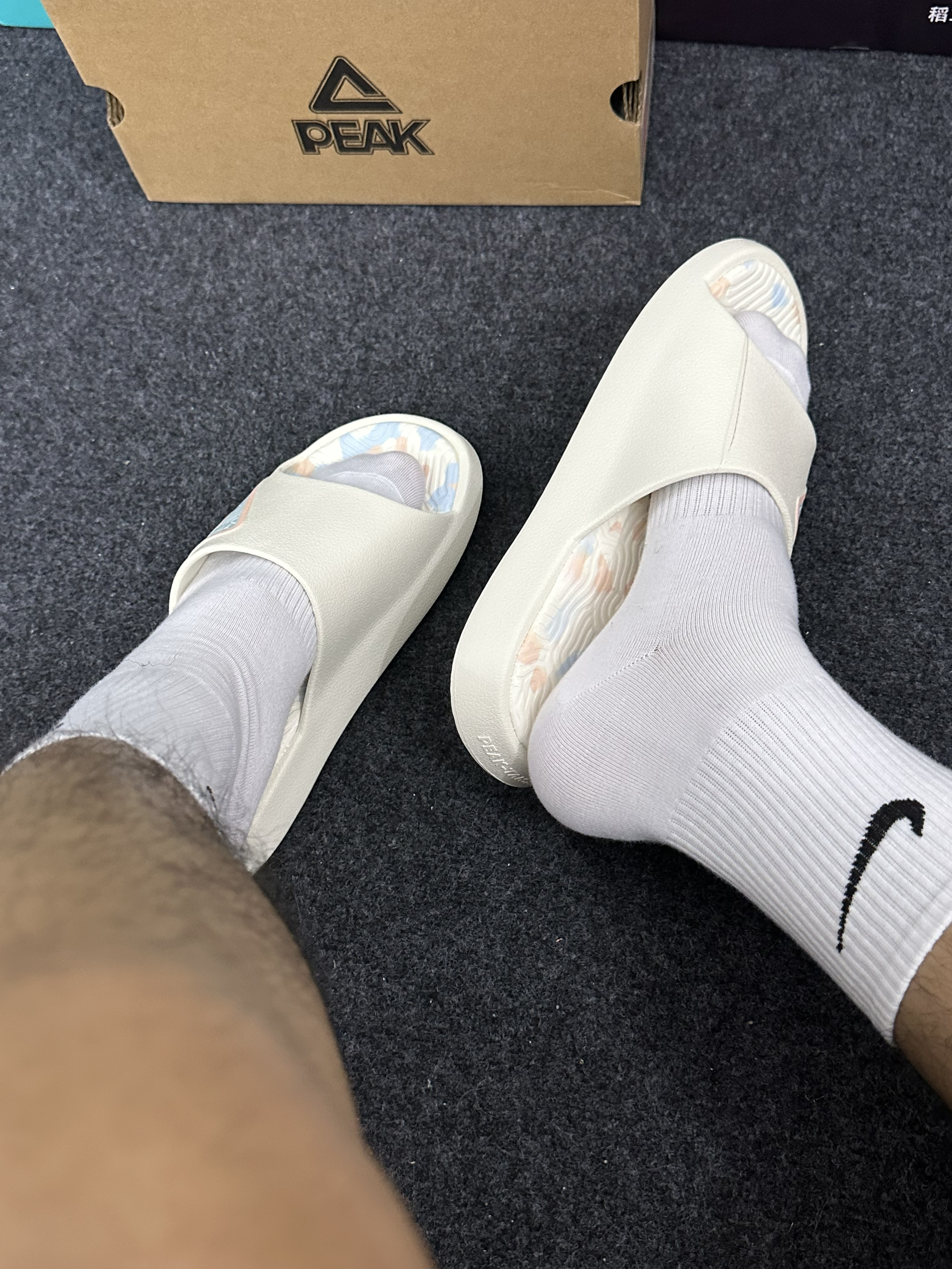 这双匹克拖鞋上脚软乎乎的,走路时脚感很弹。平时配个短裤或者运动裤就很随性,穿着逛久了也不觉得累,舒服又百搭。