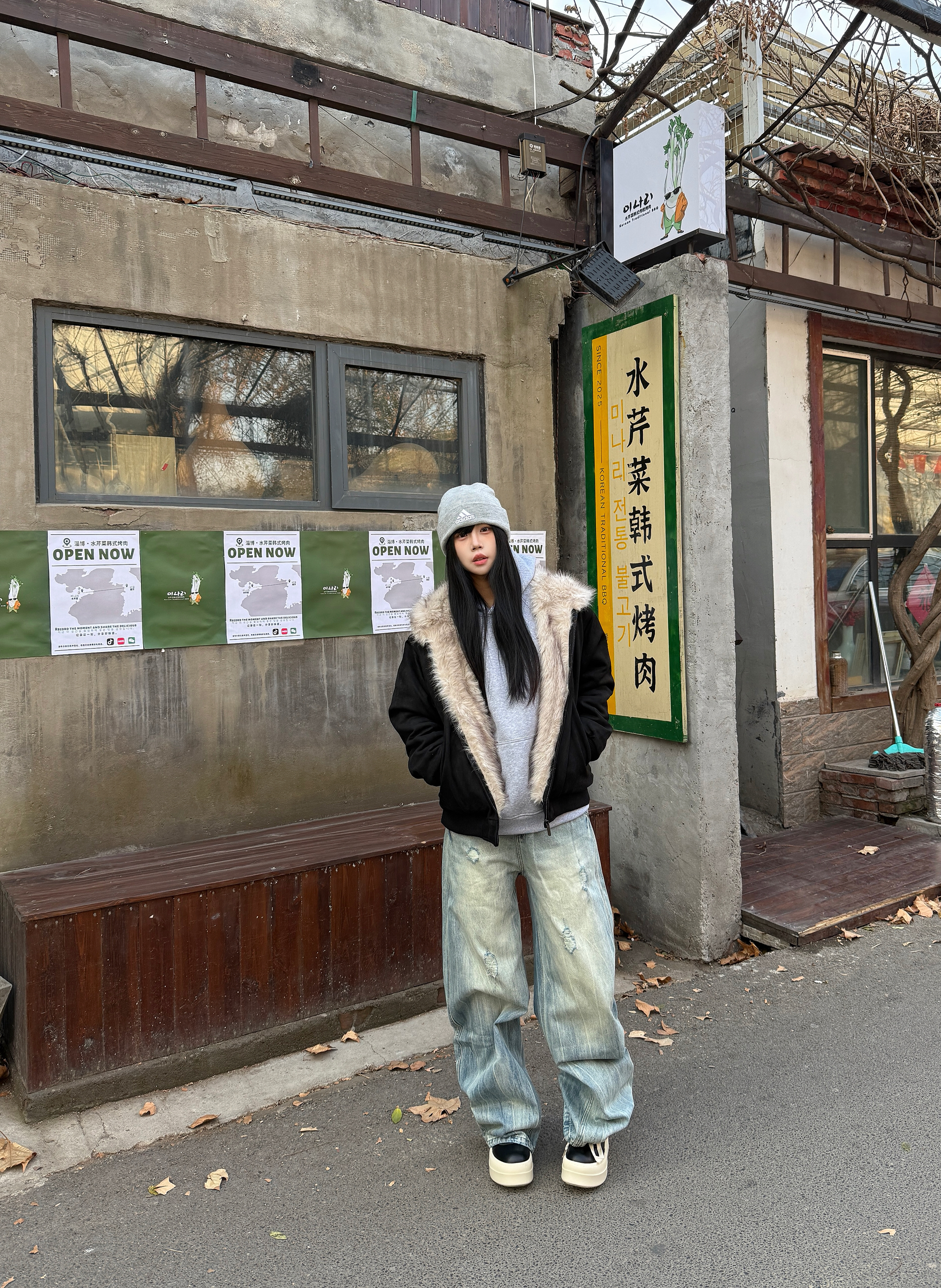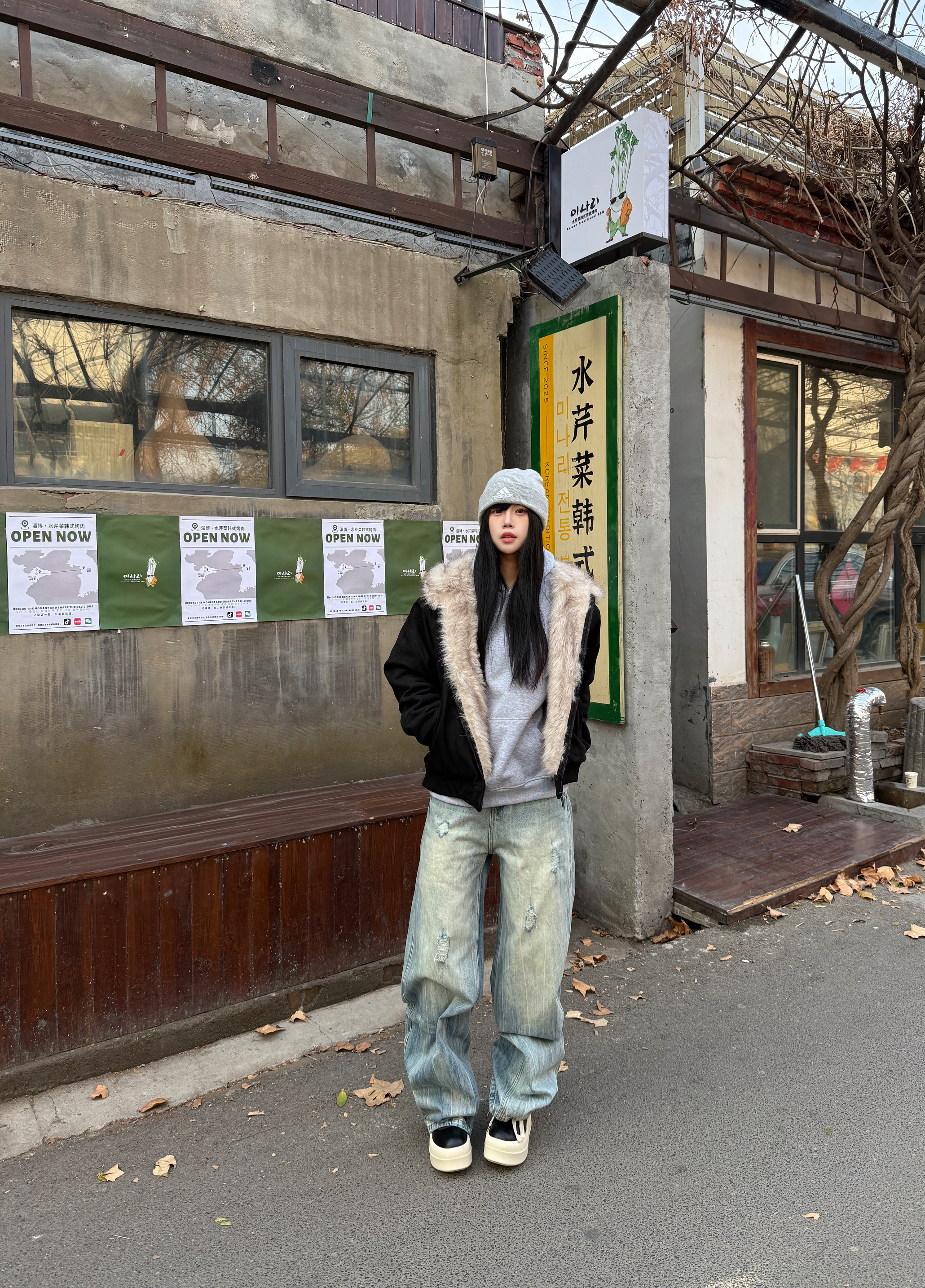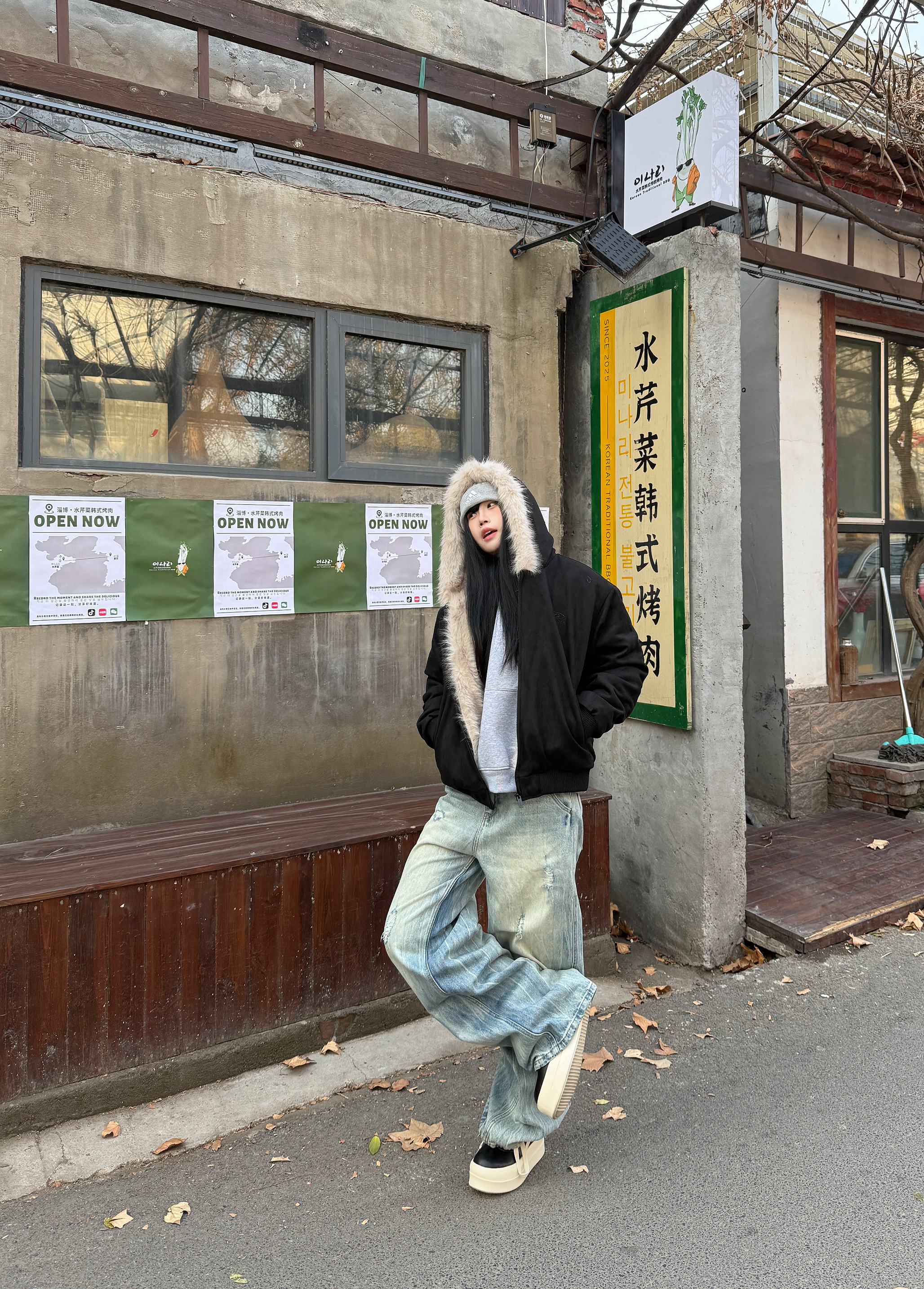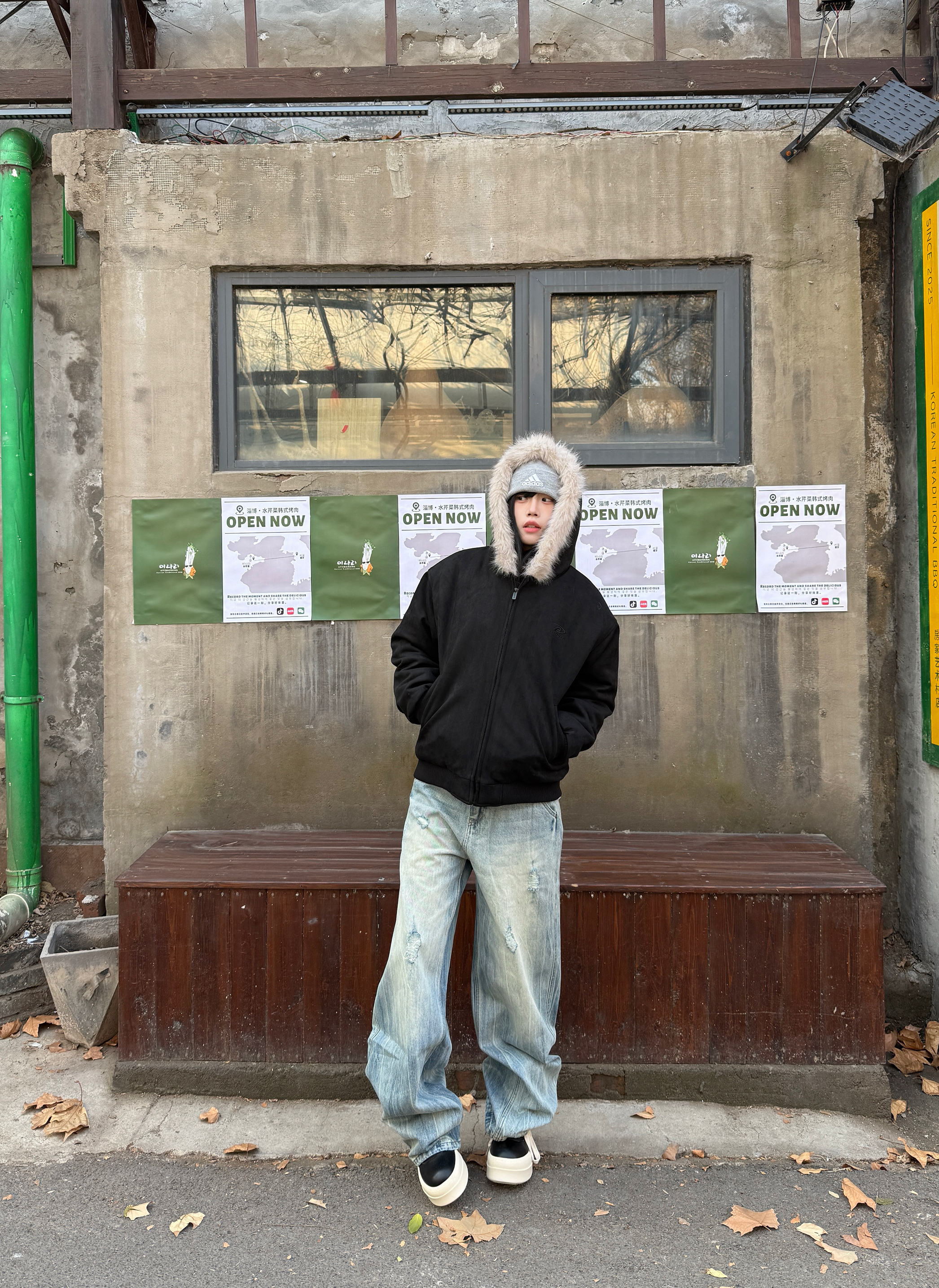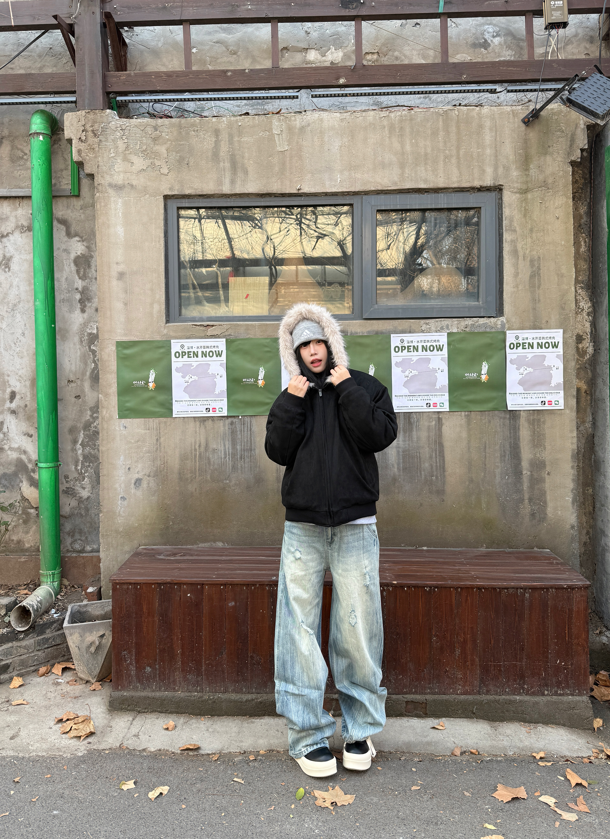 秋冬的穿搭座山雕穿出时尚感 👔上衣穿了一件黑色的座山雕外套 大毛领设计不仅保暖而且很高级 👖搭配一条破洞牛仔裤复古感满满 鞋子搭配一双黑色的高帮板鞋 再戴一个冷帽增加冬日氛围感 今日穿搭你们学会了吗