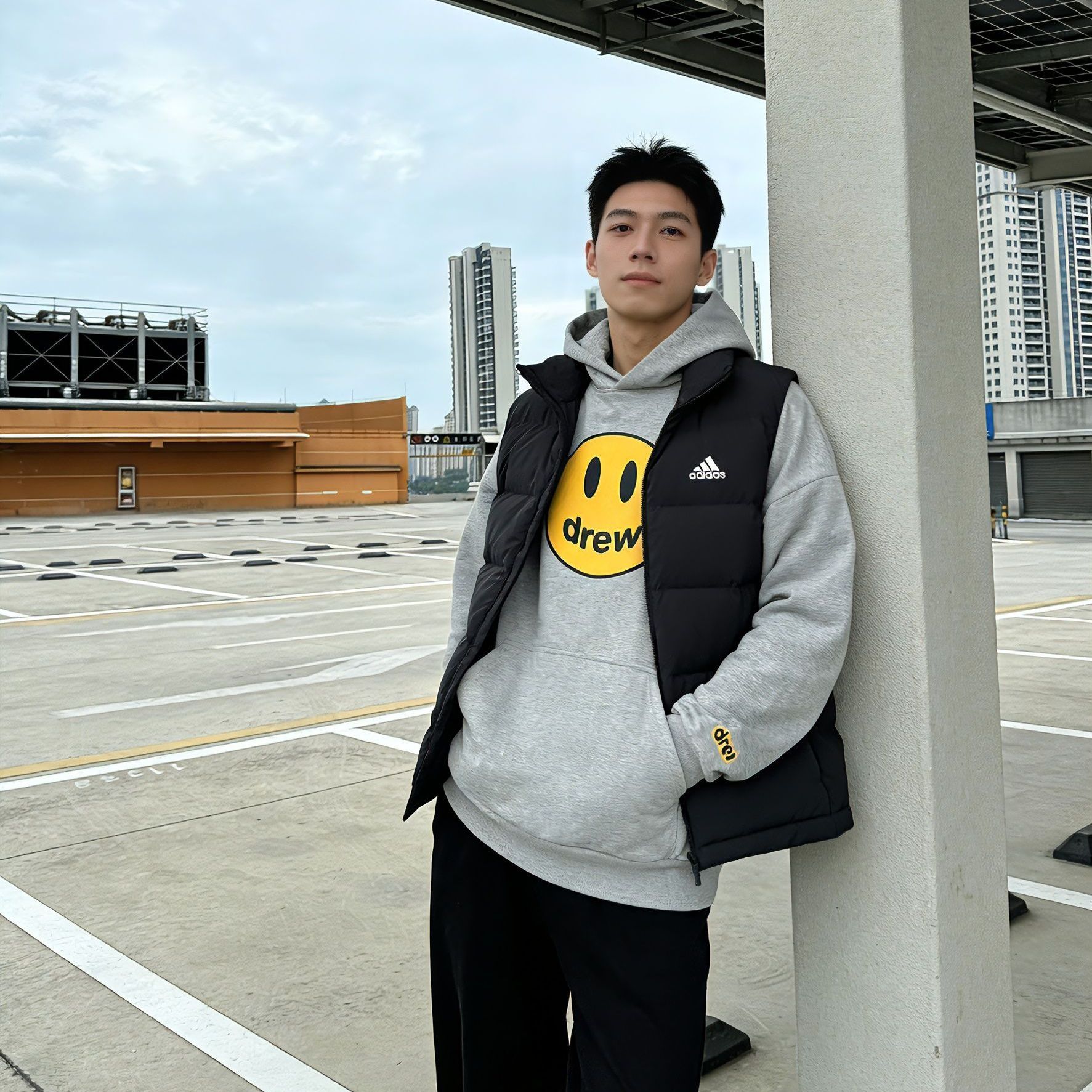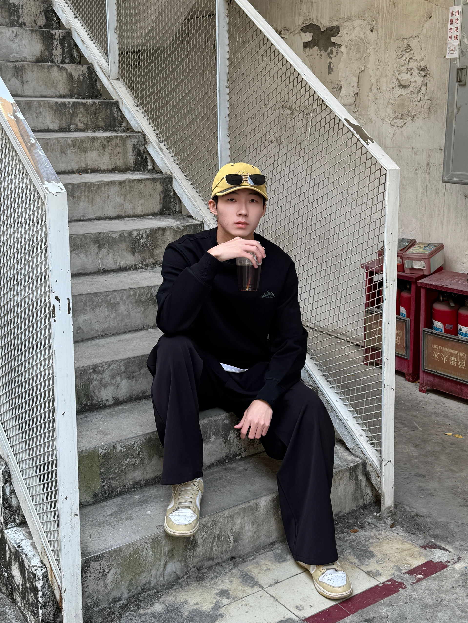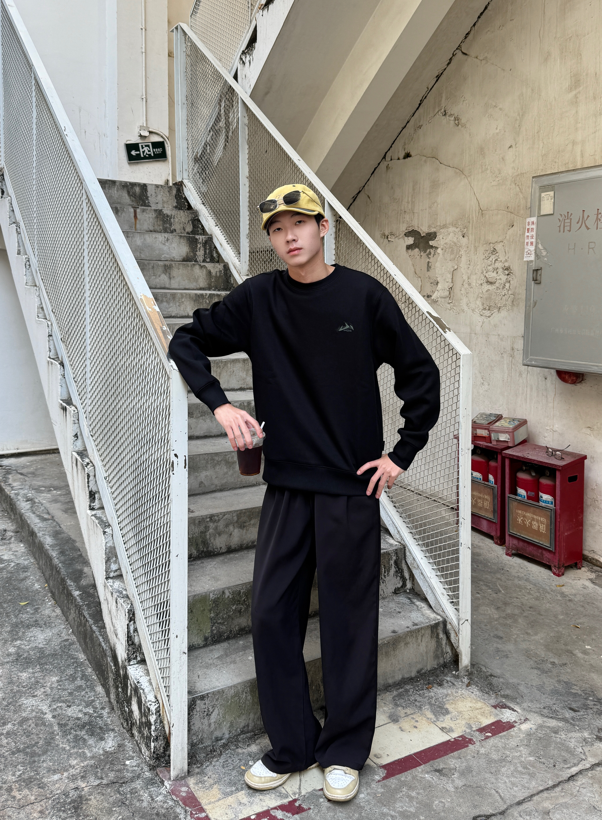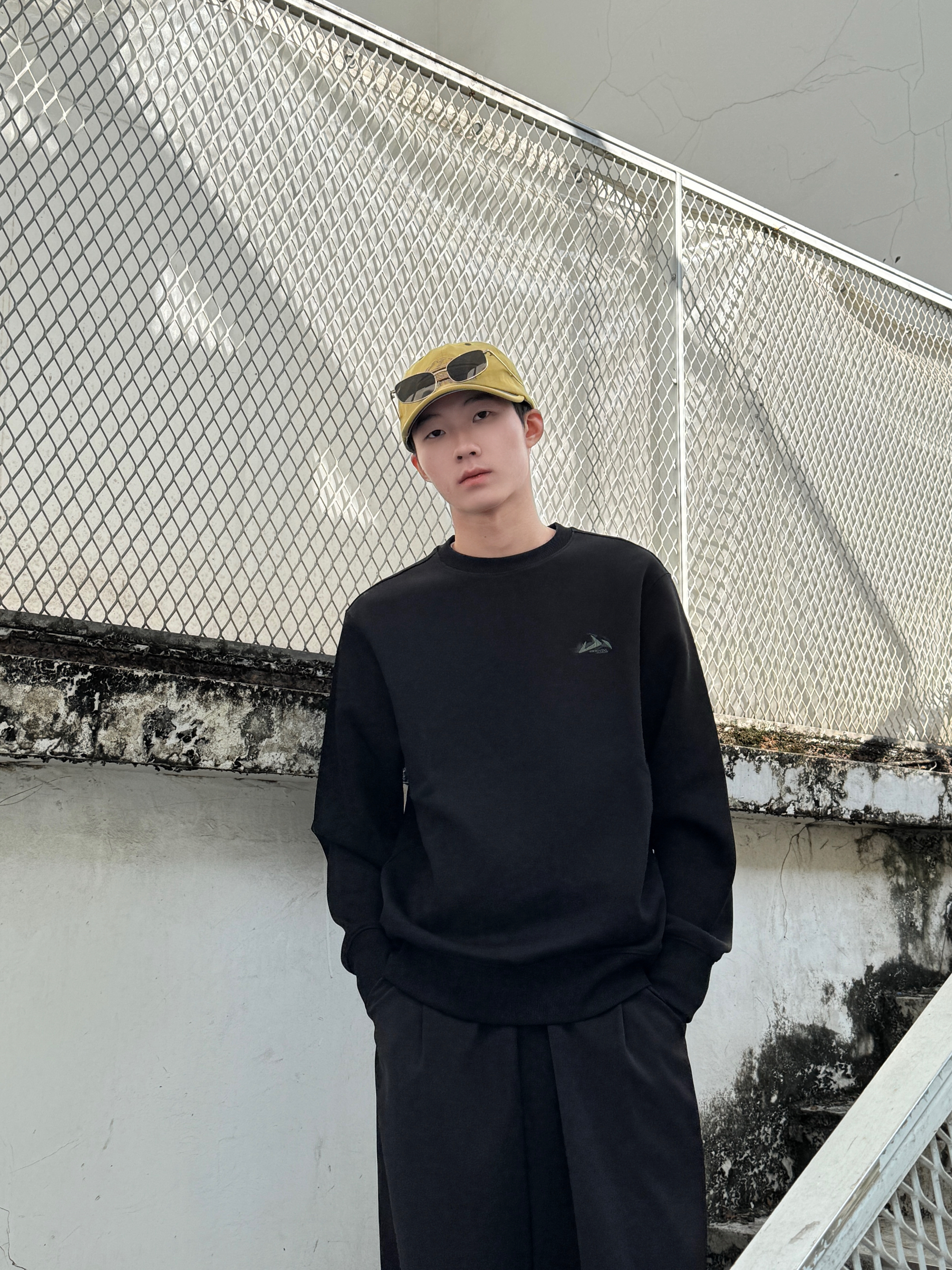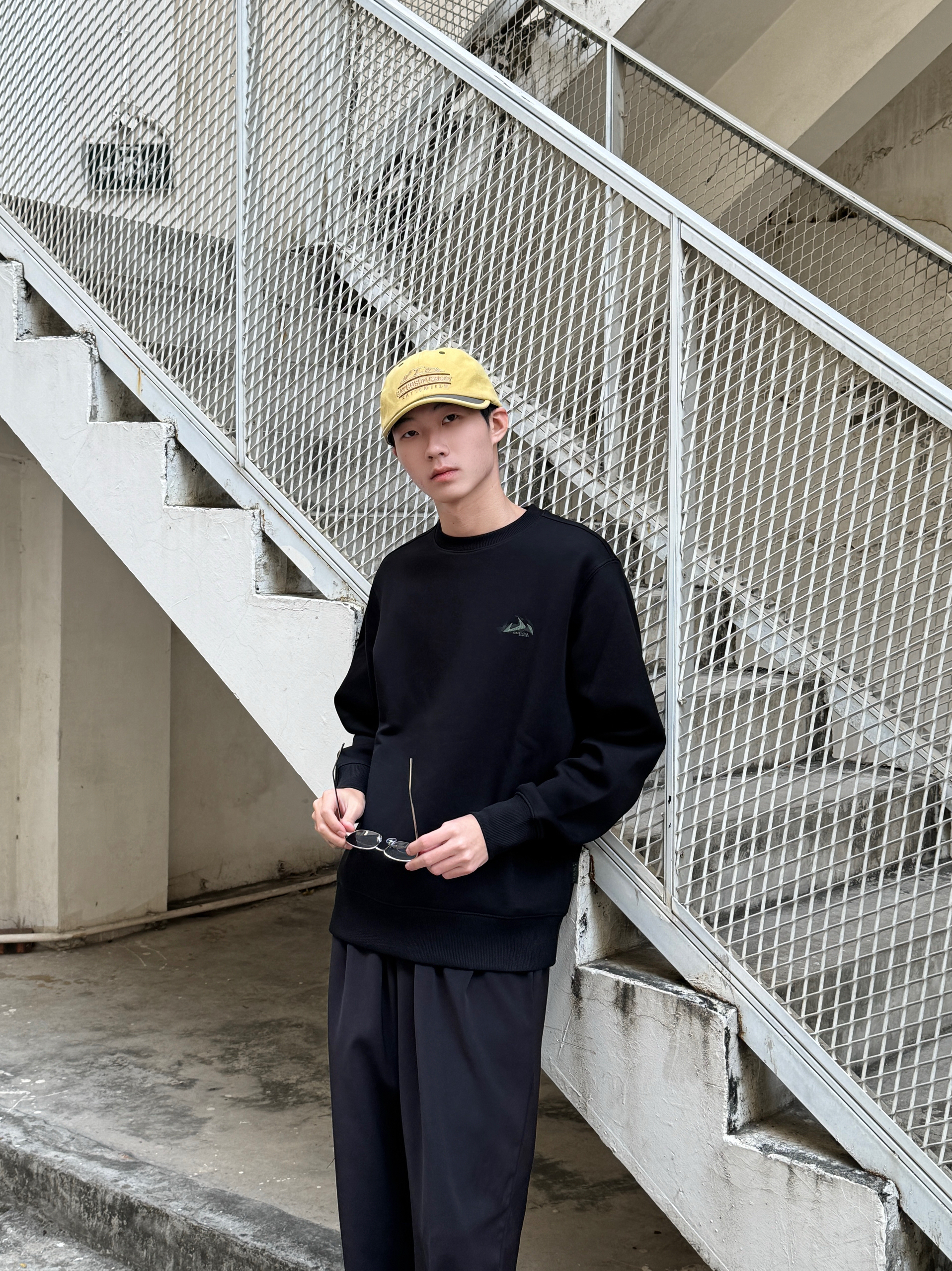 整体一身黑遇上亮黄棒球帽 瞬间摆脱沉闷感🧢 黑色圆领卫衣版型宽松 面料厚实有型 黑色阔腿裤垂坠感很棒 走动起来飘逸带风~ 帽子那抹明黄是点睛之笔 让整套look有了视觉焦点🌟 简单但很有态度的一套