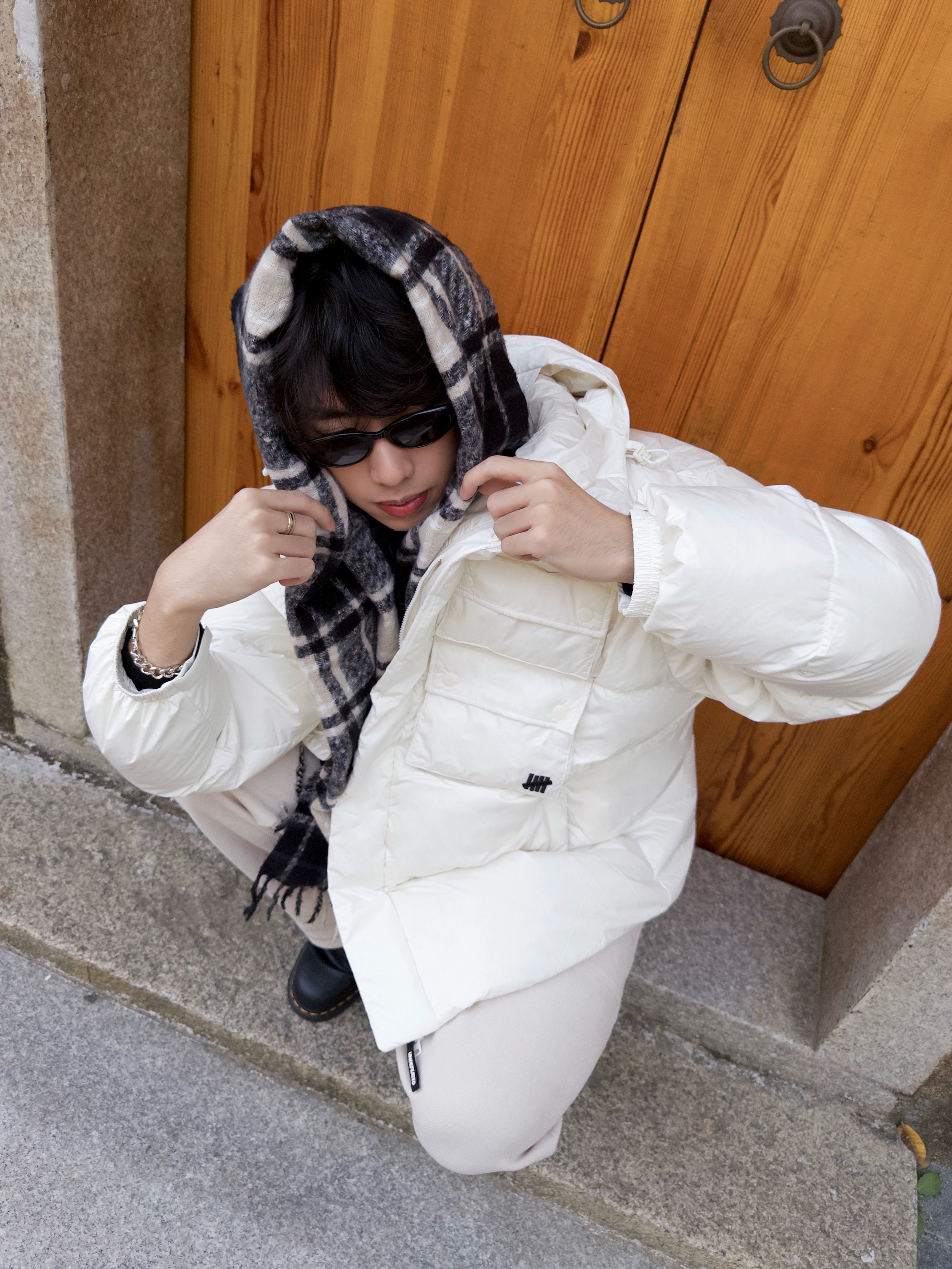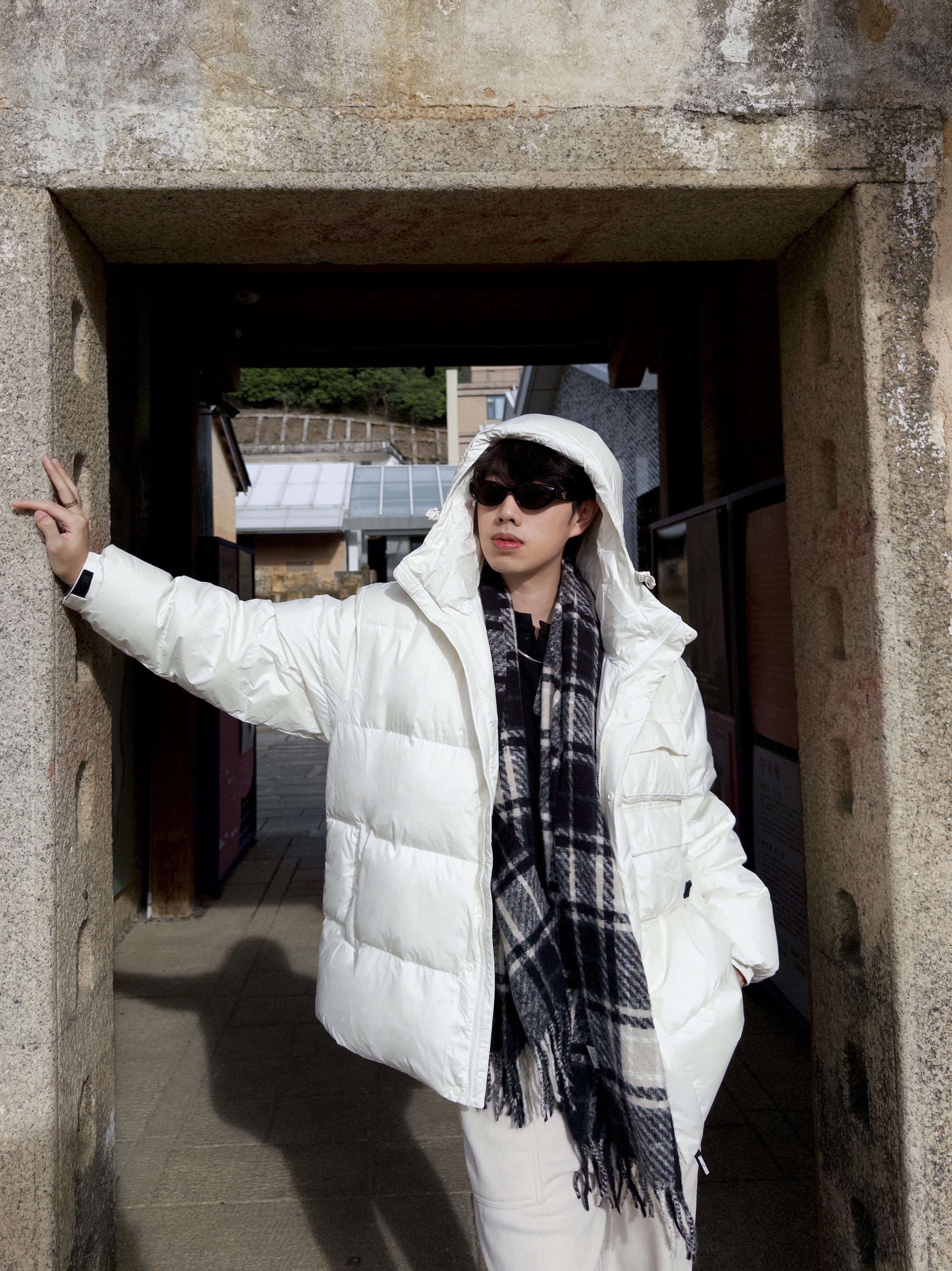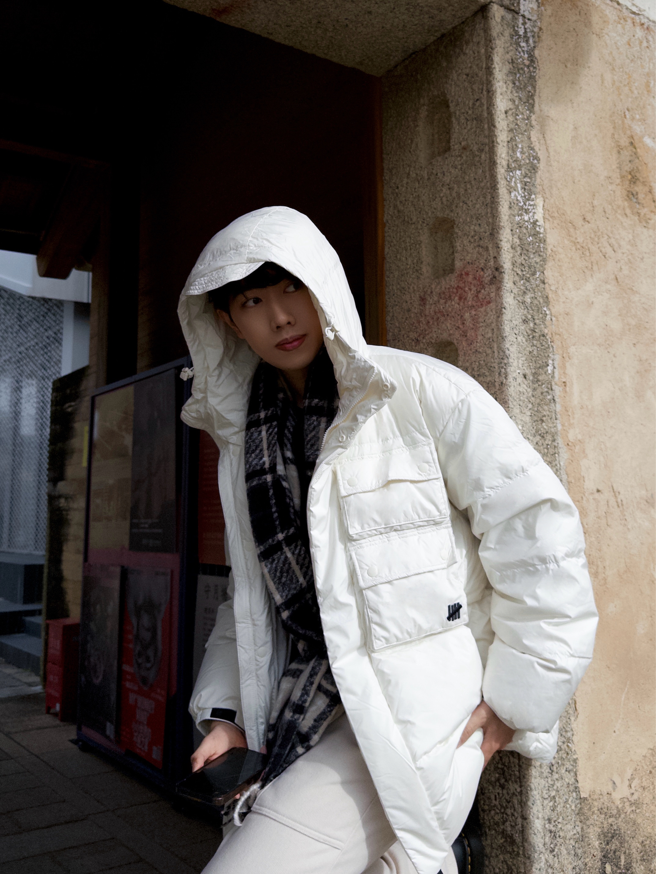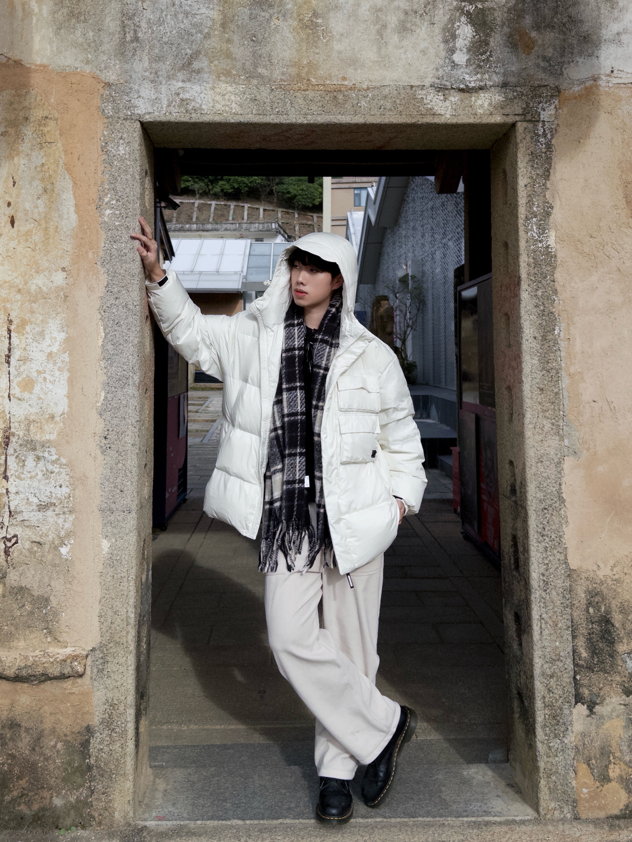 🧍♂️冬天别整花里胡哨❌“氛围感”人设🍞 旧巷+新中式背景板一搭,“随便穿穿也能帅得毫不费力”✌️ 🧥上衣:羽绒服简直是“冬日作弊器”❄️ 胸前的口袋设计装得下我的手机+耳机+零食哈哈‼️ 内搭随便搭件黑T也不违和,白色羽绒服还是蛮百搭的🪶 👟鞋子:经典8孔马丁靴冬天可以han在脚上了🥾黑亮皮面和奶白套装撞色,反差感MAX‼️鞋底厚度把我垫到190🌟 🧣配饰:黑灰格纹围巾是“氛围感粘合剂”...