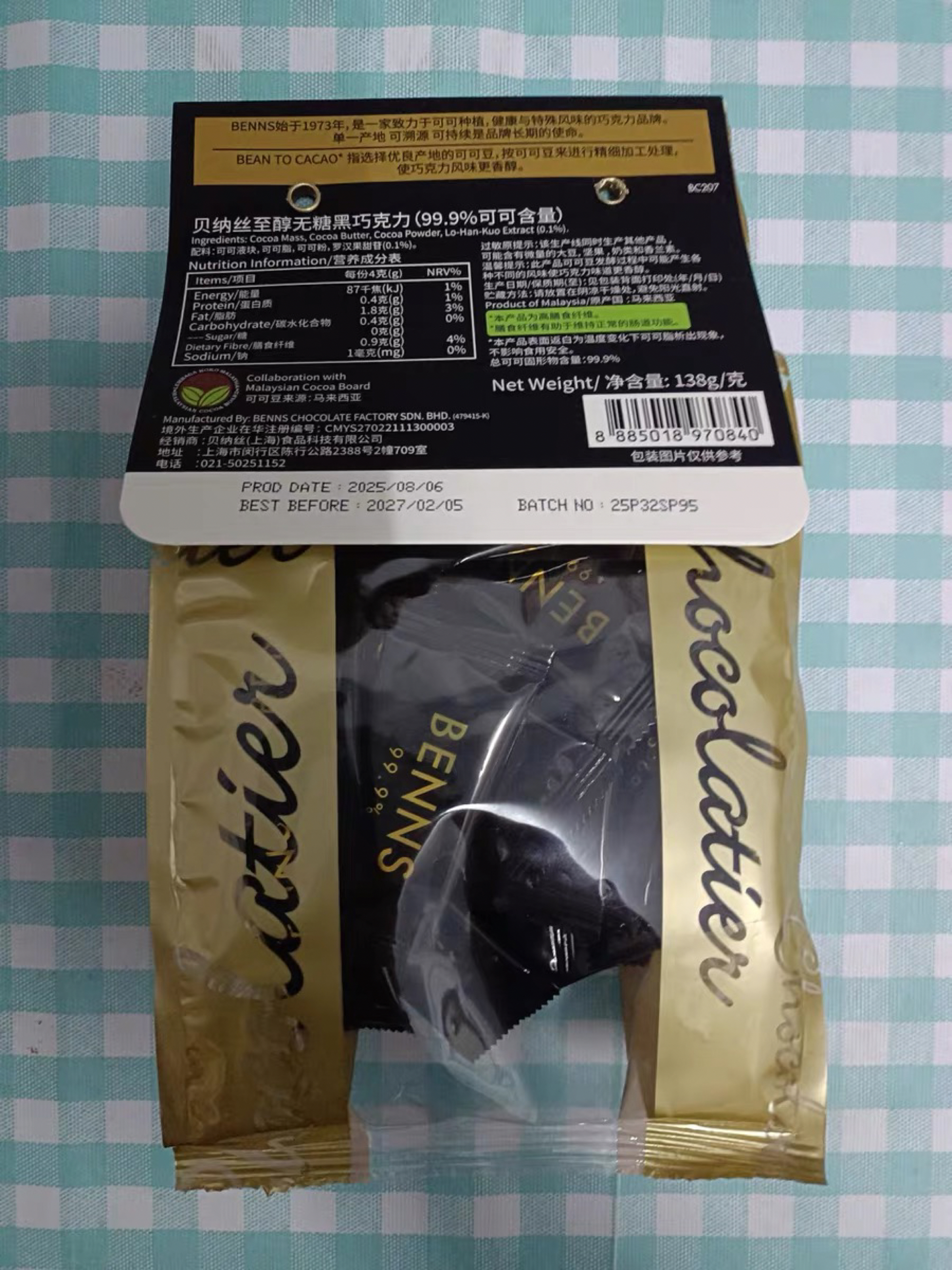 本篇笔记关联了BENNS/贝纳丝 巴旦木黑巧克力 138g 袋装 纯可可脂进口夹心健身 99.9%黑巧 99.9%黑巧等商品,为用户提供真实的使用体验和购买参考。