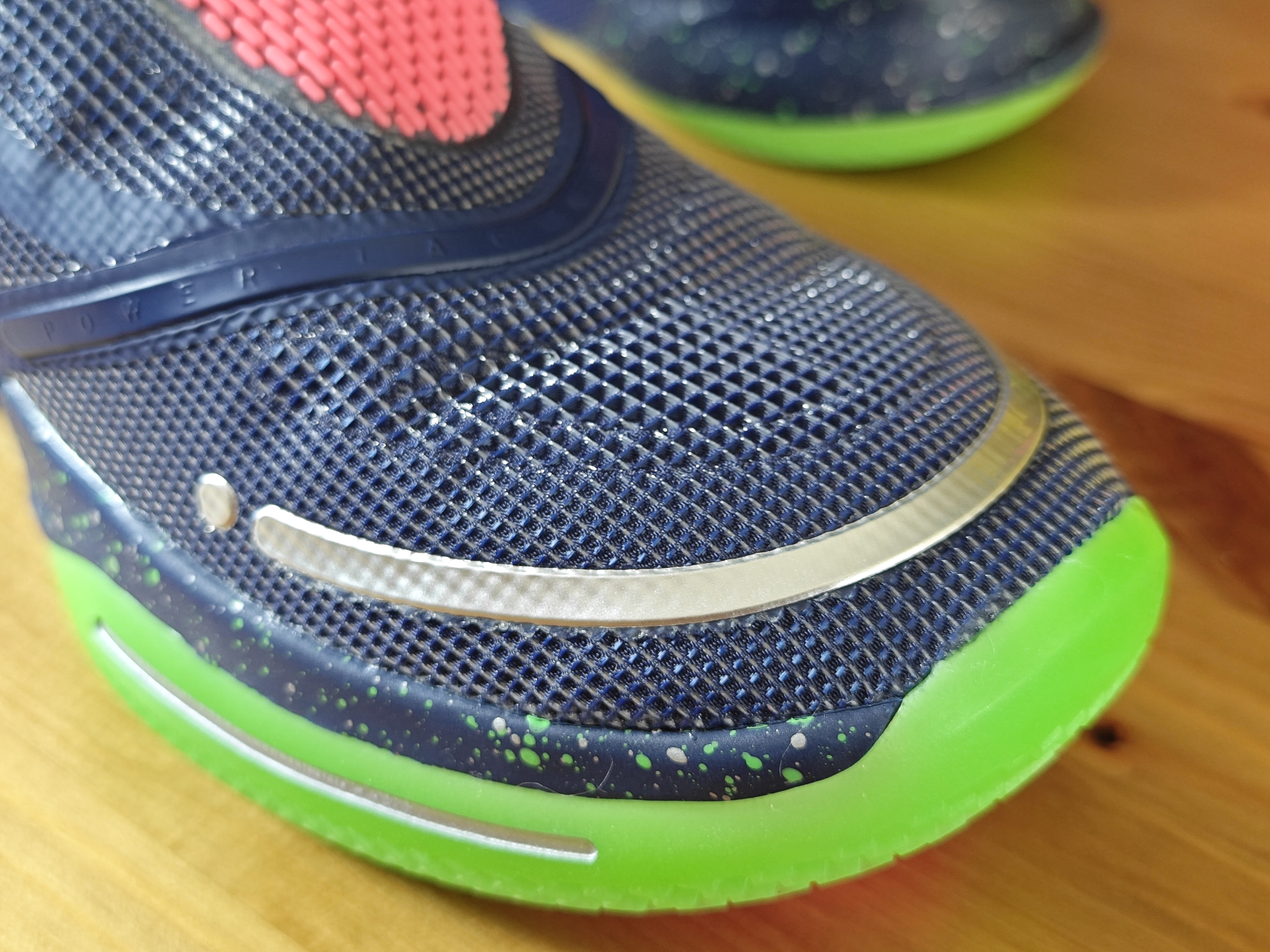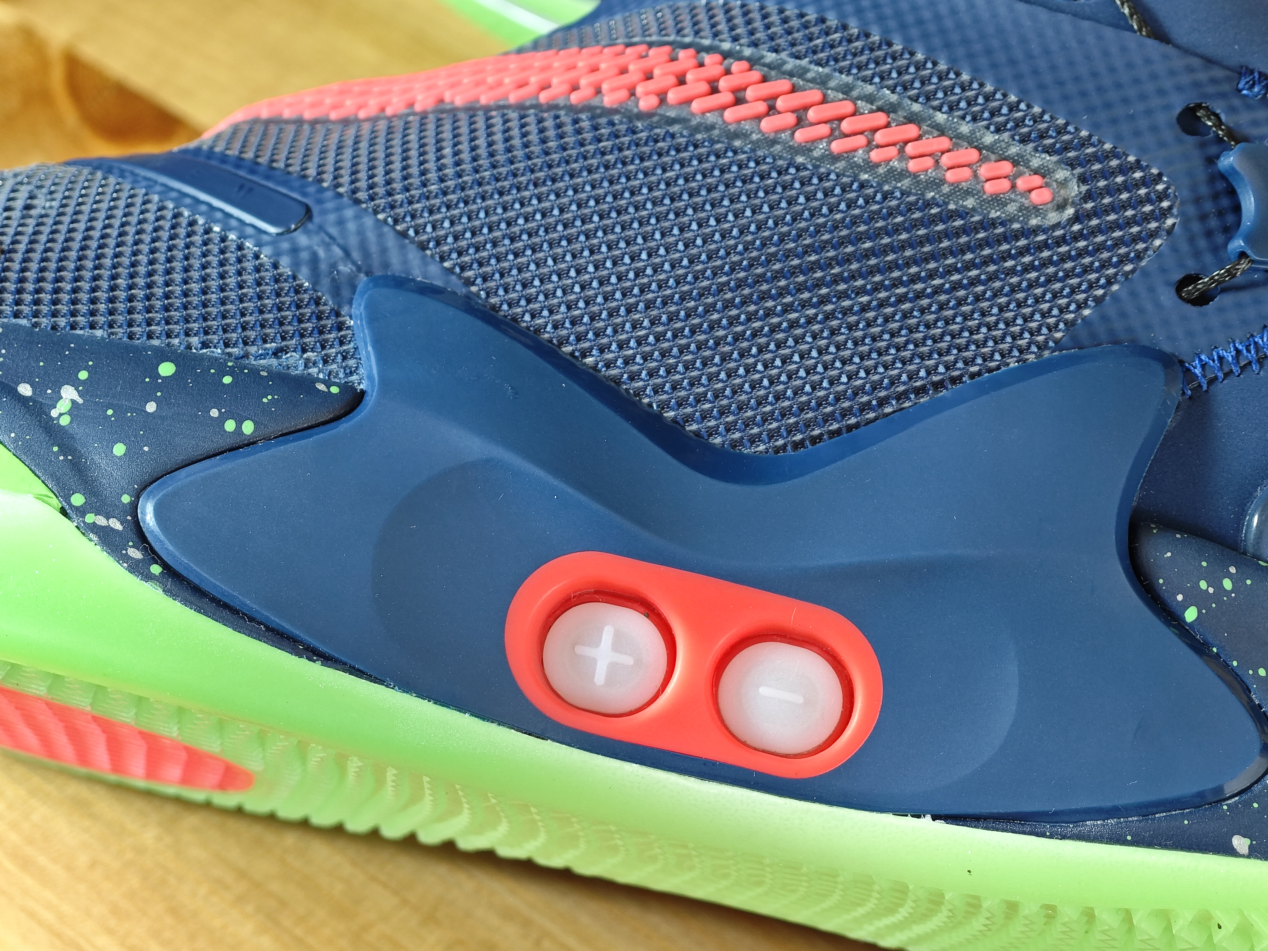 一双看不见鞋带的篮球实战鞋 即使翻开鞋盖部分,也找不到一条传统的鞋带 这是一双需要经常充电的鞋子 附赠的无线充电板不仅可以给鞋充电 也可以给手机和耳机充电,还是双充电位 这就是adapt bb 2.0,这个配色增加了夜光鞋底 整体看着有点另类 通过鞋边两个按钮可以调节鞋带松紧 过去连接手机app也能调节,还能调节灯光颜色
