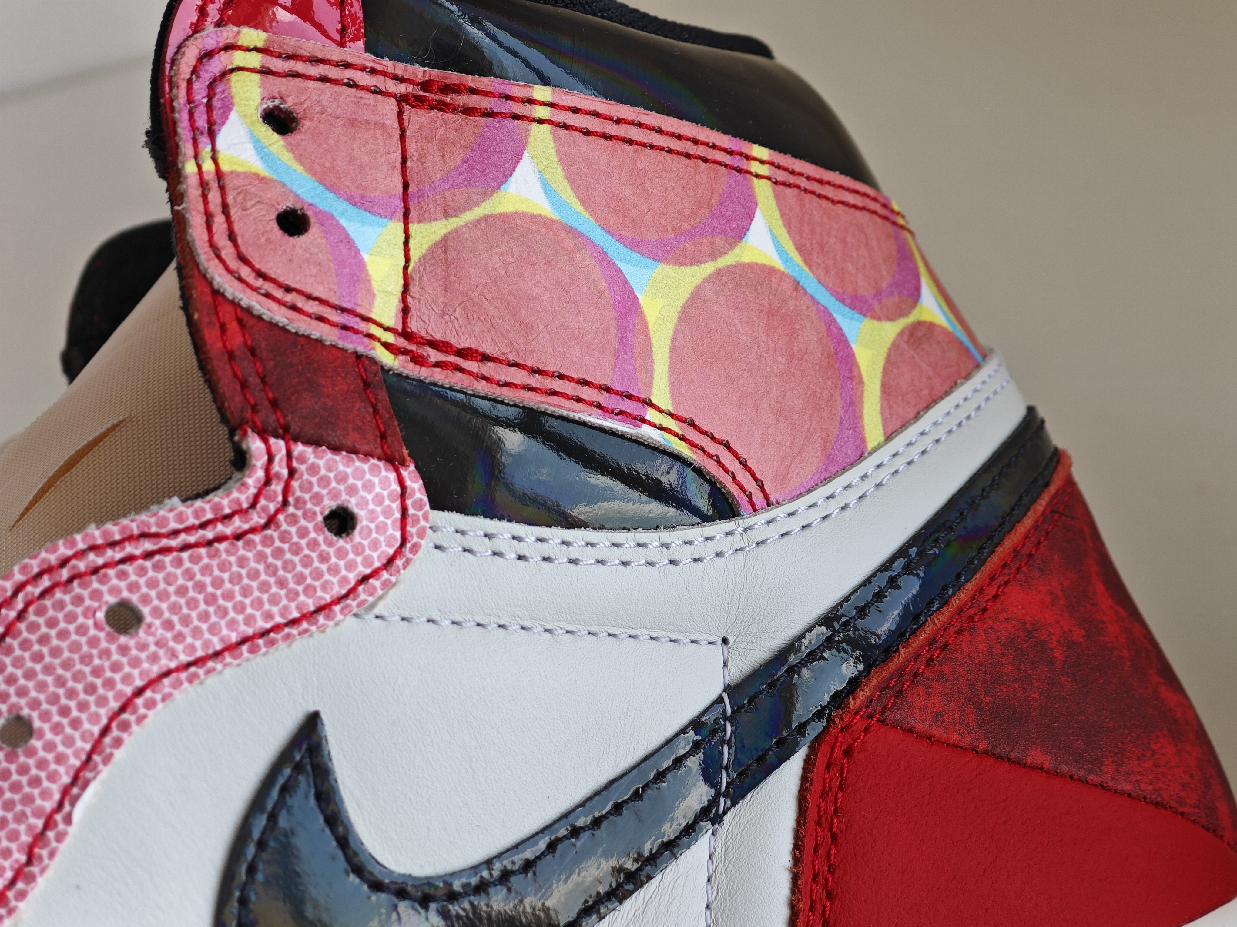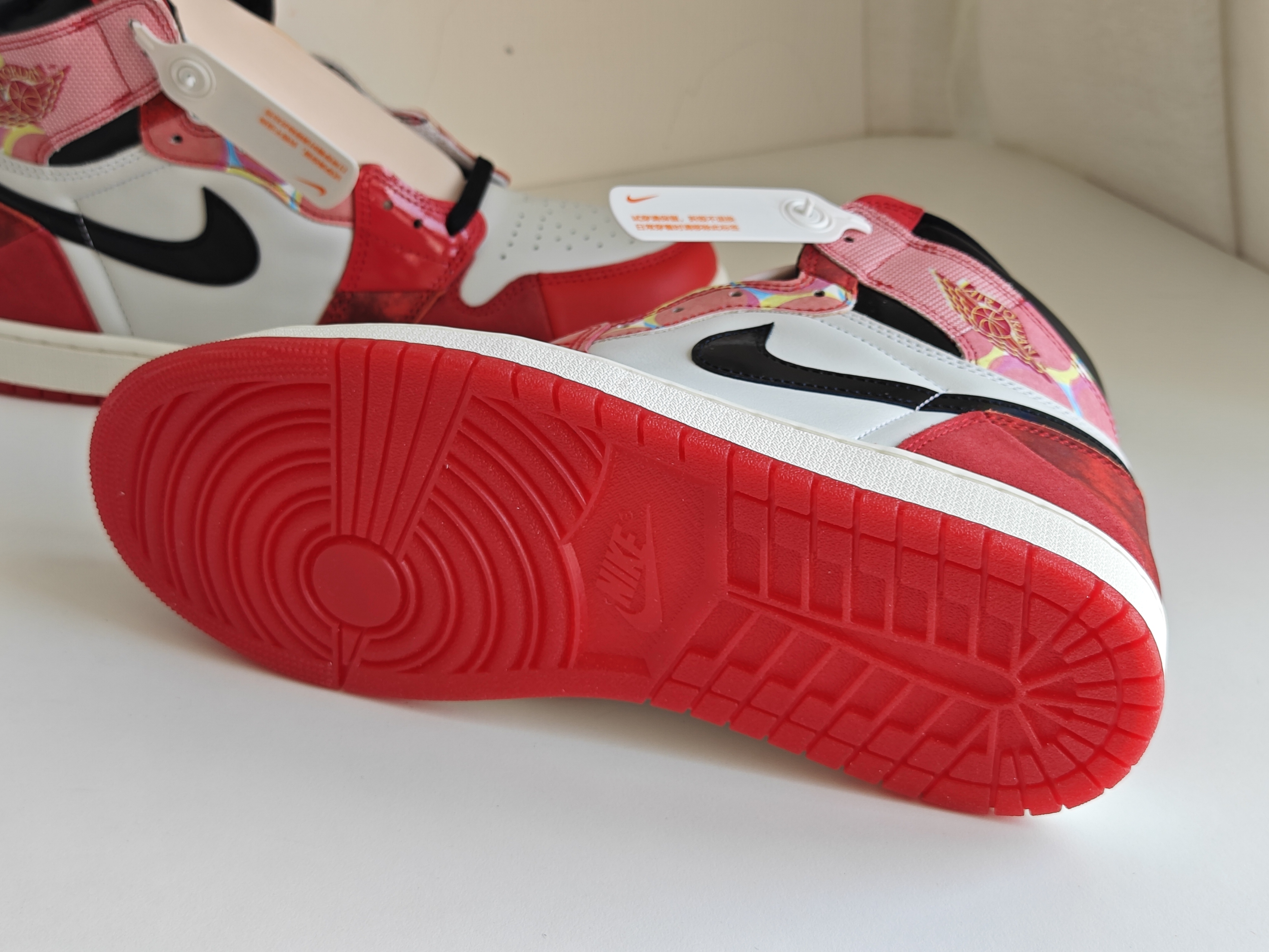 单从配色来看,白红芝加哥经典 红色的水晶鞋底还有夜光元素 这些都很满意 鞋面拼接缝合的设计看着比较零碎 好在做工还不错