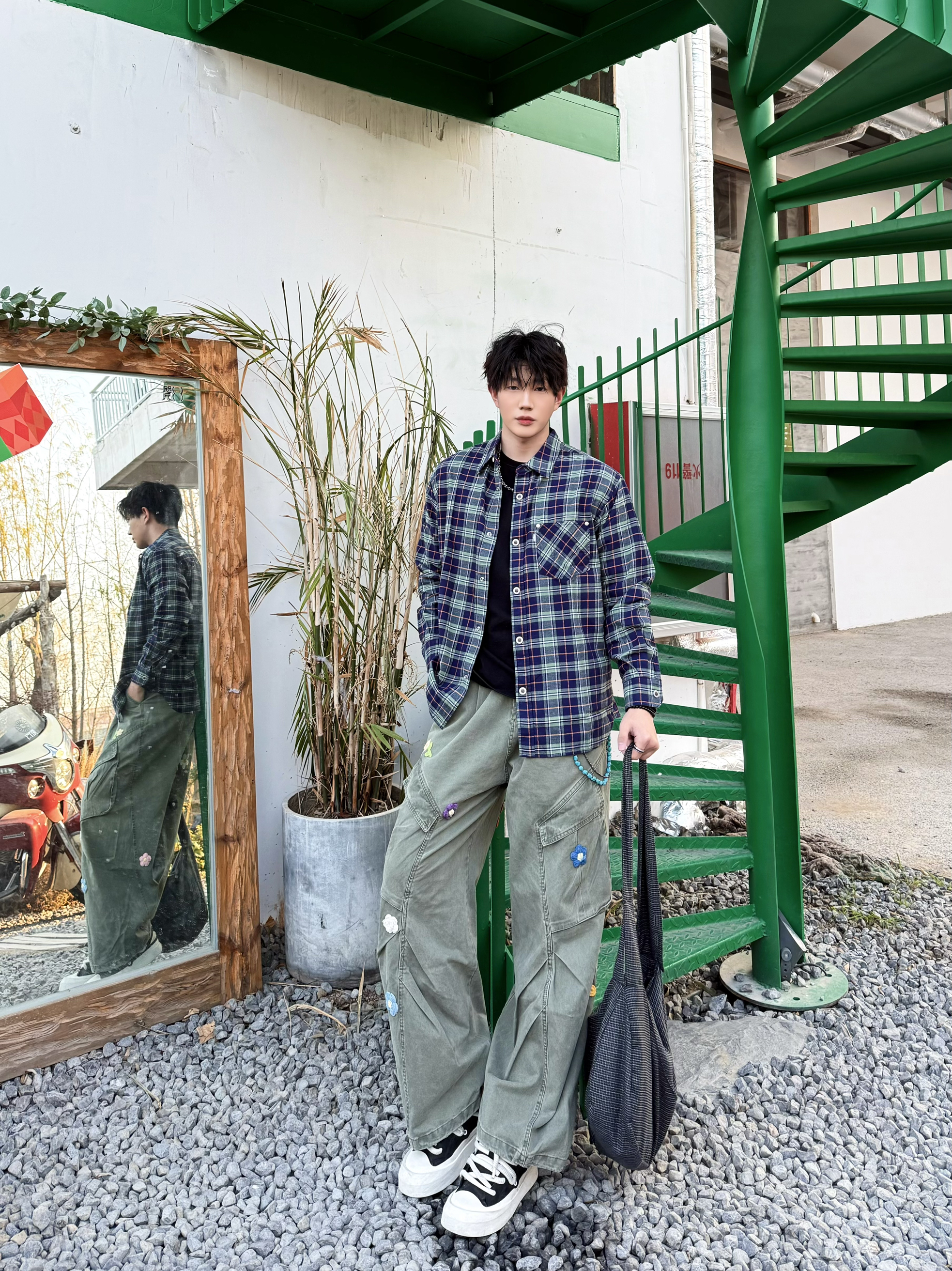 今日份街区游逛的ootd来喽 格纹衬衫承包我的少年感日常! 第一次穿紫色调的还挺显少年气的,正肩宽松版型对身材包容度嘎嘎高 软糯的纯棉面料还很舒服~🥰 下身绿工装裤➕白头板鞋 小刺绣点缀增添色彩,像行走的调色盘🎨 格纹托特包挎上跟格纹衬衫好搭 好有少年即视感一身📷