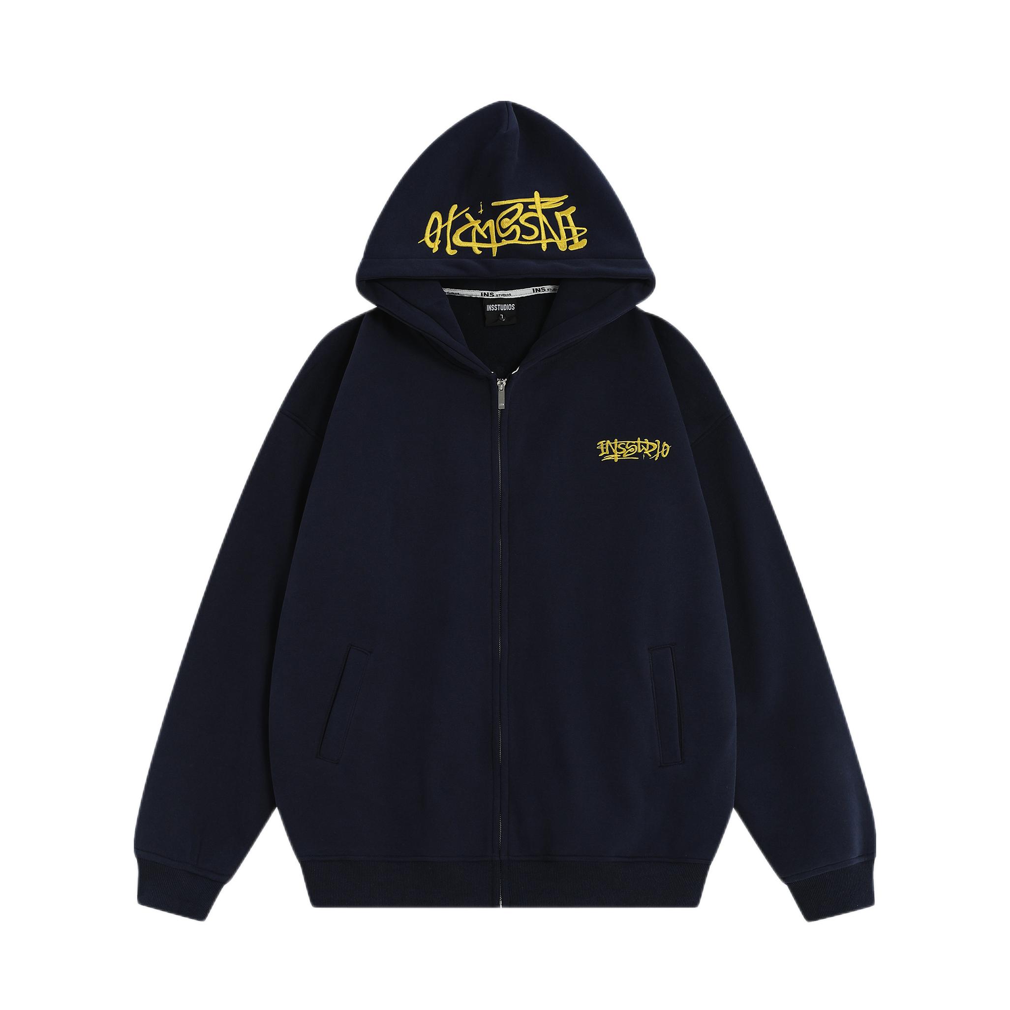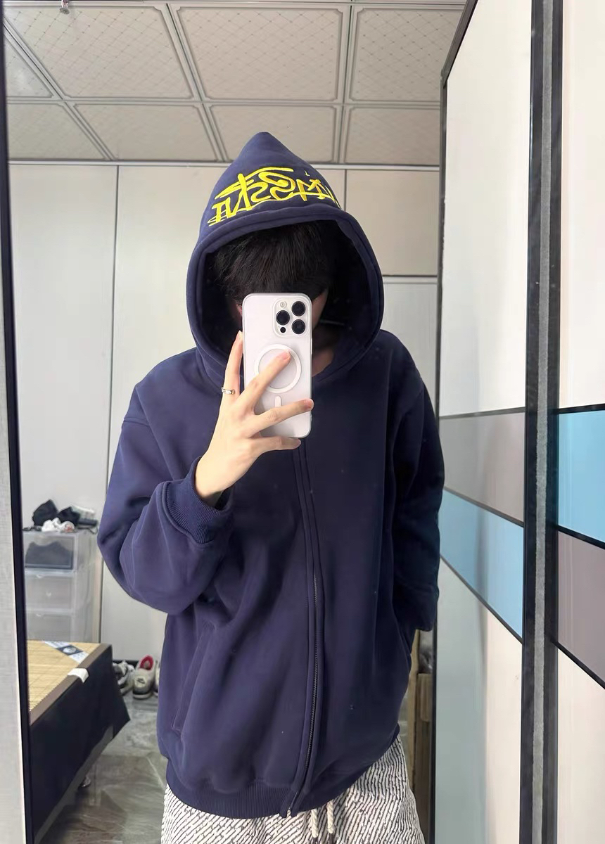 INSstudios这件开衫卫衣直接焊在我身上了!藏青色超显白,搭配金色涂鸦字母,美式街头感拉满~加绒内里软乎乎的,贴身穿巨暖和,北方秋冬单穿也不冷❄️ 宽松的oversize版型对身材超包容,搭工装裤、牛仔裤都超有范儿,拉链设计穿脱超方便,口袋还能揣东西。洗了几次也没起球掉色,性价比直接拉满,美式复古党闭眼冲就完事! 图源网络,侵删