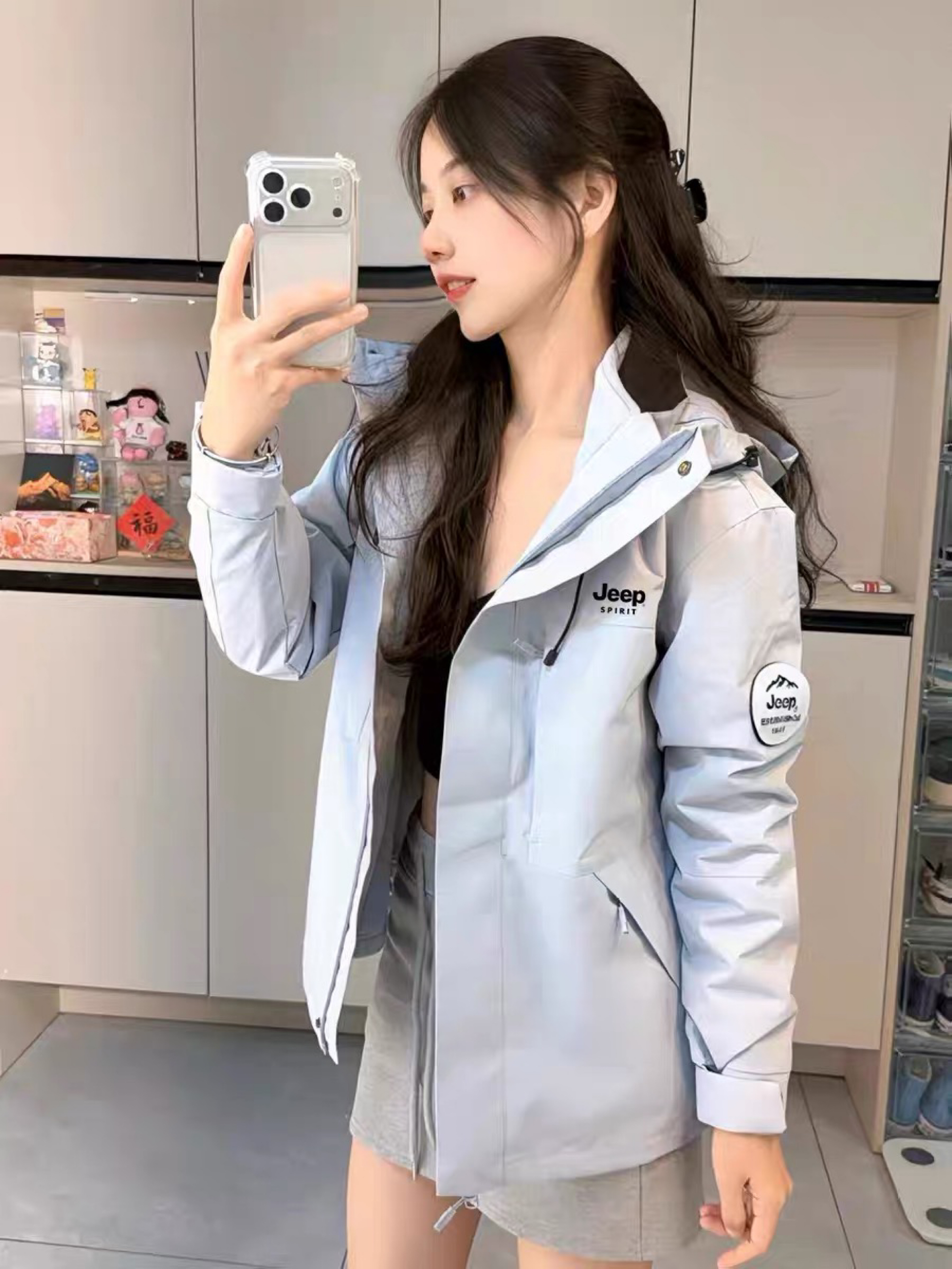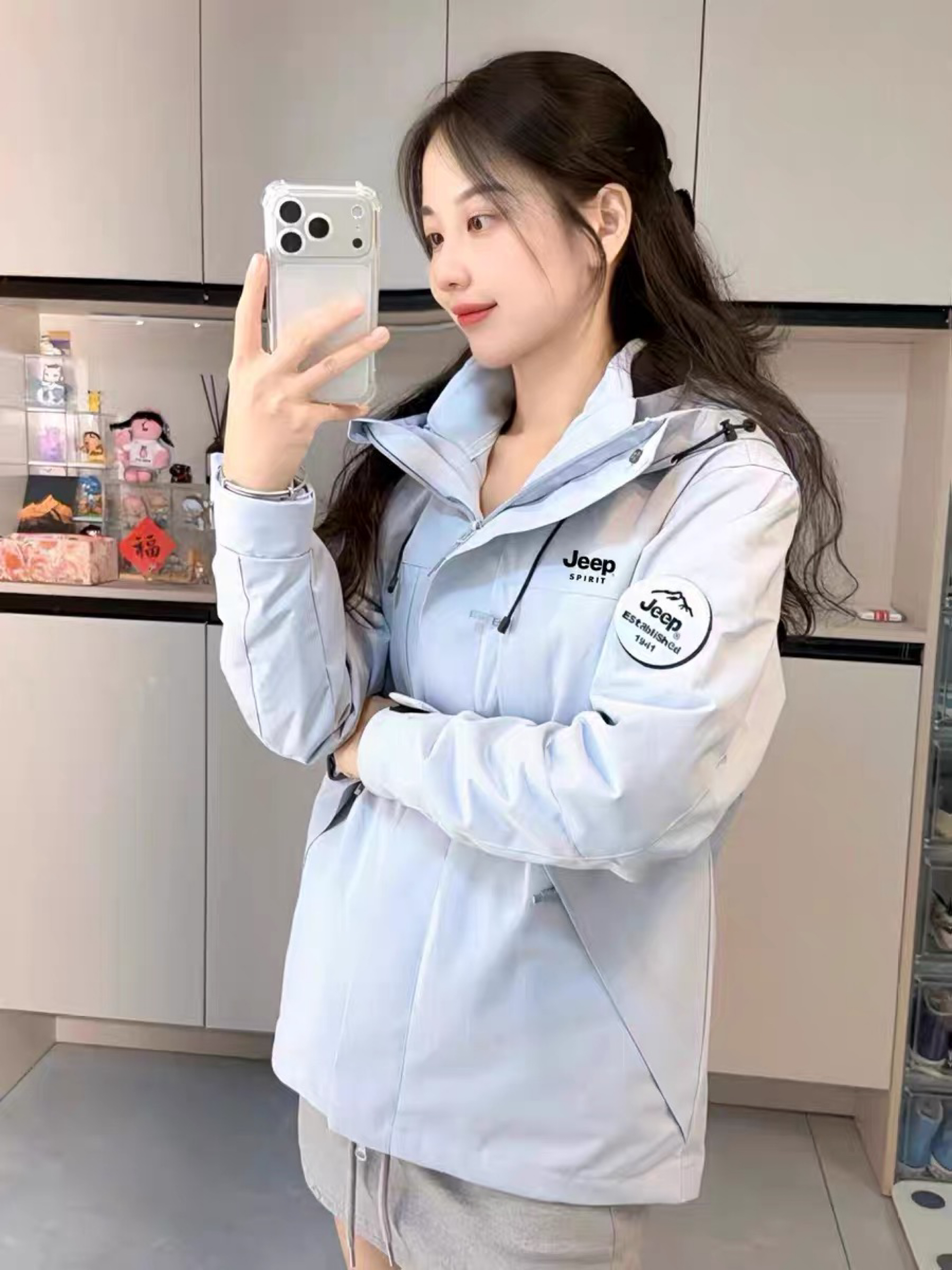 新入的Jeep浅蓝冲锋衣直接美到我心坎里!马卡龙蓝超清新,春天穿出门拍照巨出片~面料是防水防风的,日常通勤或户外徒步都合适,连帽设计还能挡太阳🌞 版型是微宽松的,对身材超包容,搭短裙、牛仔裤都超有范儿,腰间的抽绳还能收出腰线,甜酷感拉满。小logo点缀简约又有辨识度,细节做工也超扎实,百元价位能买到这种品质,性价比直接封神,春天的第一件外套选它准没错! 图源网络,侵删