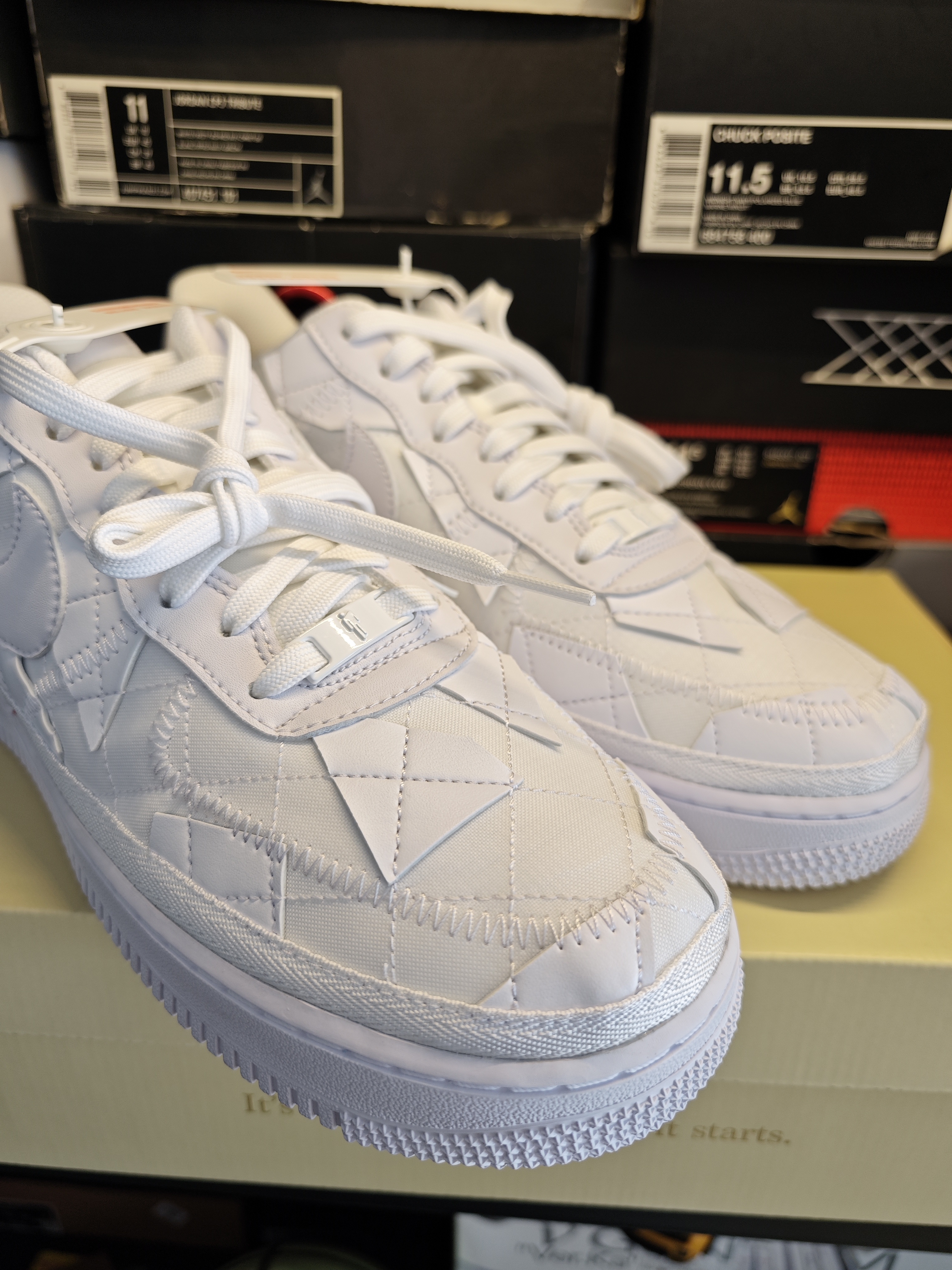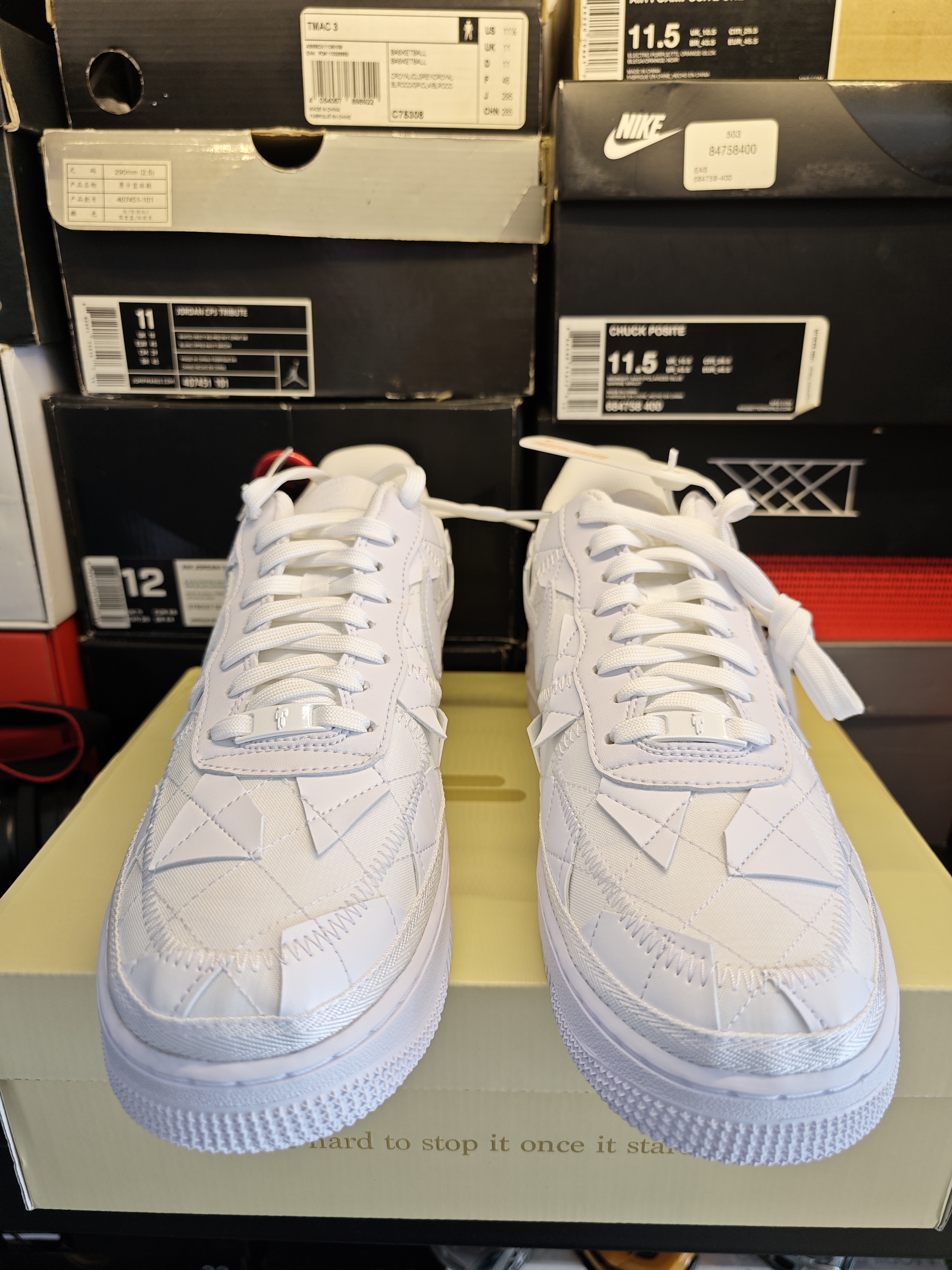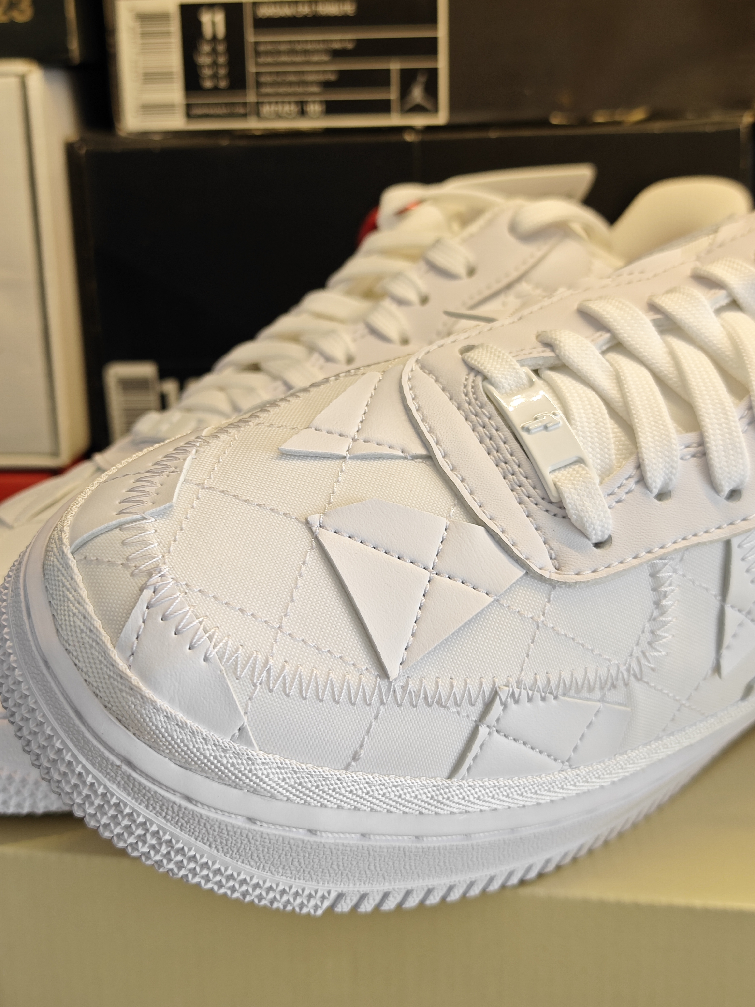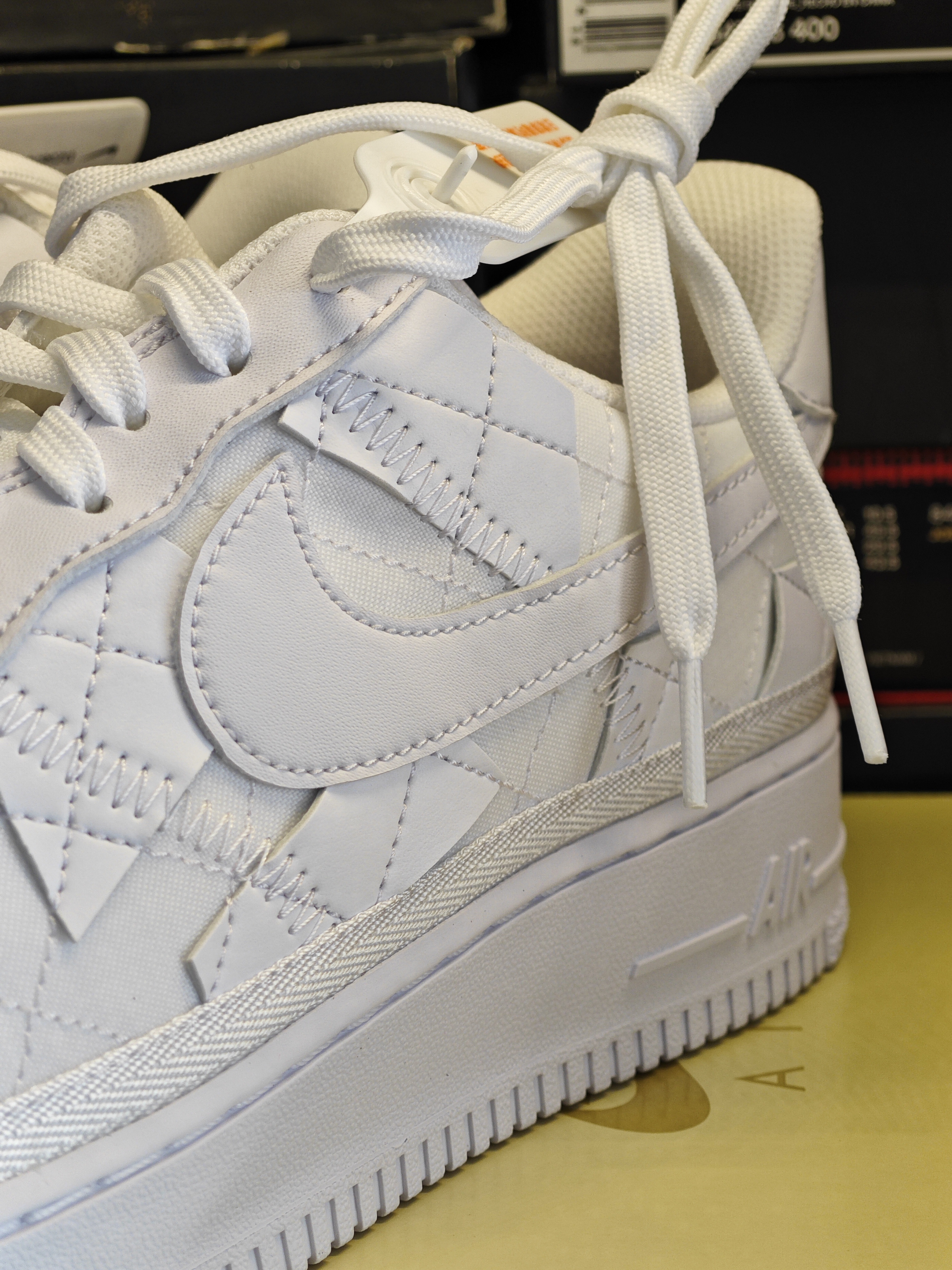 一双来自碧梨姐联名的AF 1 全白鞋面设计 原本普通的织物鞋面 上面使用皮革材质 做了一些碎块的拼接 看似杂乱无章 实际双脚是对称的图案 有点艺术气息 不愧是碧梨姐 歌曲个性,鞋子也个性