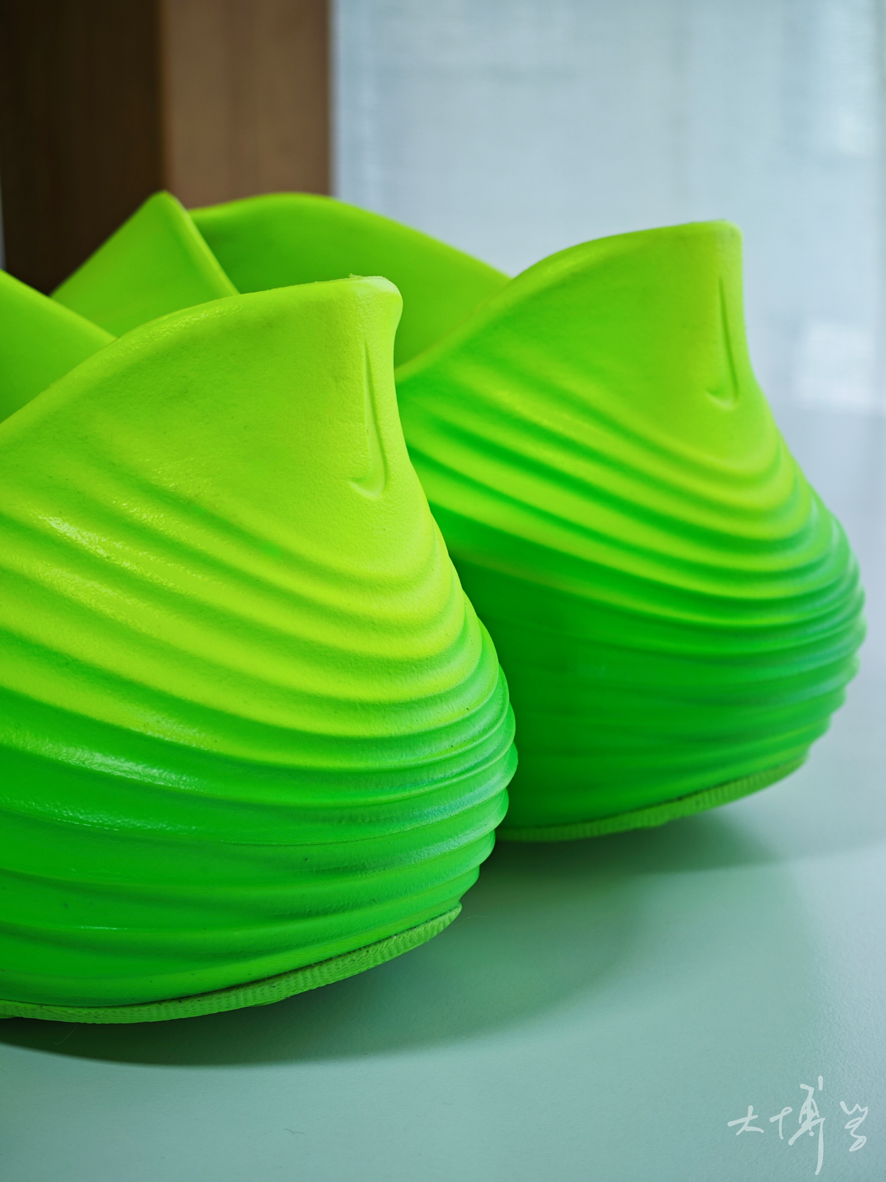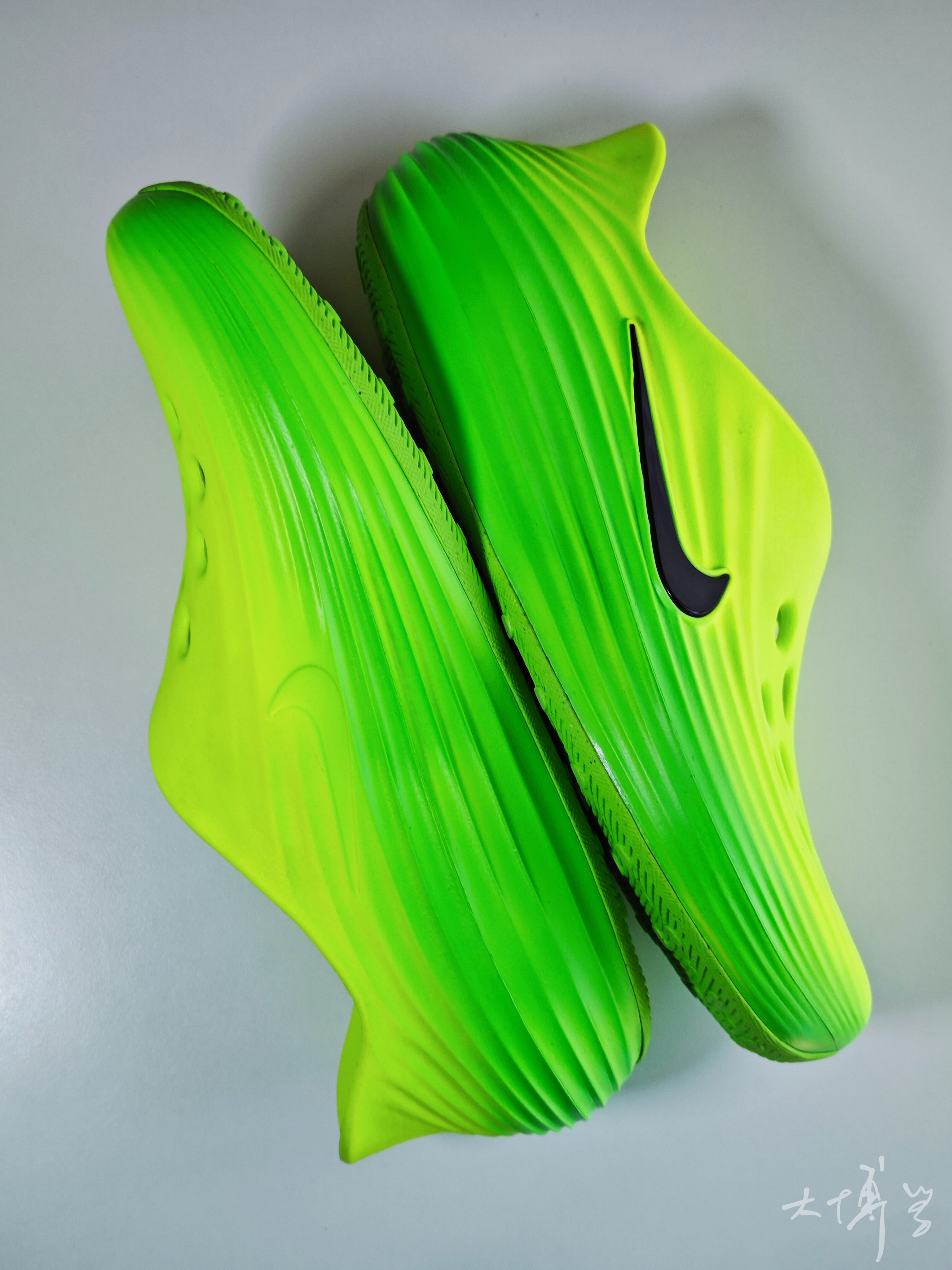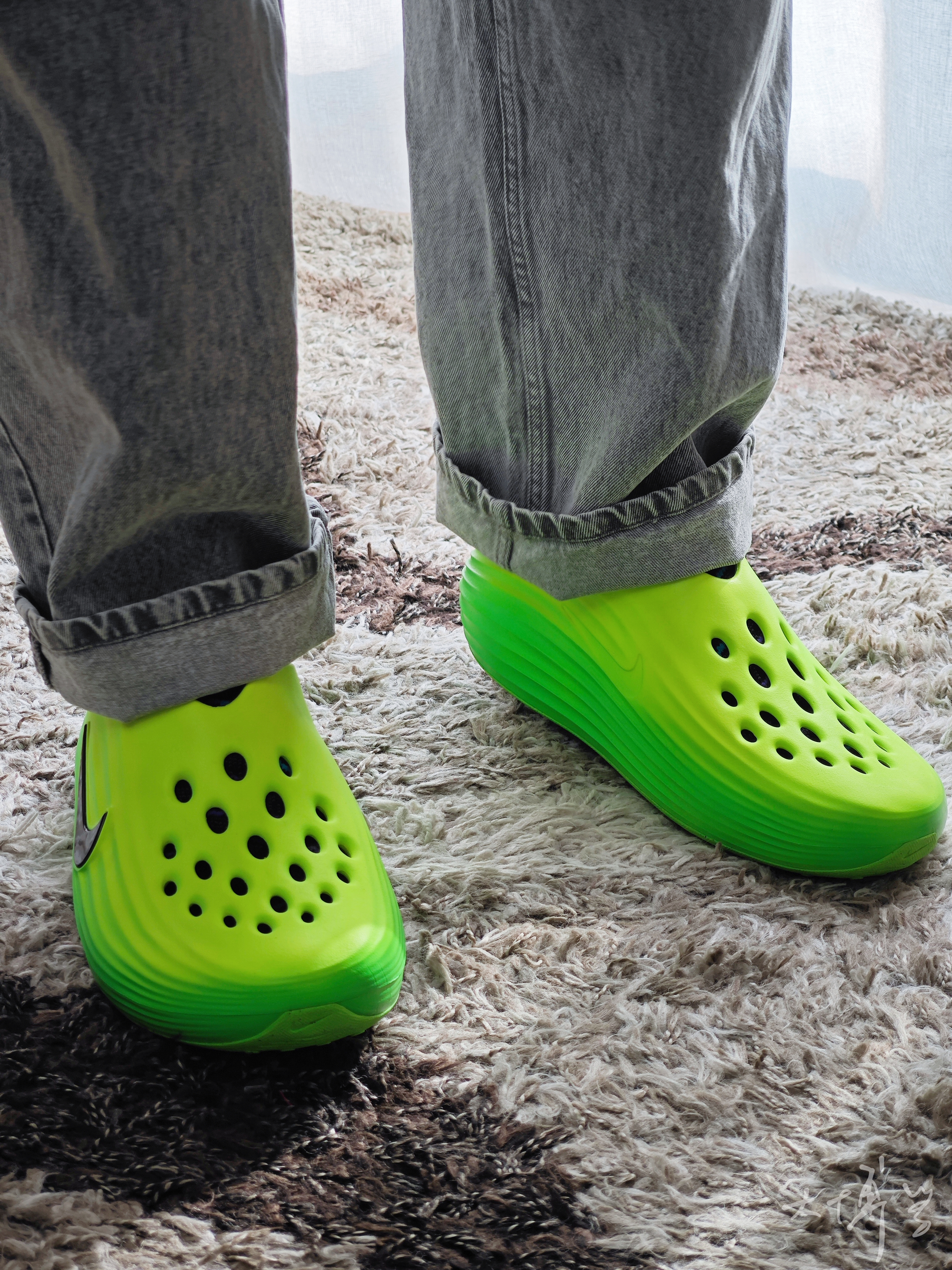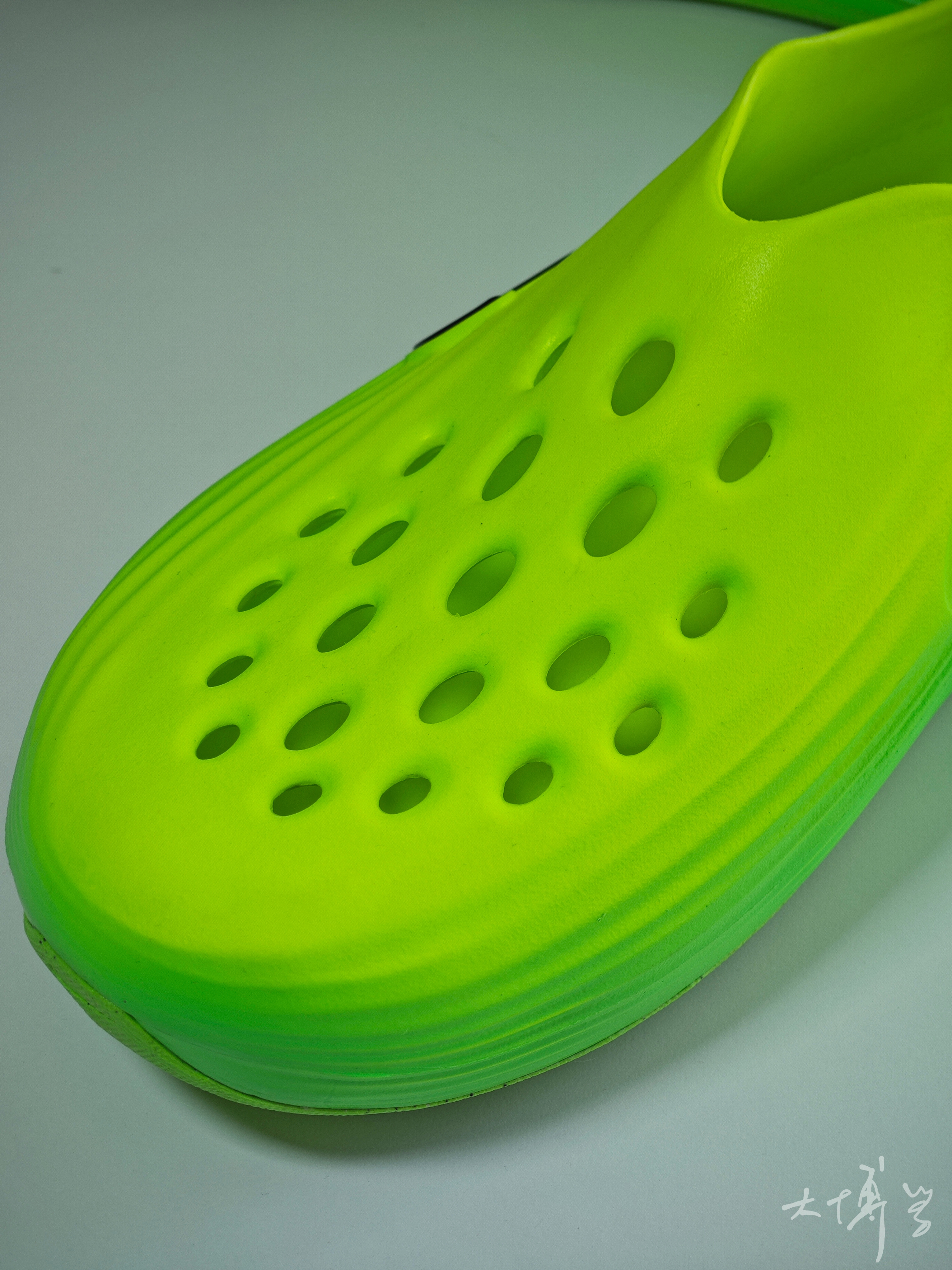 一双外观很流线的洞洞鞋 颜色是亮眼的荧光绿 从下往上有些渐变色的过渡 鞋身的线条充满了运动感 这双洞洞鞋就用上了reactx 脚感确实软弹,耐久性有待考察 新科技就用在拖鞋上,这种操作很少见 尺码偏紧,我觉得买大半码会更舒服
