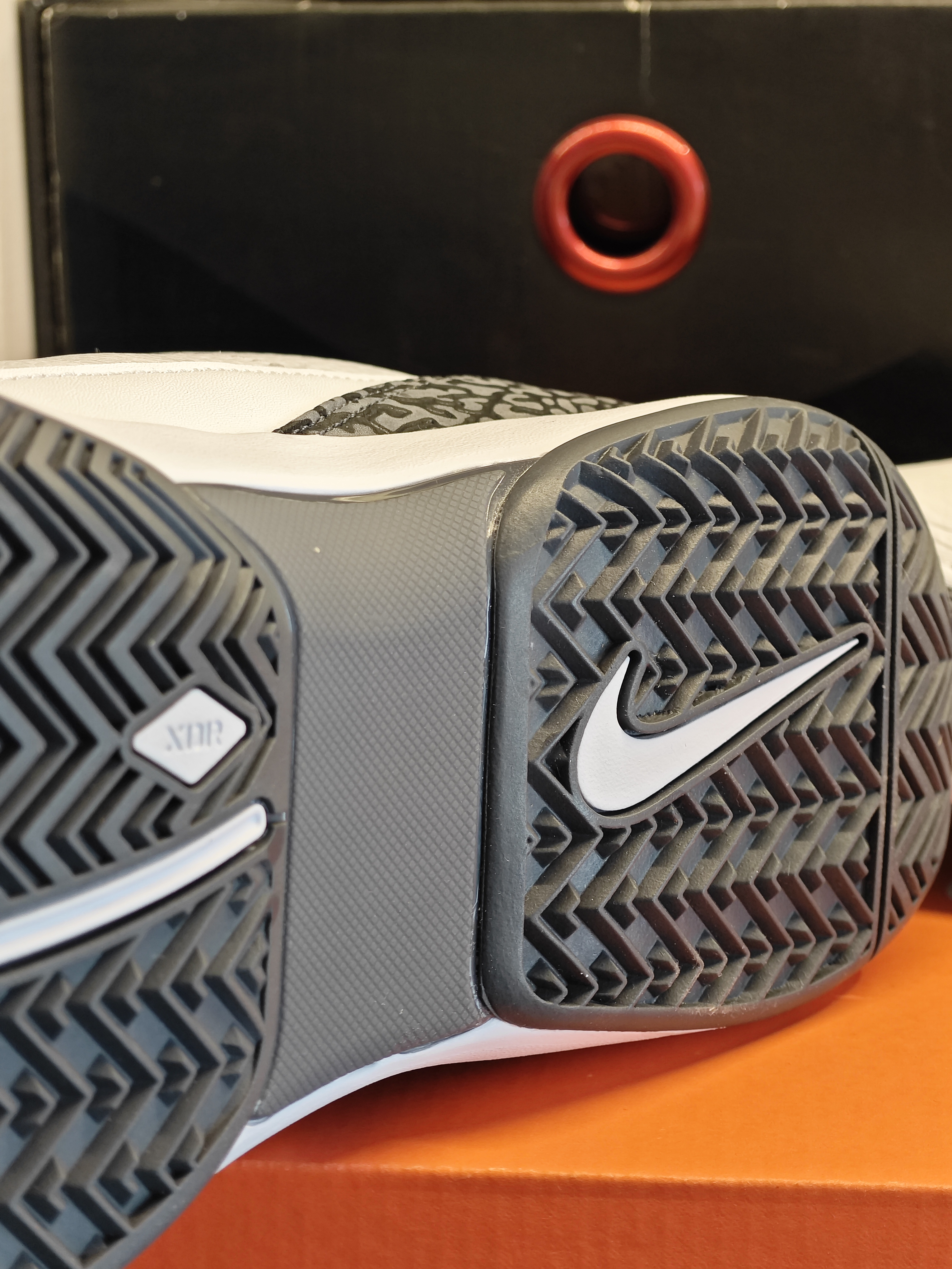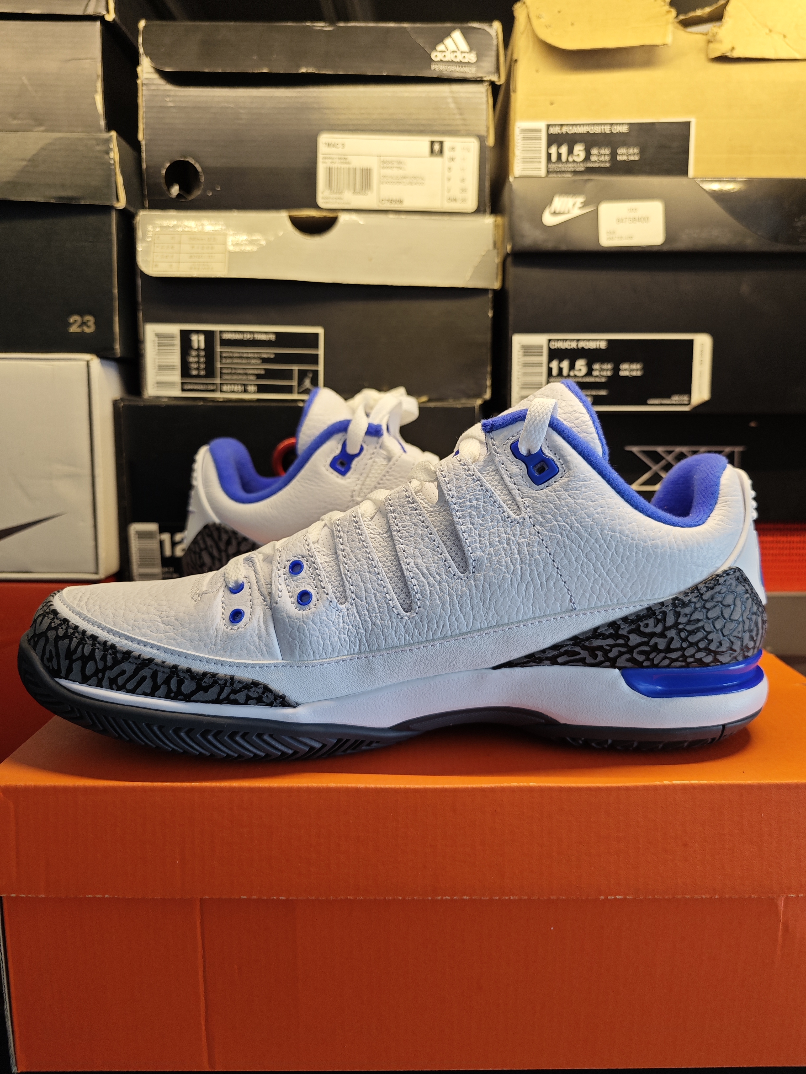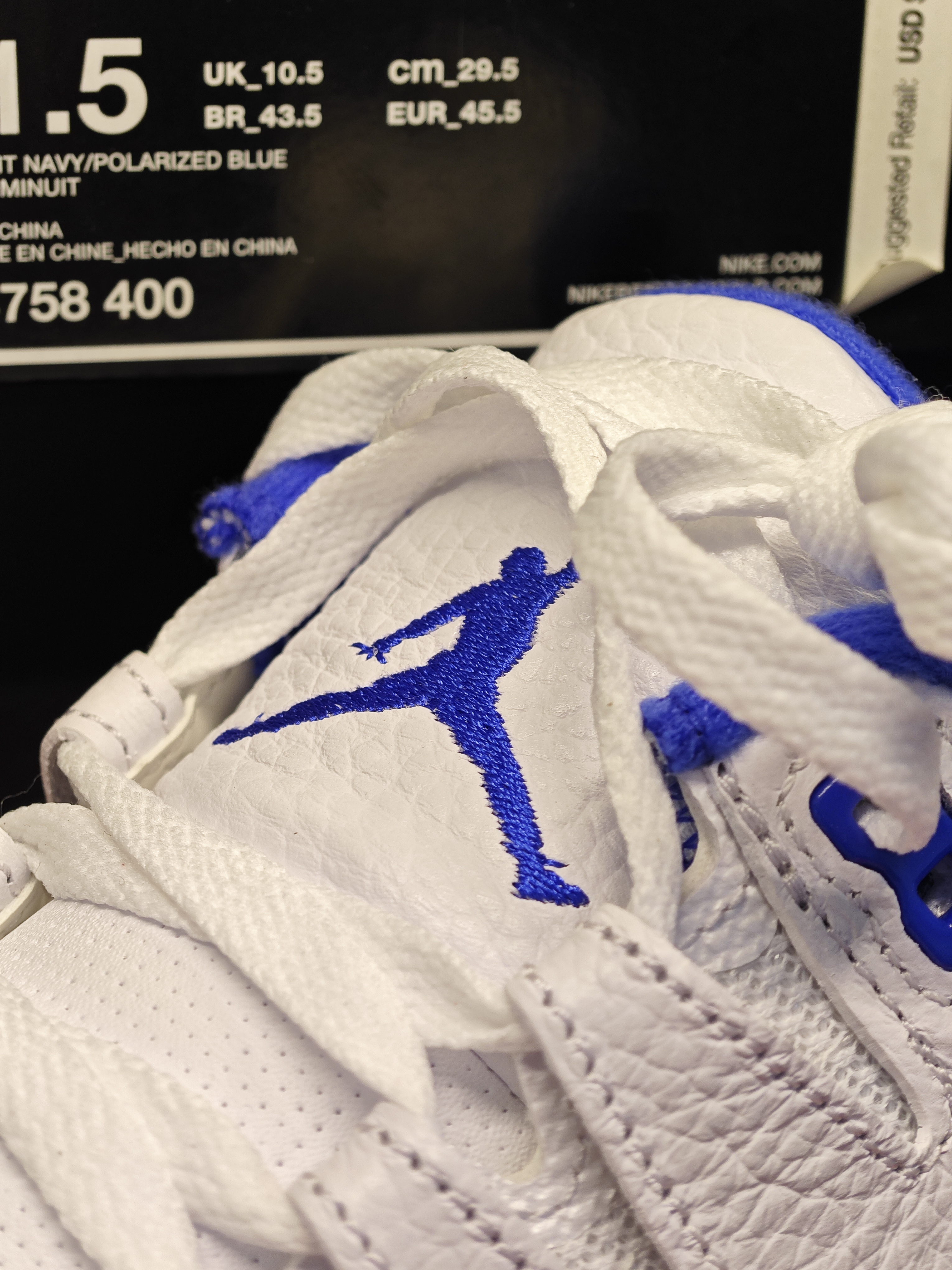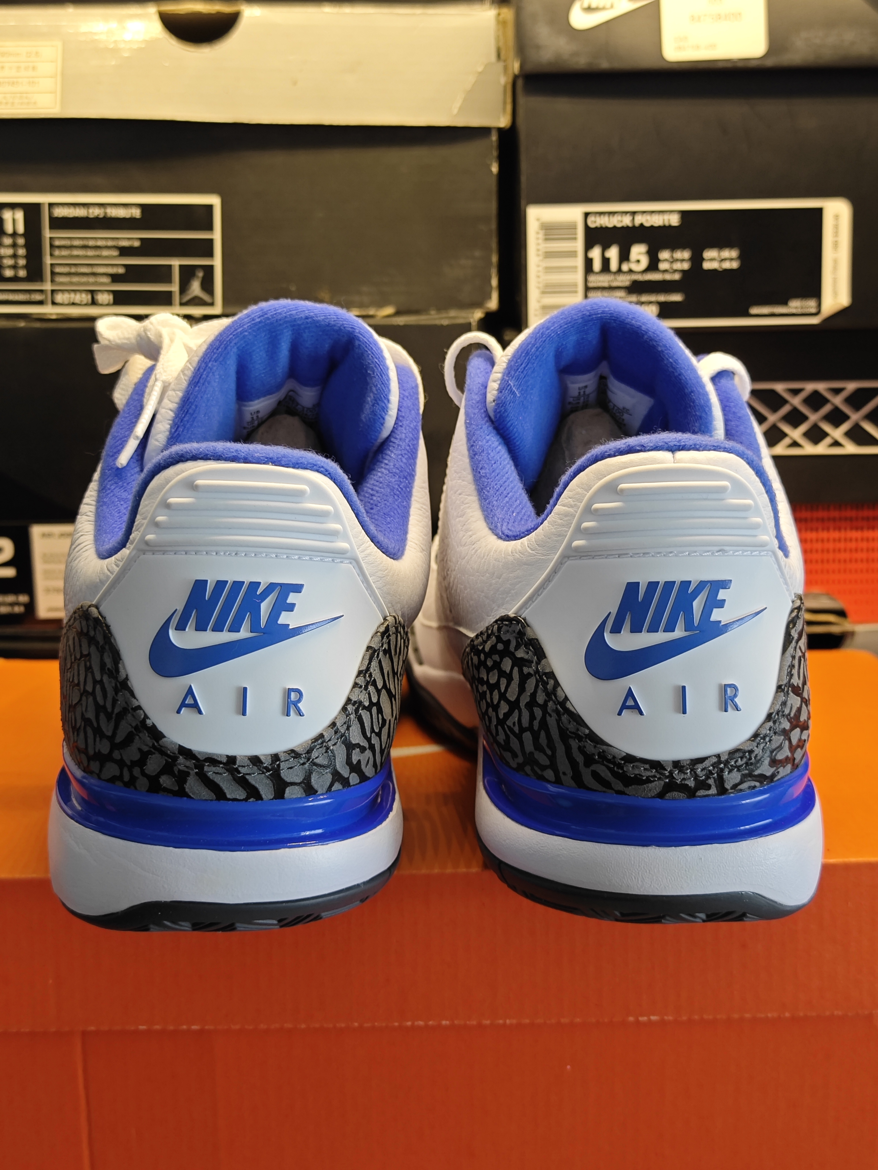 熟悉的true blue配色 熟悉的大象皮爆裂纹 这难道是AJ 3 但鞋面看着总觉得怪怪的 实际上这是一款网球鞋 几年前也出过AJ 3的其他配色 穿它的就是费德勒 如今新配色已然看不到费德勒的个人logo 鞋子整体做工不错 皮质也优秀