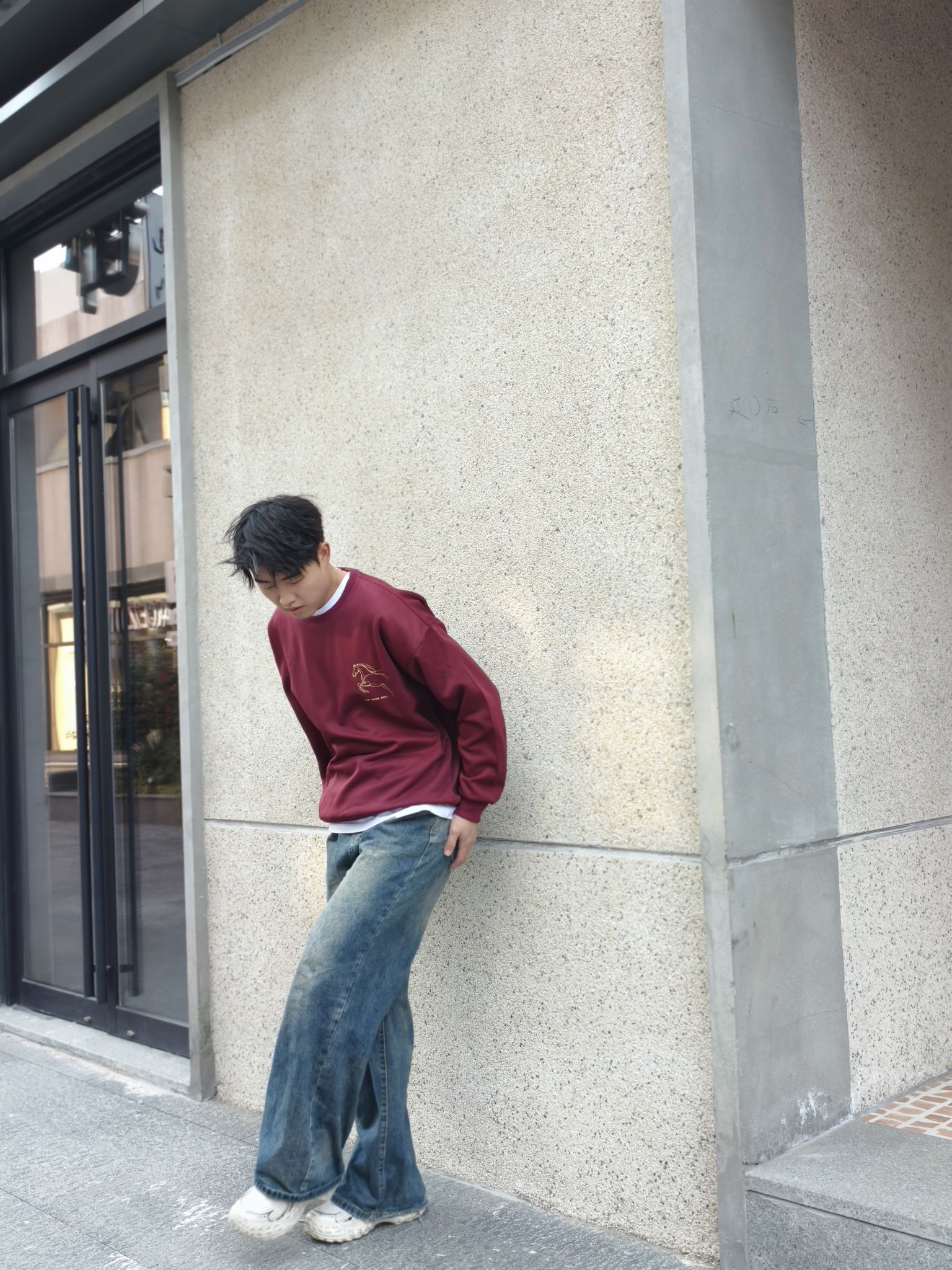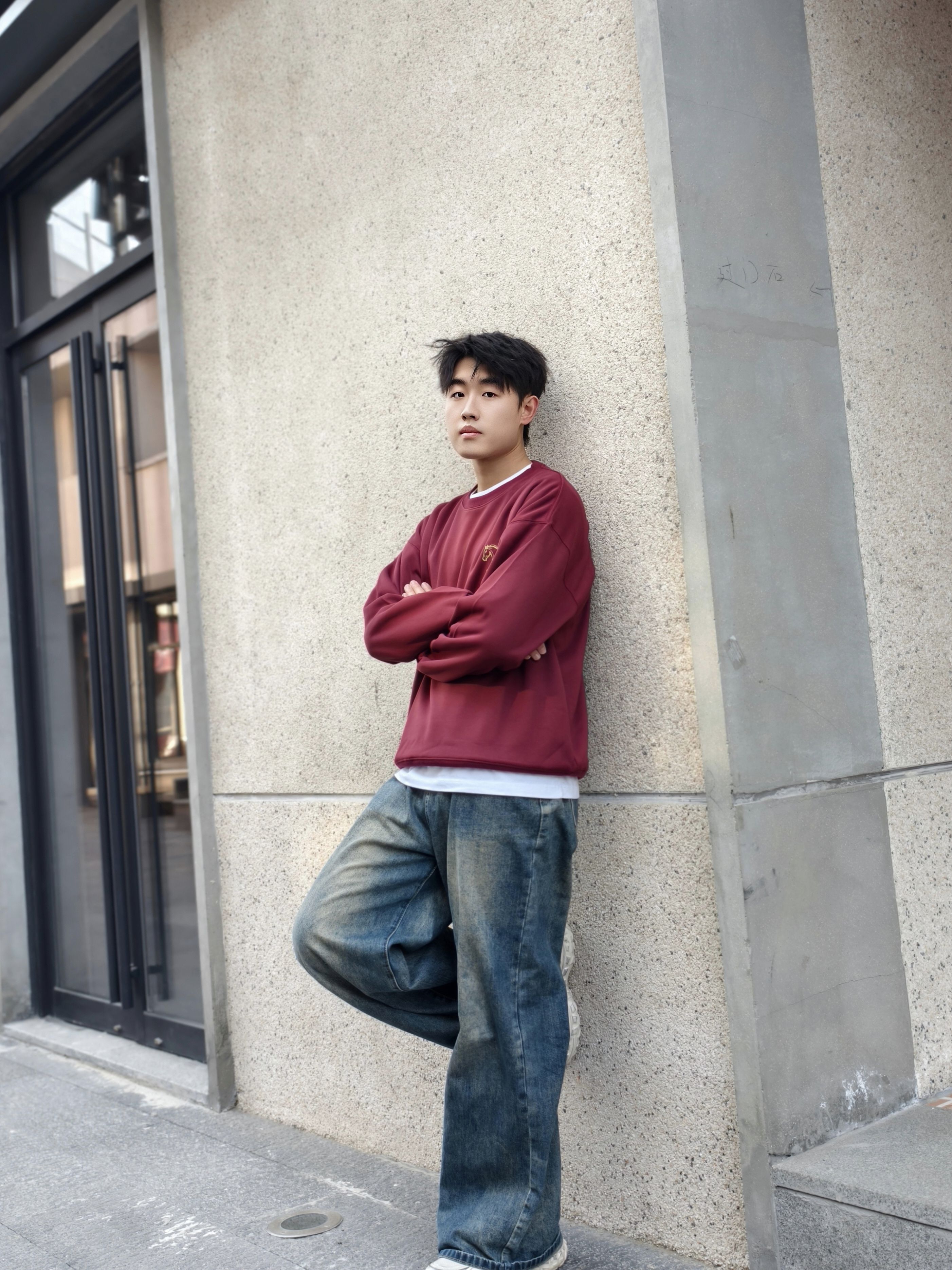 酒红色卫衣也太显白了吧! 内搭白T做叠穿,露出一点边边层次感拉满,搭配做旧阔腿牛仔裤,慵懒又随性~ 这种低饱和的酒红调调,秋冬穿超有氛围感,黄皮男生也能轻松驾驭✨