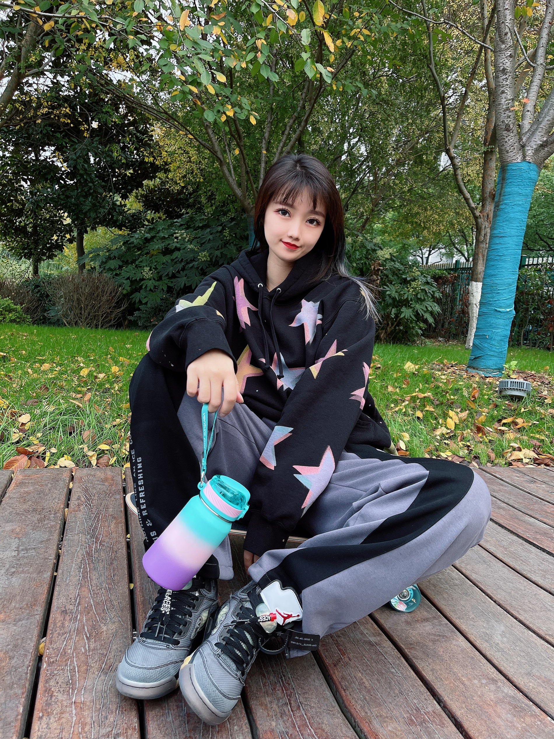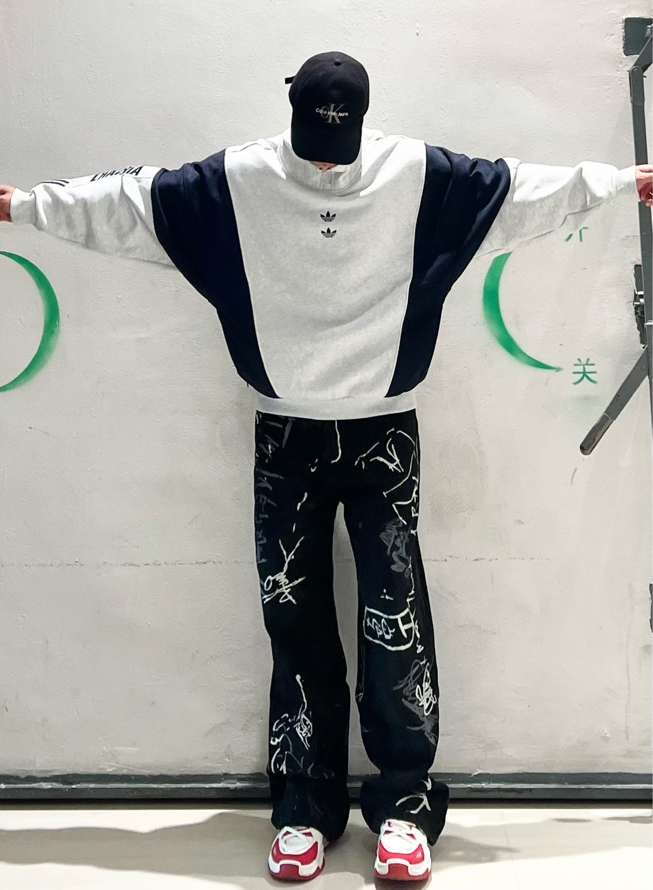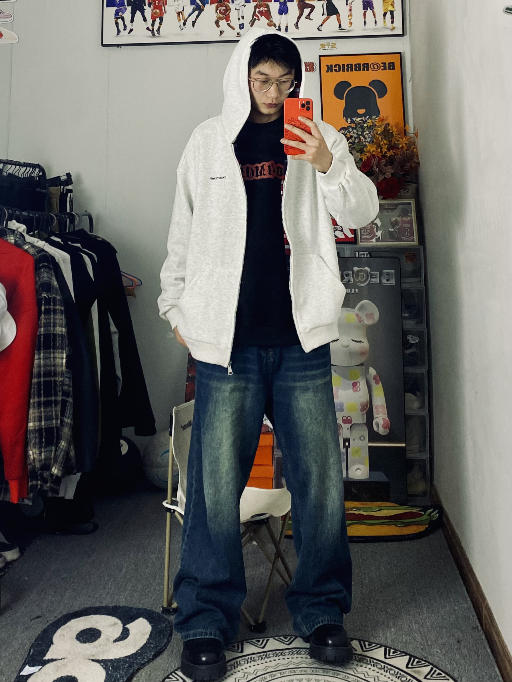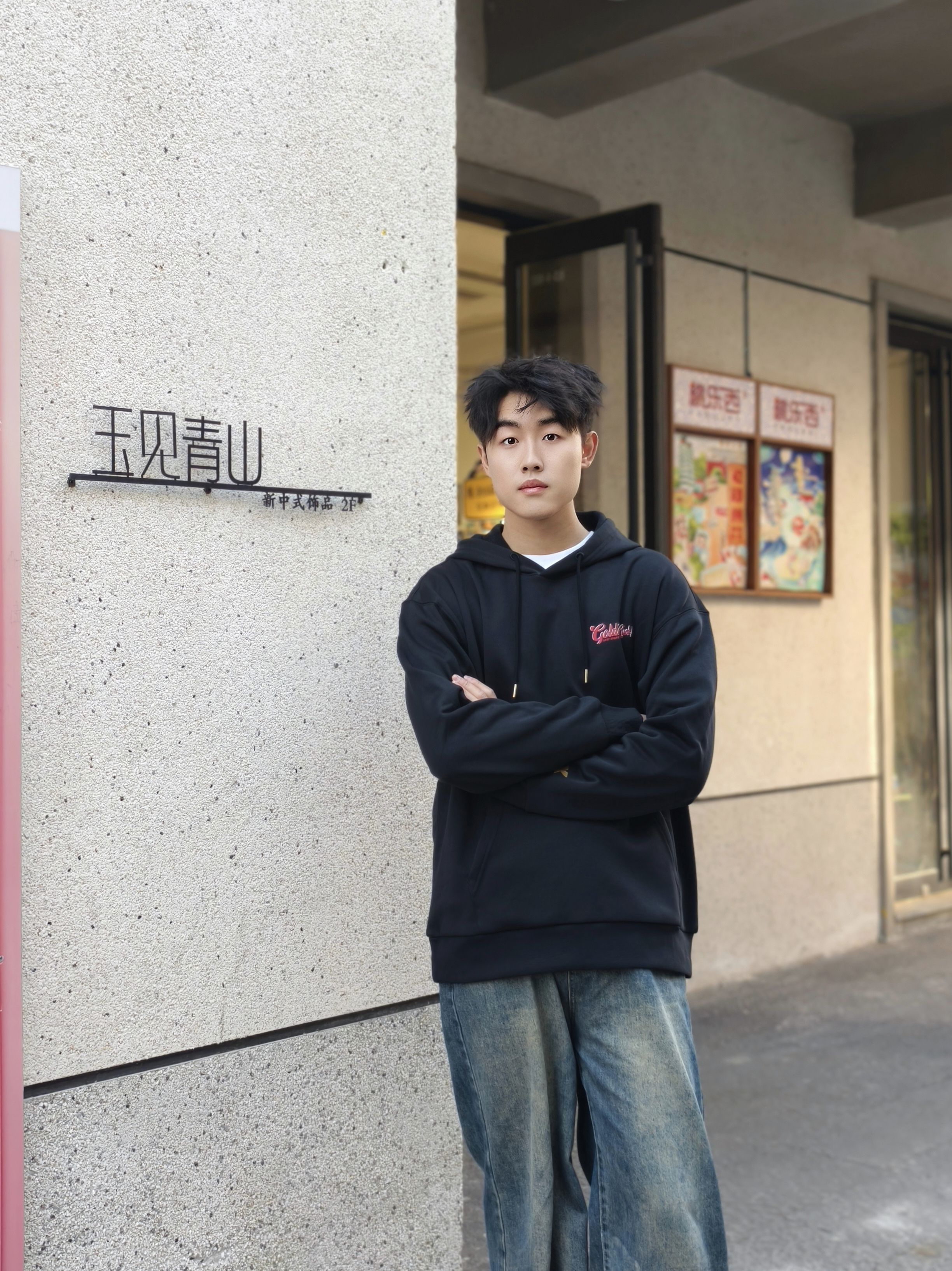 基础款黑连帽卫衣也能穿出高级感! 内搭白T露出小领口,搭配做旧阔腿牛仔裤,经典黑蓝配永远不出错~ 宽松版型藏肉又随性,不管是出街还是日常,这套穿搭都超省心✨