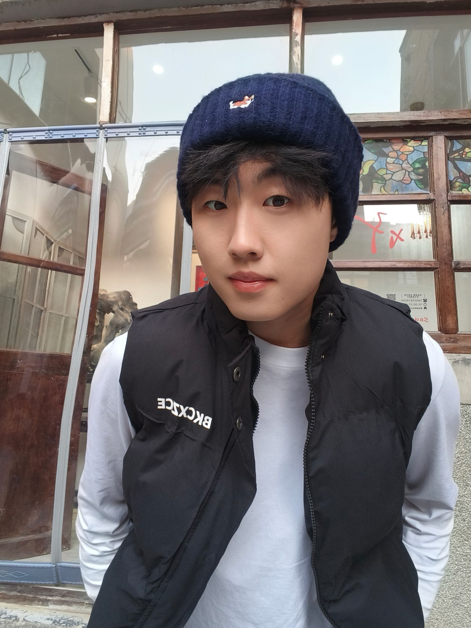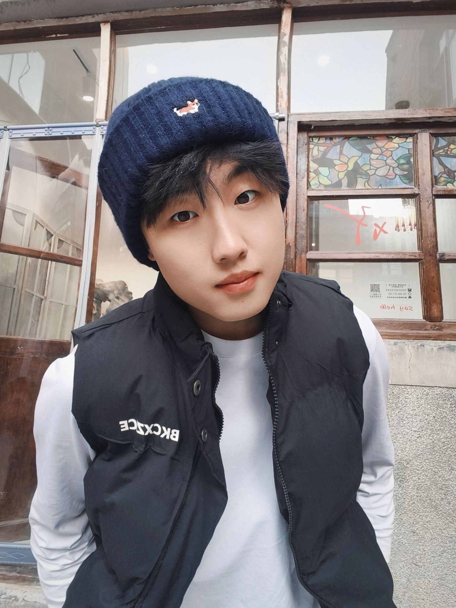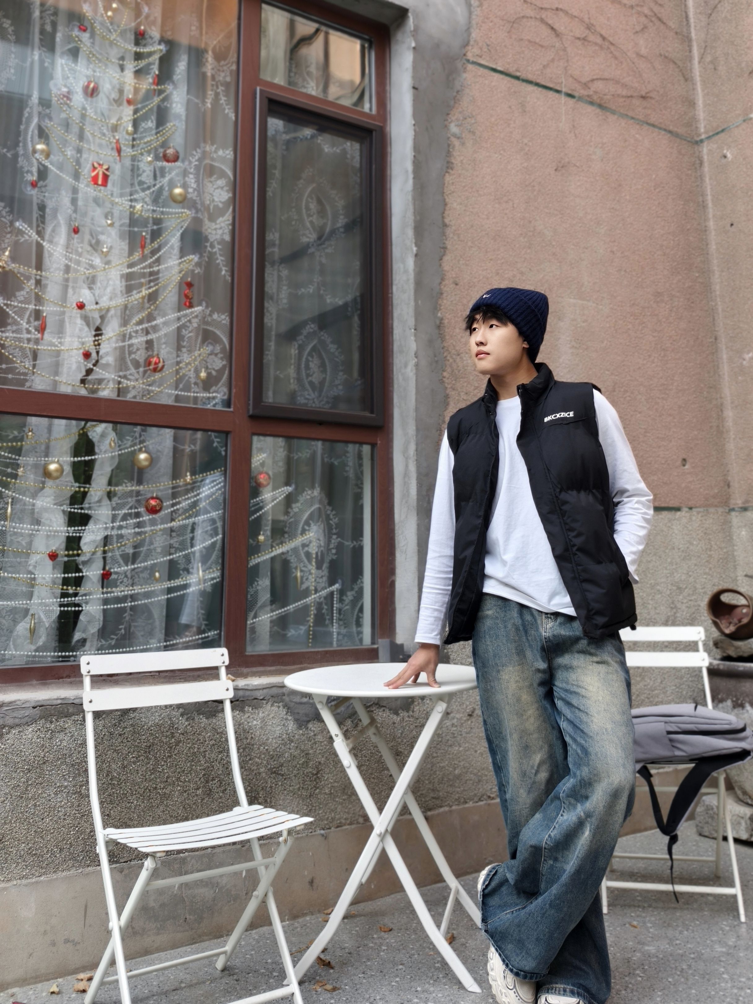 黑色羽绒马甲搭白T是基础操作,配上藏青贝雷帽直接氛围感拉满! 软乎乎的贝雷帽中和了马甲的硬朗,细节处的小刺绣还超有设计感~ 男生秋冬戴贝雷帽真的超加分,秒变韩系少年感✨