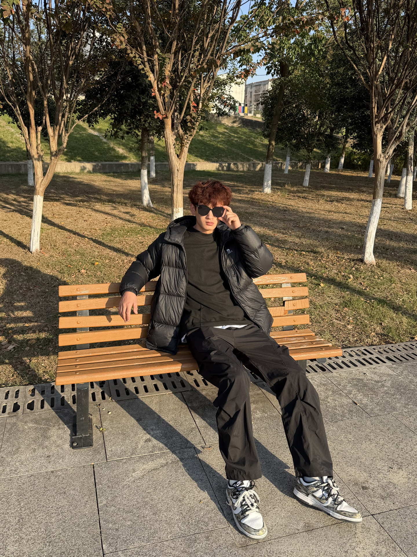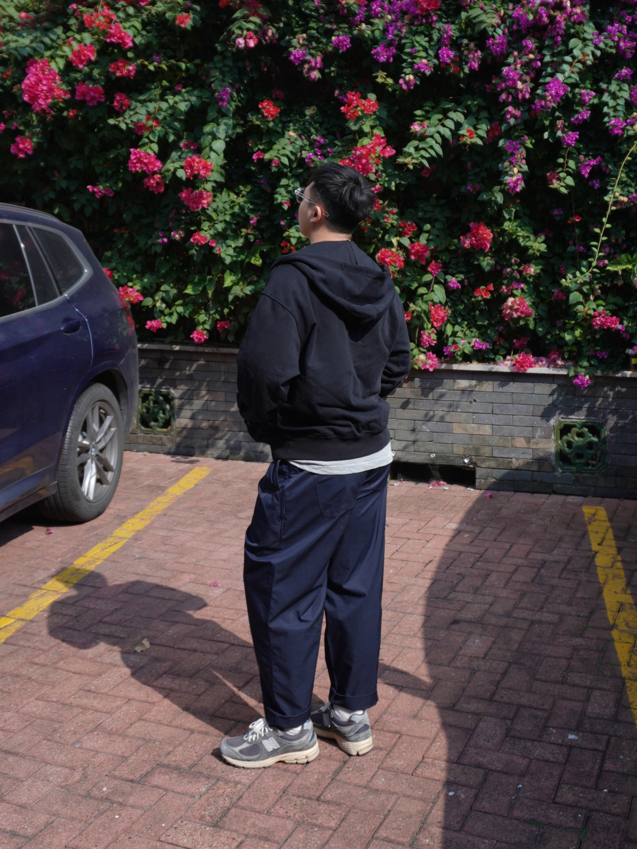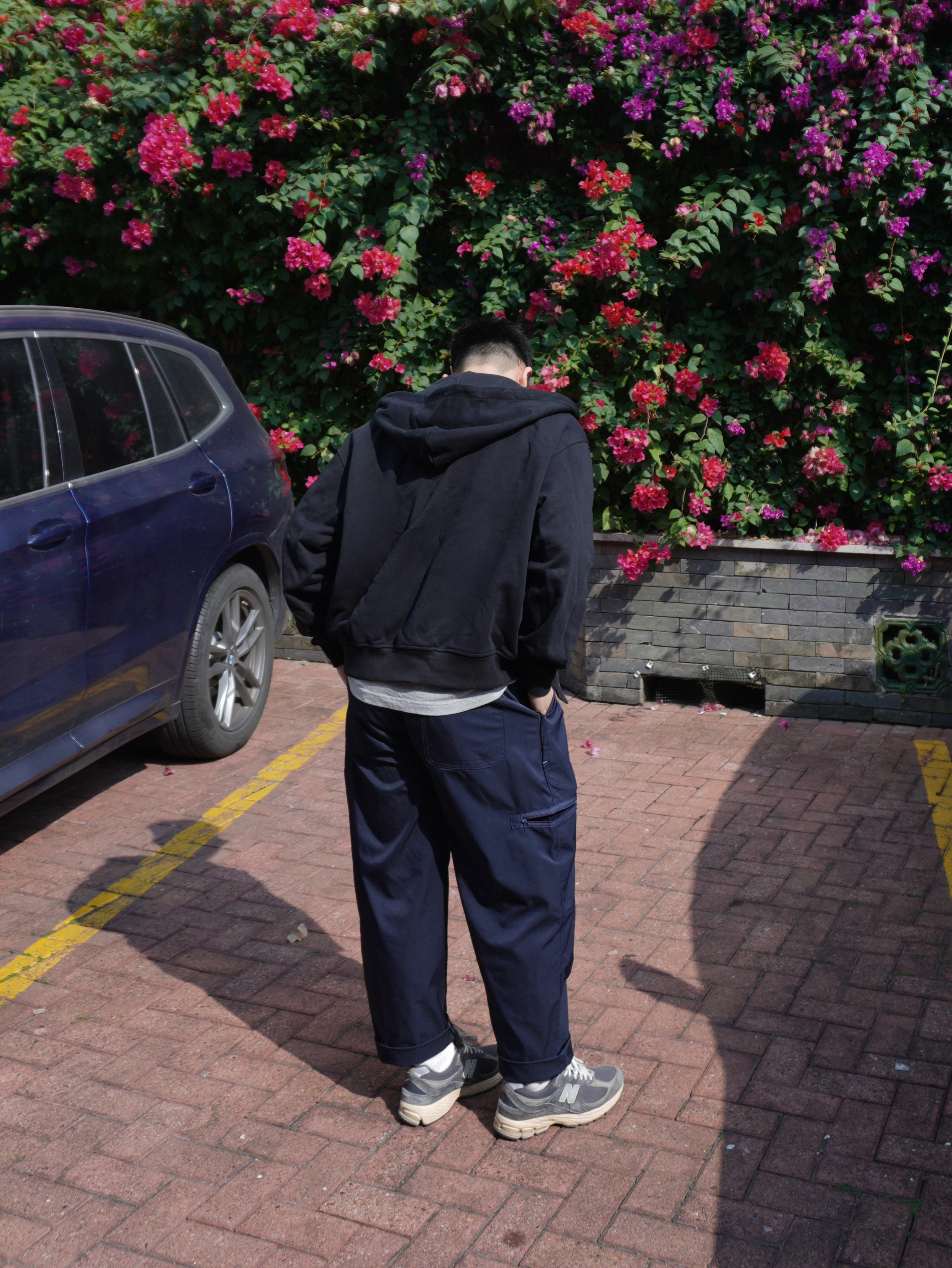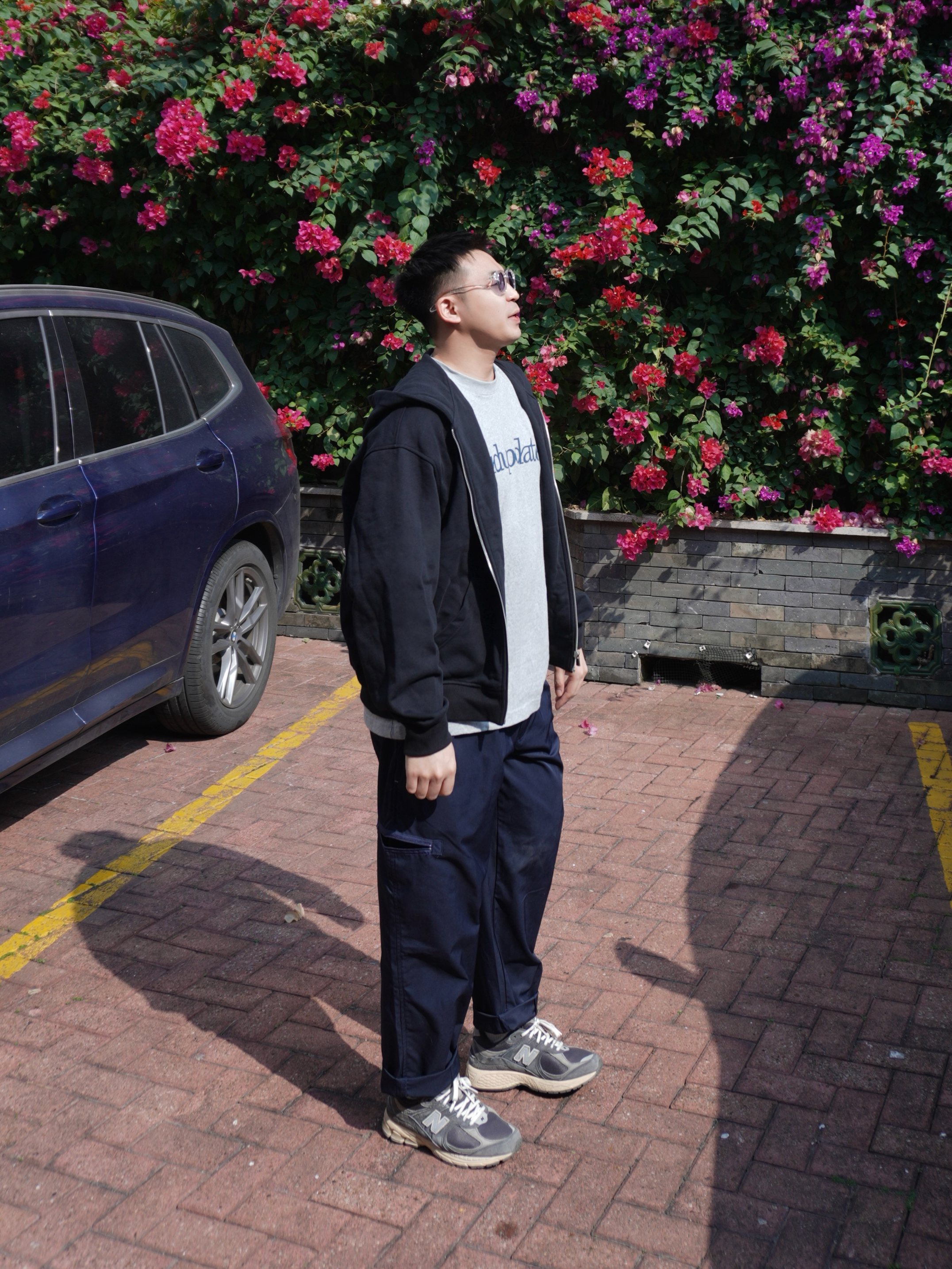 1. 内搭透点“气” 一身深色怕太闷,里面搭件浅灰印花T。敞开黑色开衫,露出中间那点浅灰色和印花,视觉上一下就亮了,简单又有层次。 2. 裤装玩点“机能” 下身配藏青色机能长裤,黑与蓝的组合很耐看,比纯黑多点变化。机能面料相对硬挺,上身利落不软塌,看着有精气神。 3. 鞋子负责“舒适” 一双经典NB慢跑鞋,复古的造型跟这一身很搭。主打就是走路舒服,