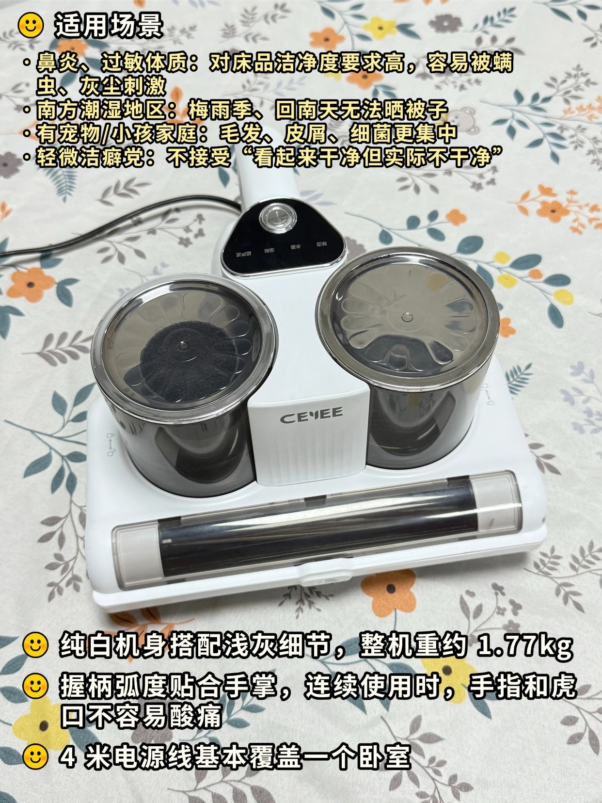 这段时间南方真的太难了😭 梅雨季一来,空气又潮又闷,被子根本没法晒。 我本身还是鼻炎体质,一到晚上躺床上就开始打喷嚏,后背还莫名其妙发痒,睡眠质量直接拉到谷底。 直到前阵子实在受不了,认真研究了一圈除螨仪,才把这台希亦 RM1请回家。 说实话,用完第一周我就一个感受:床终于有“阳光味”了🌞 先说个很直观的点——颜值真的戳我。 奶fufu的纯白机身,放在卧室一点不突兀,完全不像传统清洁电器那么“...