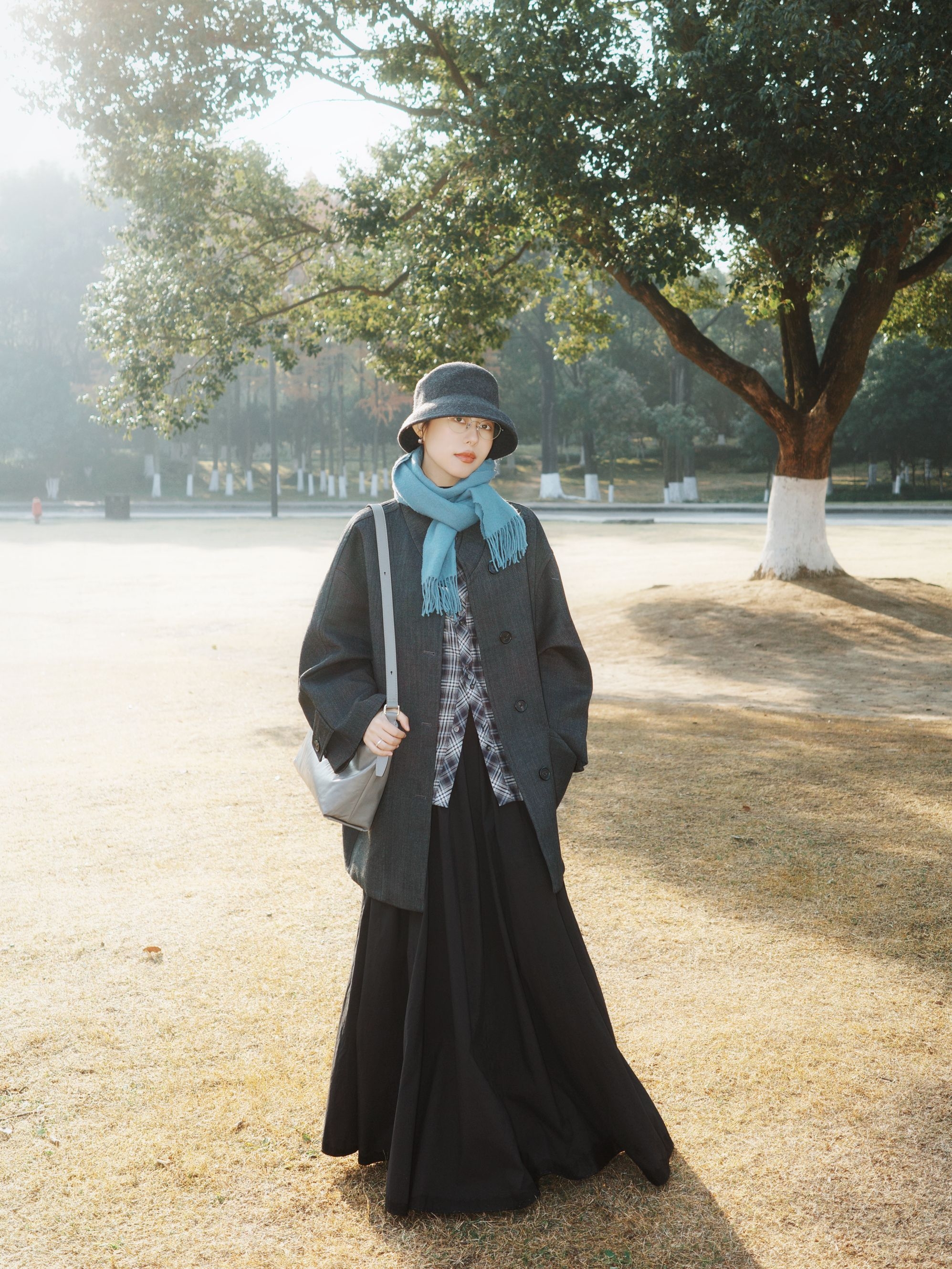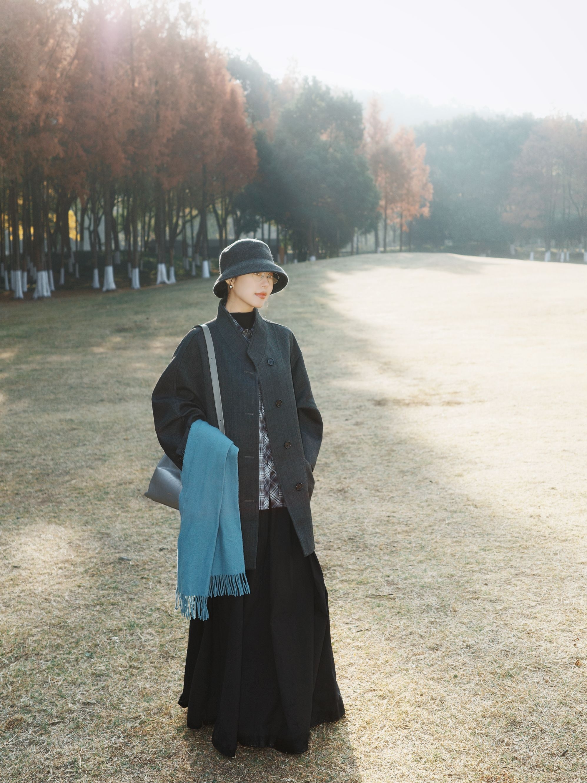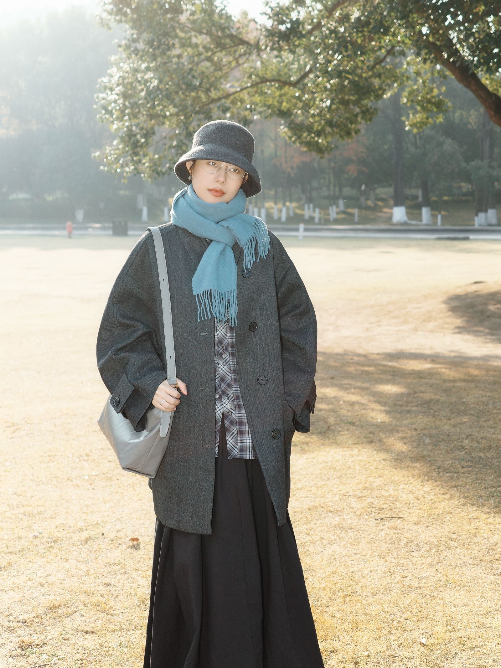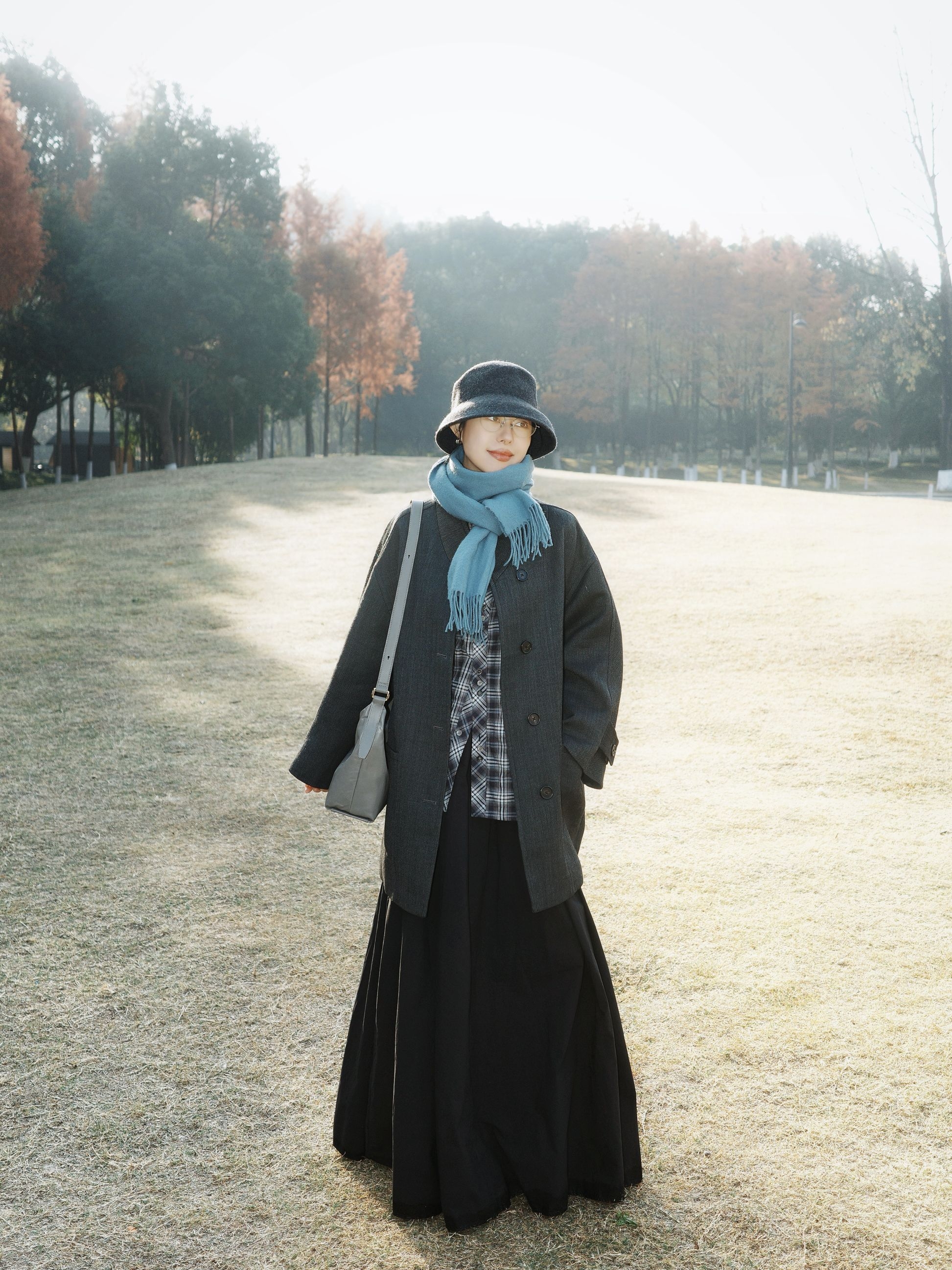 冬日林间的复古文艺,被黑灰穿搭揉进风里啦🍂 黑灰色调像蹲在暖阳里的老石桥,沉默着却藏满温柔的细节,灰色大衣松垮着裹住身,内搭的格纹衬衫露出边角,细碎的纹路添了几分复古味~ 搭配一抹亮色的围巾,把文艺感拉得满满当当。