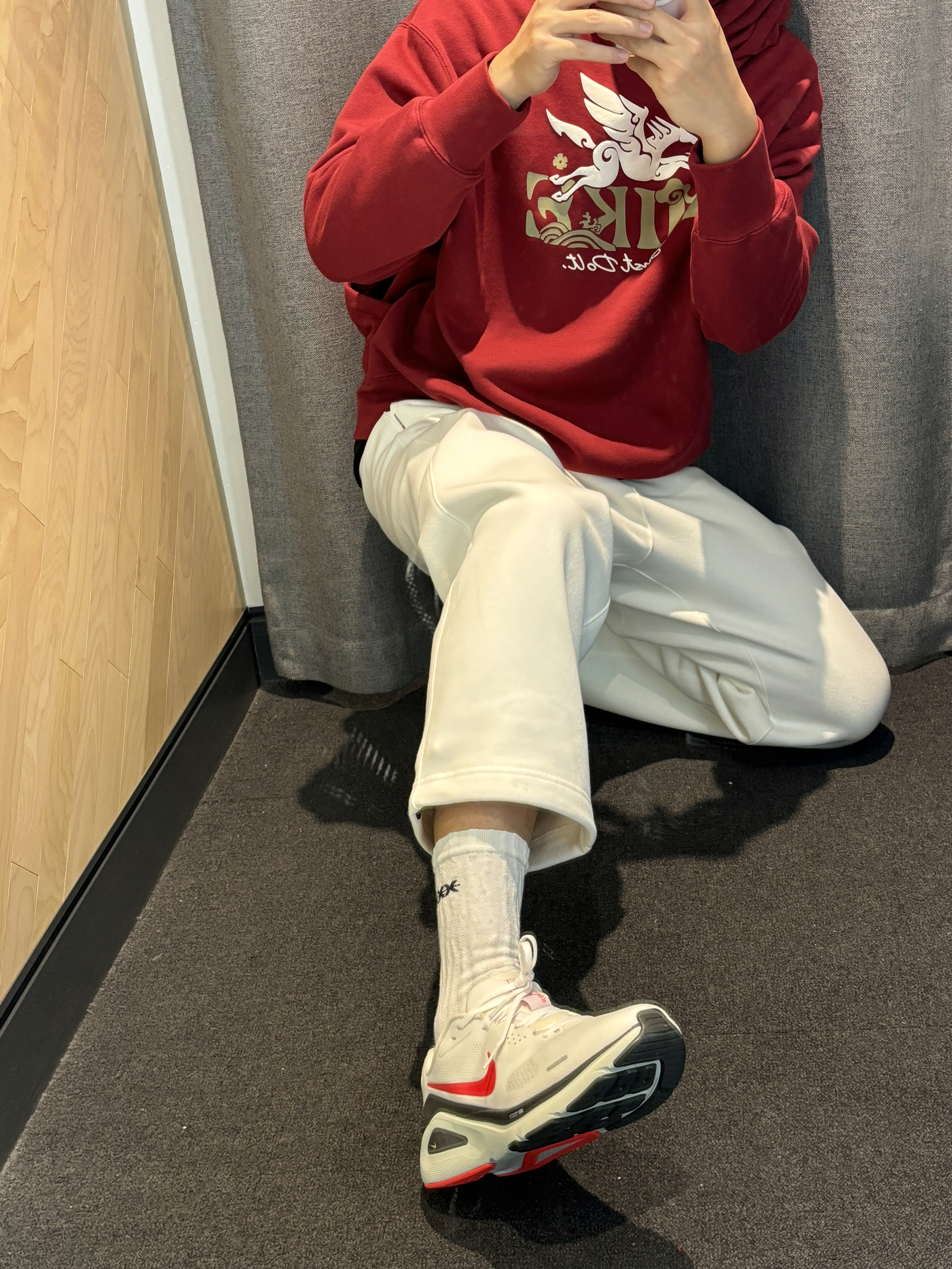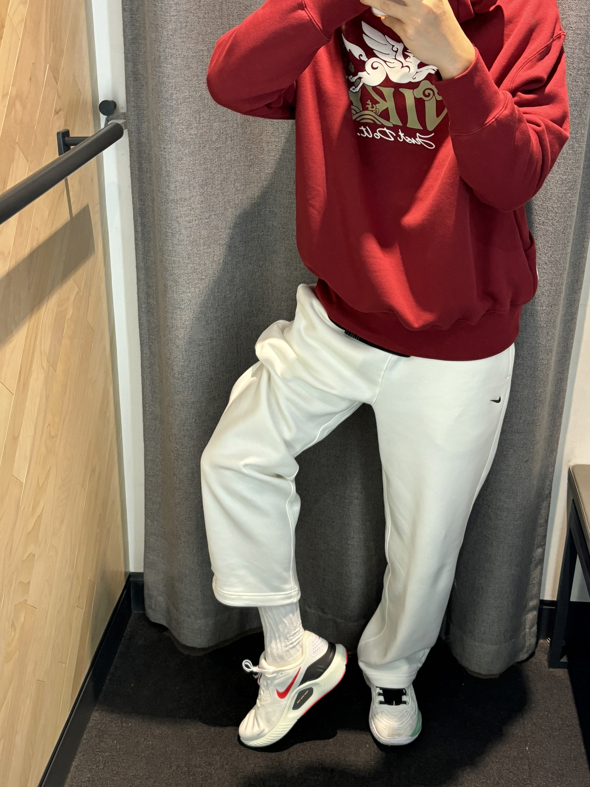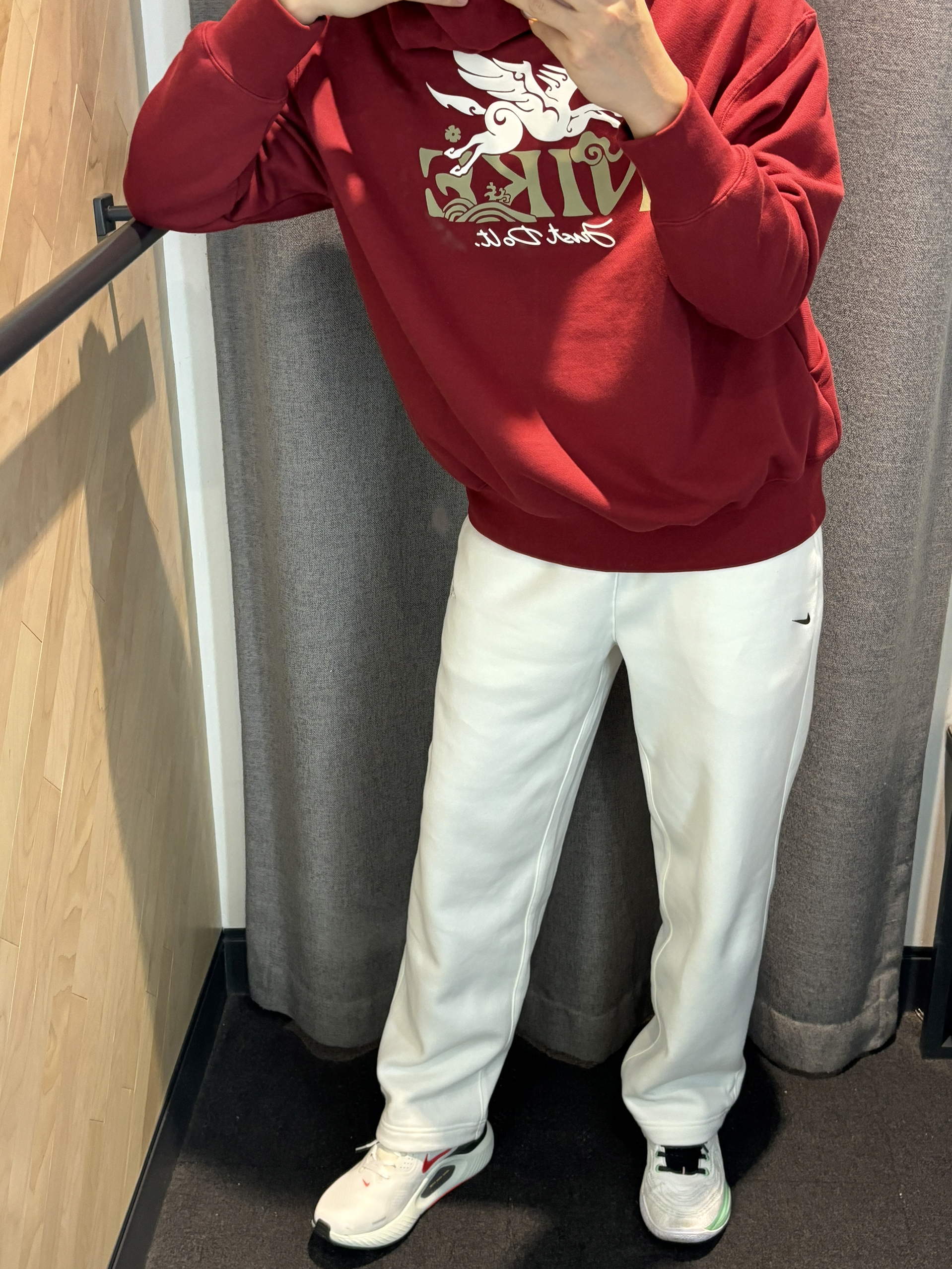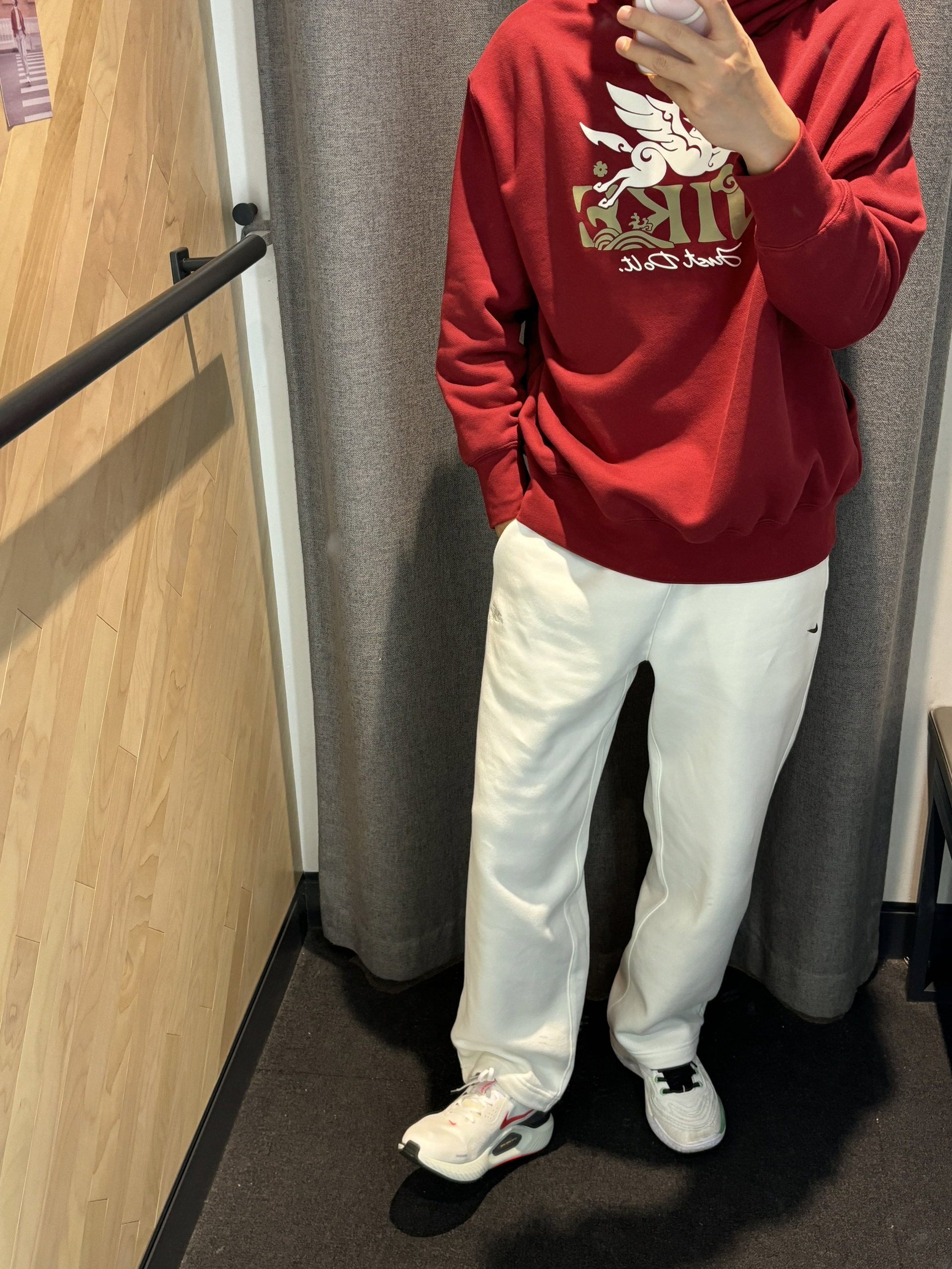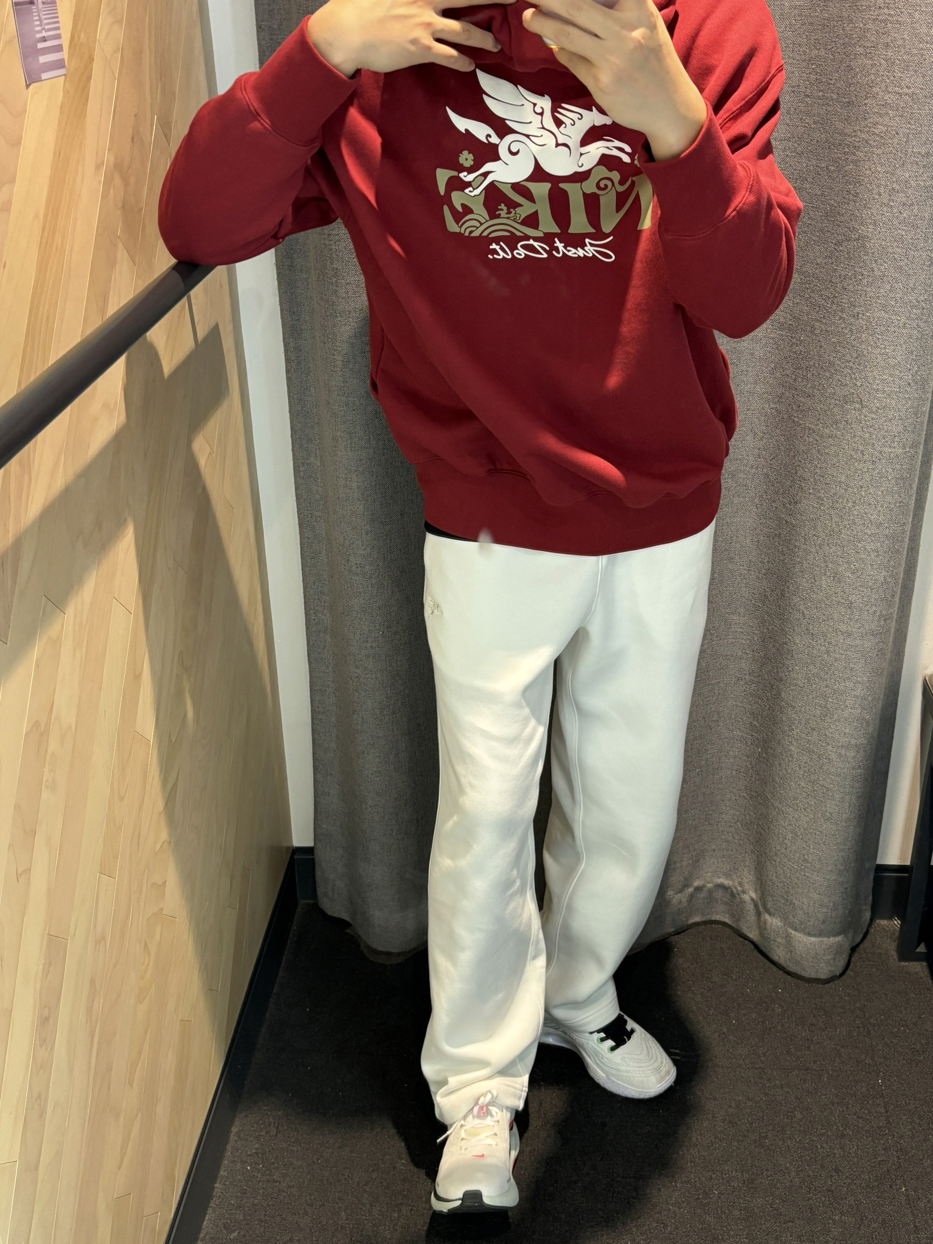 2025年度穿搭还得是红色关键词 我的基础款不无聊 我的基础穿搭也有新年的氛围感惊喜 基础的马年直筒裤 只要搭配红色的卫衣就很有惊喜感 暗红色处理不会很刺眼 很和谐还有质感,马年的元素logo很有生机 搭配一双马年新跑鞋就好了
