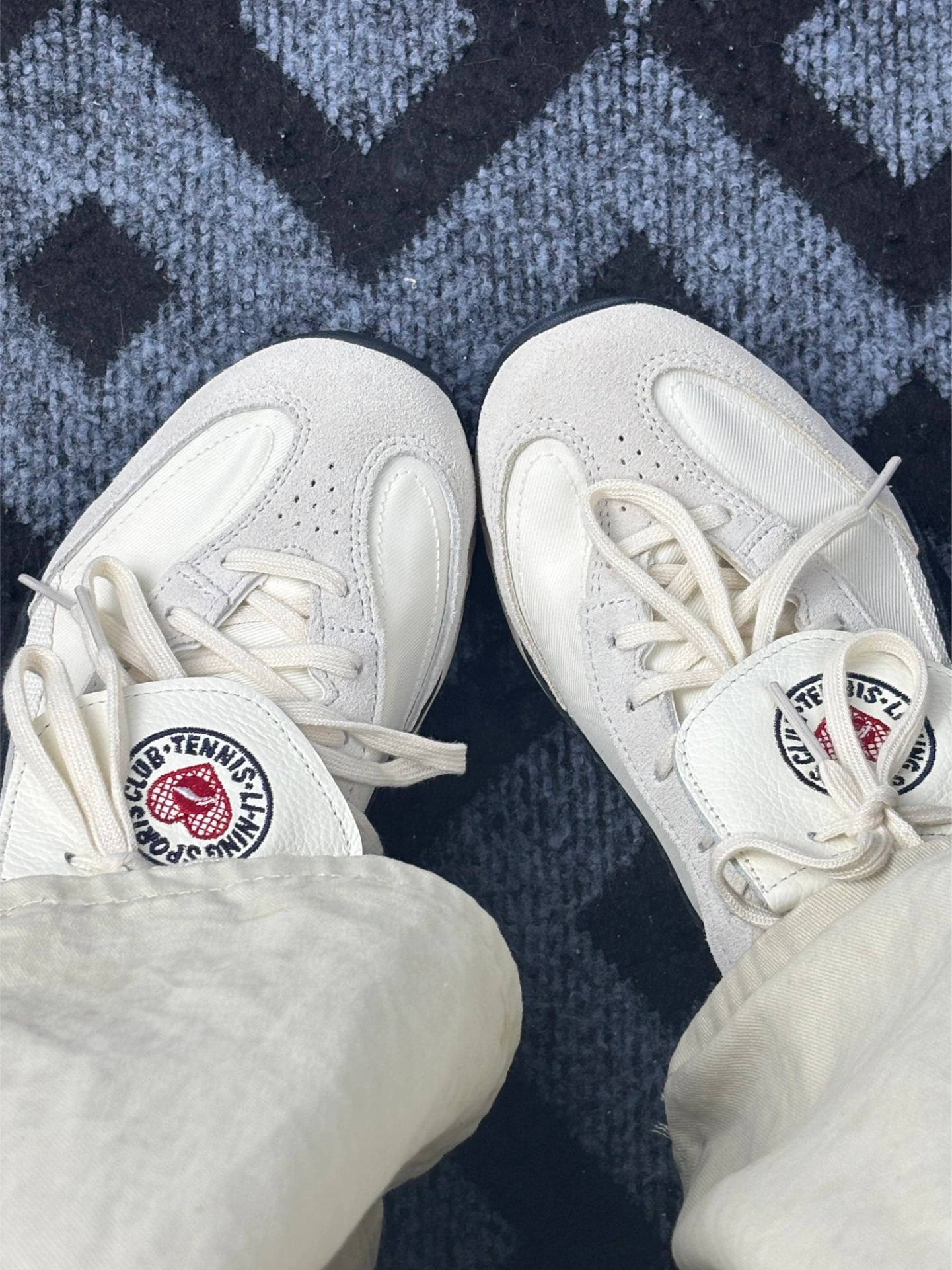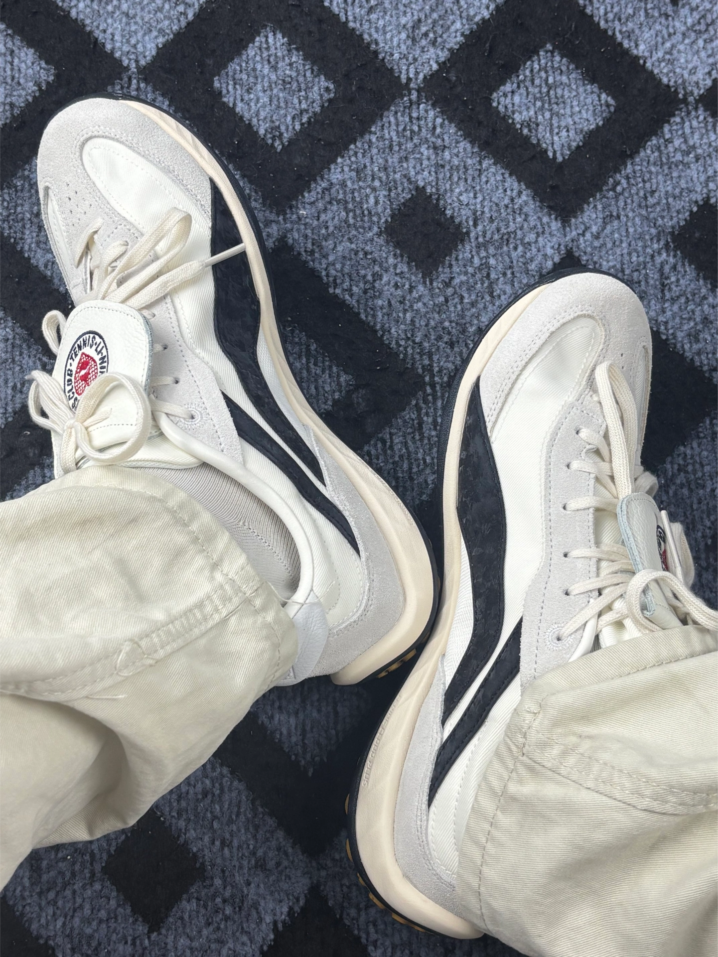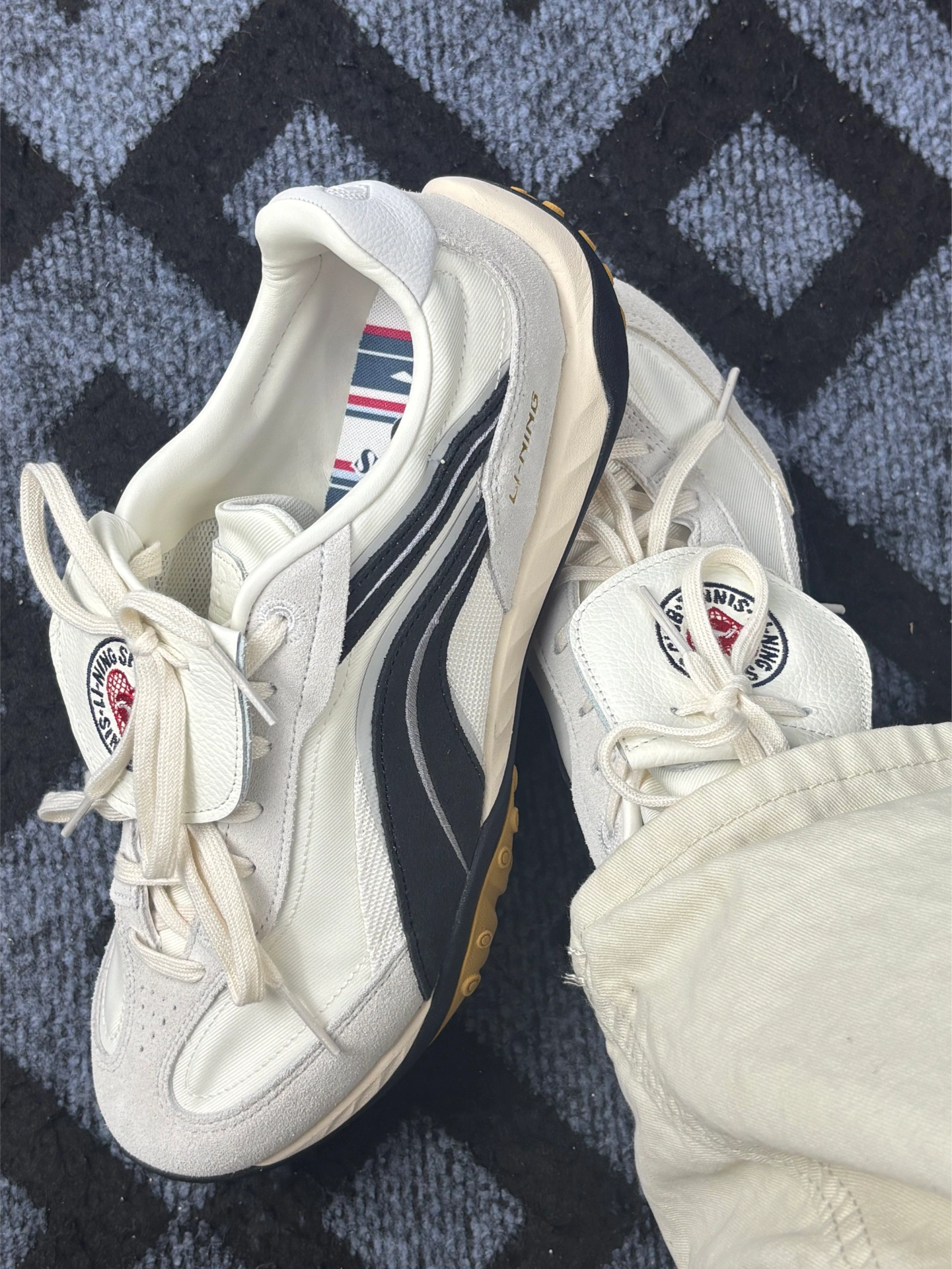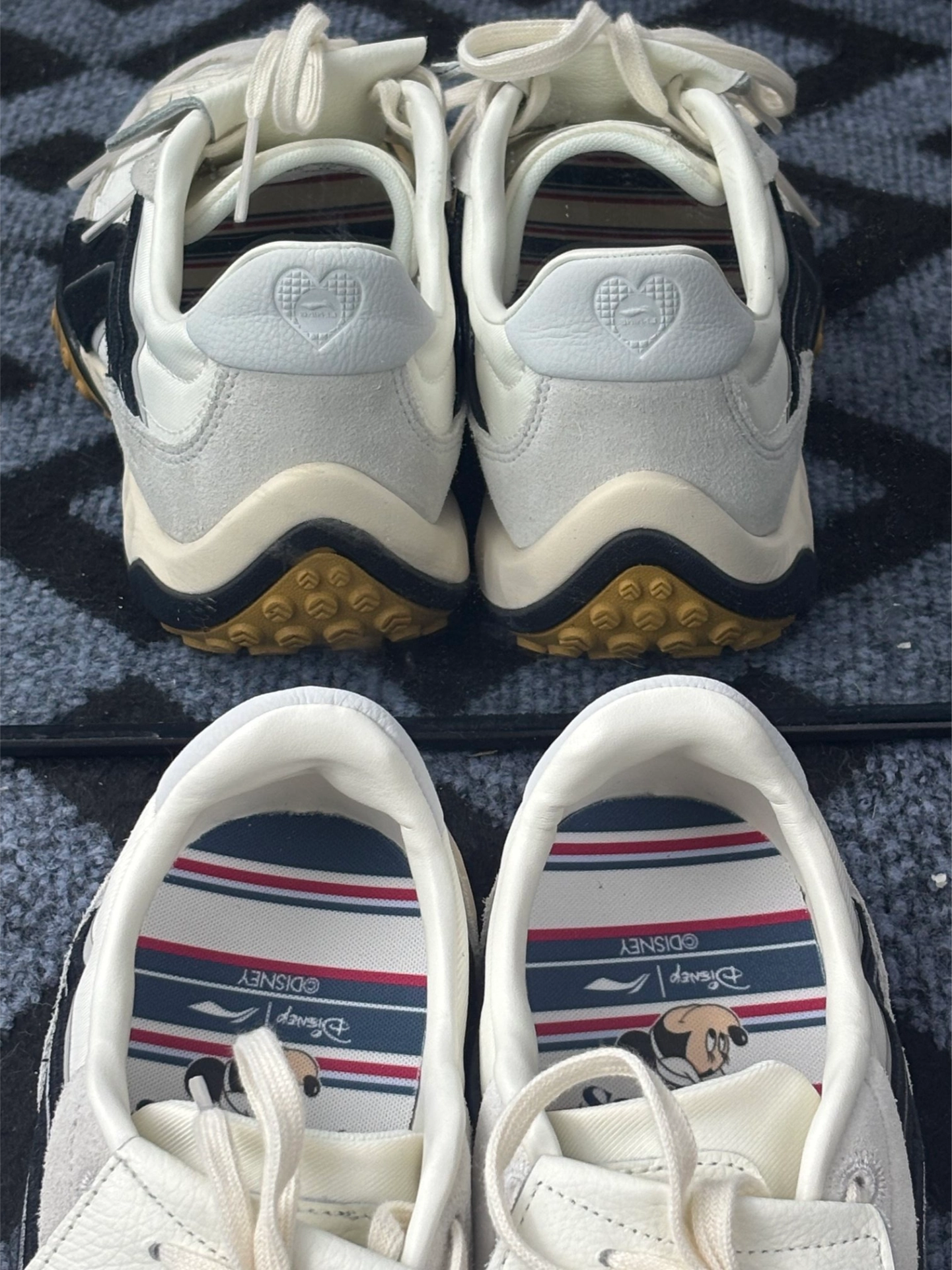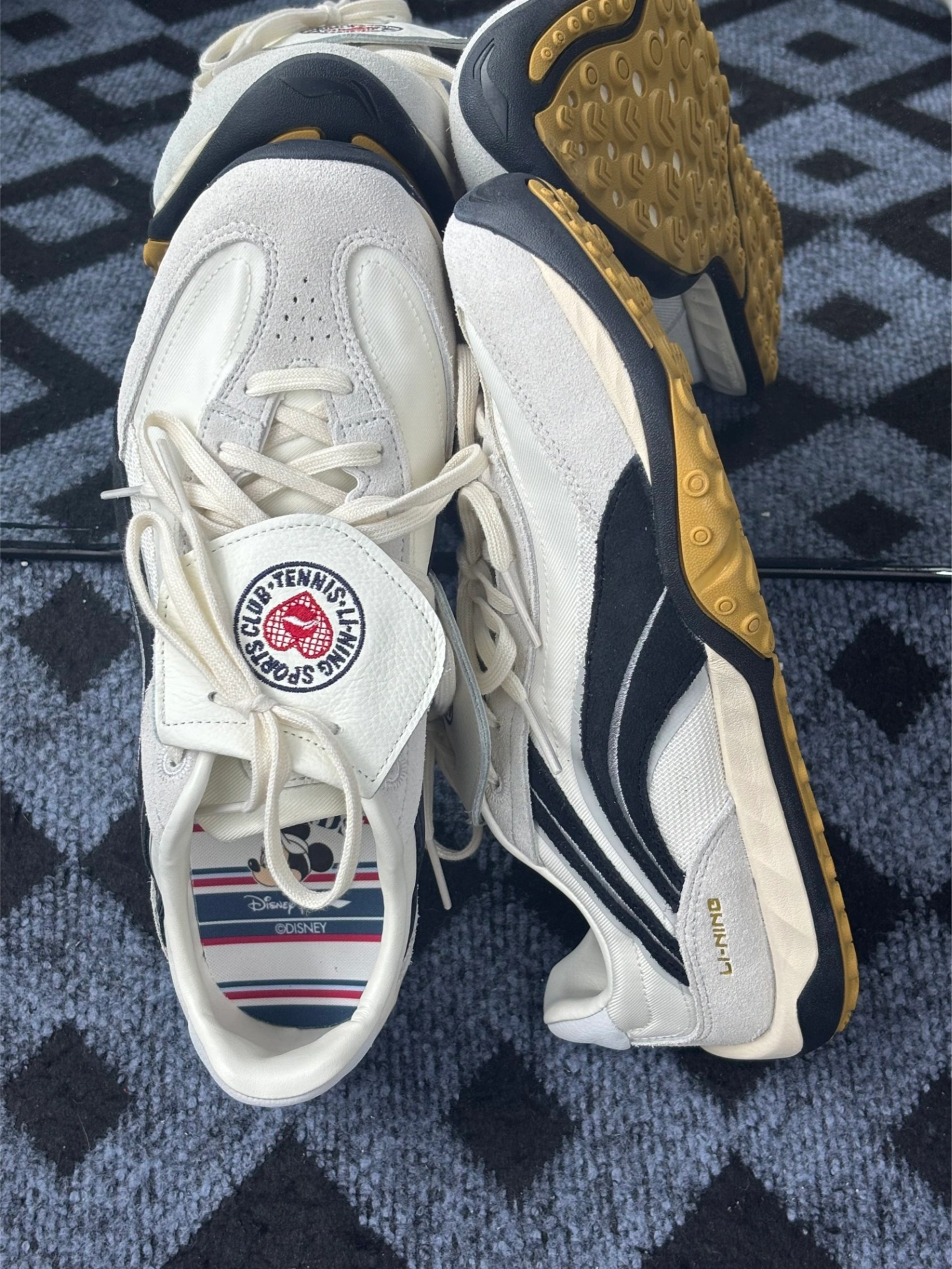 今日主角BADMARKET x LiNing李宁 心流[吃瓜_blue][吃瓜_blue] 颜色材质:米白色麂皮鞋面,比纯白耐脏,鞋头和鞋跟有黑色橡胶包边。鞋舌是厚实的网布,上面缝了“SPORTS CLUB TENNIS”的圆形标,红色小网球图案挺复古的。[惊喜_blue][惊喜_blue] 迪士尼元素:鞋垫印满米奇头,右脚鞋跟有个小小的立体米奇心形标(远看像普通装饰),鞋盒内衬也有绿色迪士...