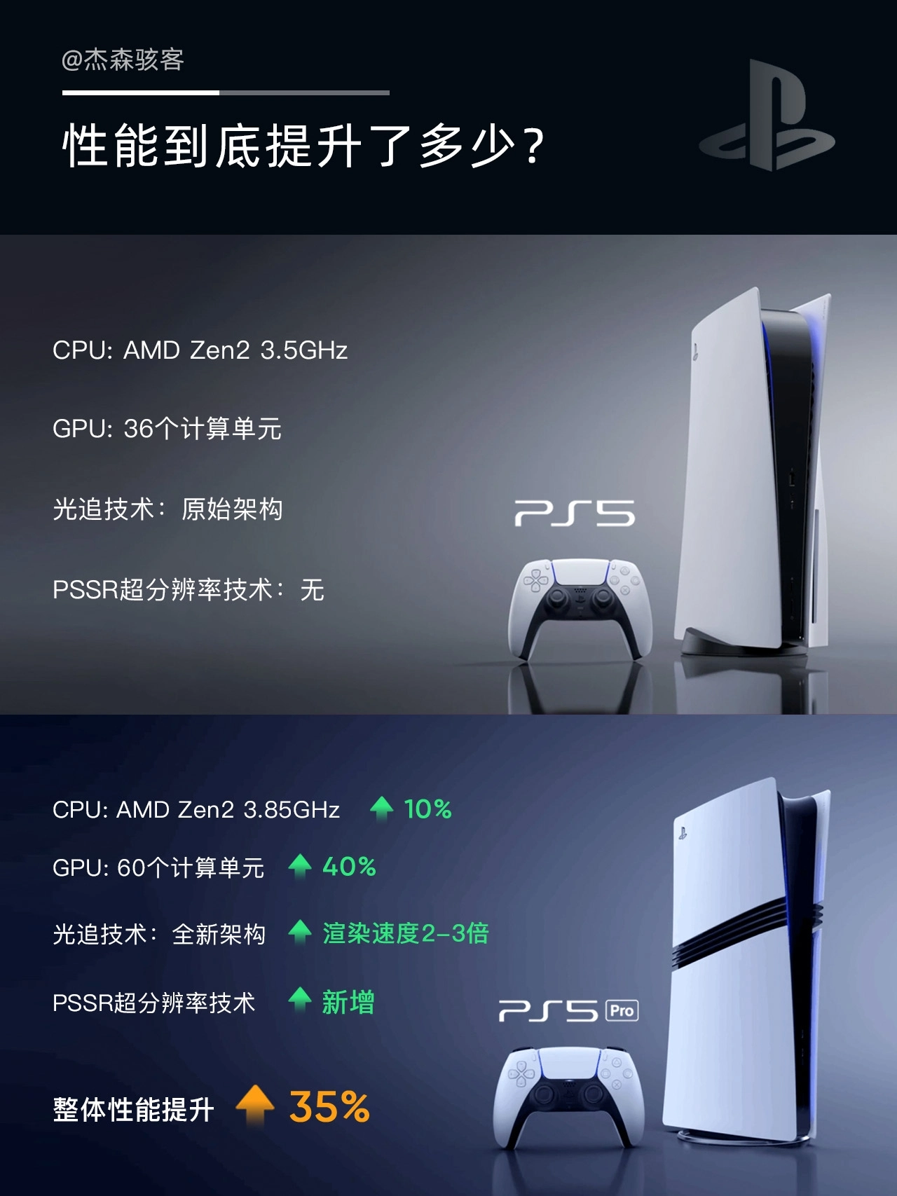 PS5与PS5Pro横向对比,看看哪个适合你。 🎮硬件升级: 如图所示,不过多赘述,官方表示总体性能提升35%-45%,个人游玩感觉提升20%左右。 🤯个人感受: 针对热门游戏进行游玩,感觉在画质近景表现和远景表现分别能提升30%和10%,在电视上游玩的话远景很多时候看不出区别。 在游戏流畅度上有比较明显的提升,特别是针对PS5Pro优化后的游戏。 📃总结部分: 如果不差钱且追求画...
