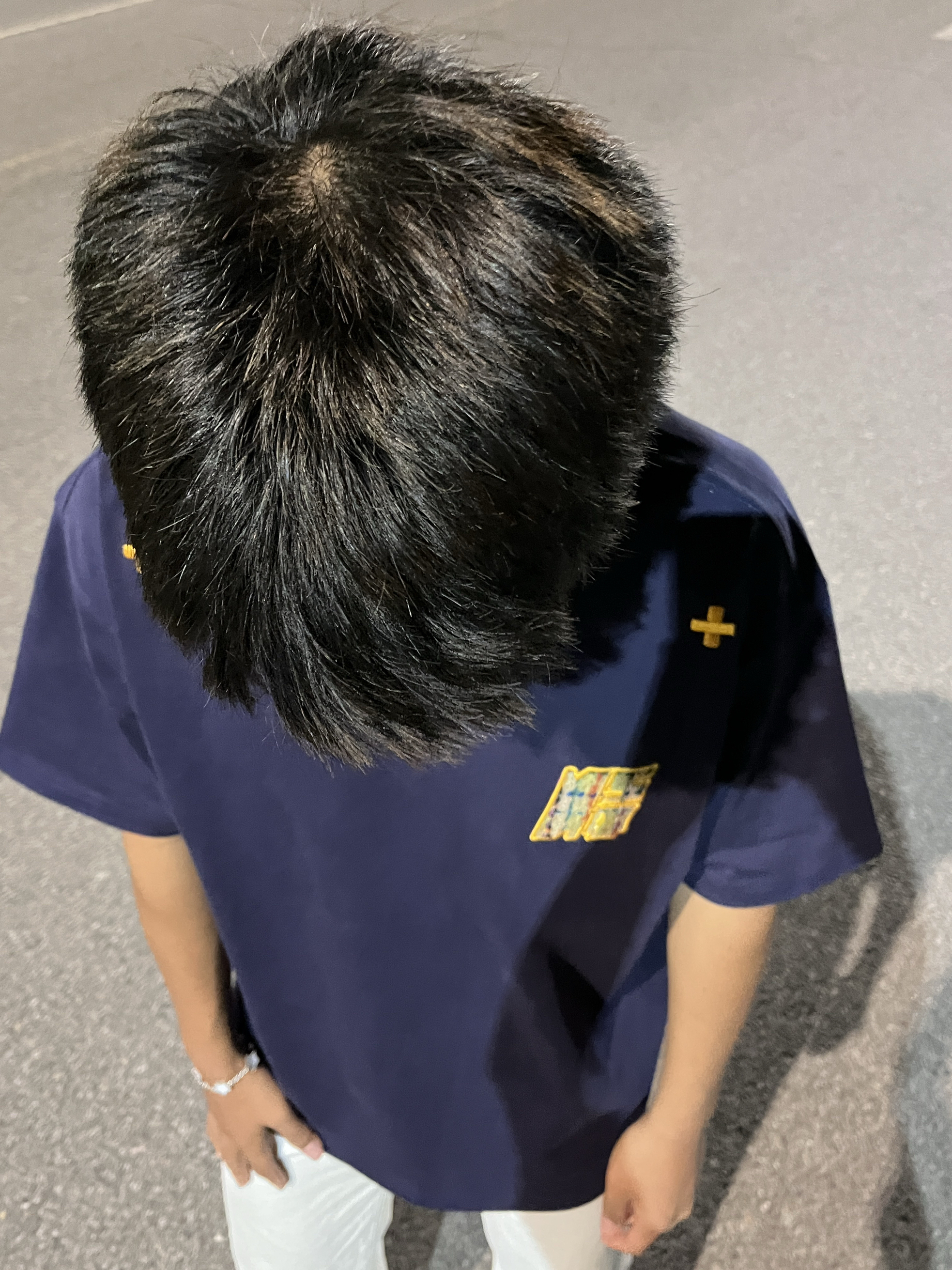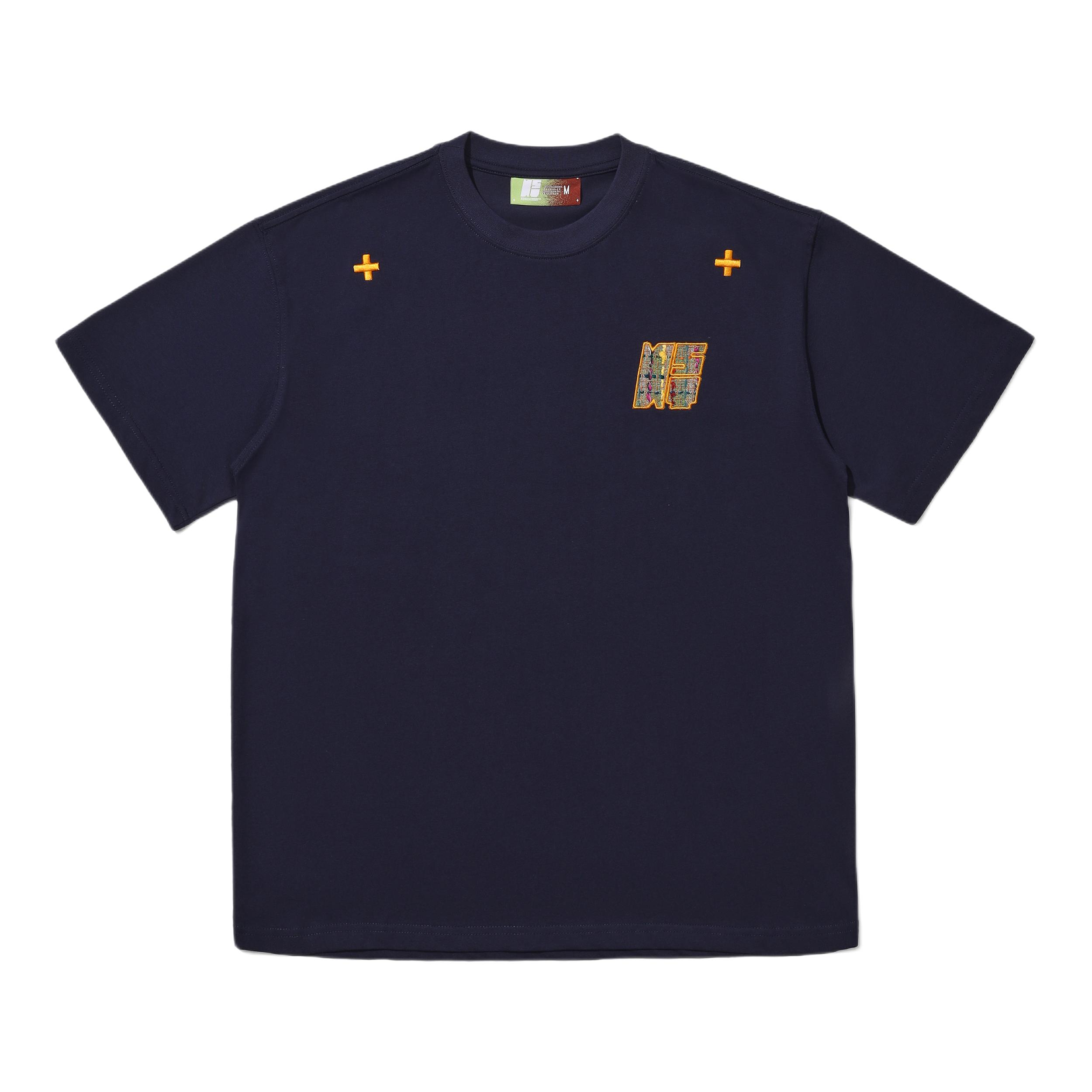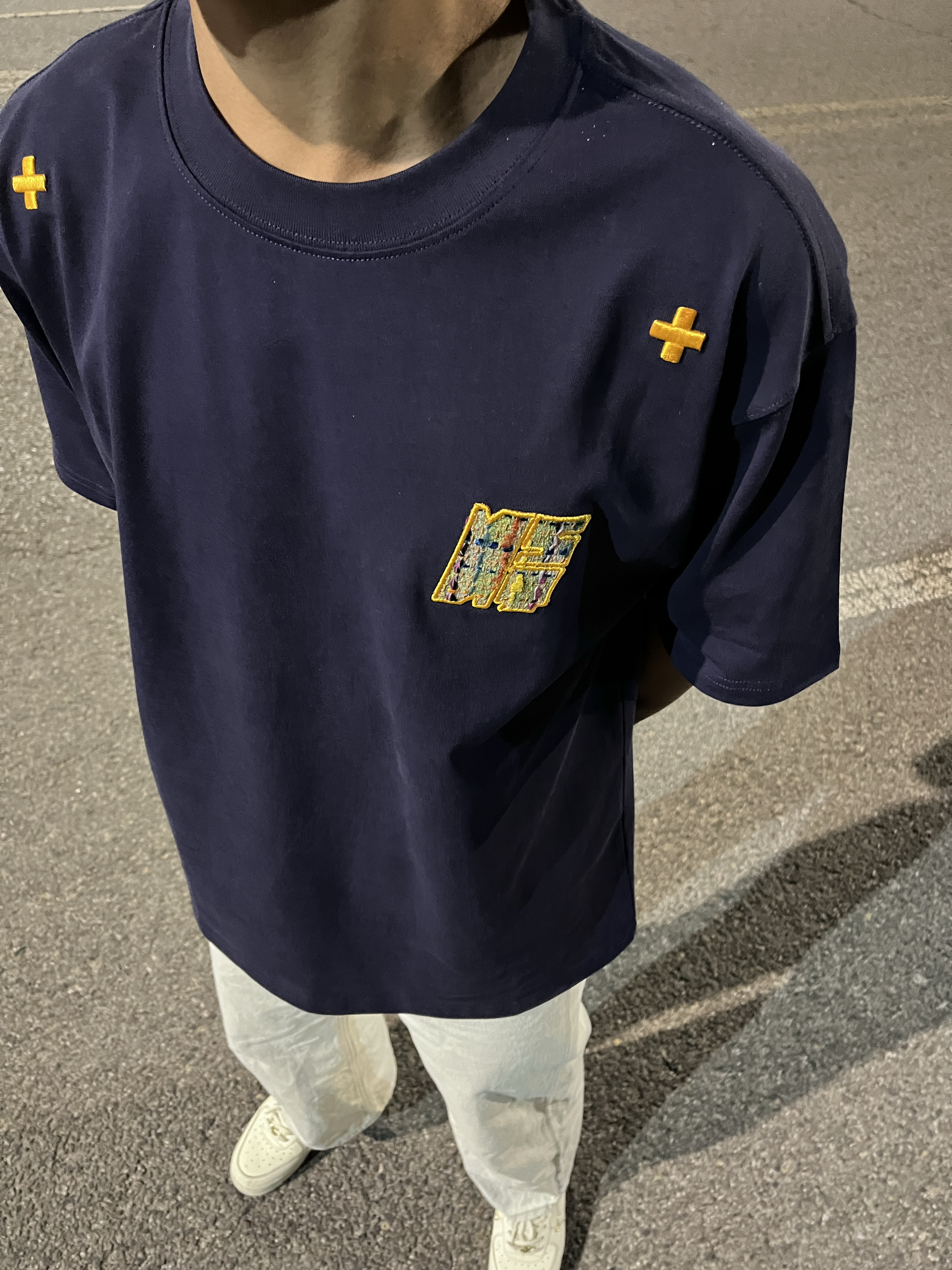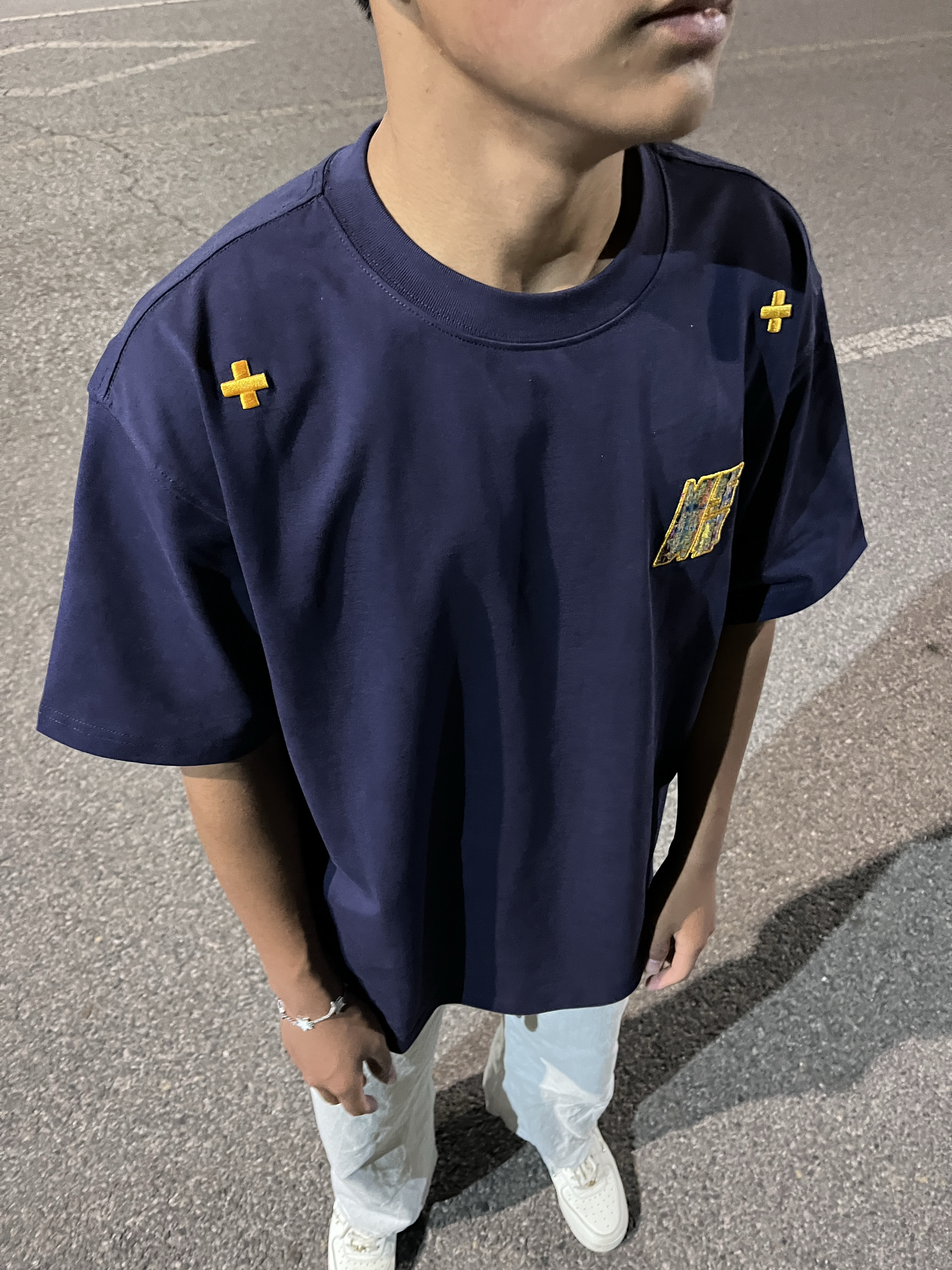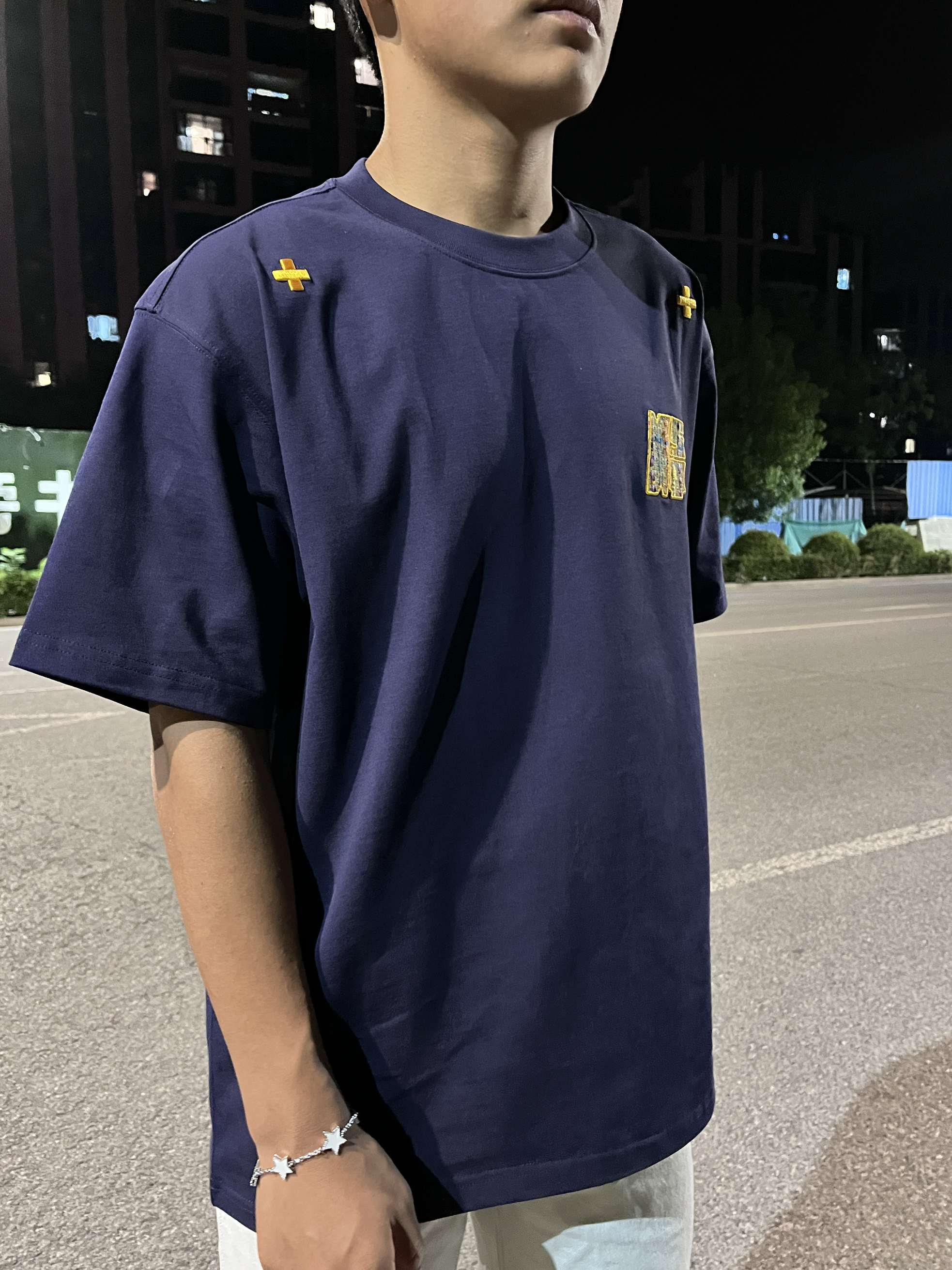 这件民族感刺绣贴布真无敌 胸前的刺绣做工很好看! 贴布刺绣小细节,短袖整体设计风格美式复古 而且这个logo跟藏青色真的好搭! 本人是黑皮穿的藏青真的很显白 黑皮可以试试藏青色的 我这个穿的是L码,刚好到屁股上一点 整体也比较宽松 下面随便搭一条黑色的牛仔裤,休闲裤都可以