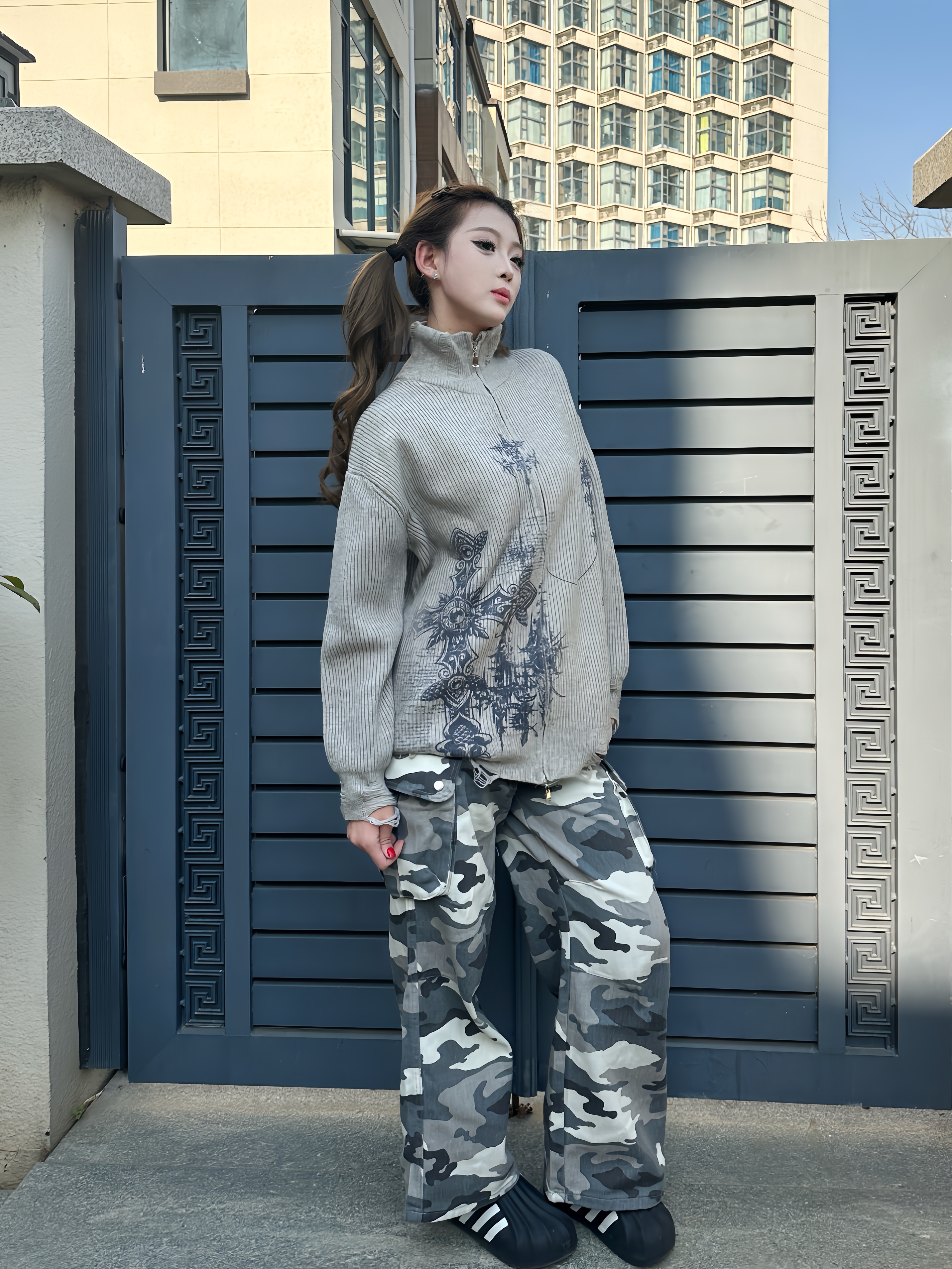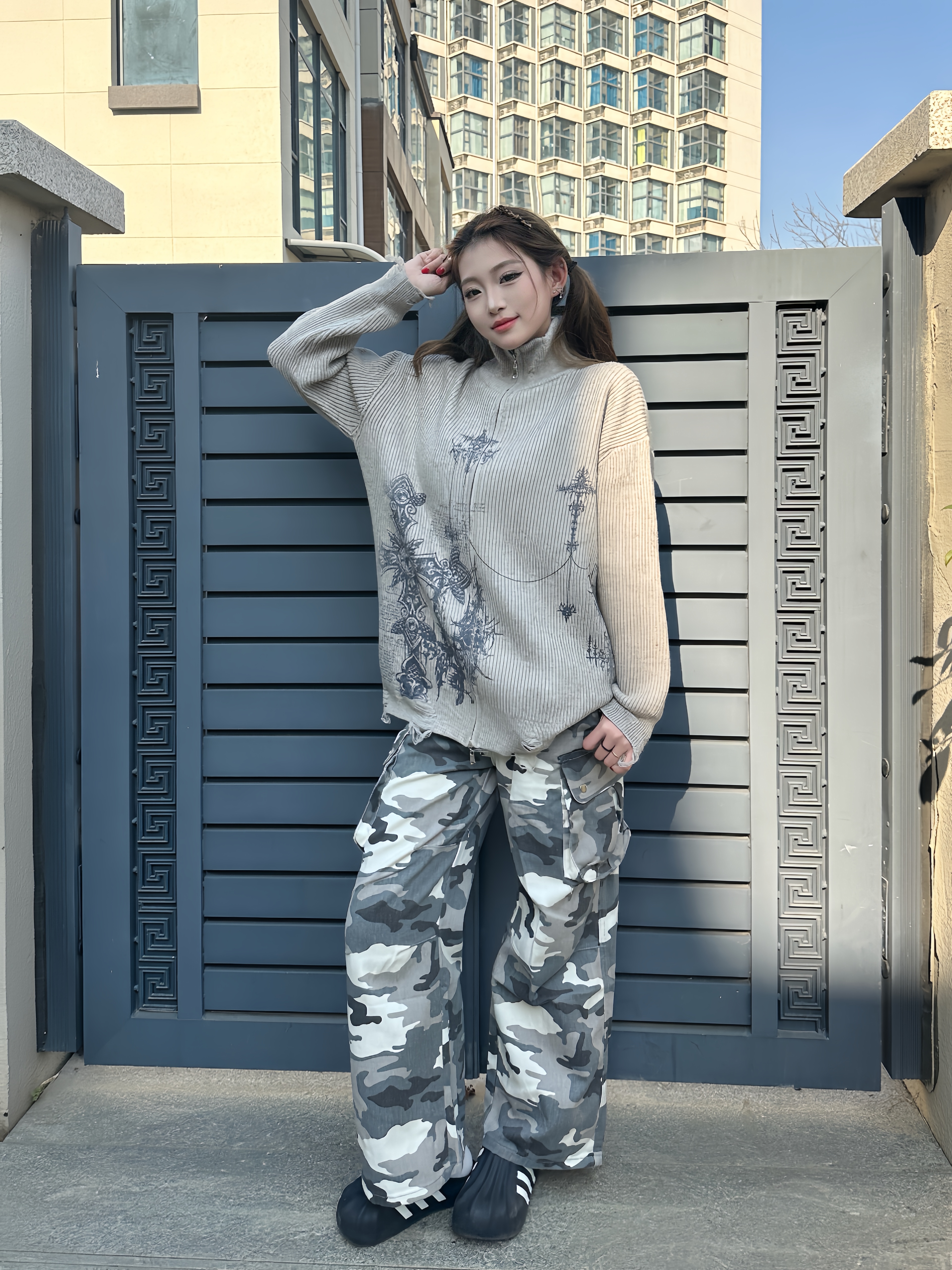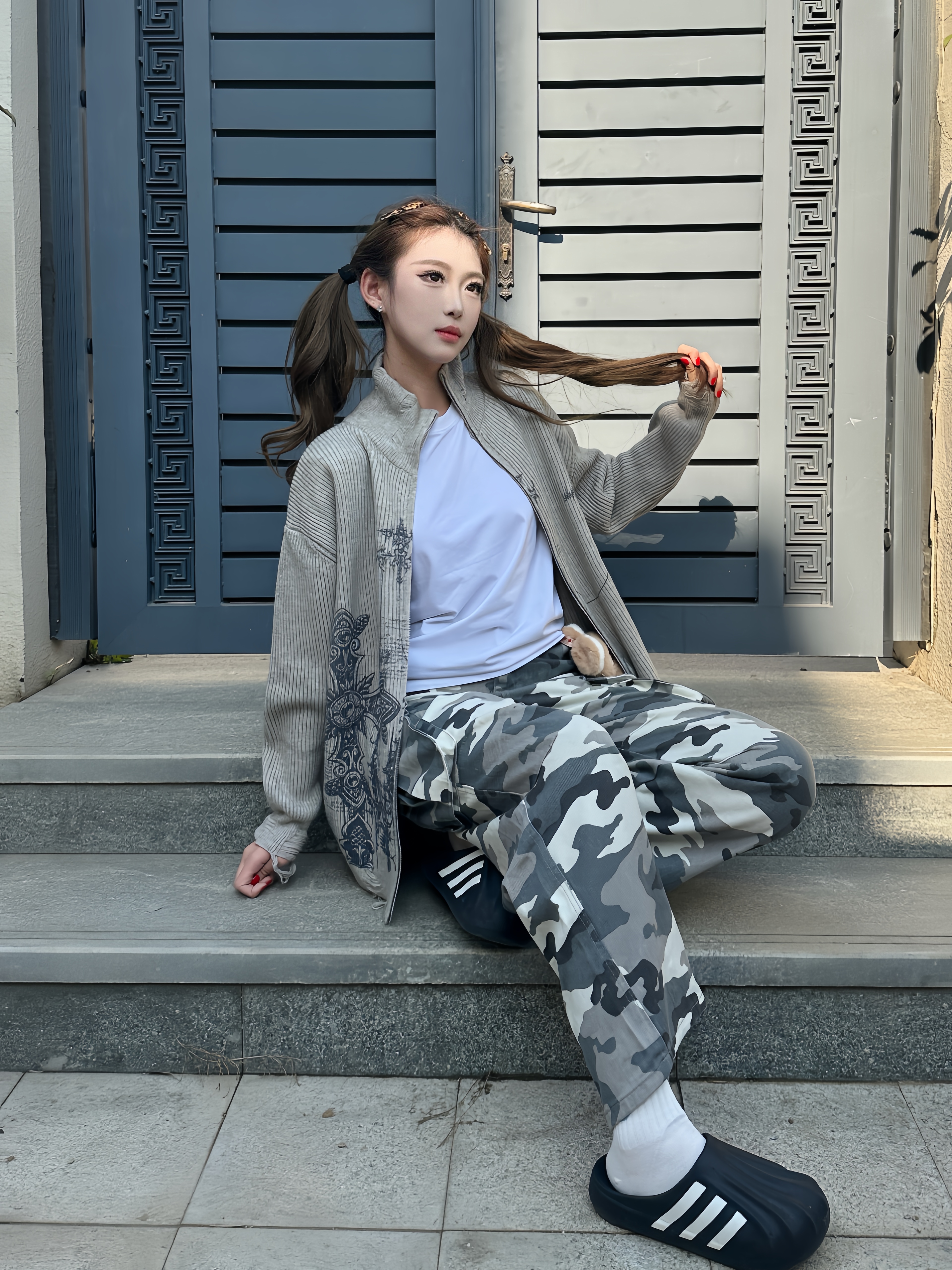 这件灰色针织开衫😘 太有设计感了吧 😍 竖坑条的纹理自带松弛感 🥰 搭配十字架印花和破洞流苏设计😝 又甜又酷~宽松的版型 🥹 穿着十分舒服😁