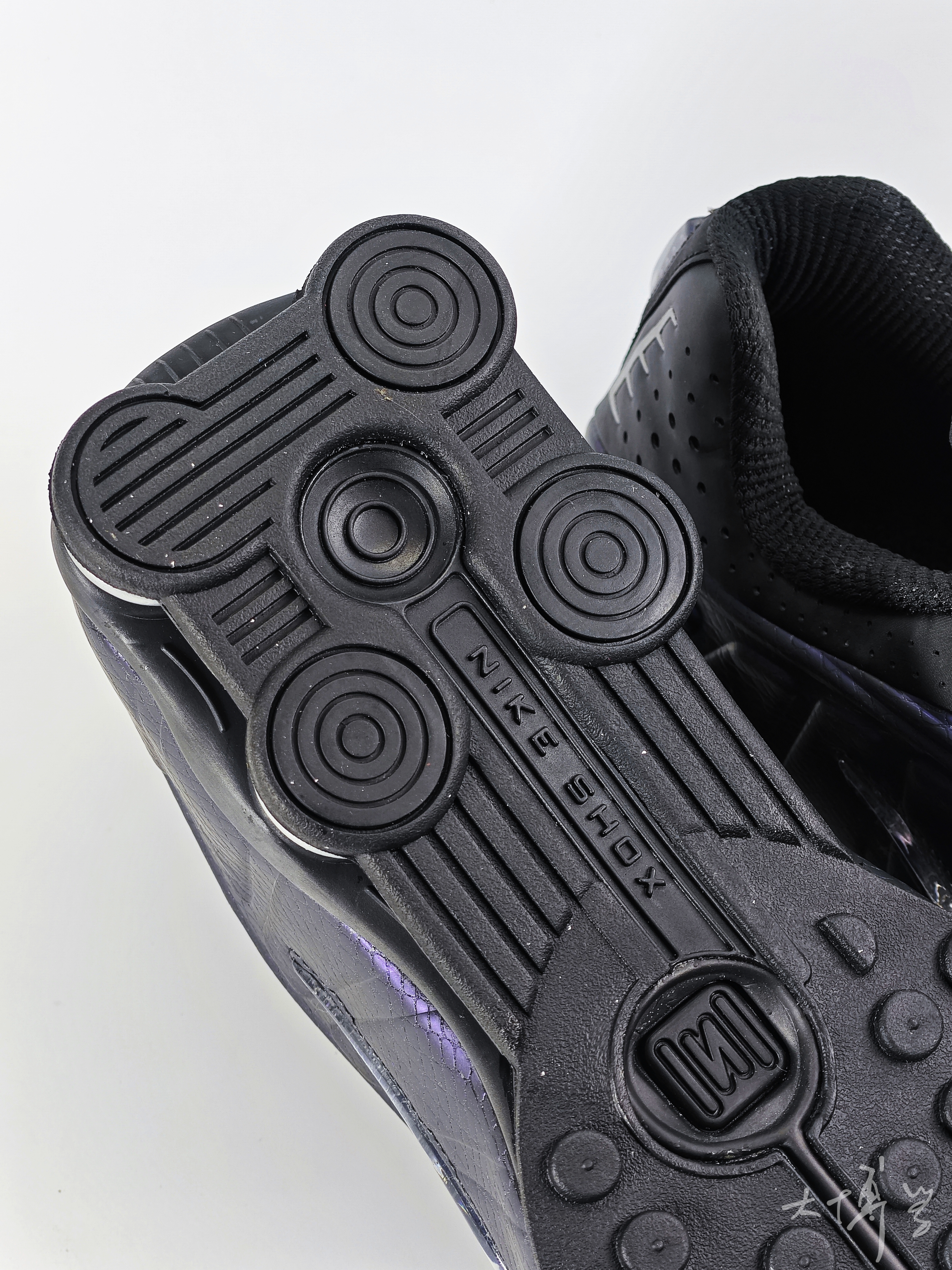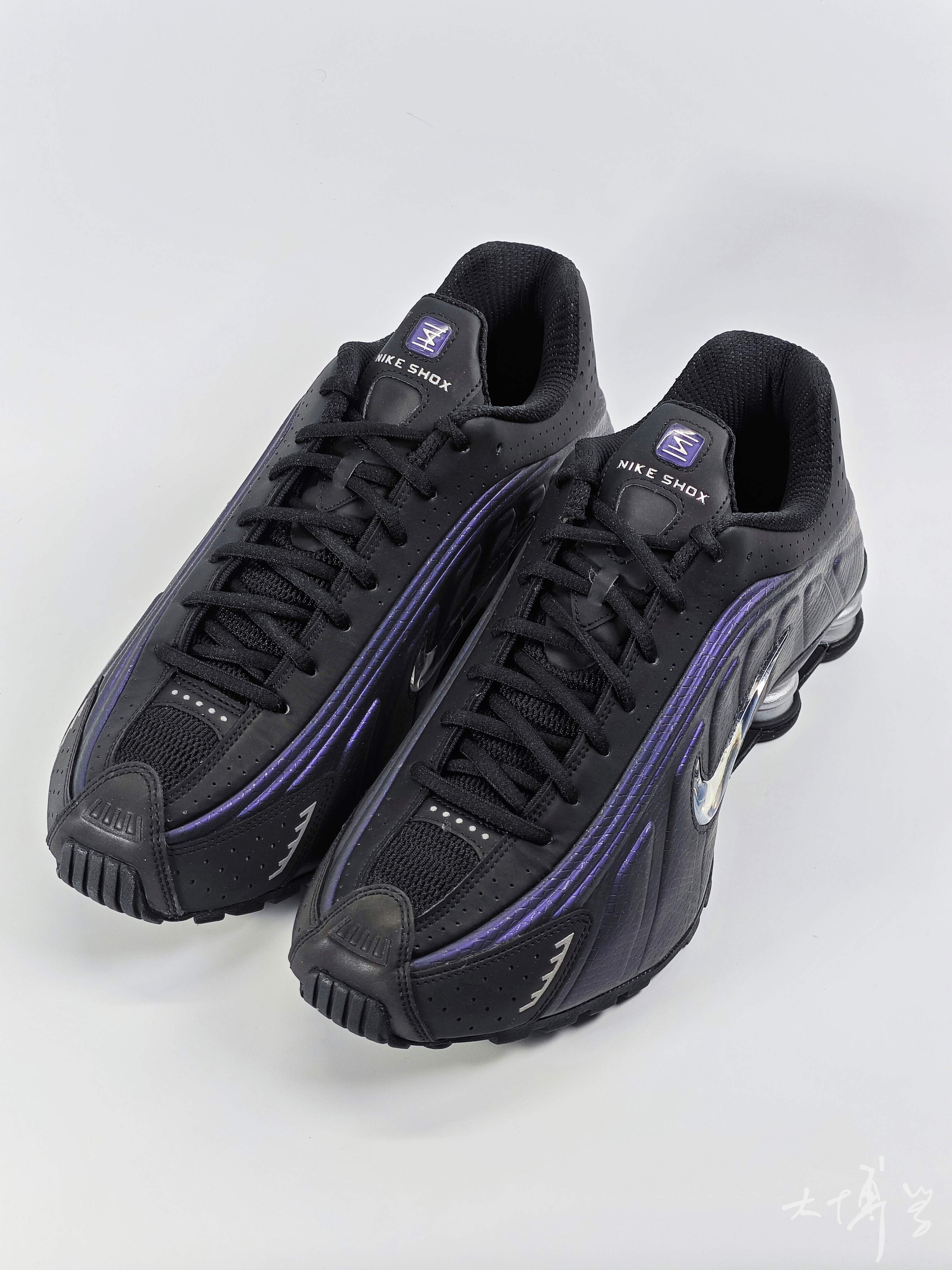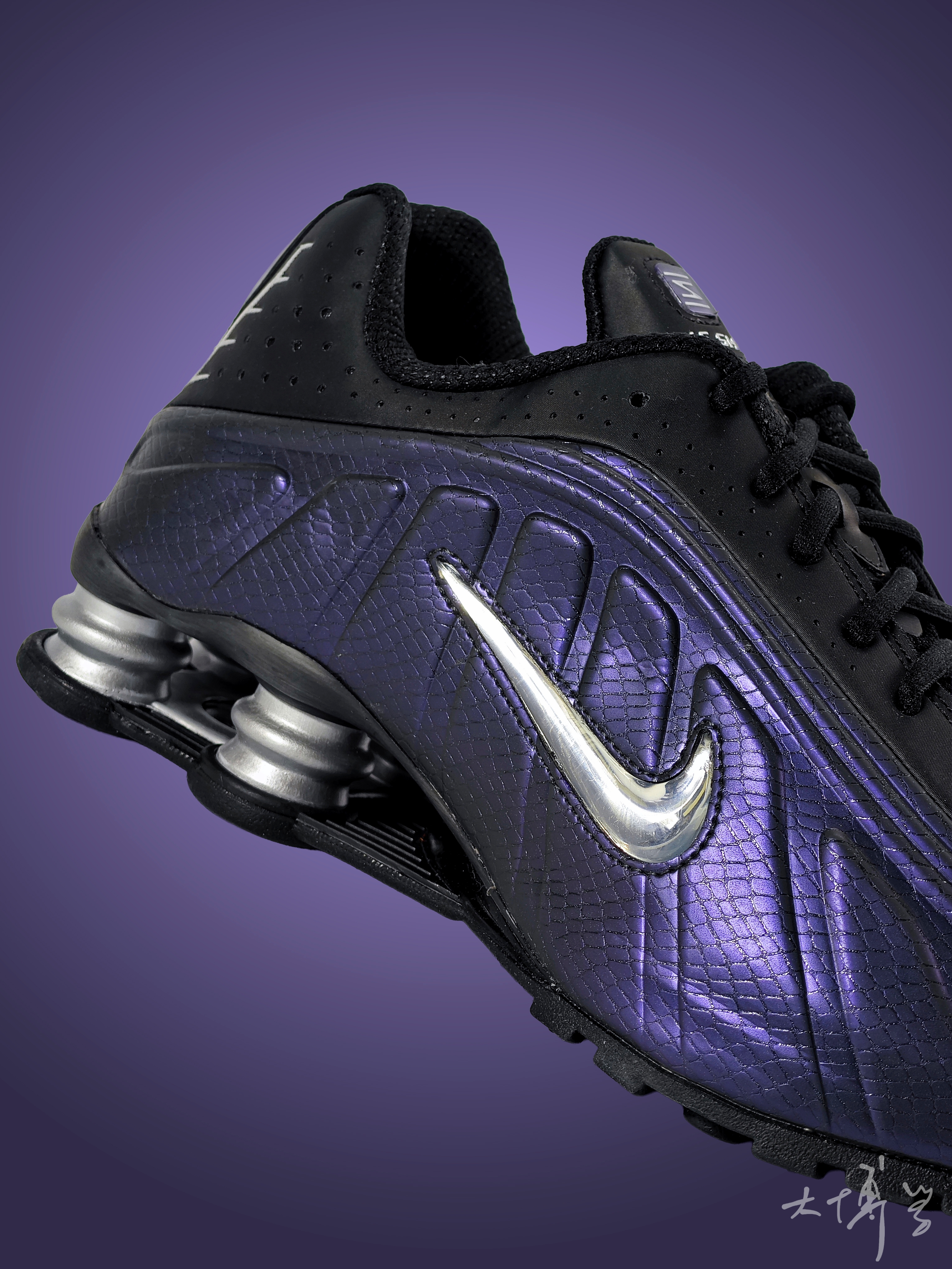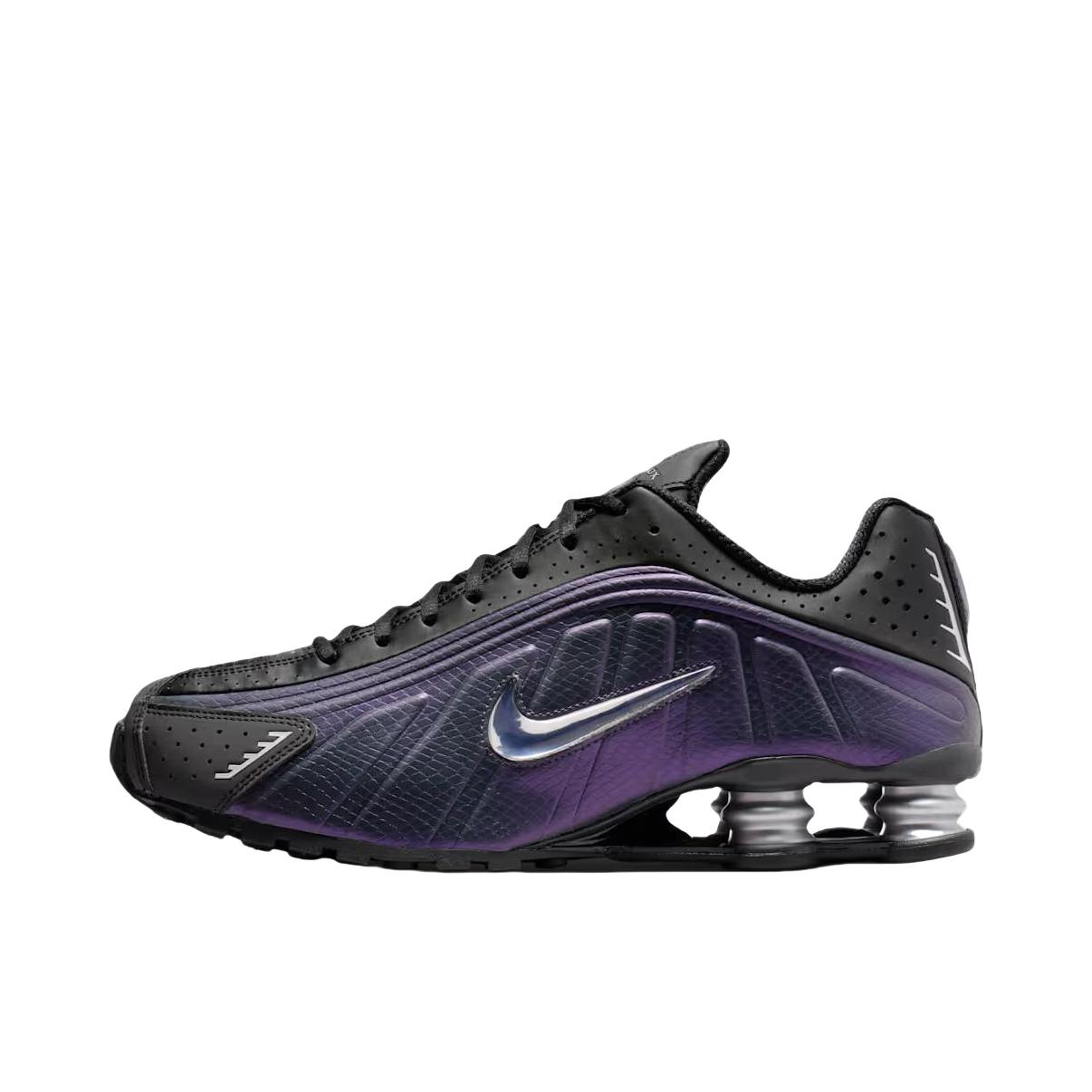 一款shox运动鞋 鞋身以黑色为主,搭配紫色装饰 后跟处有标志性的Shox气柱 侧边银色Swoosh摸起来像个柔软的气泡 设计风格兼具复古与科技感