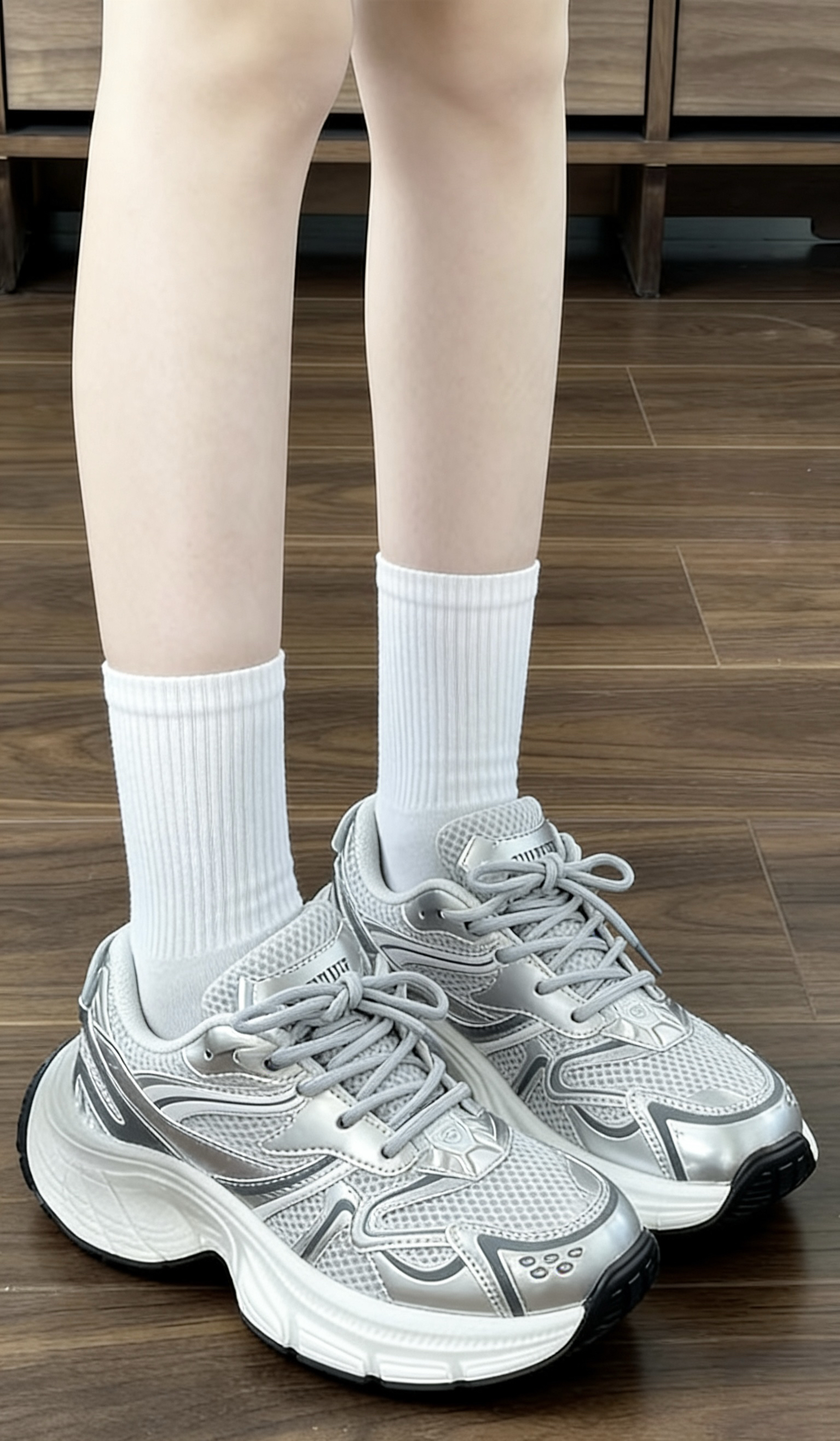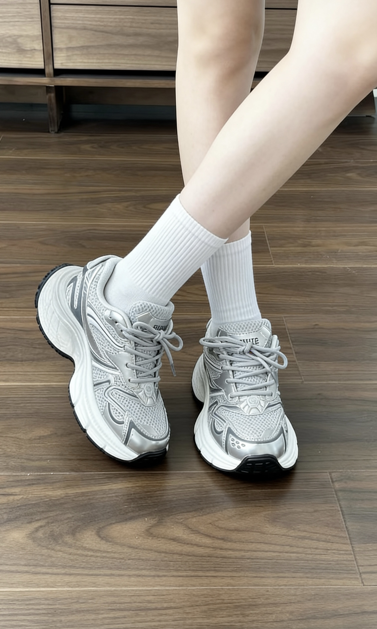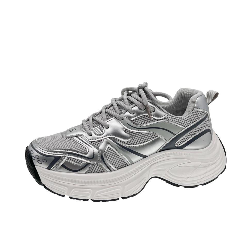 5cm平稳厚底实现自然增高,秒拉长腿部比例,小个子也能轻松拥有大长腿视觉效果;全鞋面高支高密透气网布搭配牛奶丝包边,360度环绕透气,春夏穿着不闷脚、不臭脚,长时间行走依旧干爽。中底采用高弹性发泡材质,踩上秒回弹,搭配防滑橡胶大底,纹路清晰抓地力强,湿滑路面也能稳稳前行;轻量化鞋身搭配乳胶速干鞋垫,吸湿排汗不跑位,走路逛街一整天也无负重感,软而不塌的脚感堪比平底鞋。 锡纸银的百搭属性适配多元场景...
