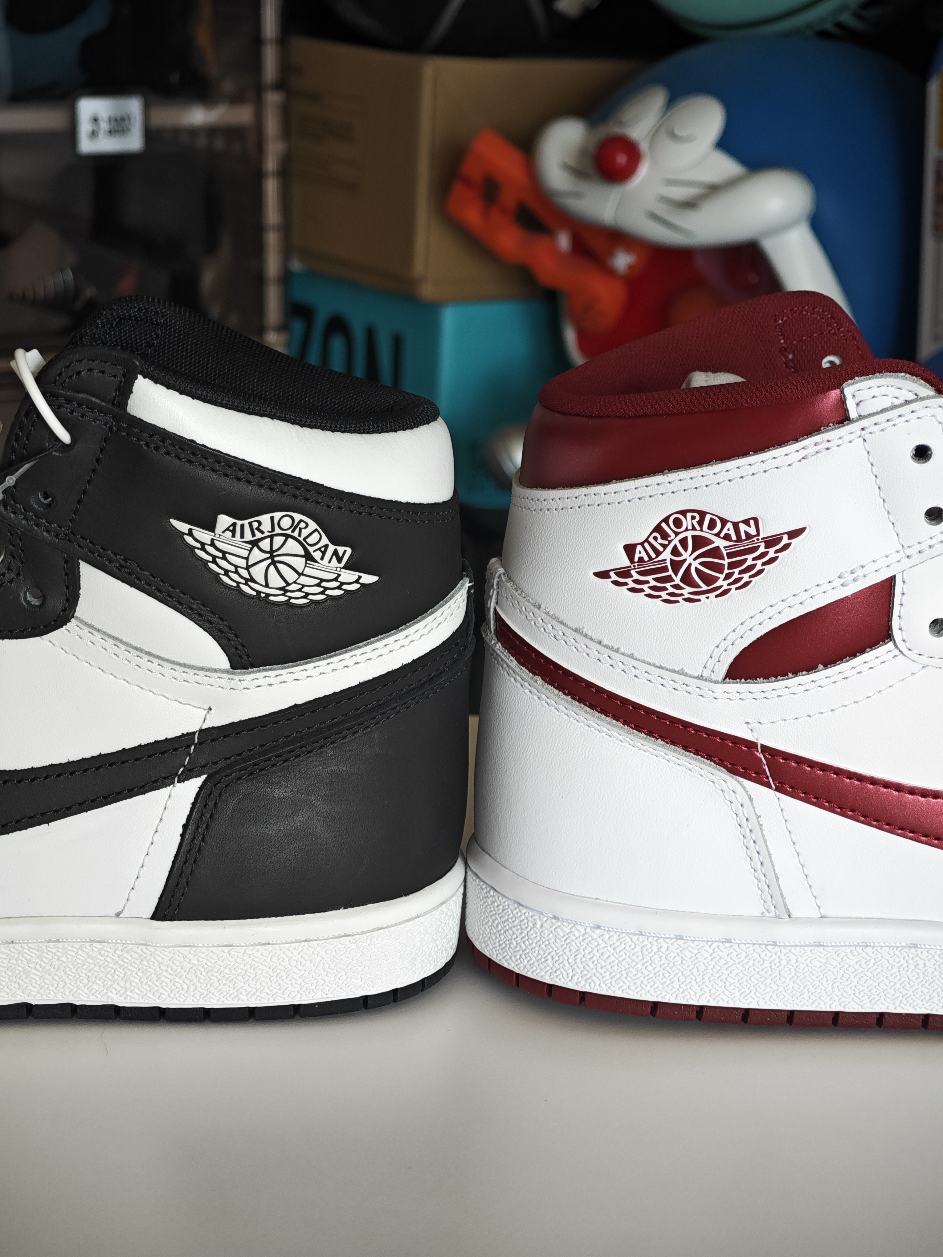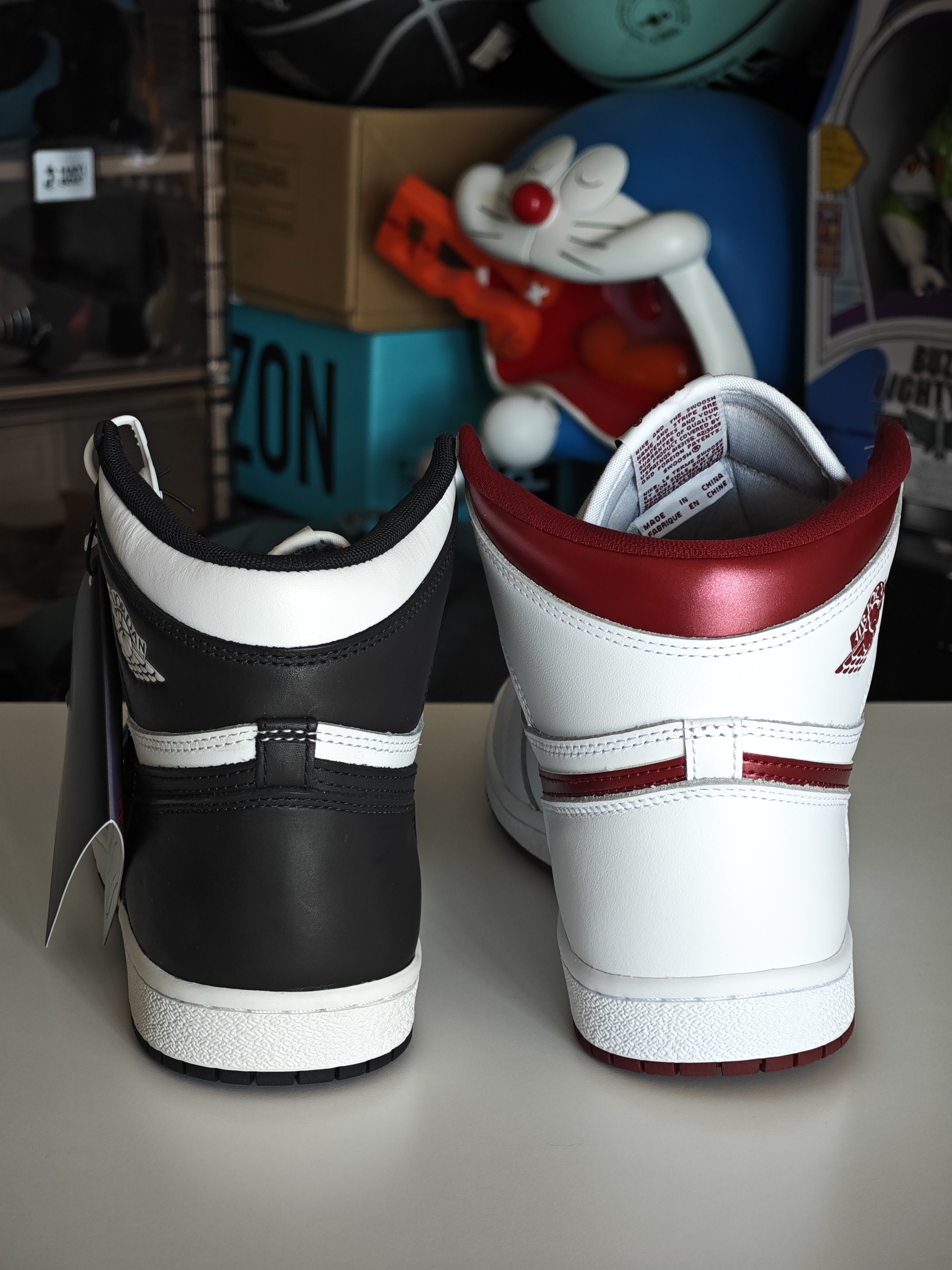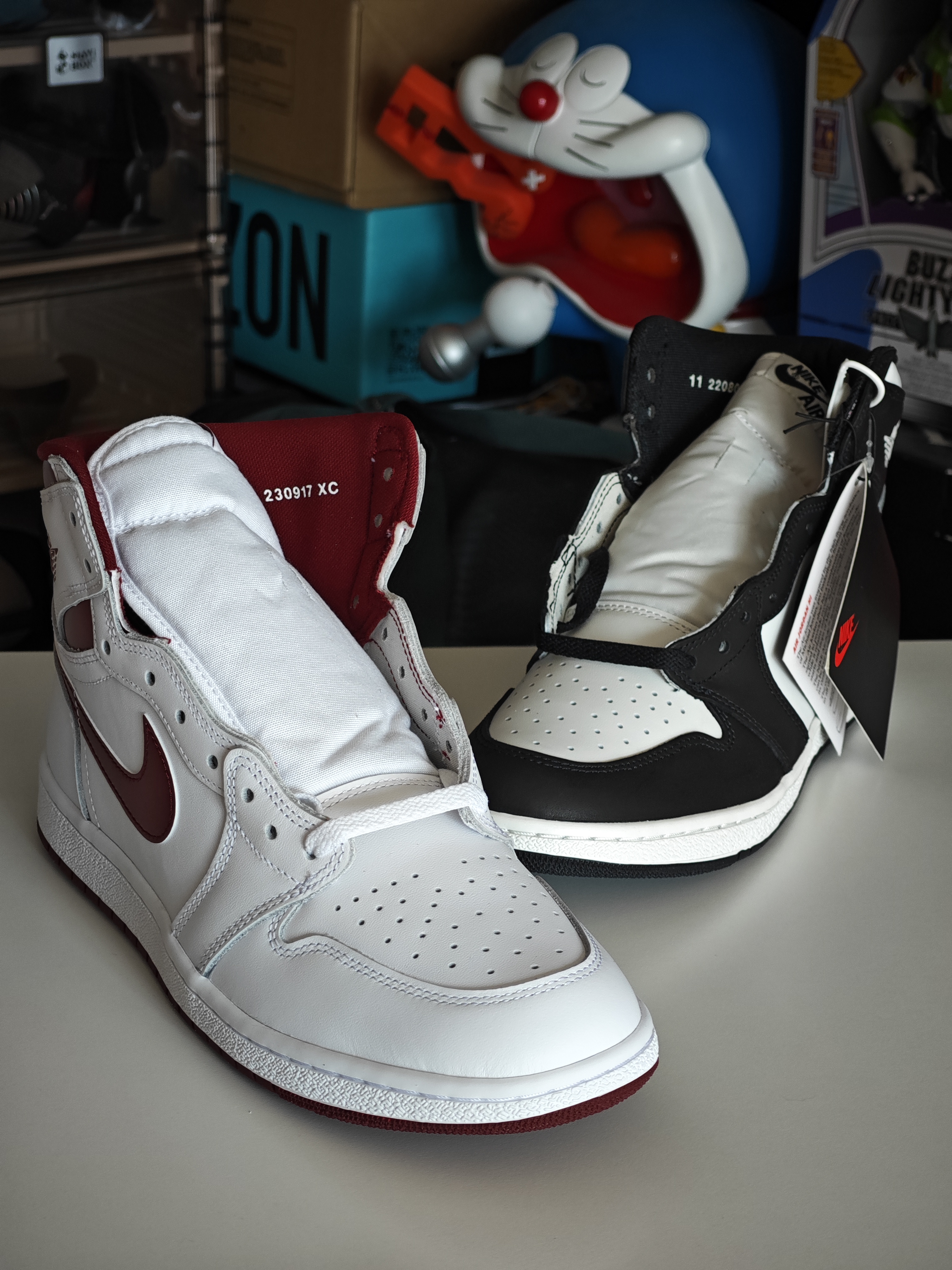 两双高帮AJ 1,而且都是85鞋型 一双是黑白熊猫 另一双是白红配色 两款后跟的弧度差太多 细看鞋头的尖锐程度也有区别 黑白的皮质更厚实 白红款的红色部分带有闪粉元素 经典的方形吊牌和鞋内尺码数字都在 鞋舌我更喜欢黑白款的质感