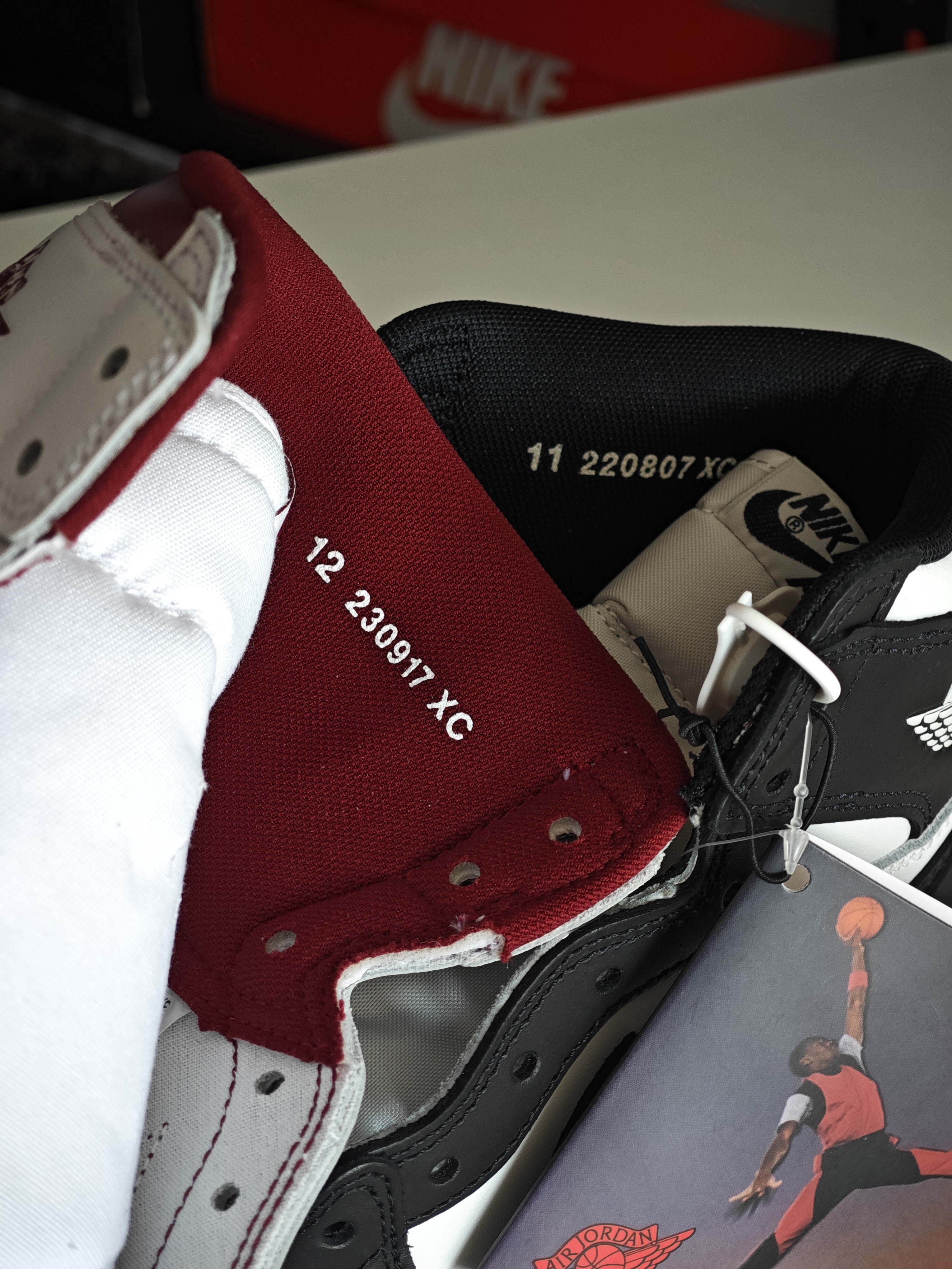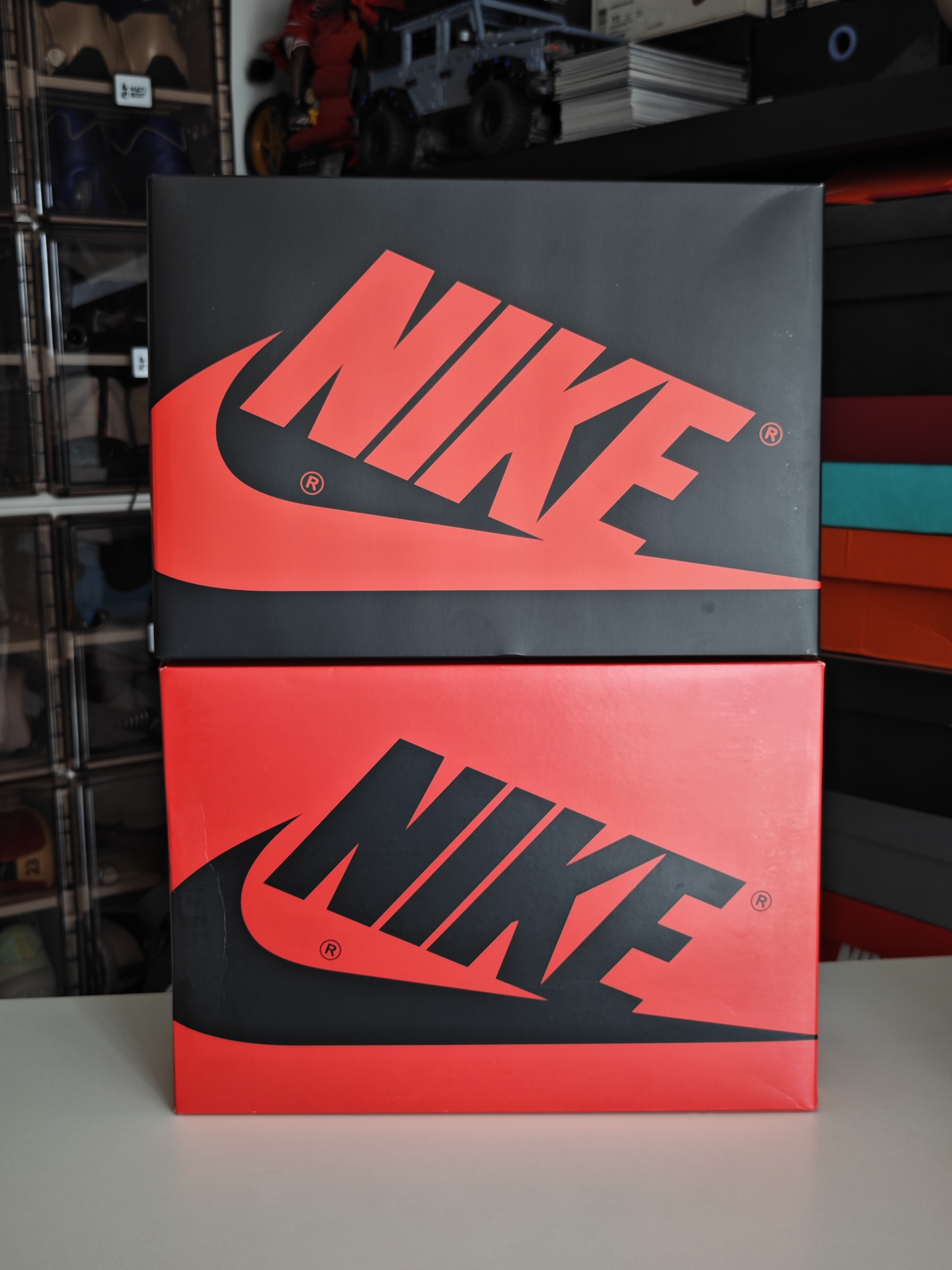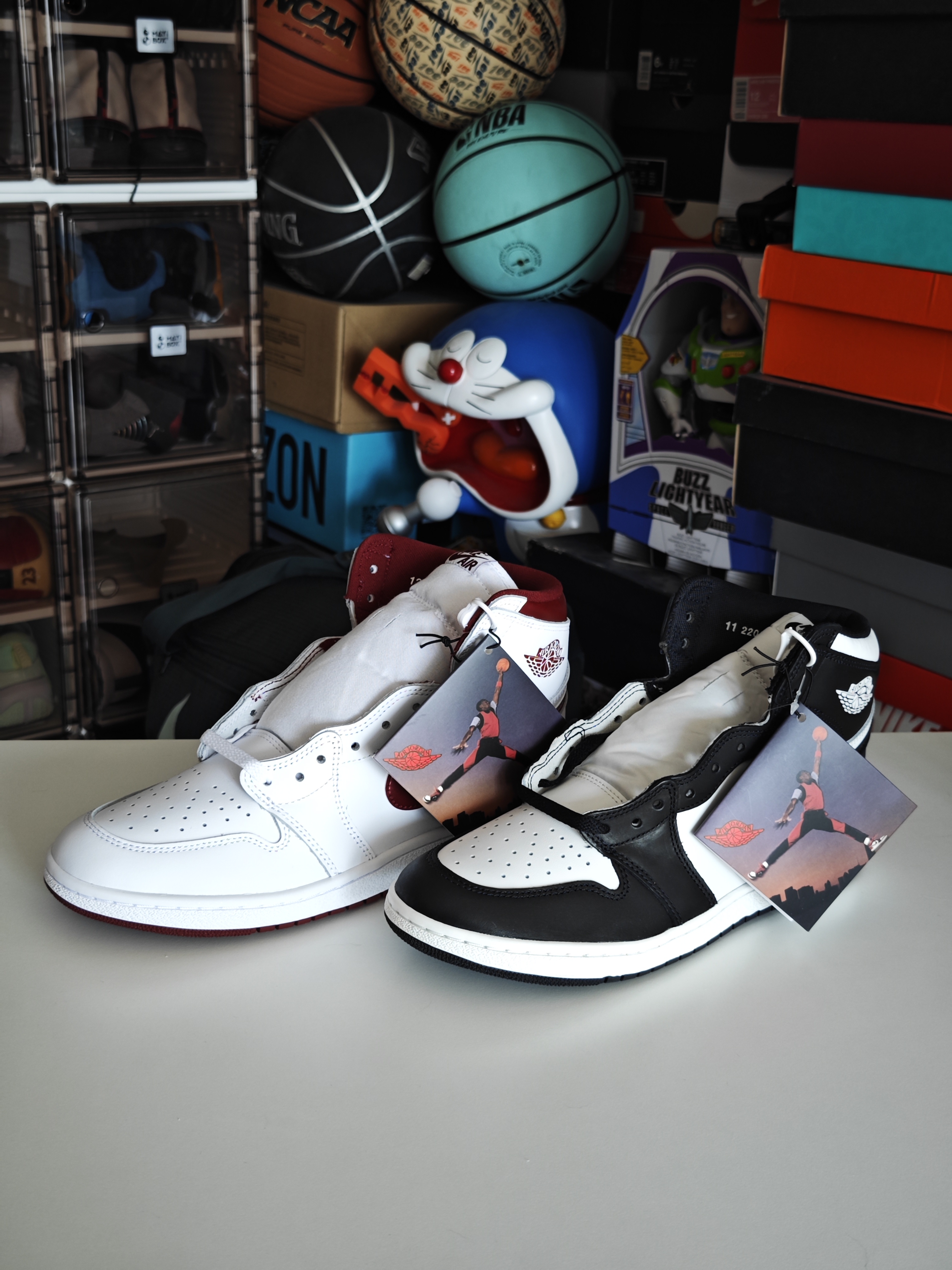 两双高帮AJ 1,而且都是85鞋型 一双是黑白熊猫 另一双是白红配色 两款后跟的弧度差太多 细看鞋头的尖锐程度也有区别 黑白的皮质更厚实 白红款的红色部分带有闪粉元素 经典的方形吊牌和鞋内尺码数字都在 鞋舌我更喜欢黑白款的质感