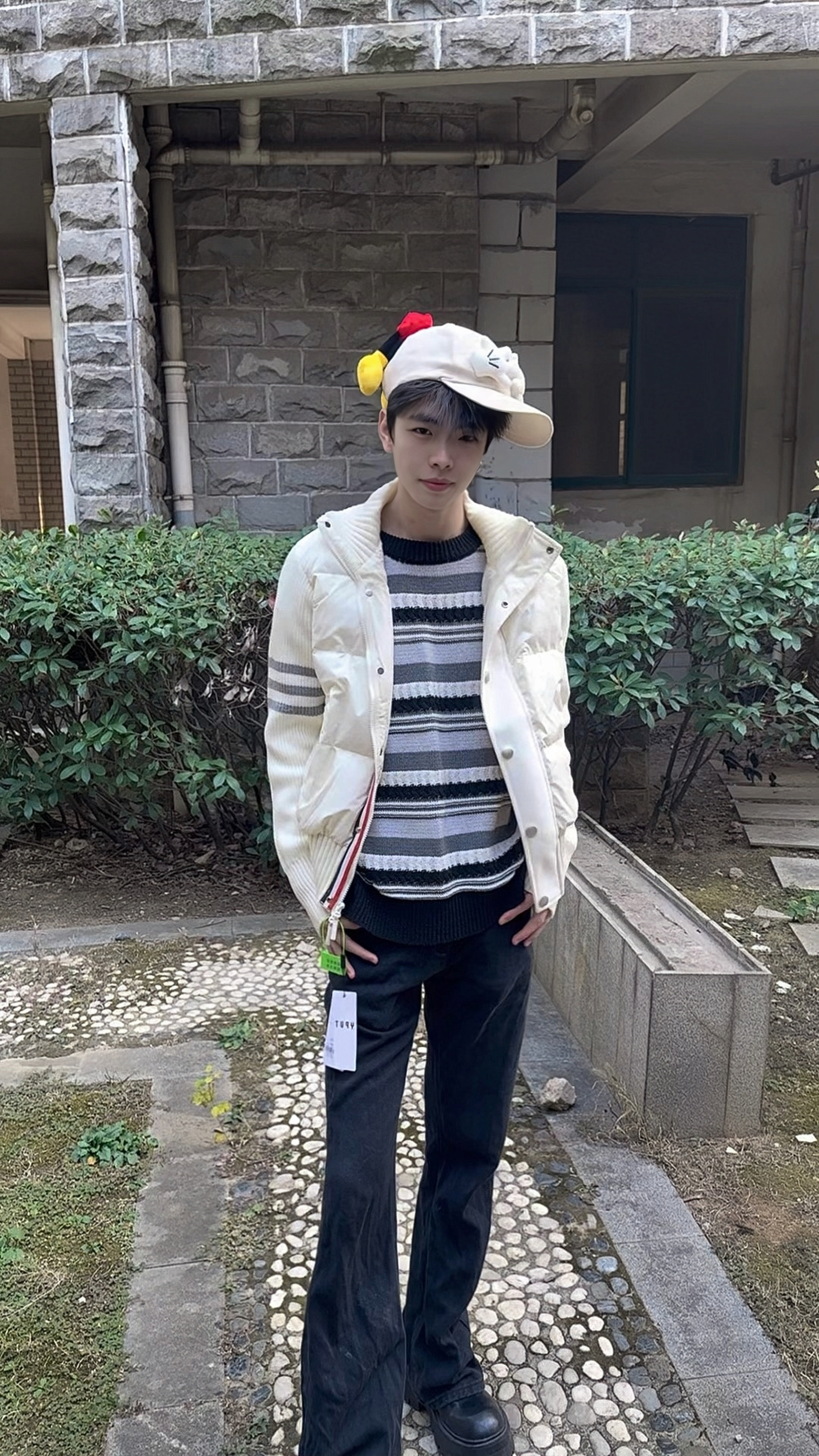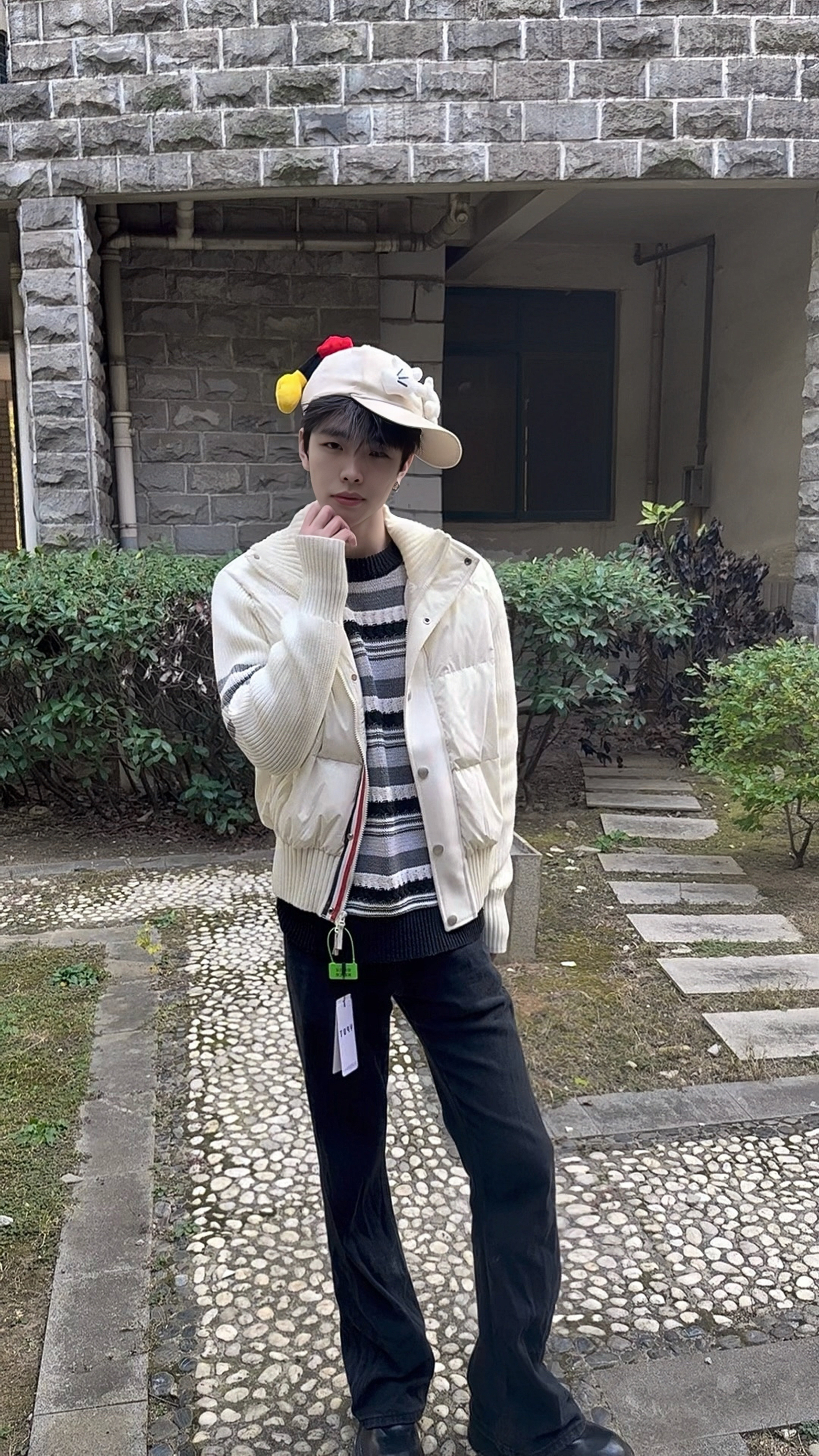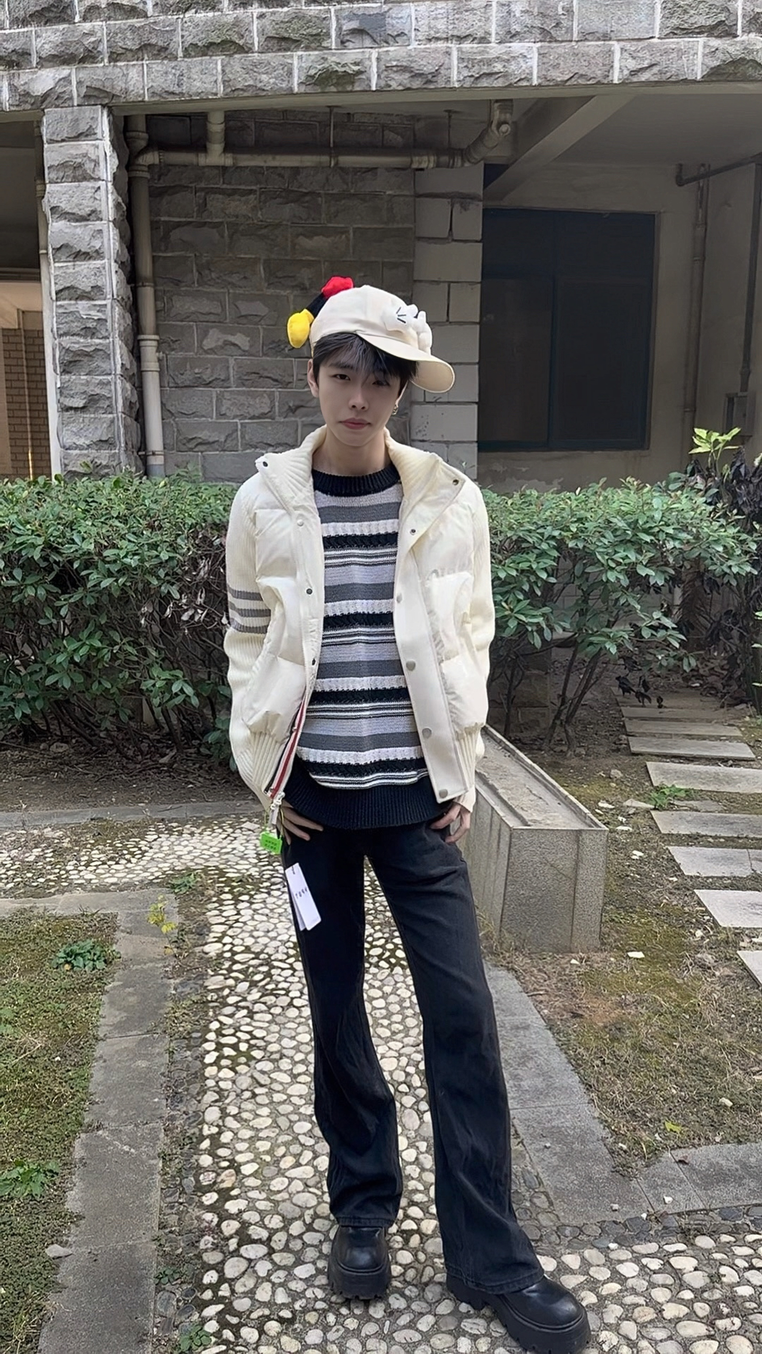 这套穿搭用奶白色拼接外套打造出清新的冬日温柔感,细节搭配又让整体不失少年的灵动俏皮。 奶白色的拼接外套是整套的亮点,针织与棉服的拼接设计打破了单一材质的沉闷,柔和的奶白色调自带干净的少年气质,宽松版型还能轻松叠穿内搭;内搭的黑白条纹针织衫形成经典的明暗对比,让穿搭层次更突出,也中和了奶白外套的甜腻感。下装的黑色微喇裤延续简约配色,利落的剪裁修饰腿型,和上装的宽松感形成视觉平衡,再配上童趣的卡通帽...
