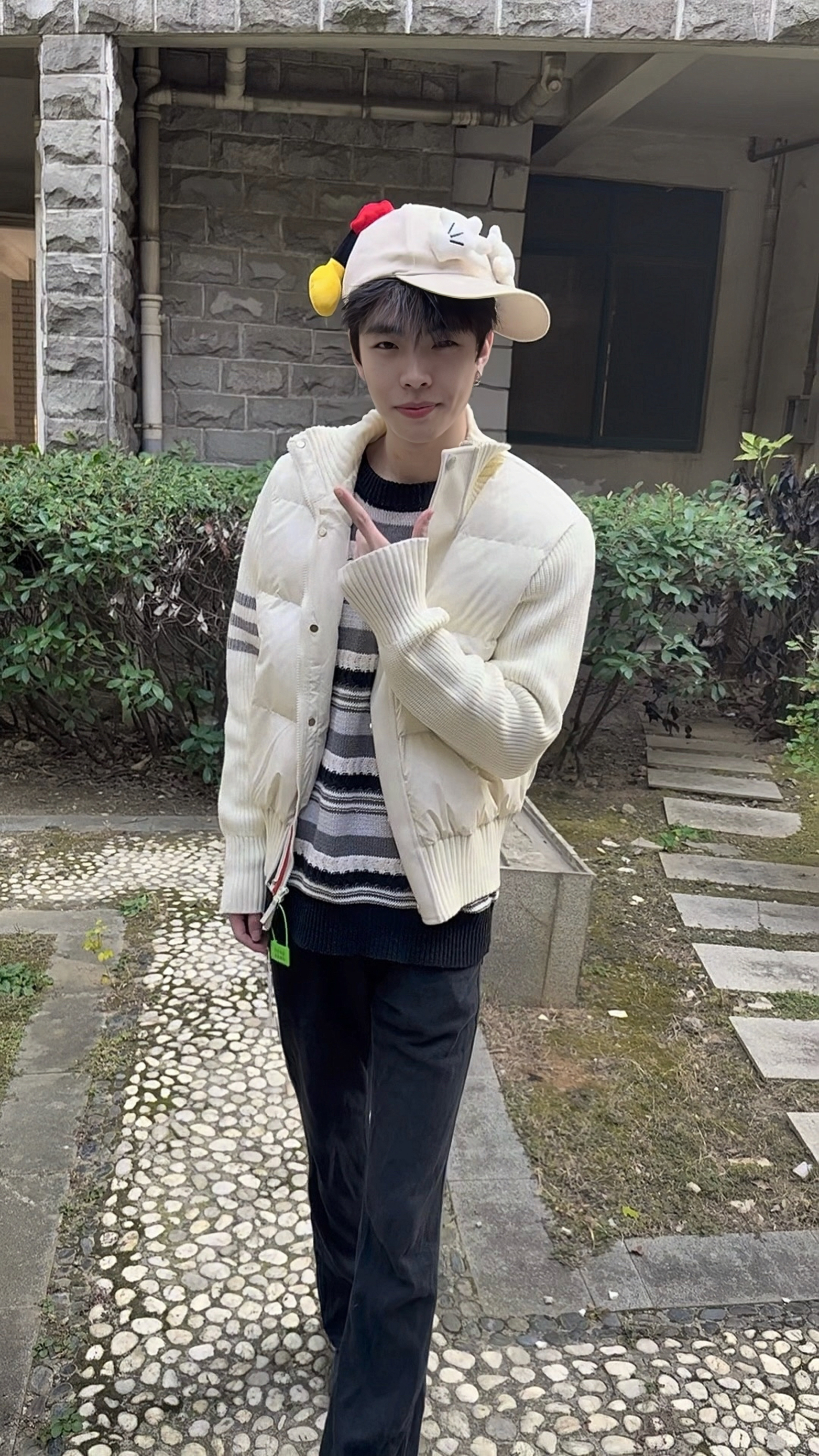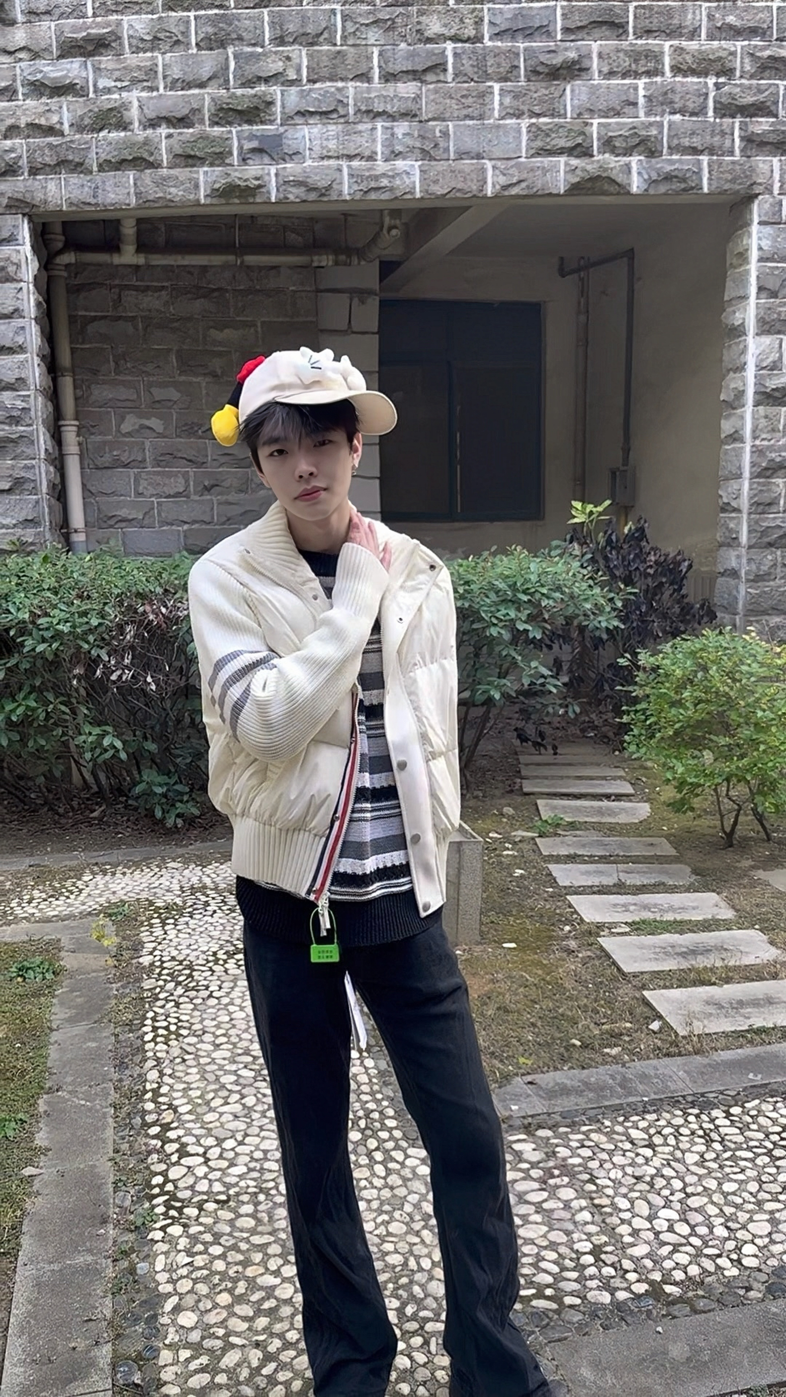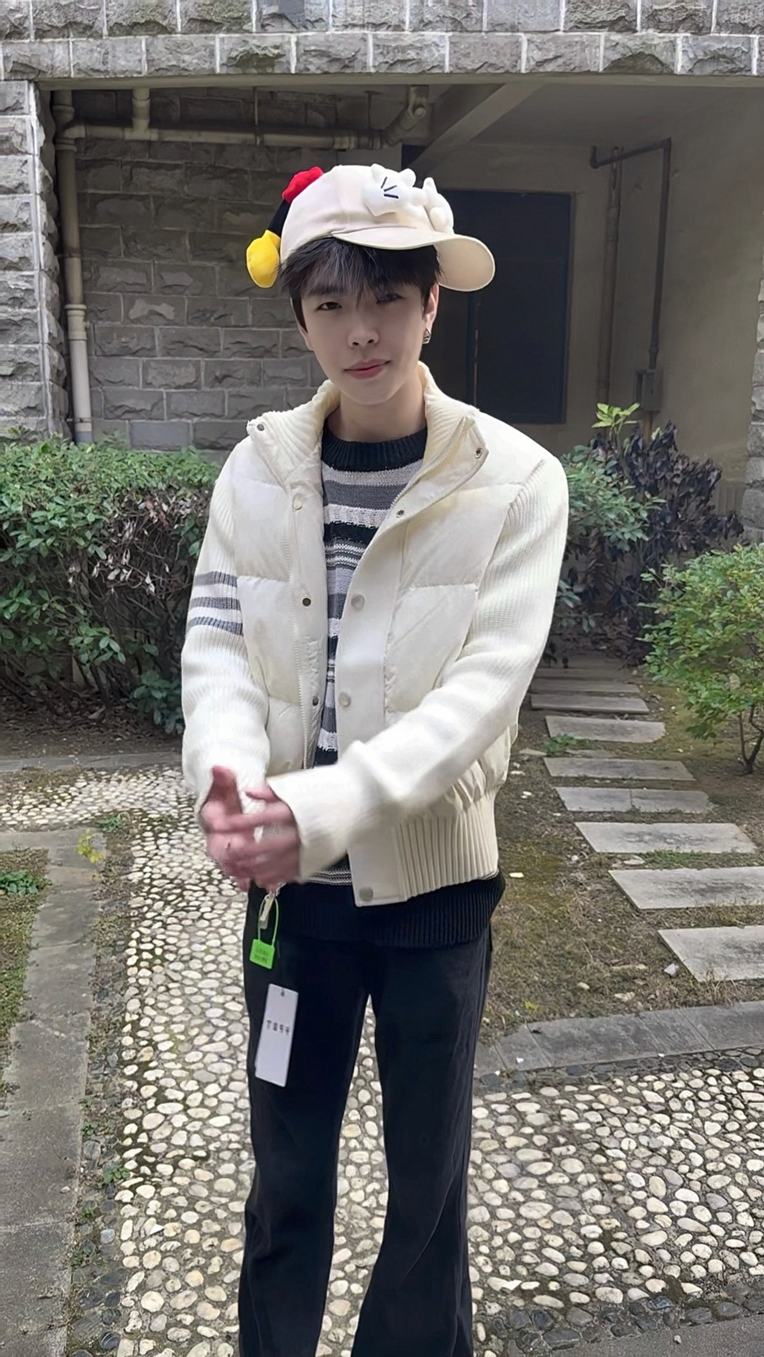 这套穿搭用奶白色拼接外套打造出清新的冬日温柔感,细节搭配又让整体不失少年的灵动俏皮。 奶白色的拼接外套是整套的亮点,针织与棉服的拼接设计打破了单一材质的沉闷,柔和的奶白色调自带干净的少年气质,宽松版型还能轻松叠穿内搭;内搭的黑白条纹针织衫形成经典的明暗对比,让穿搭层次更突出,也中和了奶白外套的甜腻感。下装的黑色微喇裤延续简约配色,利落的剪裁修饰腿型,和上装的宽松感形成视觉平衡,再配上童趣的卡通帽...