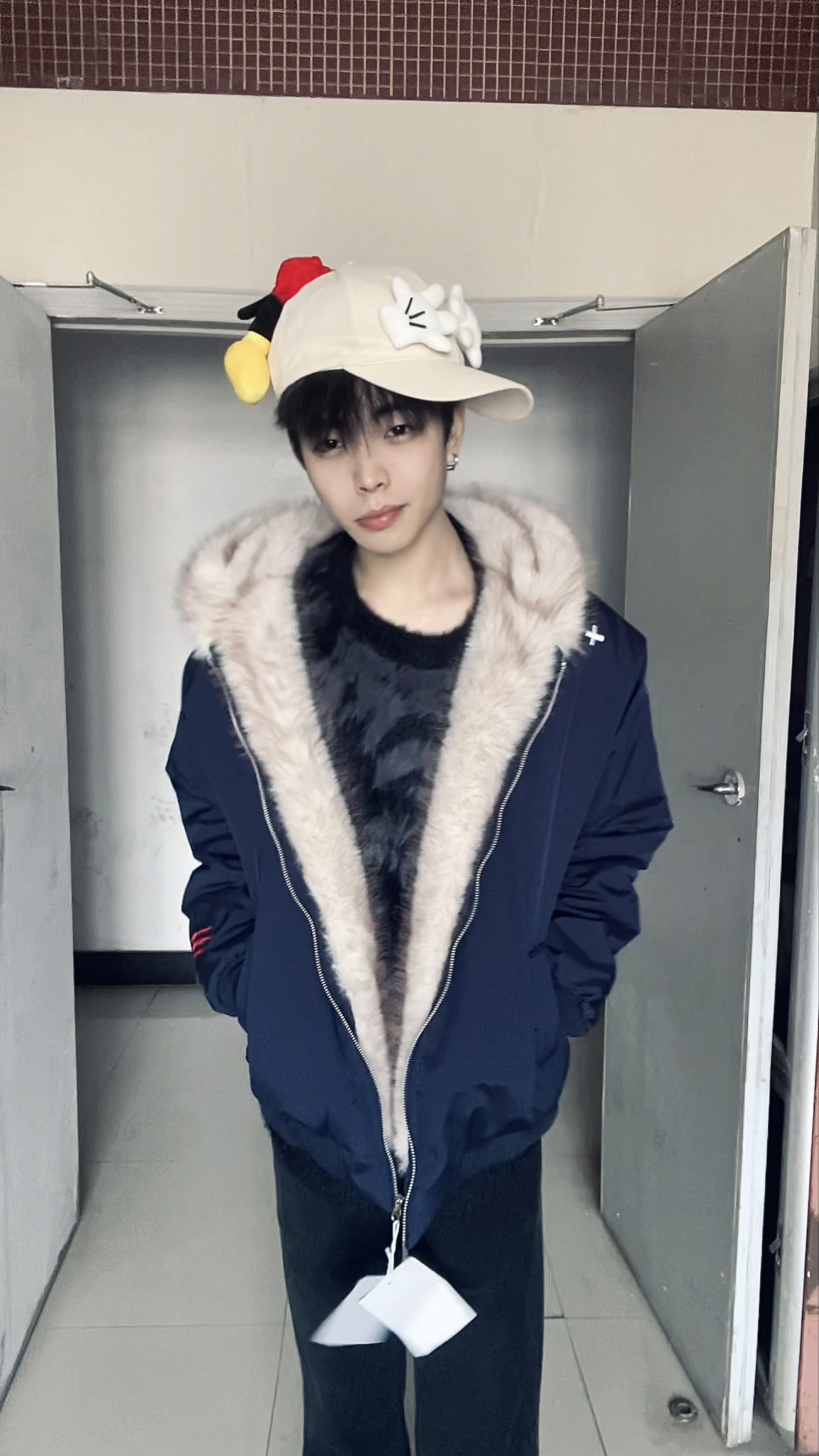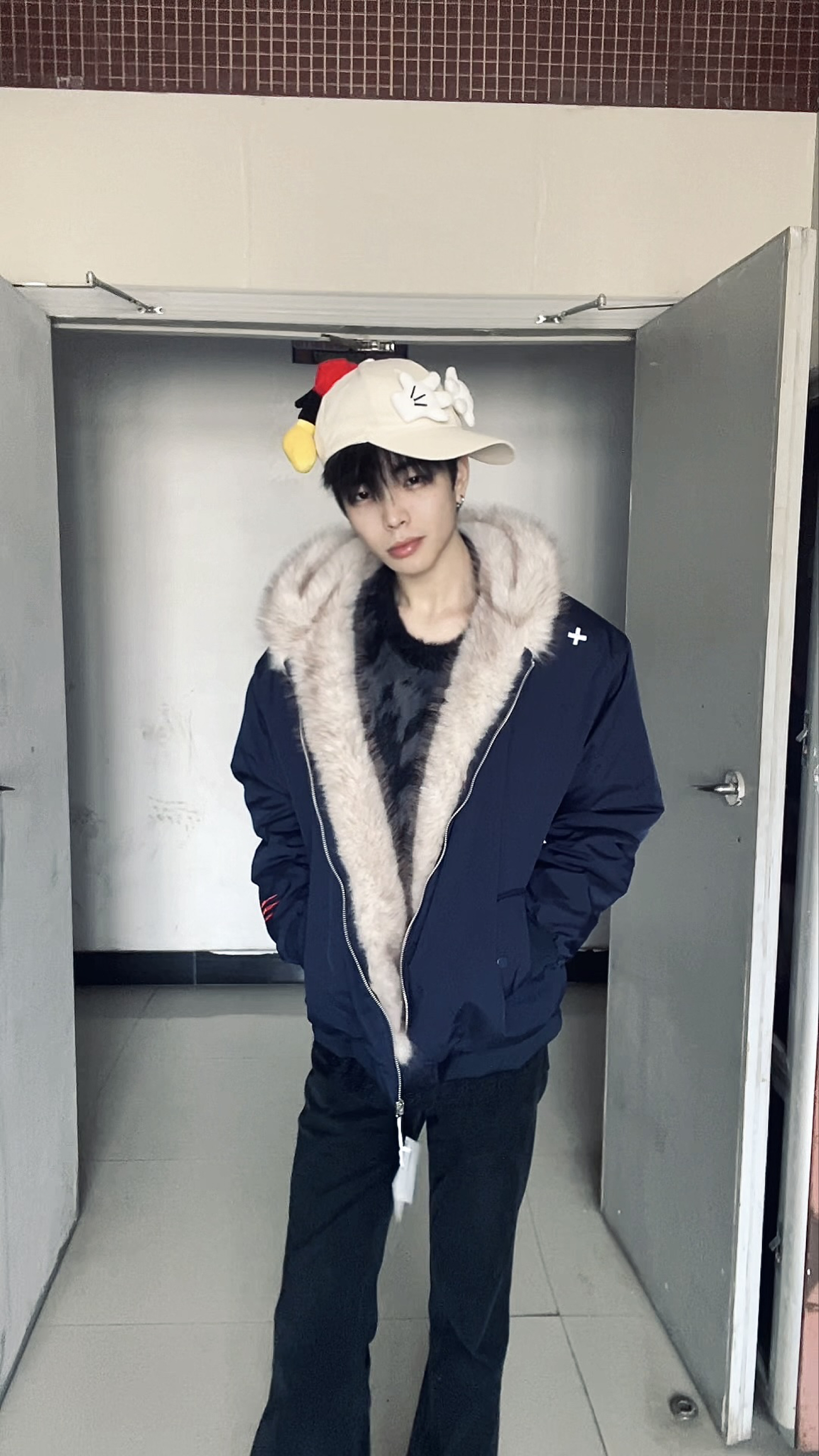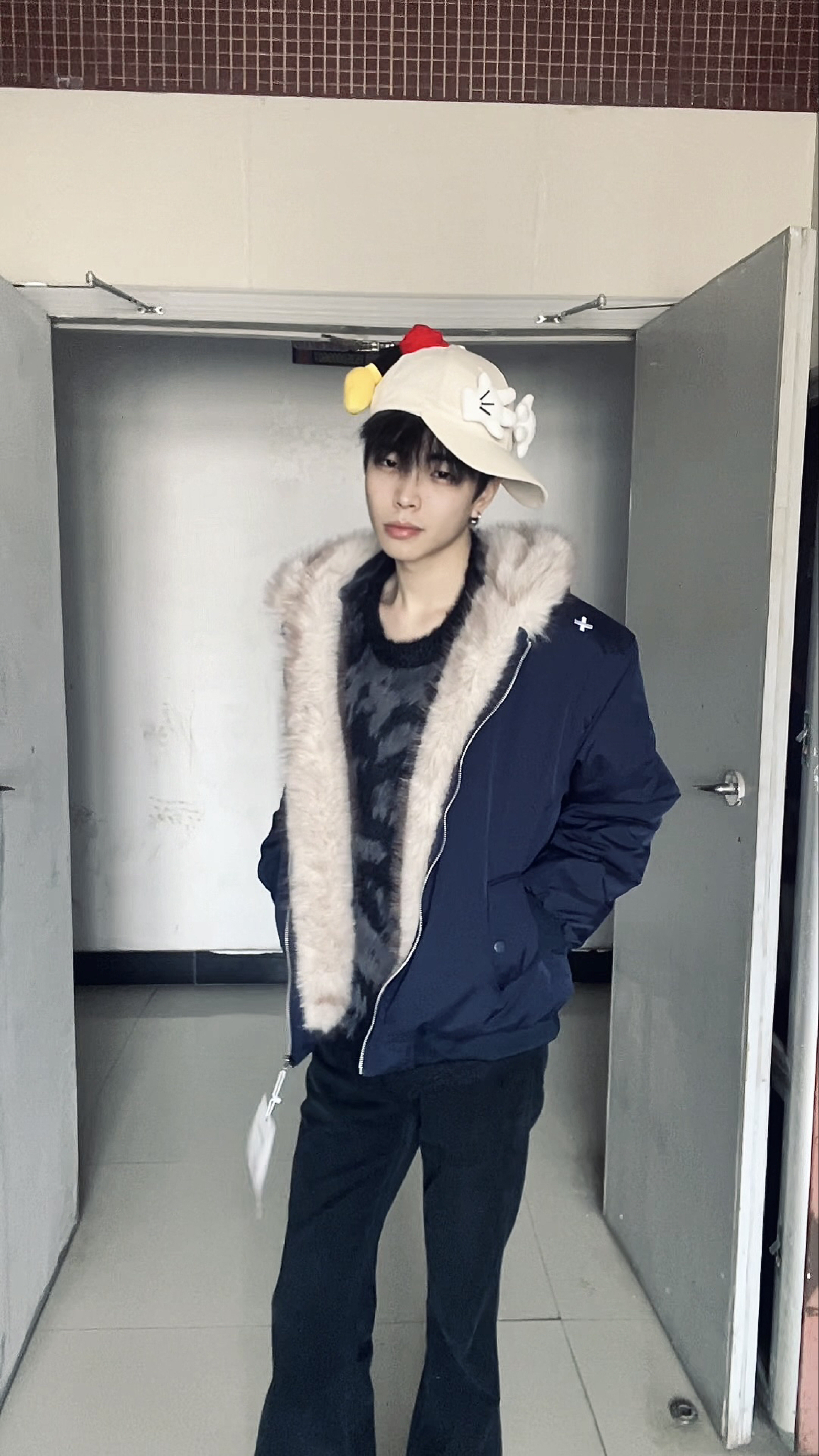 这套穿搭以藏青毛绒领外套为核心,将沉稳的复古感与少年的慵懒贵气融合得恰到好处,细节搭配更是点睛之笔。 藏青色的毛绒领外套是整套的主角,深邃的藏青自带沉稳质感,大面积的浅米色毛绒领则柔化了冷硬的色调,宽松版型既能包容内搭,又营造出随性的慵懒感;内搭的黑色毛绒上衣,与外套的毛绒领形成材质呼应,同色系的搭配让层次更和谐,也进一步强化了冬日的温暖氛围。下装的黑色长裤延续简约配色,利落的剪裁平衡了上装的蓬...