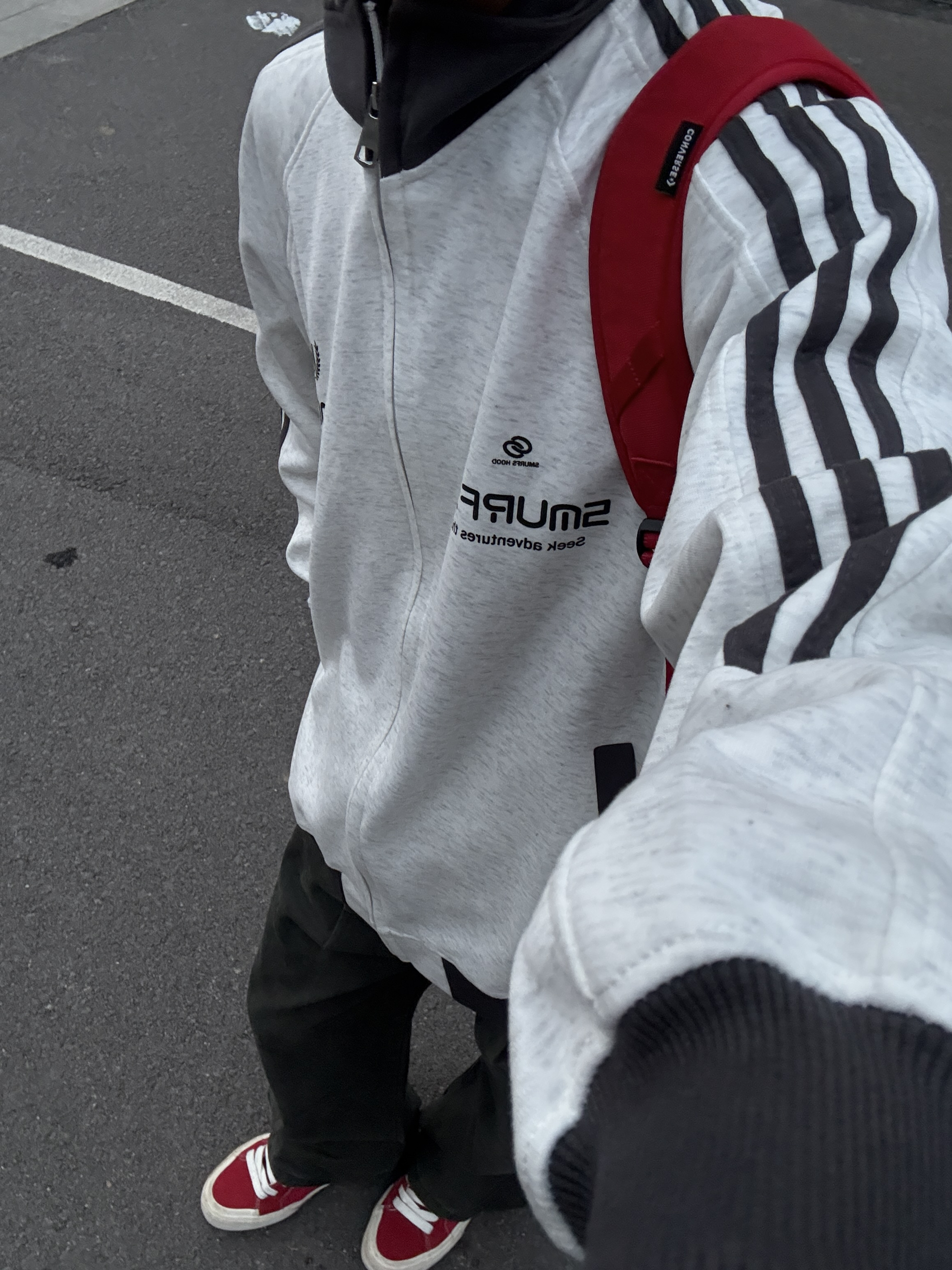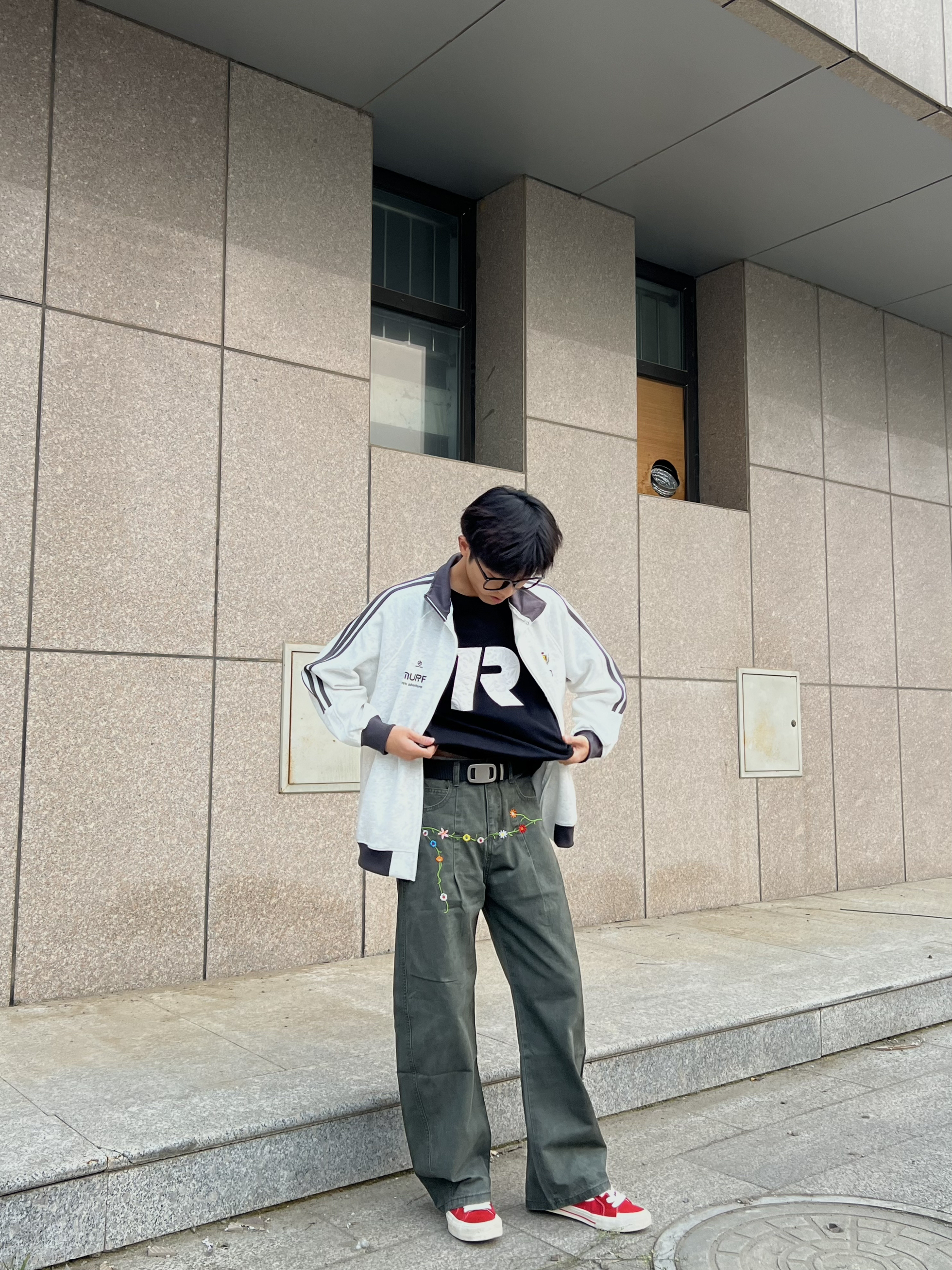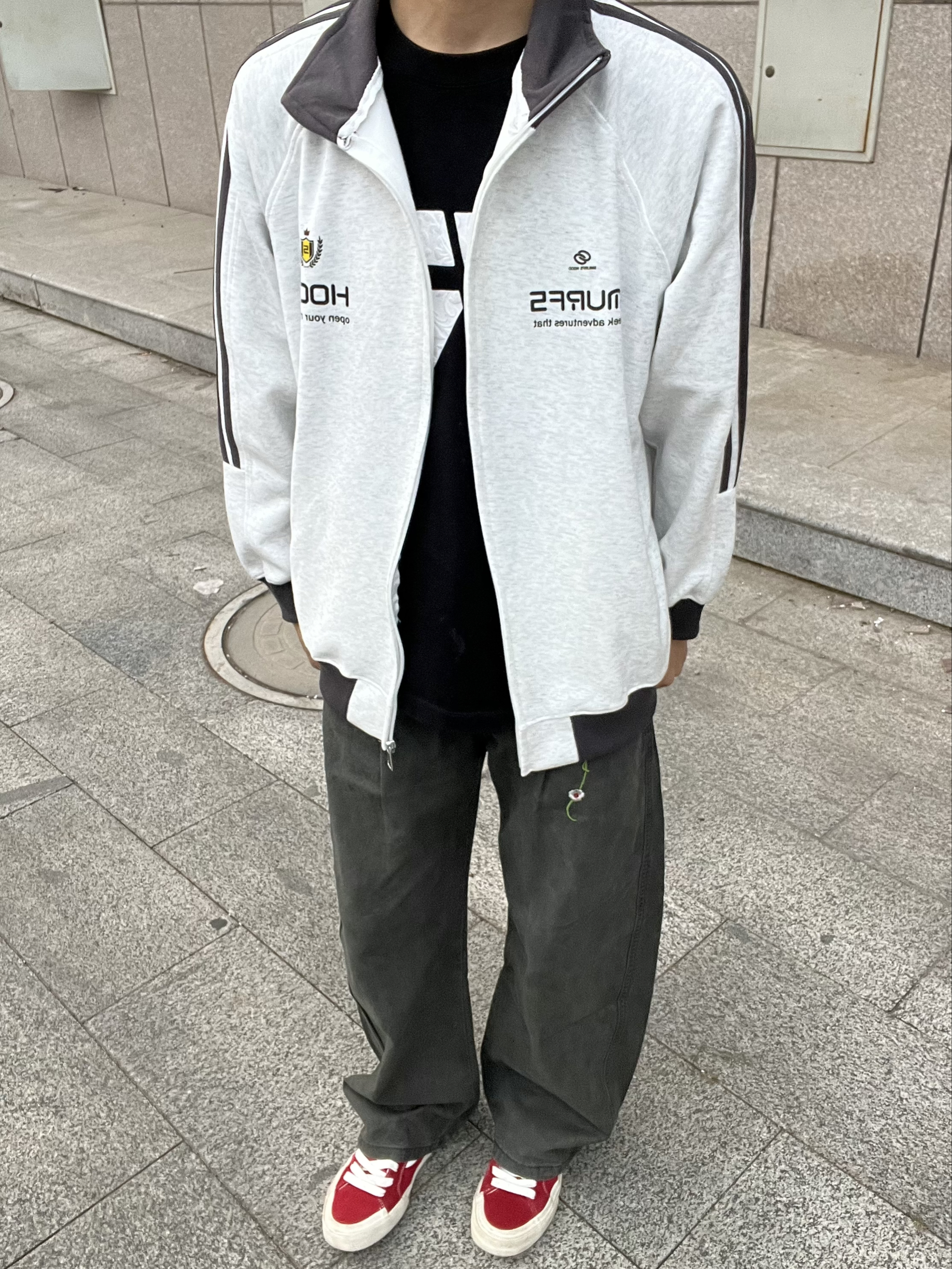 浅灰三条杠外套配深绿工装裤也太好穿了吧!😌 早上随便套上就出门,宽松版型贼舒服,灰绿撞色还特有层次感,再踩双红白帆布鞋,不用费脑的搭配也超有松弛感~ 👔金贝勒