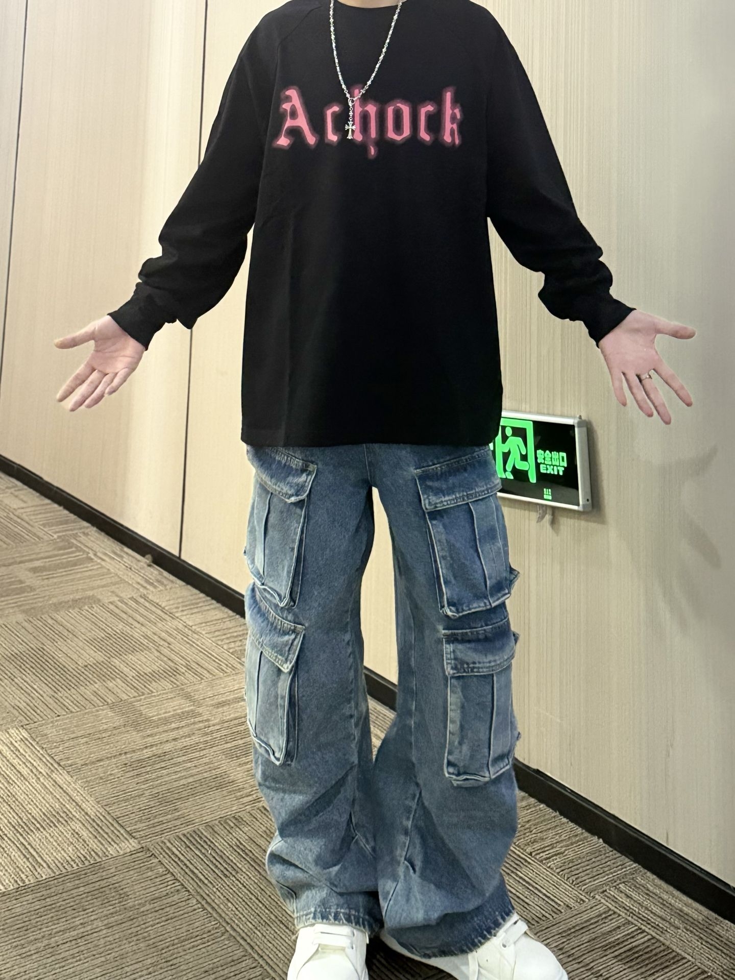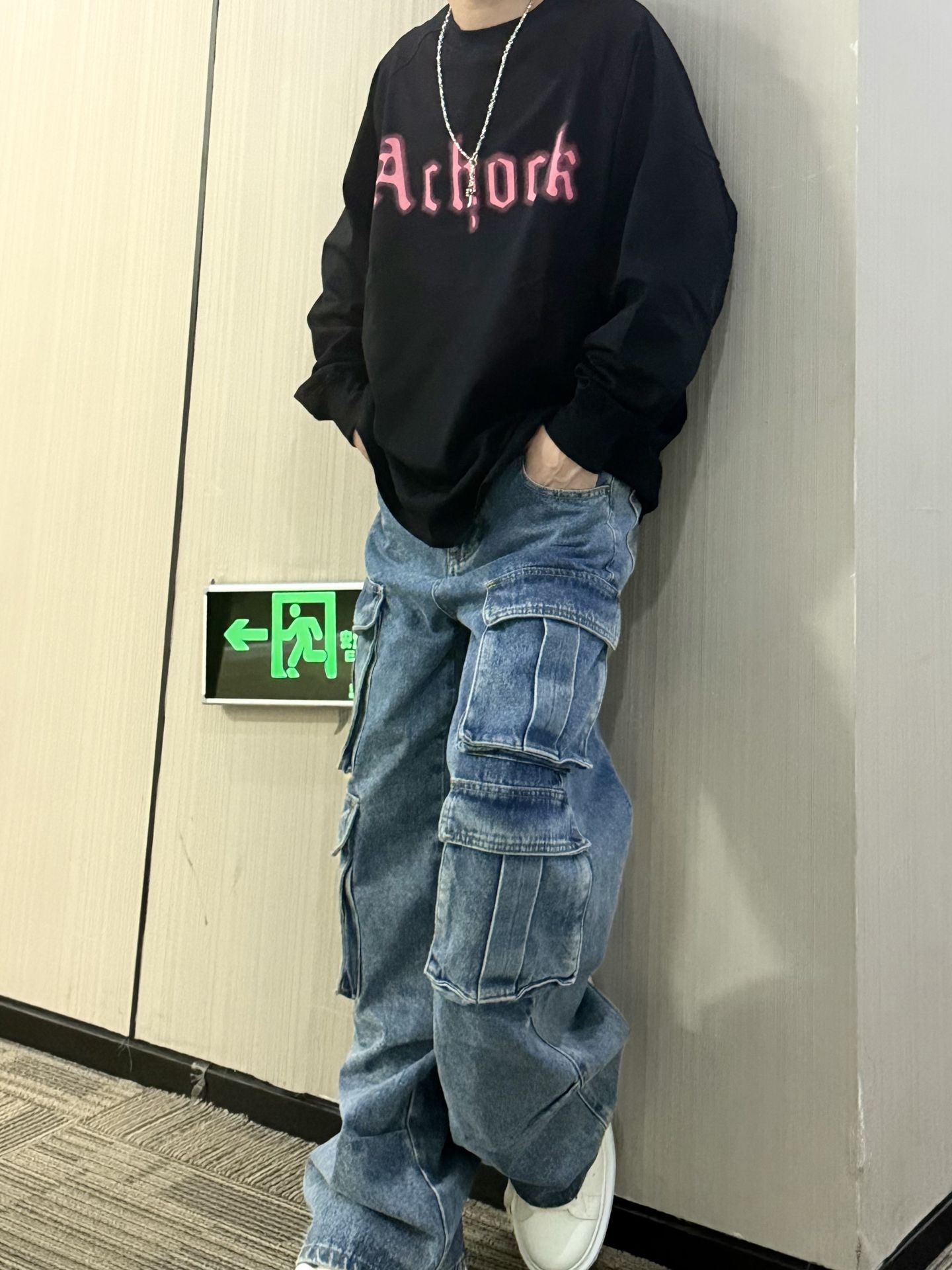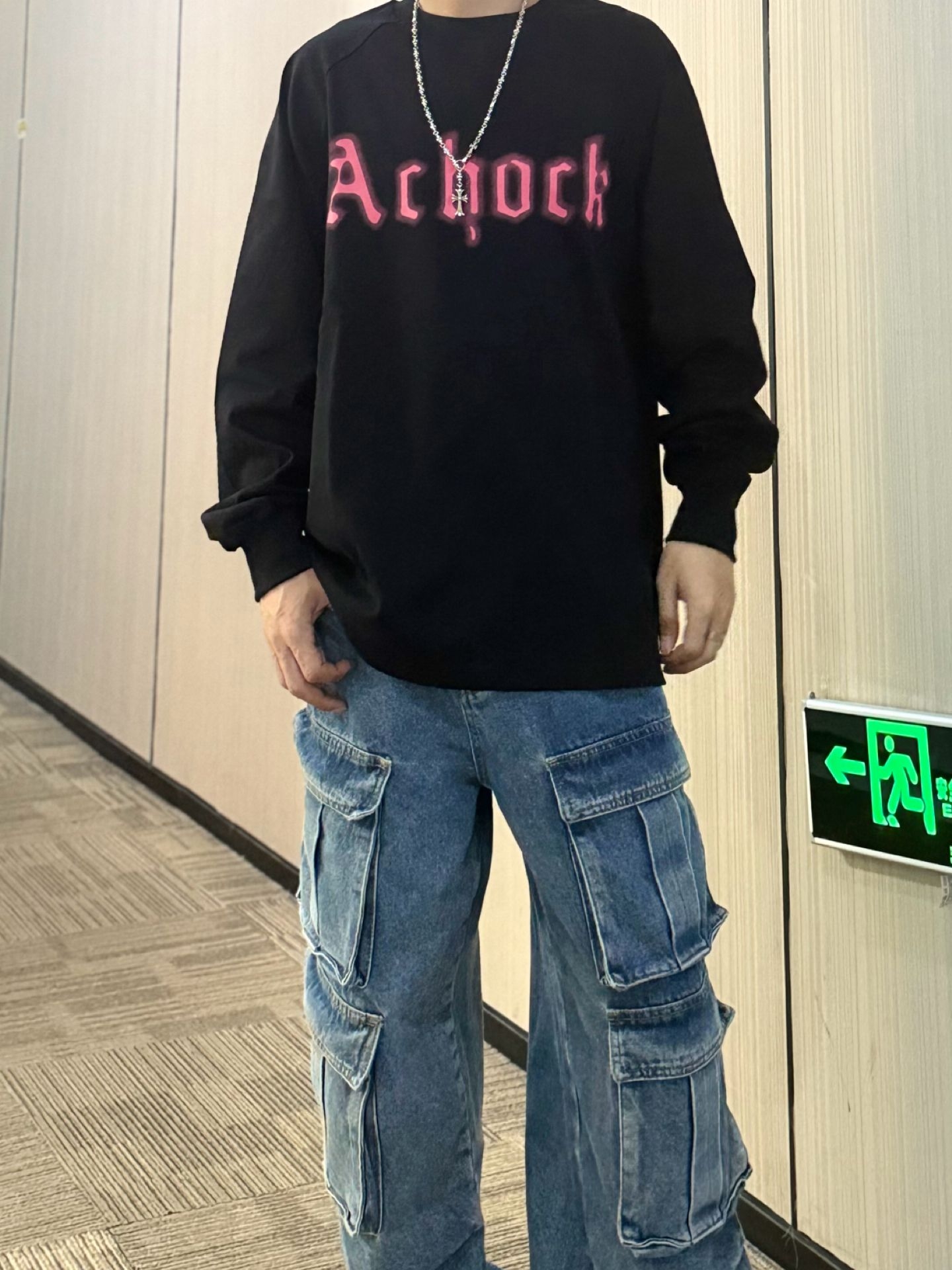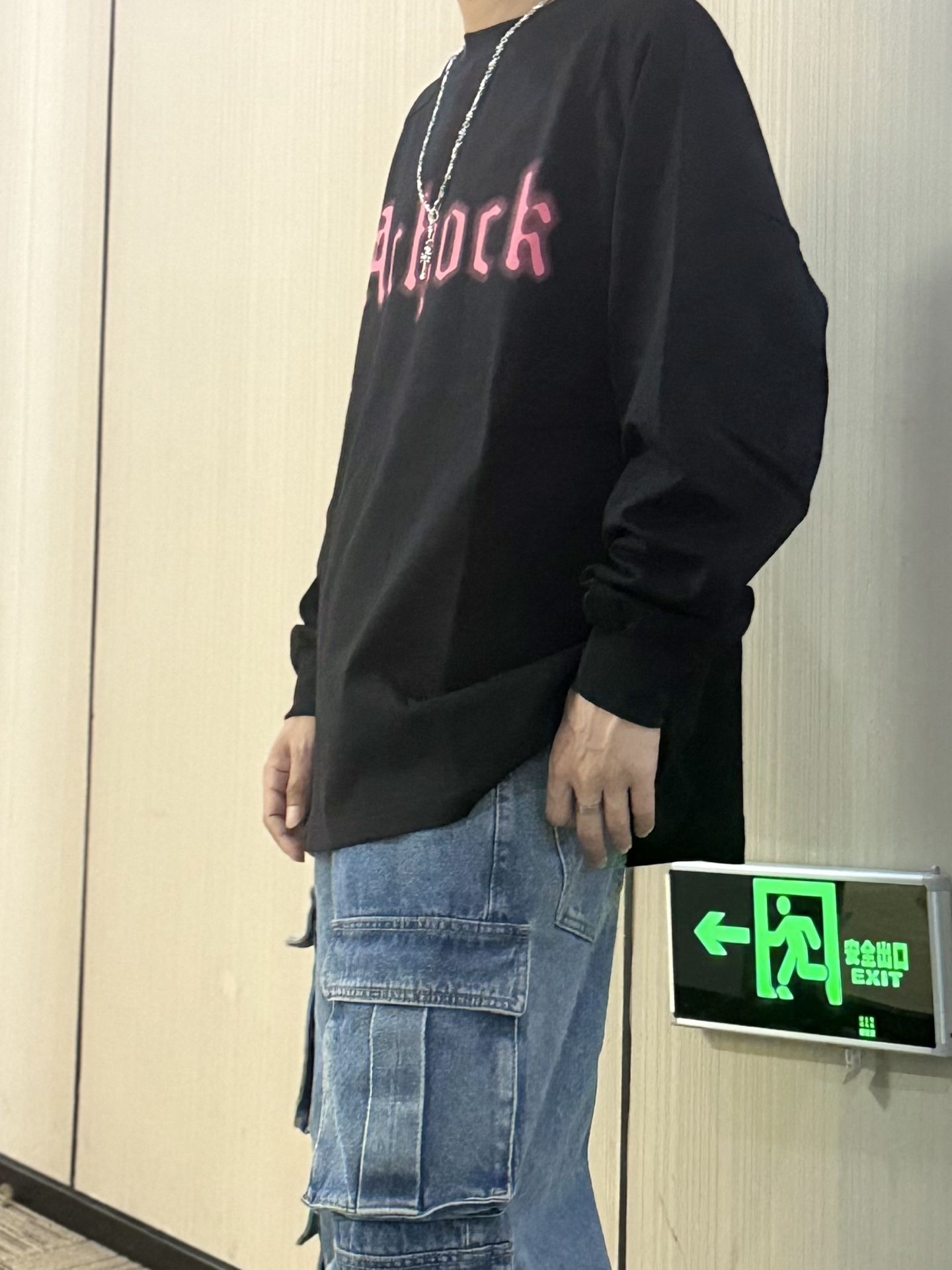 上身黑色字母长袖 属于是偏薄的长袖T 粉字撞色hin吸睛 简约又自带街头感 下身搭配的多口袋工装牛仔裤 街头感直接拿捏