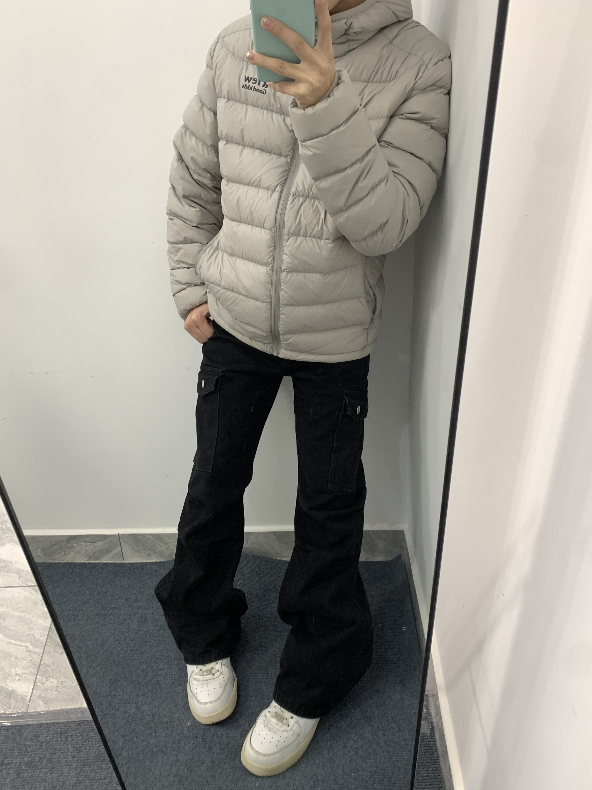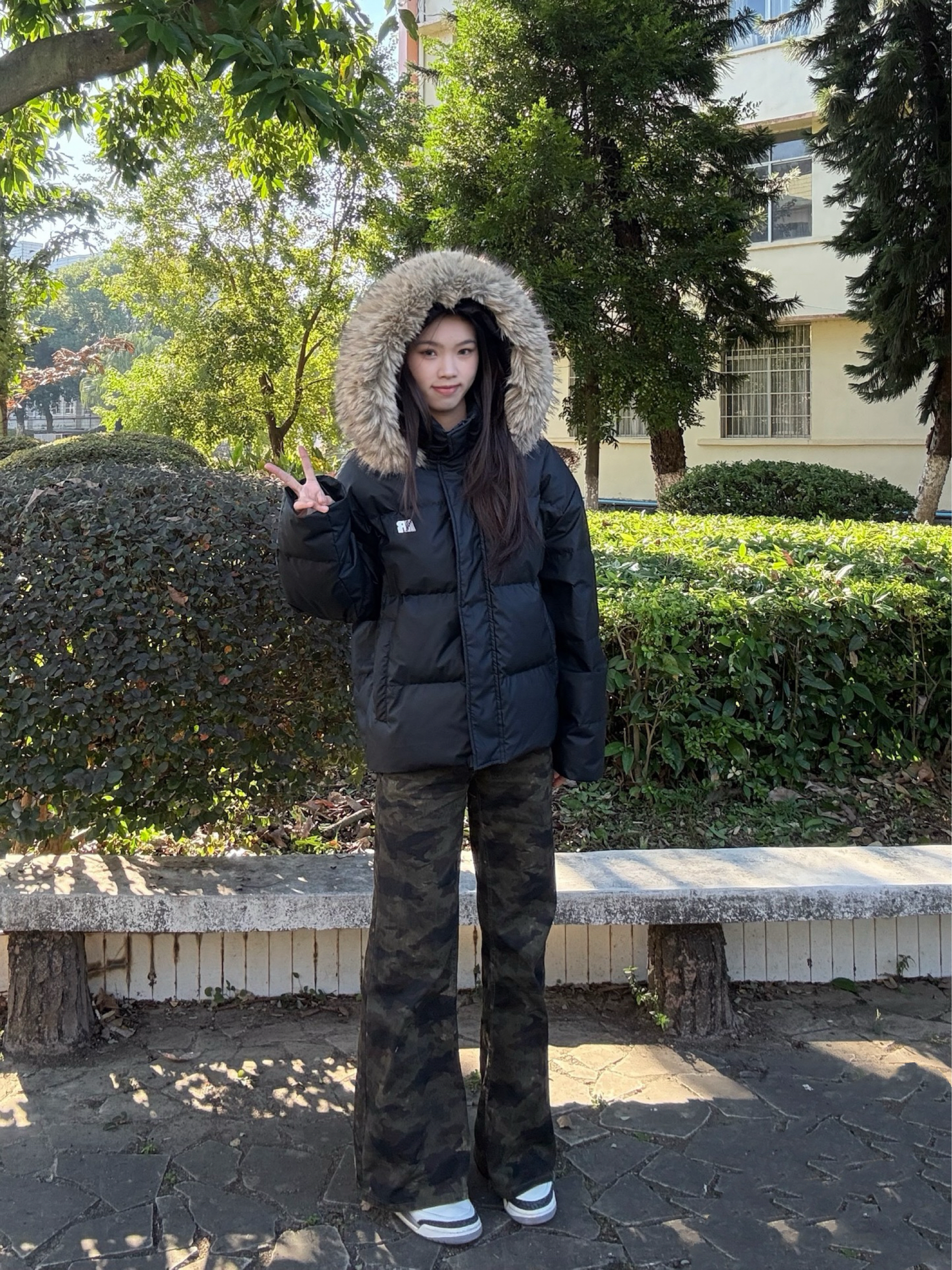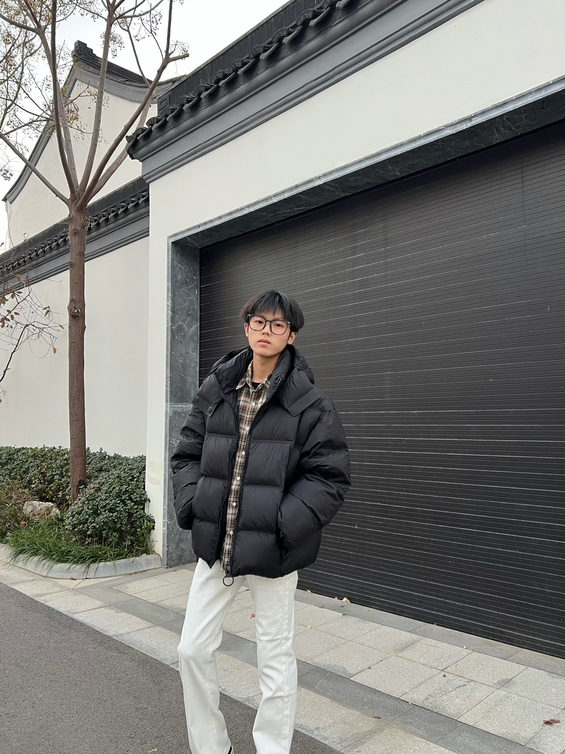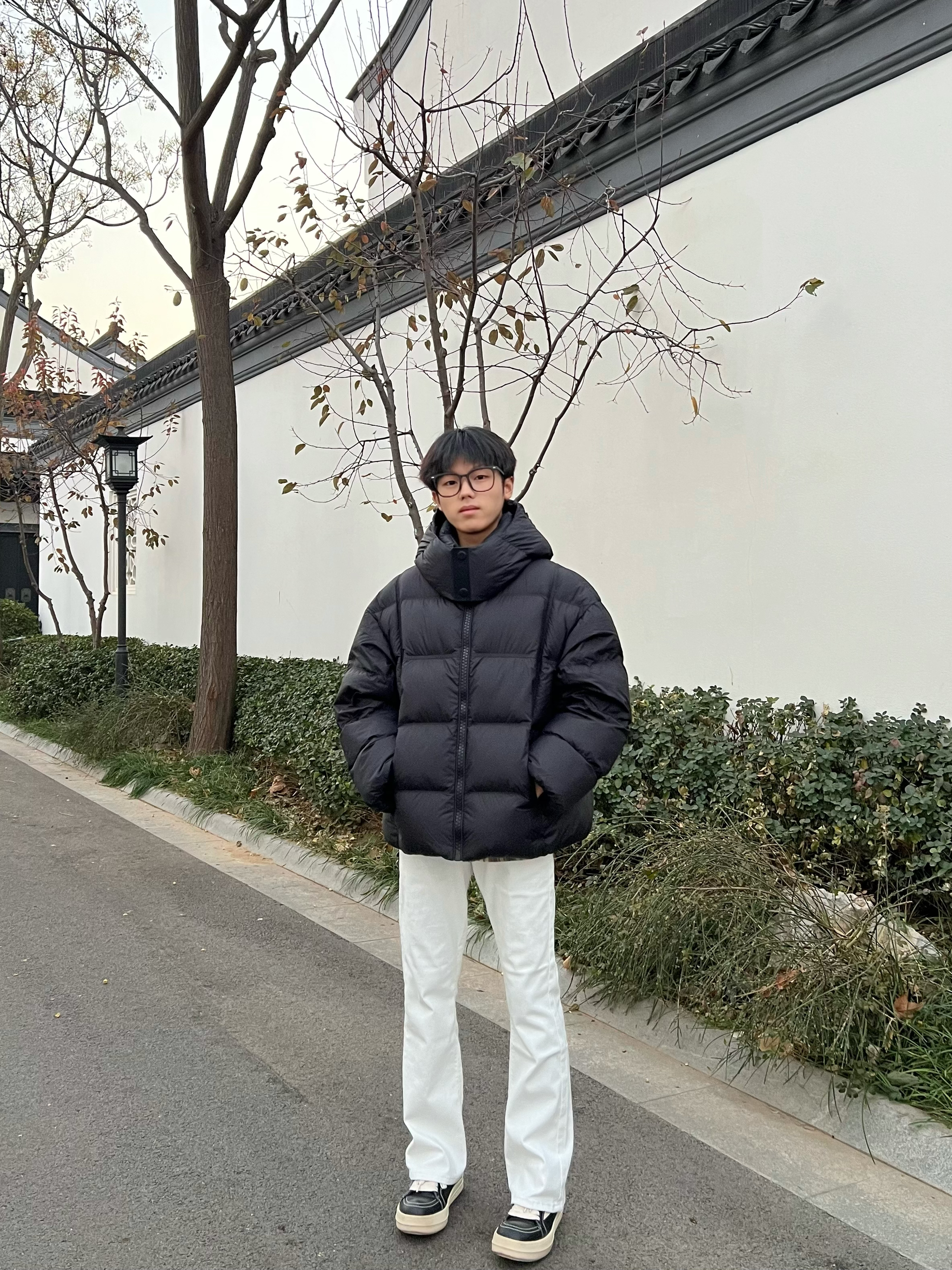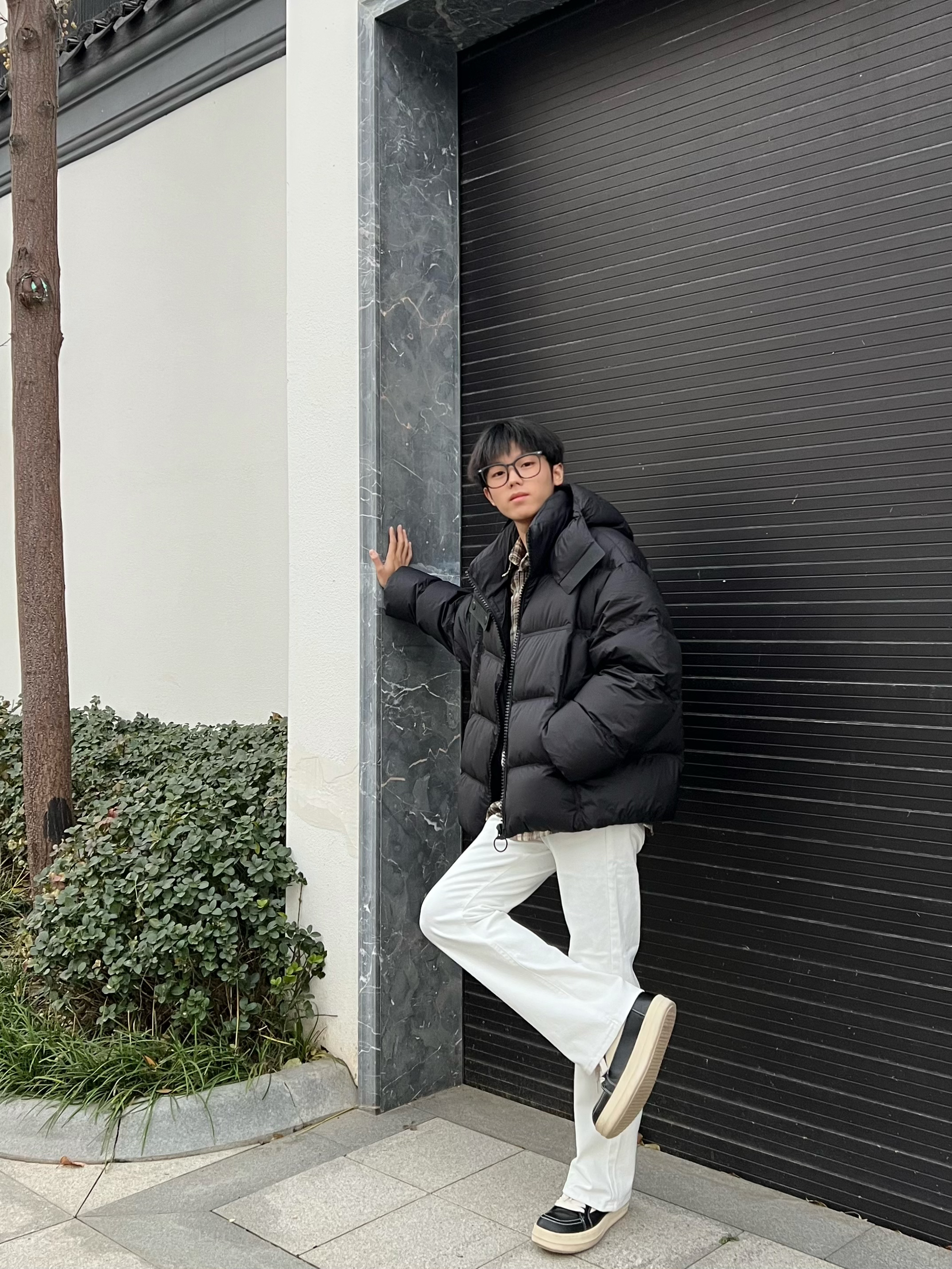 不愧是我熬夜选的羽绒服啊!! 羽绒填充很饱满 上身高街感满满的 裤长刚好堆在鞋面上 显得腿又长又直 黑羽绒服和白牛仔真的是秋冬万能搭 冬天出门这么穿简单又帅气