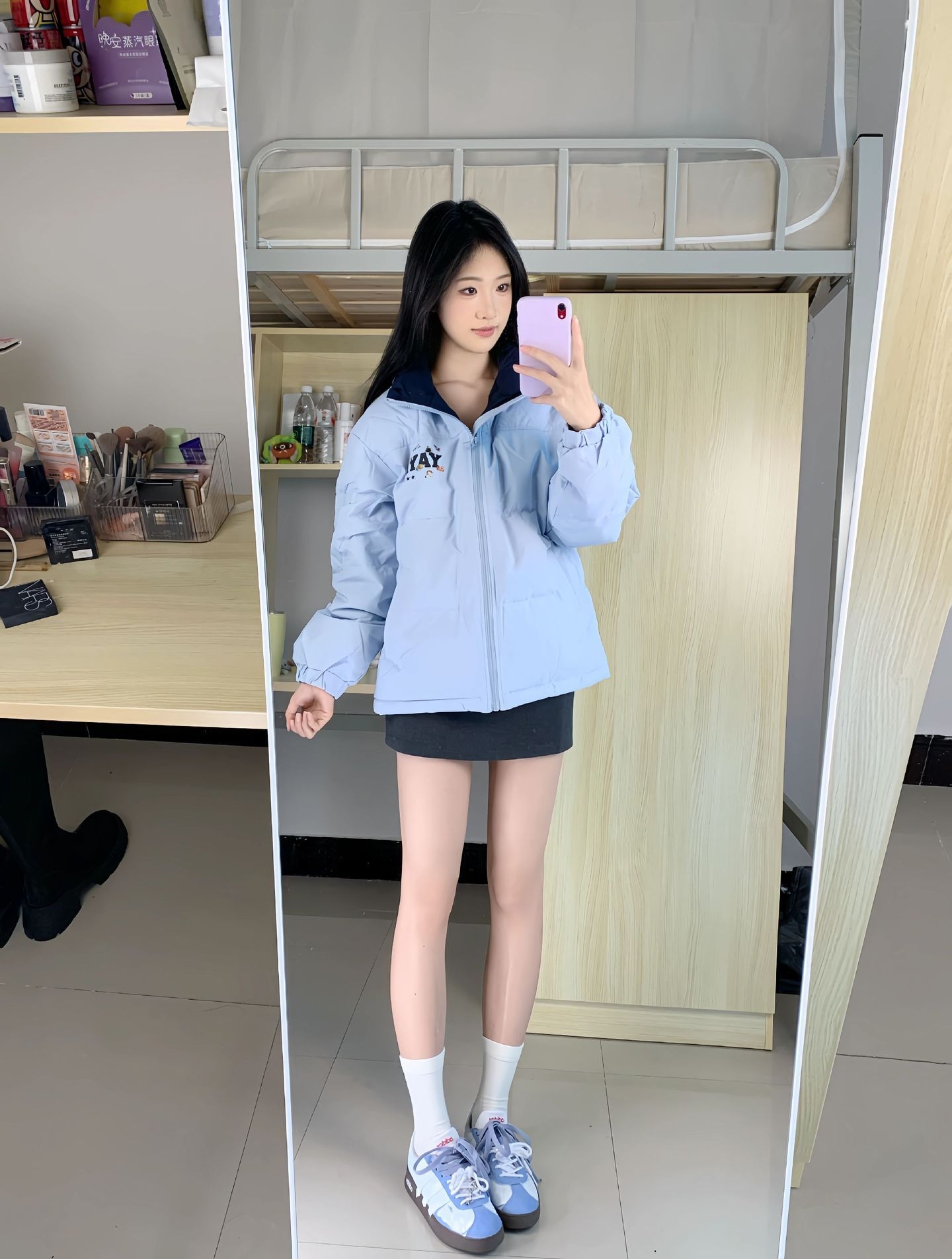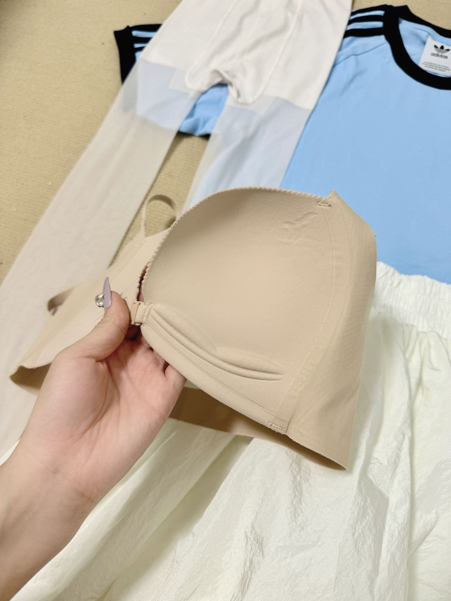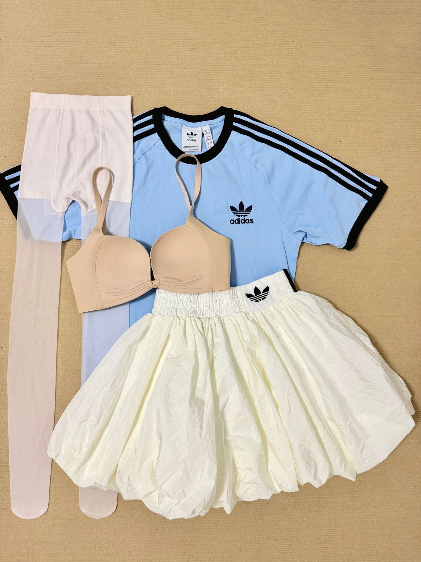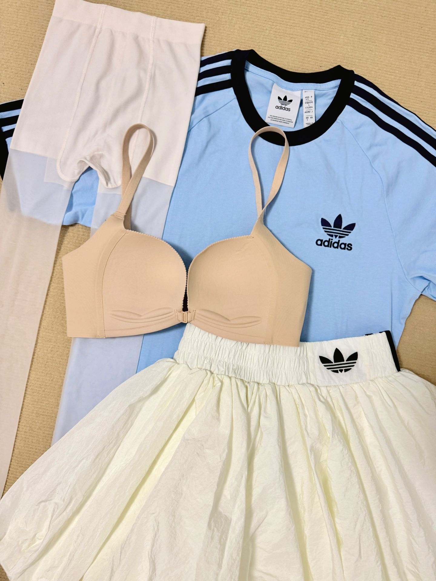 蓝白色系尊嘟好适合夏天呀,这套韩系的阿迪套装妥妥的女团打歌服既视感,夏天我很喜欢正肩T恤+前扣bra的这种搭配,幸棉的前扣内衣真的老聚拢了,给我这个圆盘胸都收的圆嘟嘟的!衬得身材巨巨好看,然后下边搭配白色小短裙我会再穿件色修丝袜,能把我腿上的小血丝遮得差不多,一整套这样下来韩女清爽感拿捏咯~