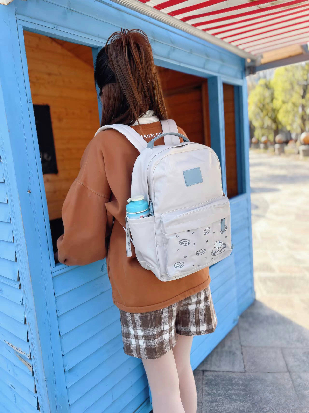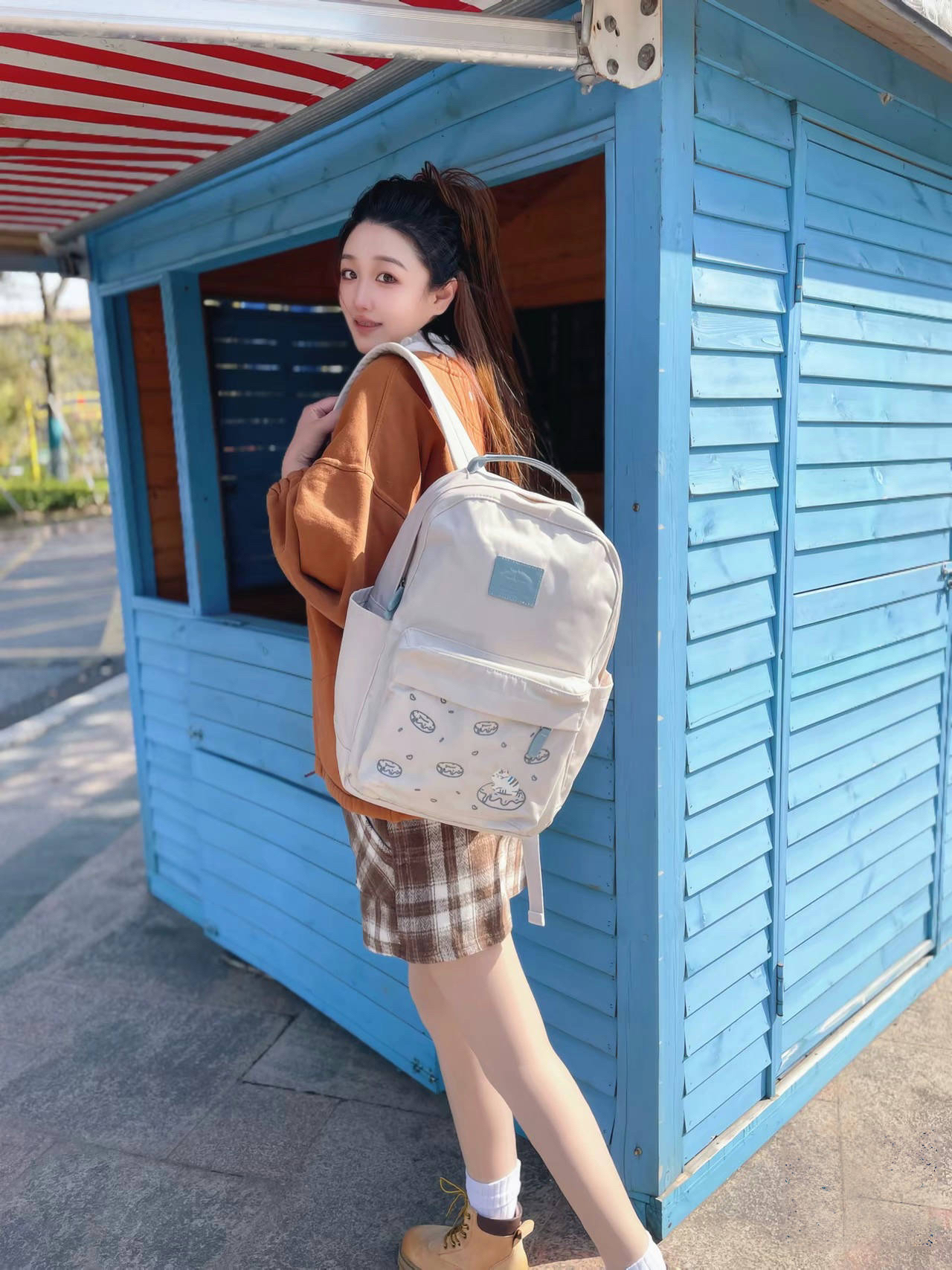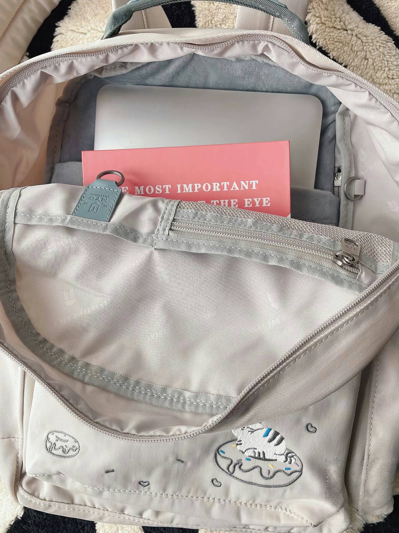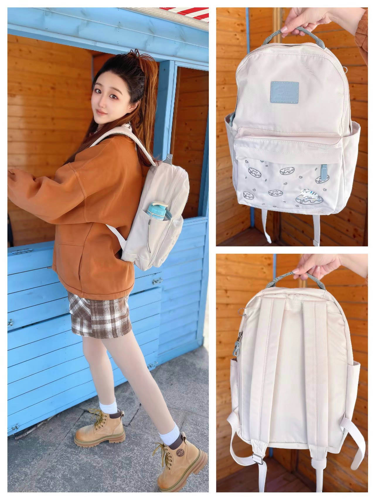 今天的小卖部被我承包了 背上包包去逛逛啦~ 白桃色&粉蓝色的拼色 吼吼看哦 还有阔爱的小猫咪 喵~ 背着就给人很乖的感觉 自重很轻 背着毫无负担 容量也超大的 可以装下很多知识 内里分层合理 分类收纳 轻松搞定 来张特写康康📸