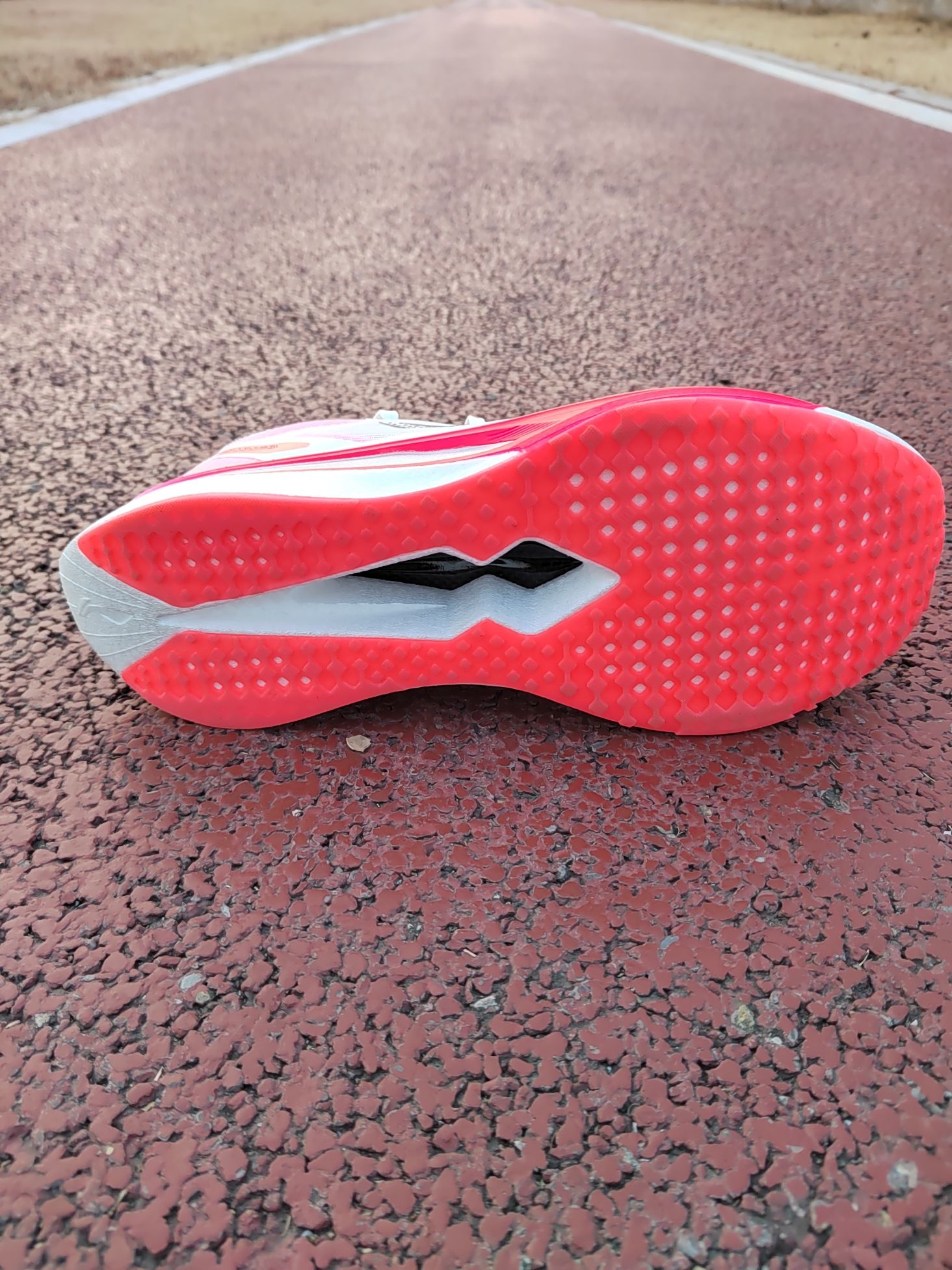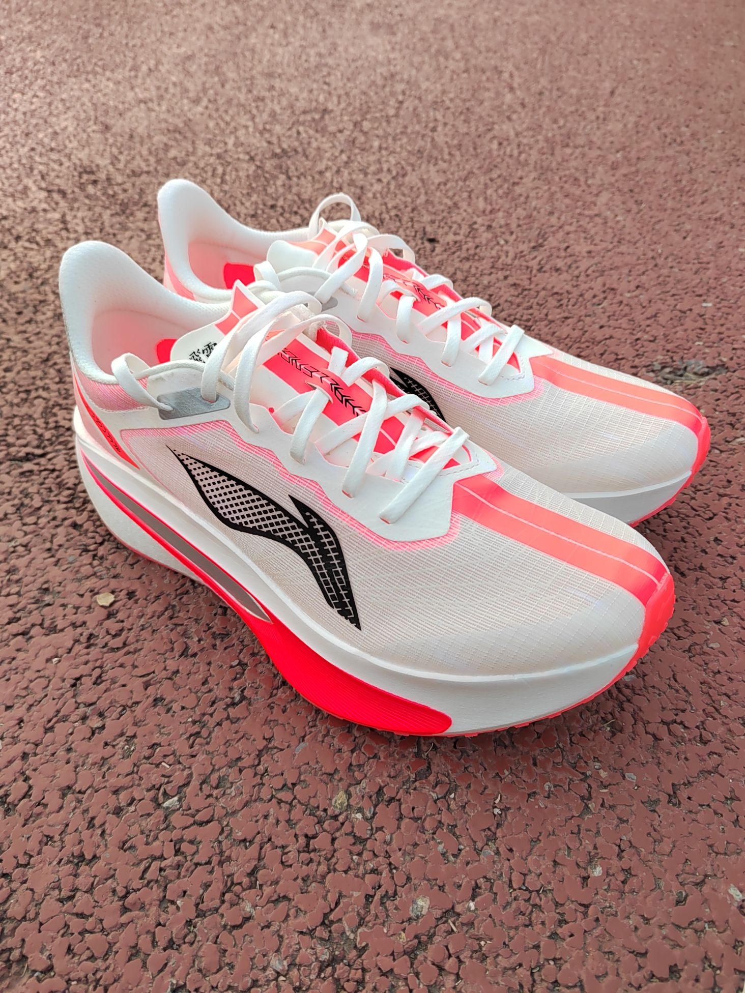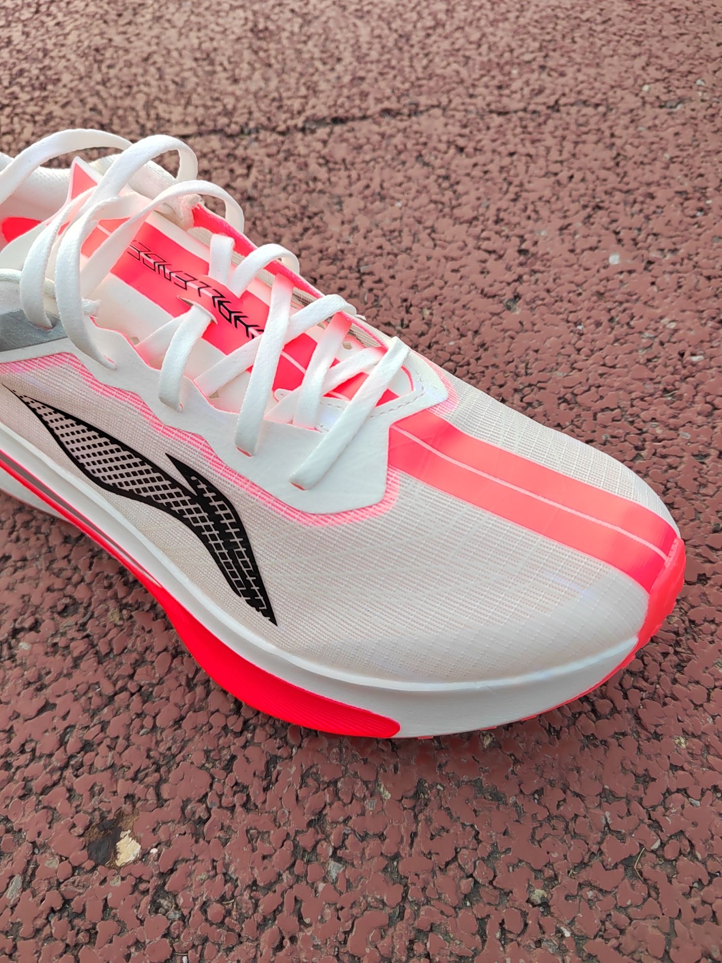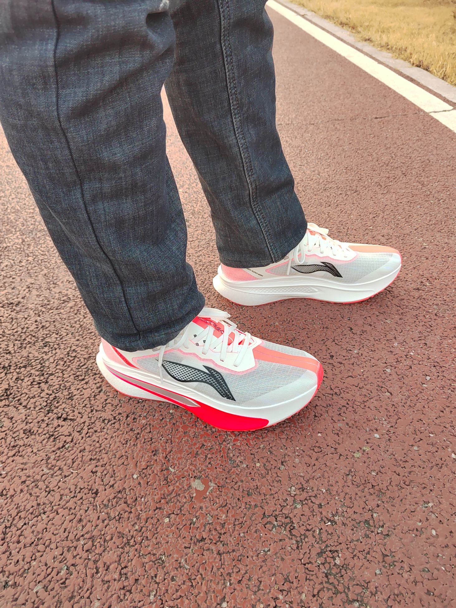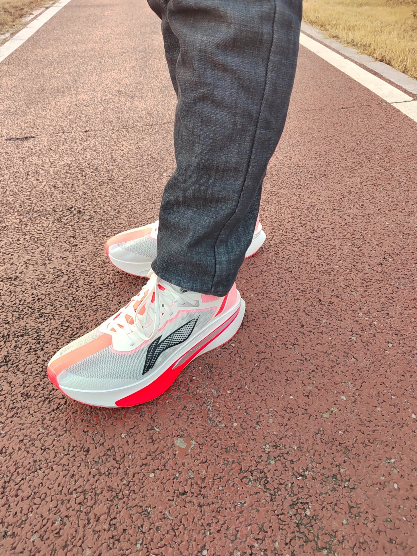 今天和大家分享这双李宁 飞电6C 香槟白配珊瑚红的配色,非常的清新,给人眼前一亮的感觉 中底采用上层超䨻+下层䨻的双层结构,我上脚后很轻盈,跑步时落地回弹感明显发力时没有泄力感,减轻膝盖的压力 鞋底内置T700级分趾碳板,抗扭性和韧性都很不错,而且分割足底发力区域,助推我起跑时的助推力 鞋楦偏窄,宽脚高脚背建议大半码,瘦脚正常码选择