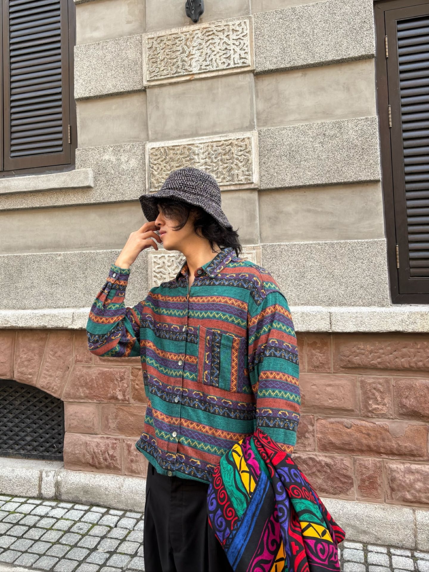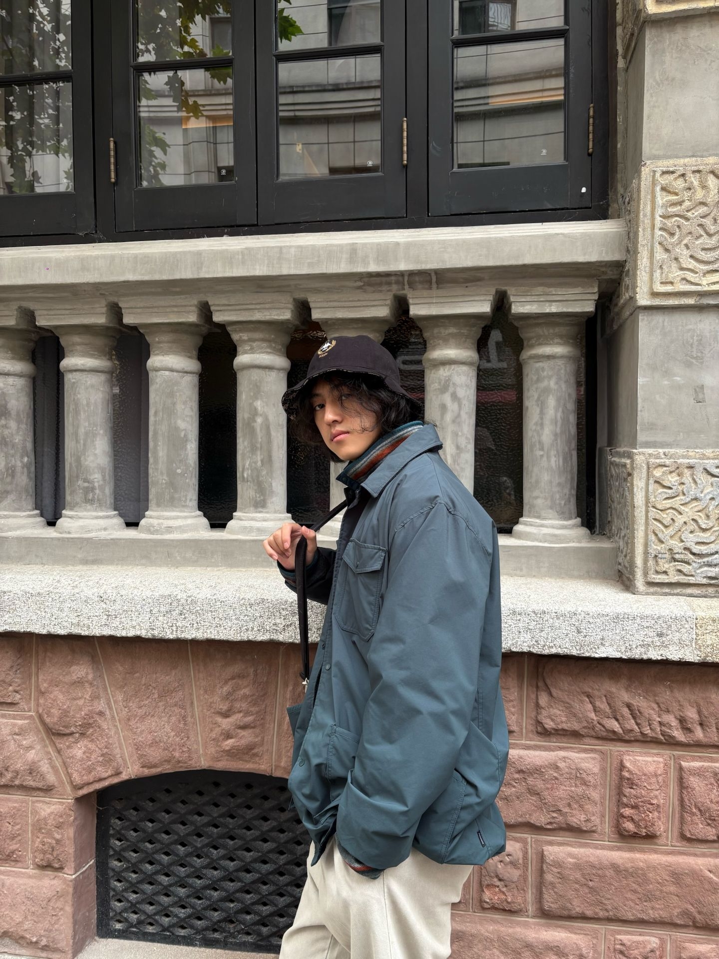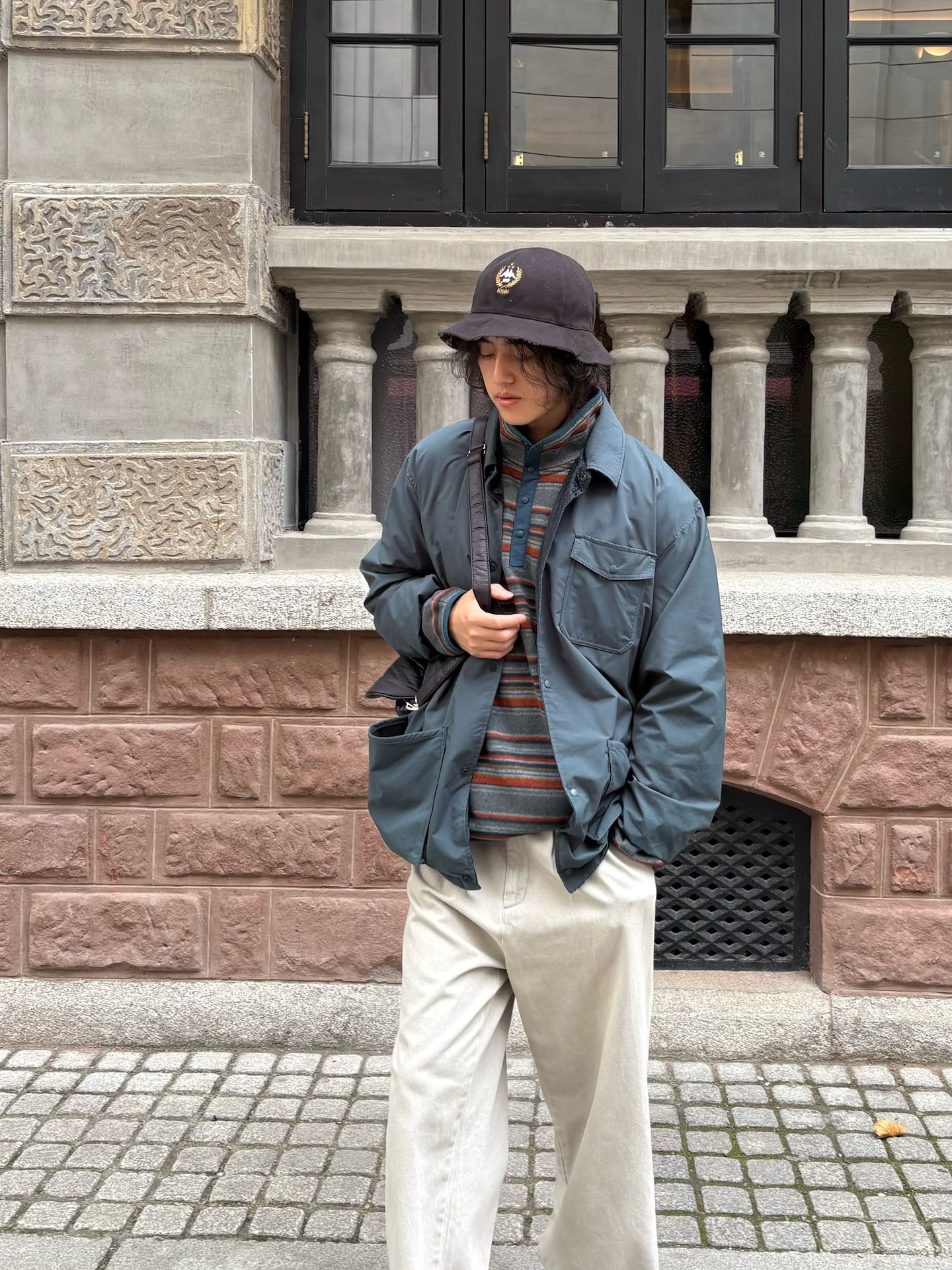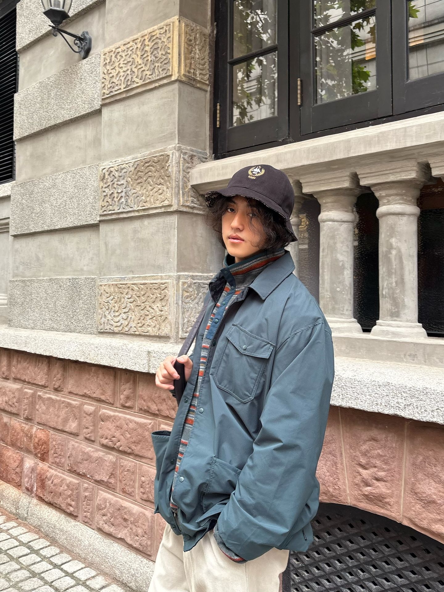 今天穿上和天气很搭的低饱和色系 半高领条纹卫衣搭配休闲夹克🧥 再带一顶淘回来的古着kappa渔夫帽 色彩丰富却视觉统一 内在材质不同制造了叠穿的魅力最大化 秋冬一起叠起来 🕶️
