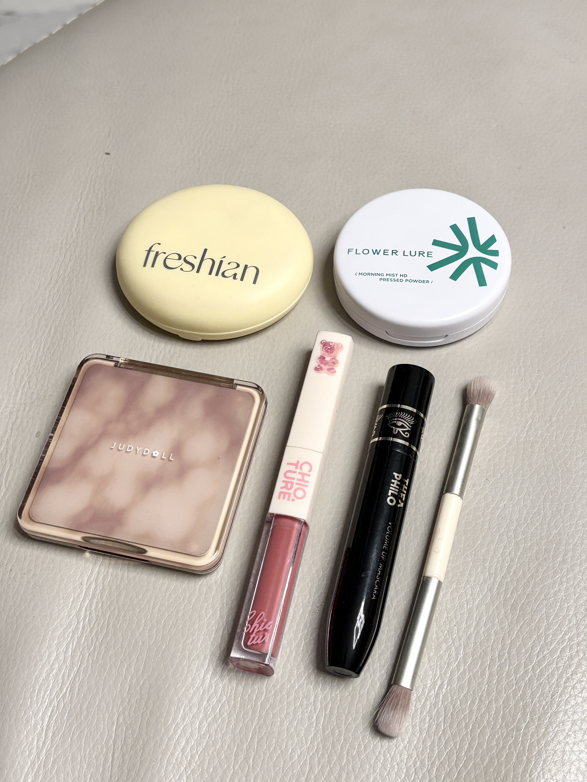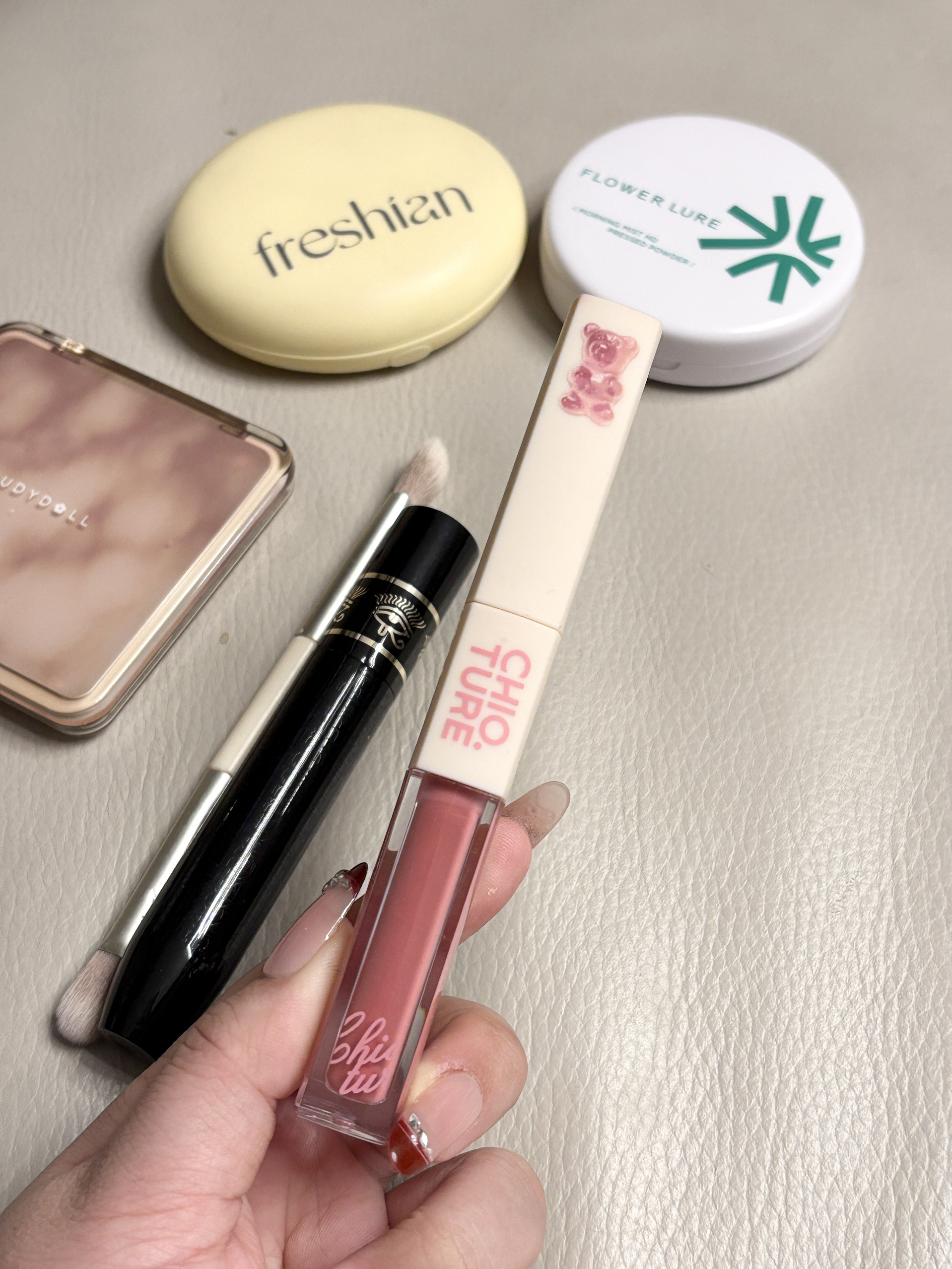 近期挖到的彩妆宝藏合集来啦 小韩的freshian气垫奶fufu 是自然的水光感 干皮可入 花间颂粉饼遮暇和持妆力都不错 橘朵的修容盘新手也能画 阴影自然不生硬 可以一盘多用 稚优泉唇釉是温柔挂的裸粉色 小众和国货的组合拳 真的越用越爱