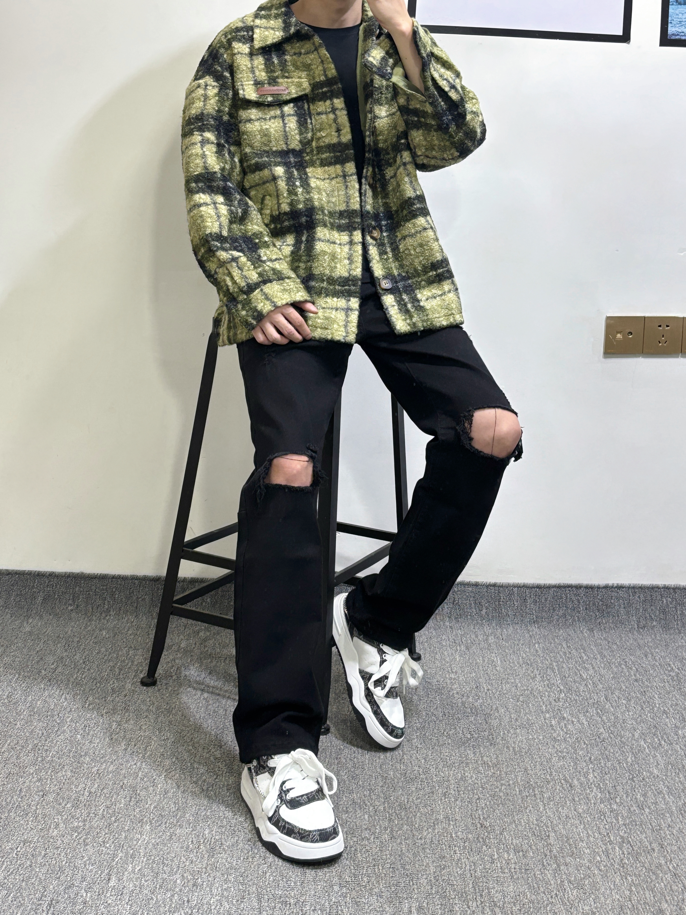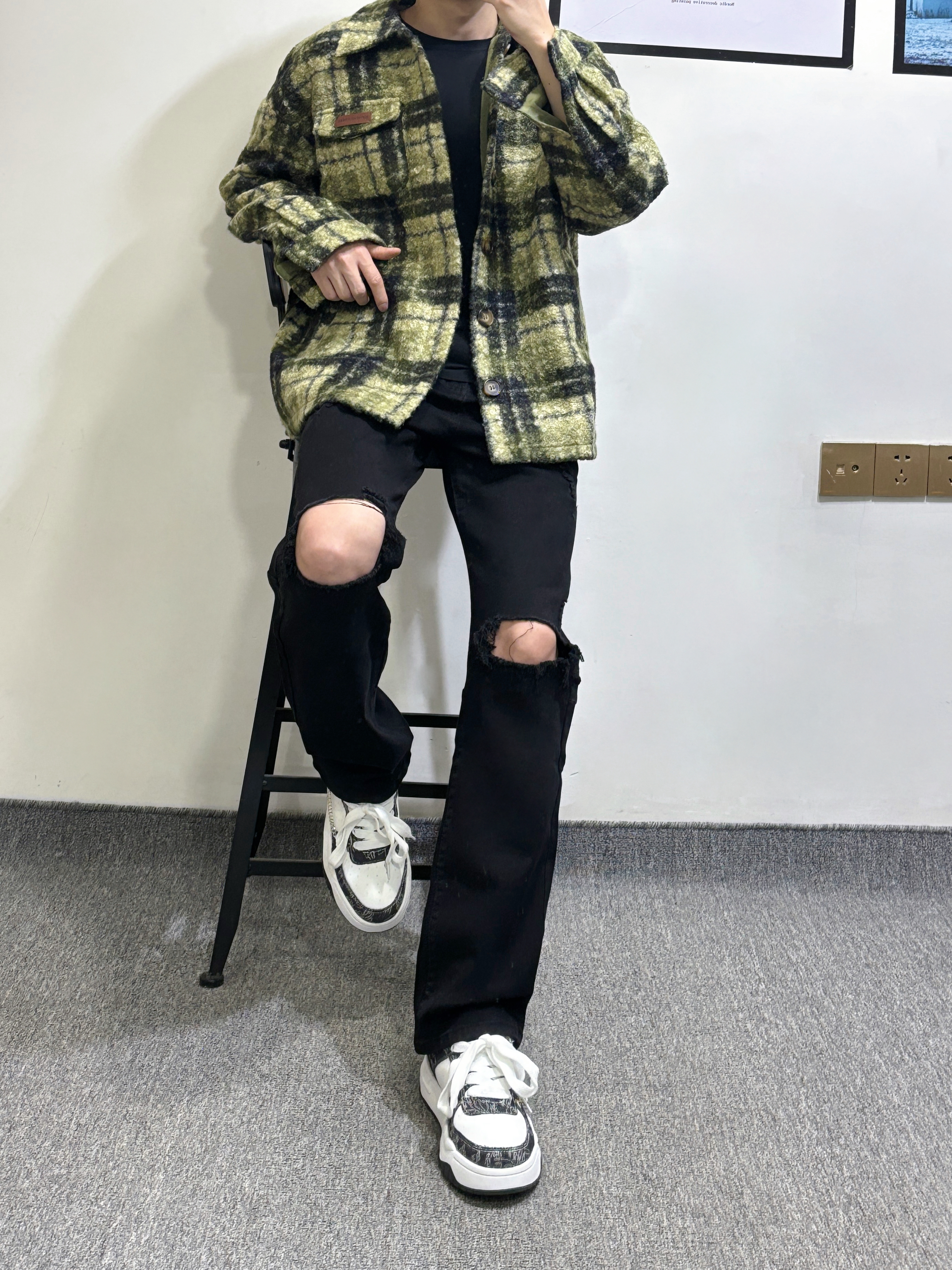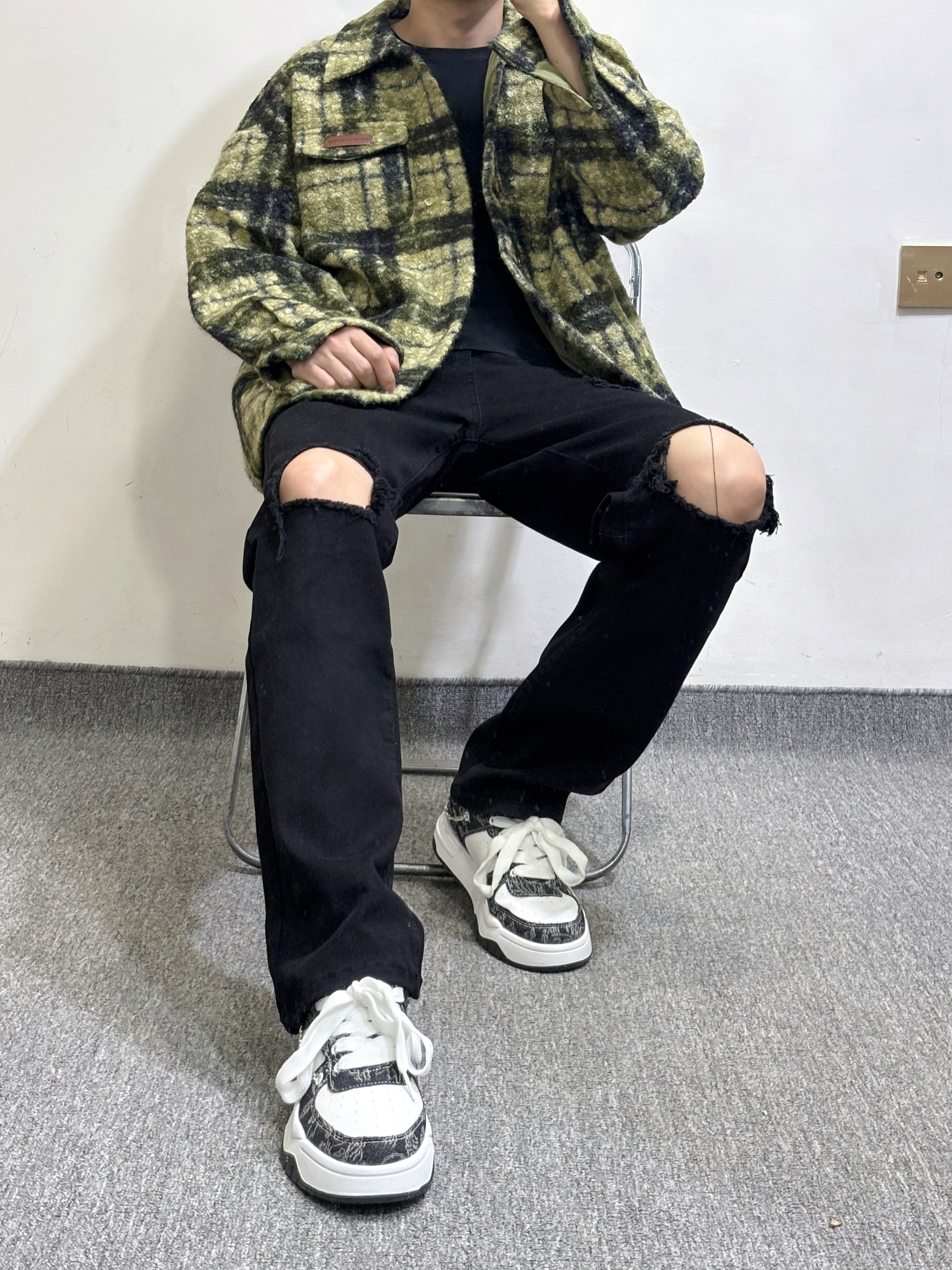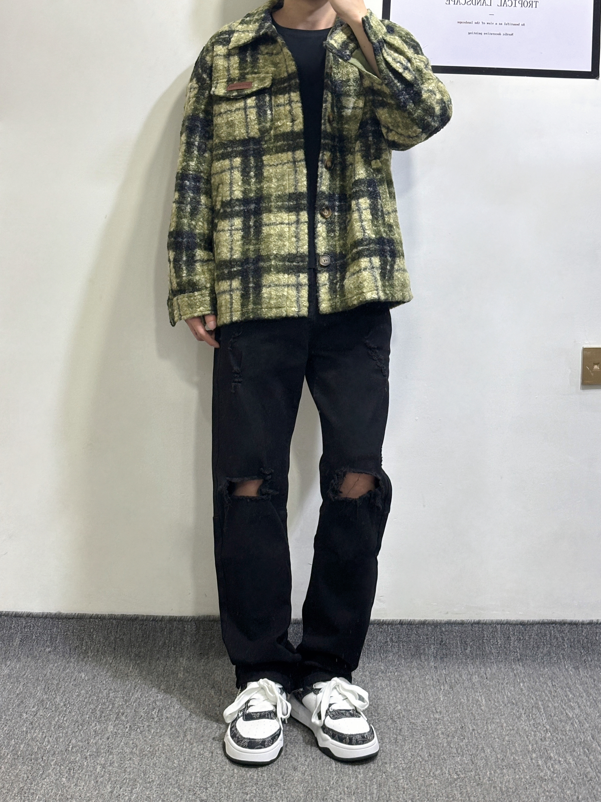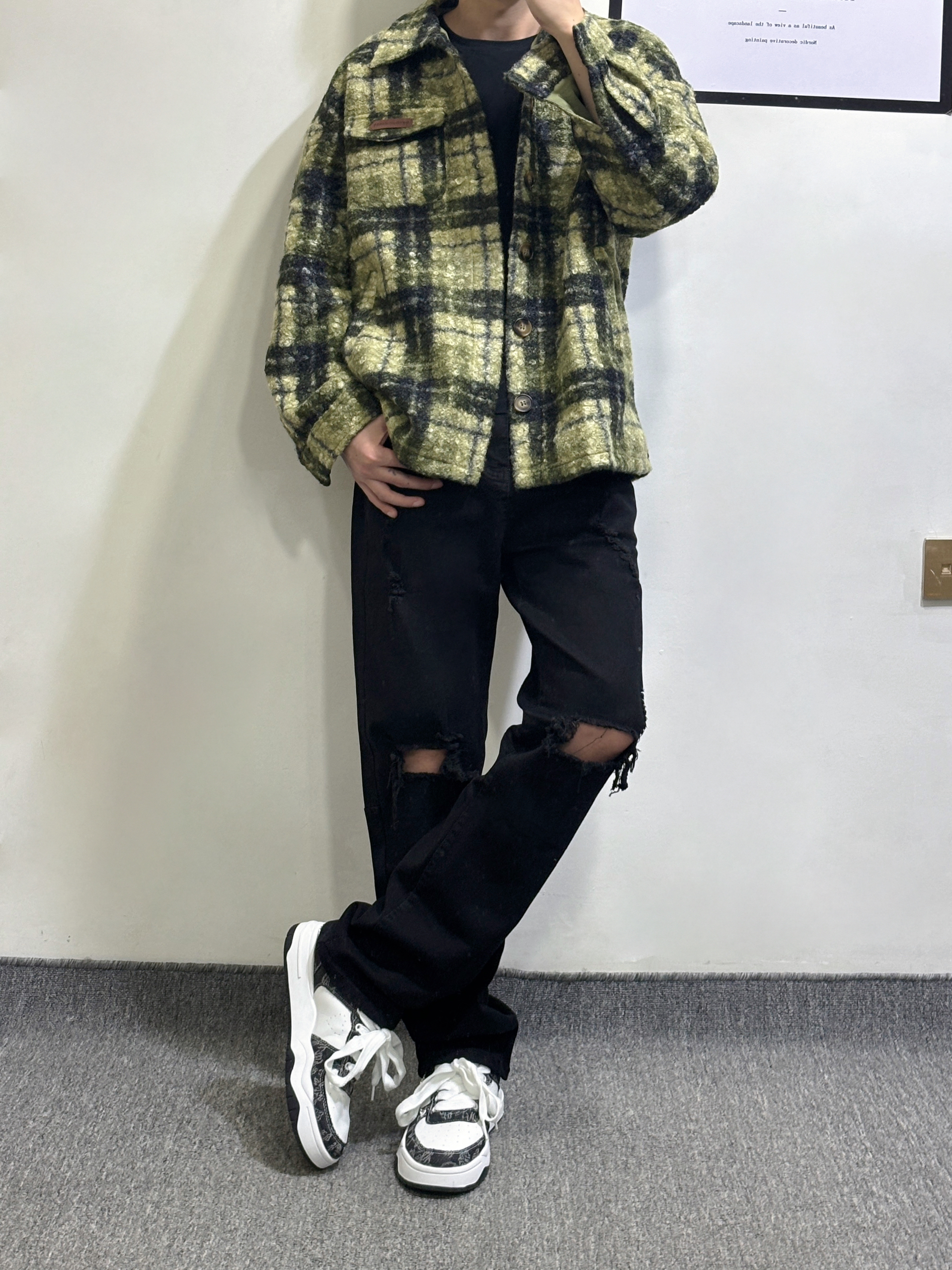 复古黄绿格纹毛呢衬衫外套自带慵懒氛围感,内搭简约黑T弱化厚重感,下身搭配破洞黑牛仔打造街头酷感,裤脚垂坠感中和了外套的蓬松,黑白拼色板鞋收尾,整体松弛又有层次,拿捏随性街头风的精髓。 我身高178体重130 大家可以参考一下 身高|体重: