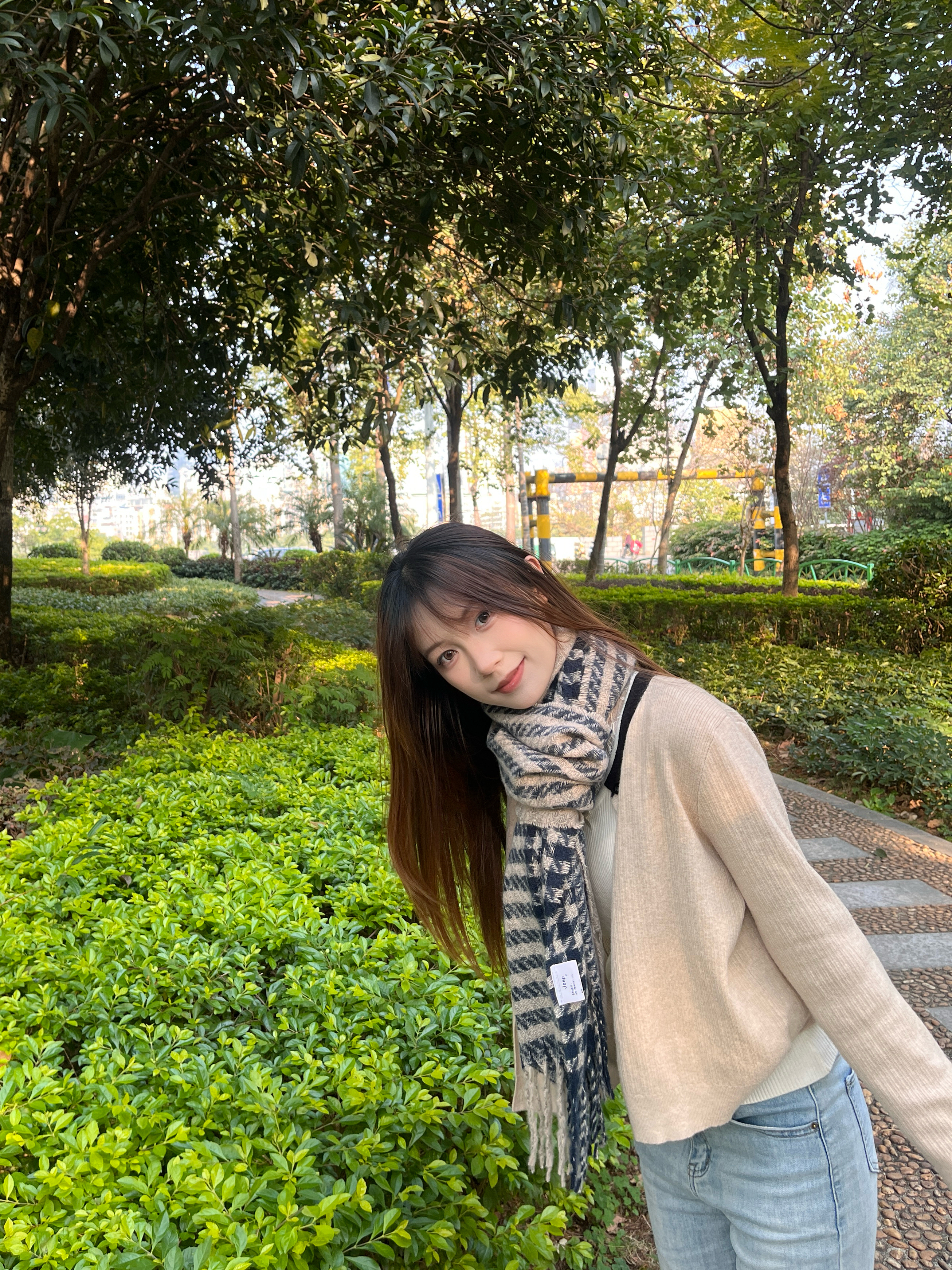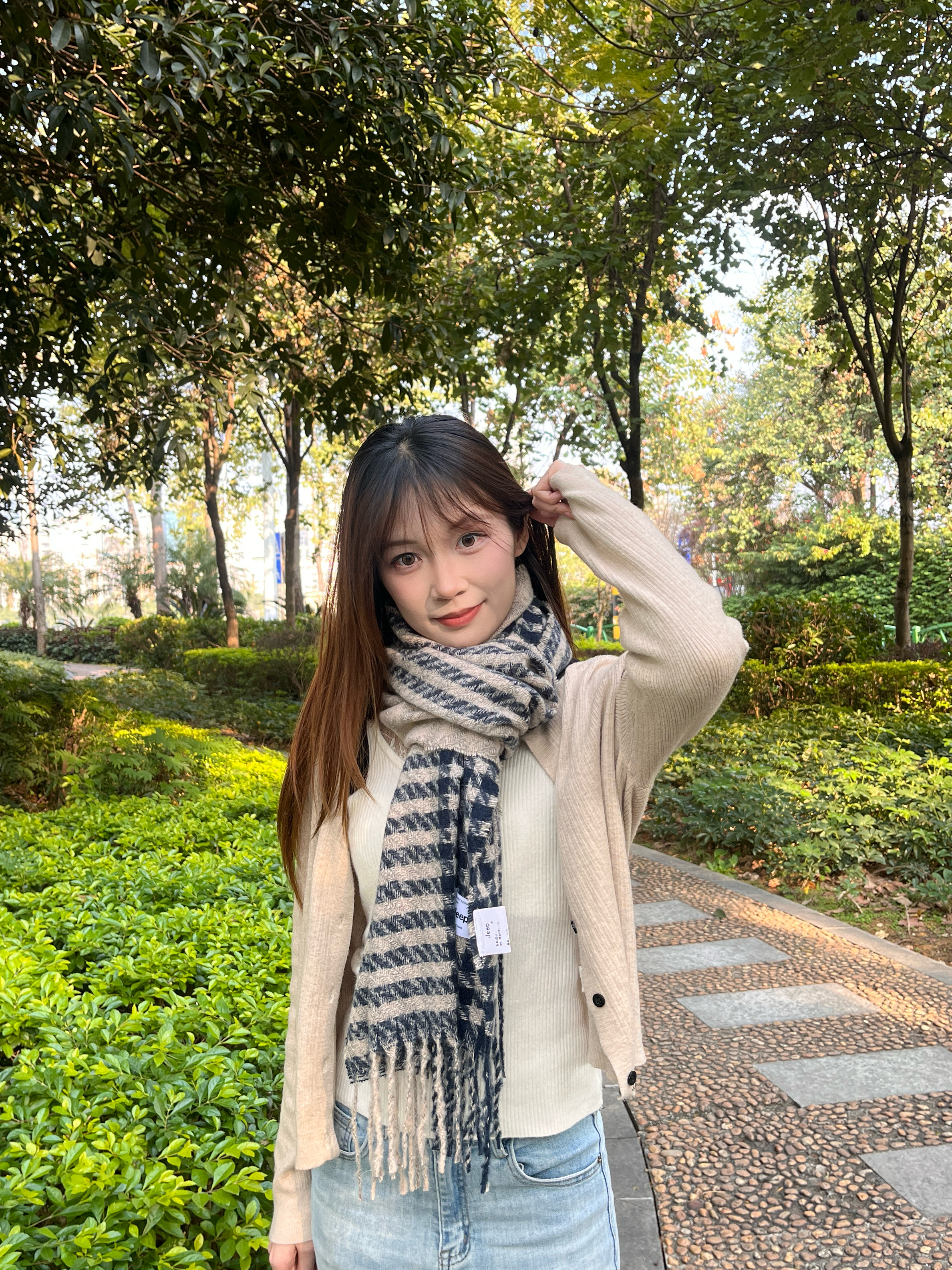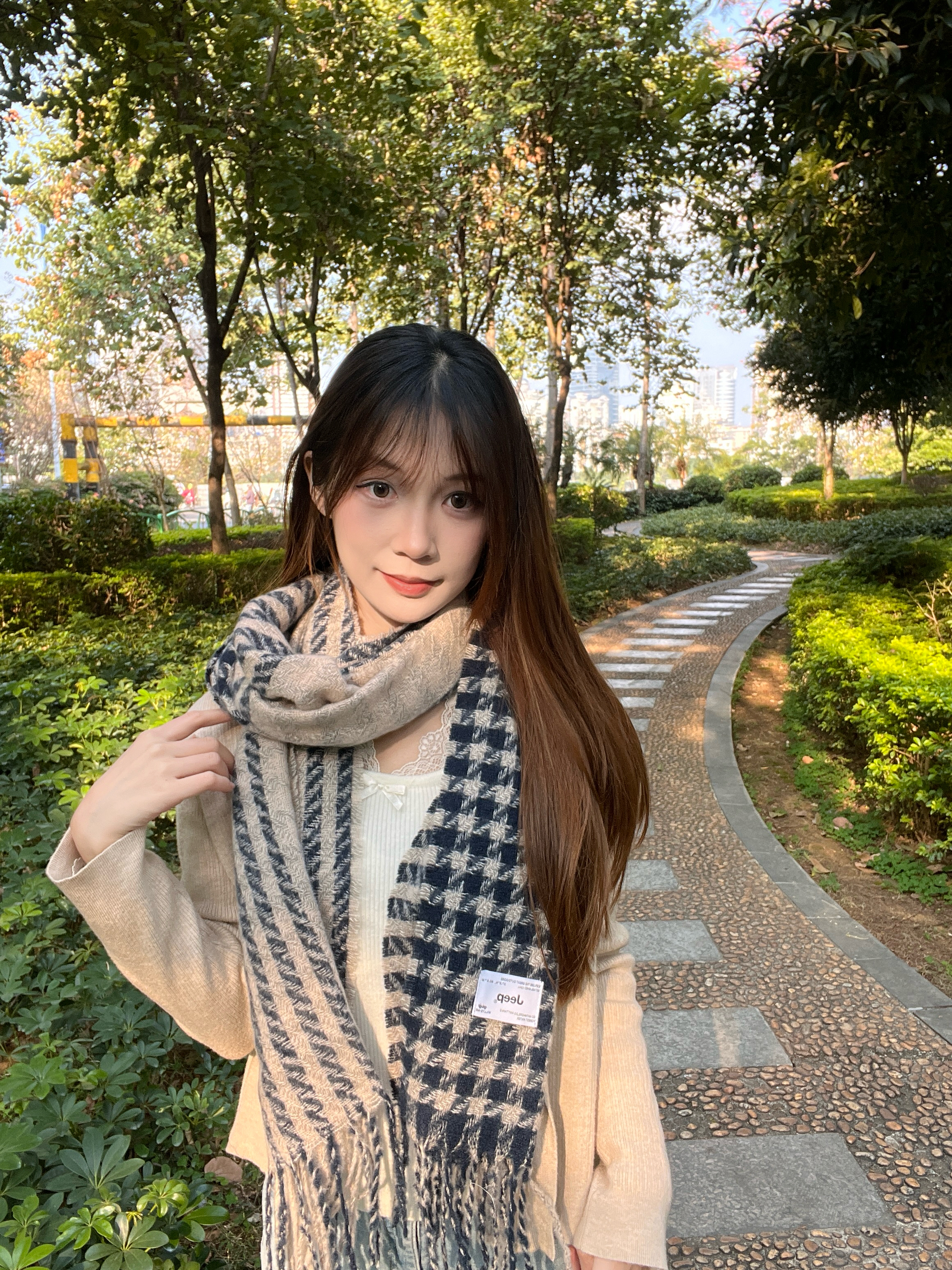 冬日穿搭的灵魂是这条围巾给的!千鸟格拼浅杏色的设计,温柔又不挑人,面料软乎乎的超亲肤,随便一搭就能让基础款穿搭变出彩,保暖和颜值都在线✨